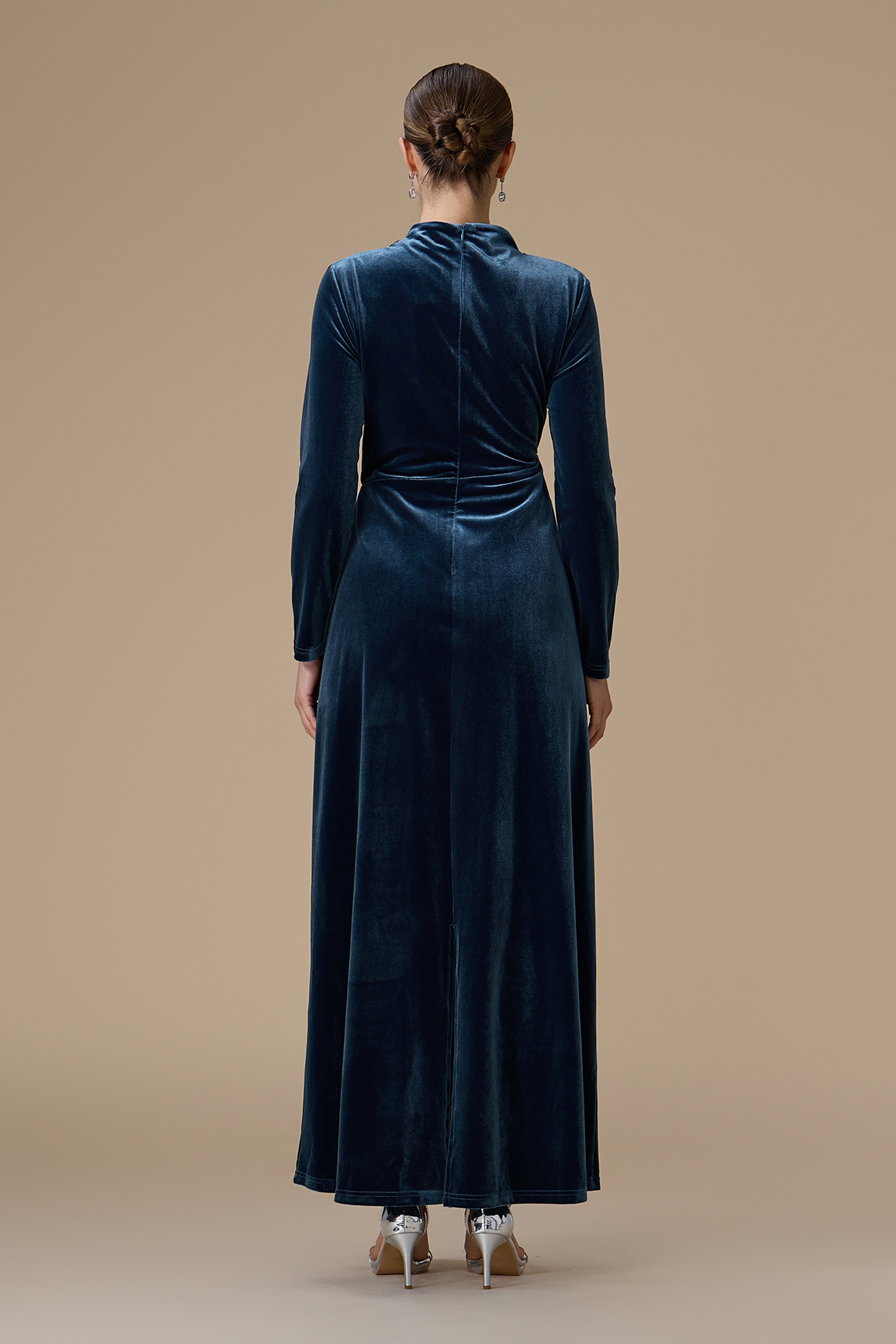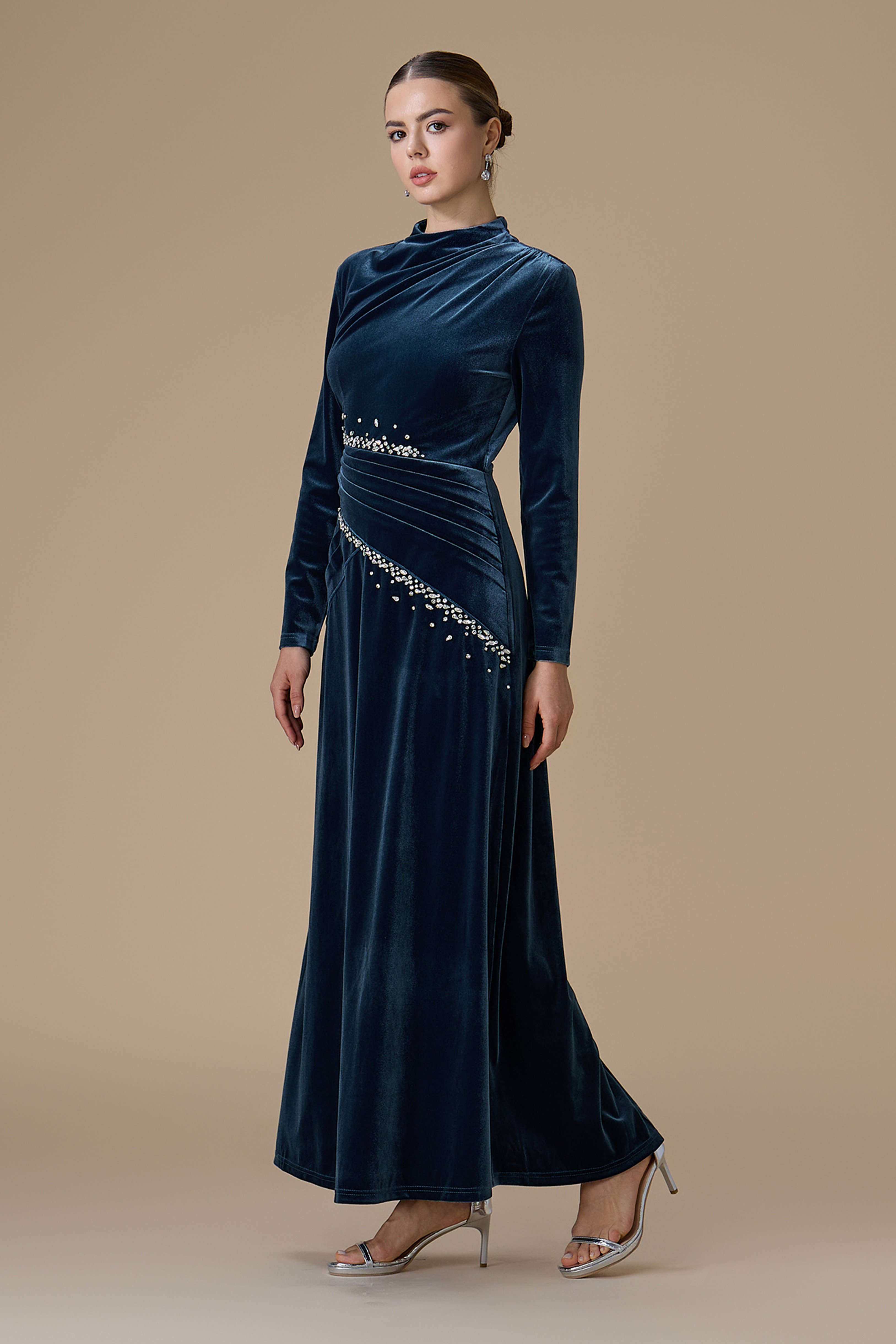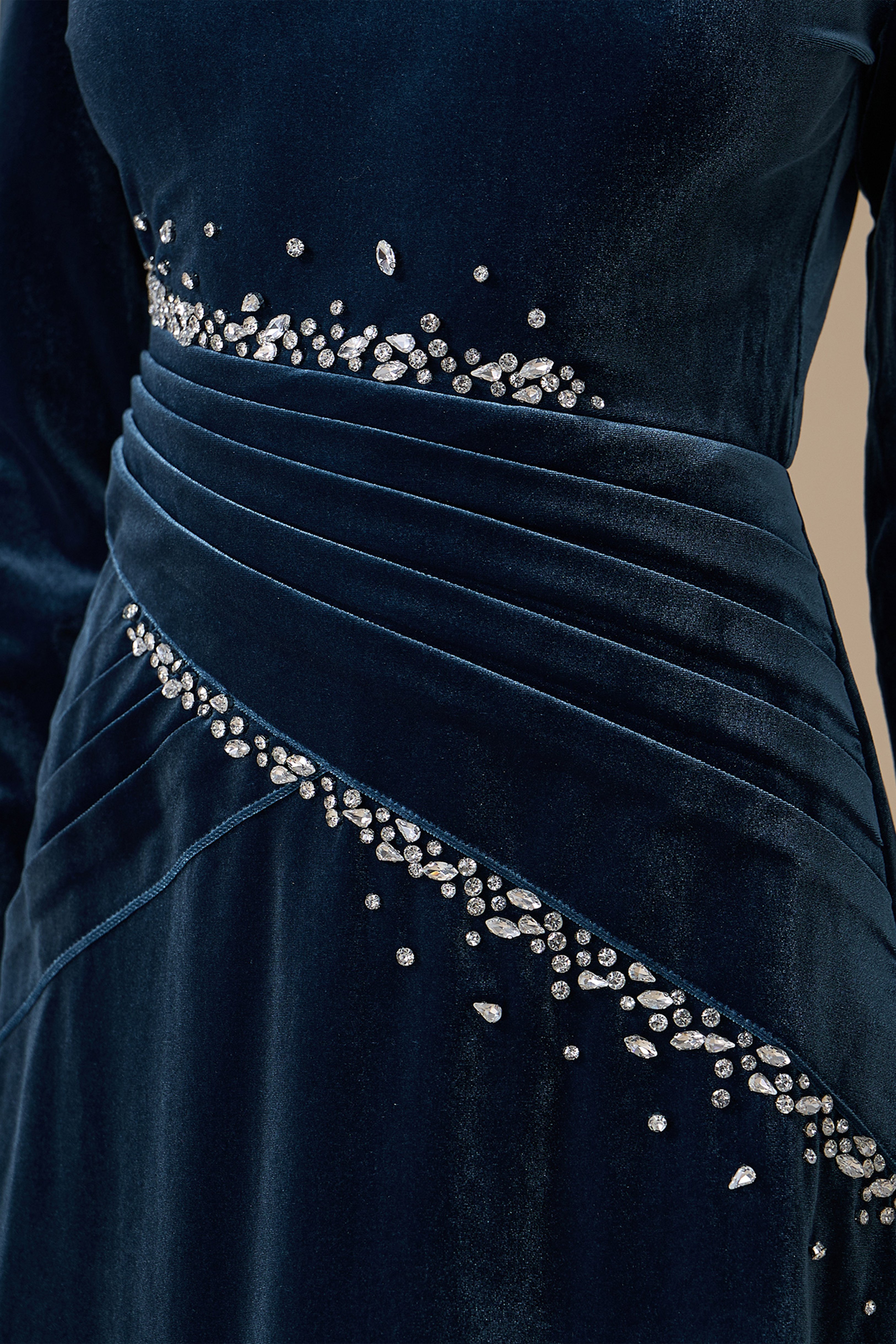 نوع القصة: فستان أزرق طويل مخمل قصة مستقيمة بطيات مائلة مزينة بالكريستال