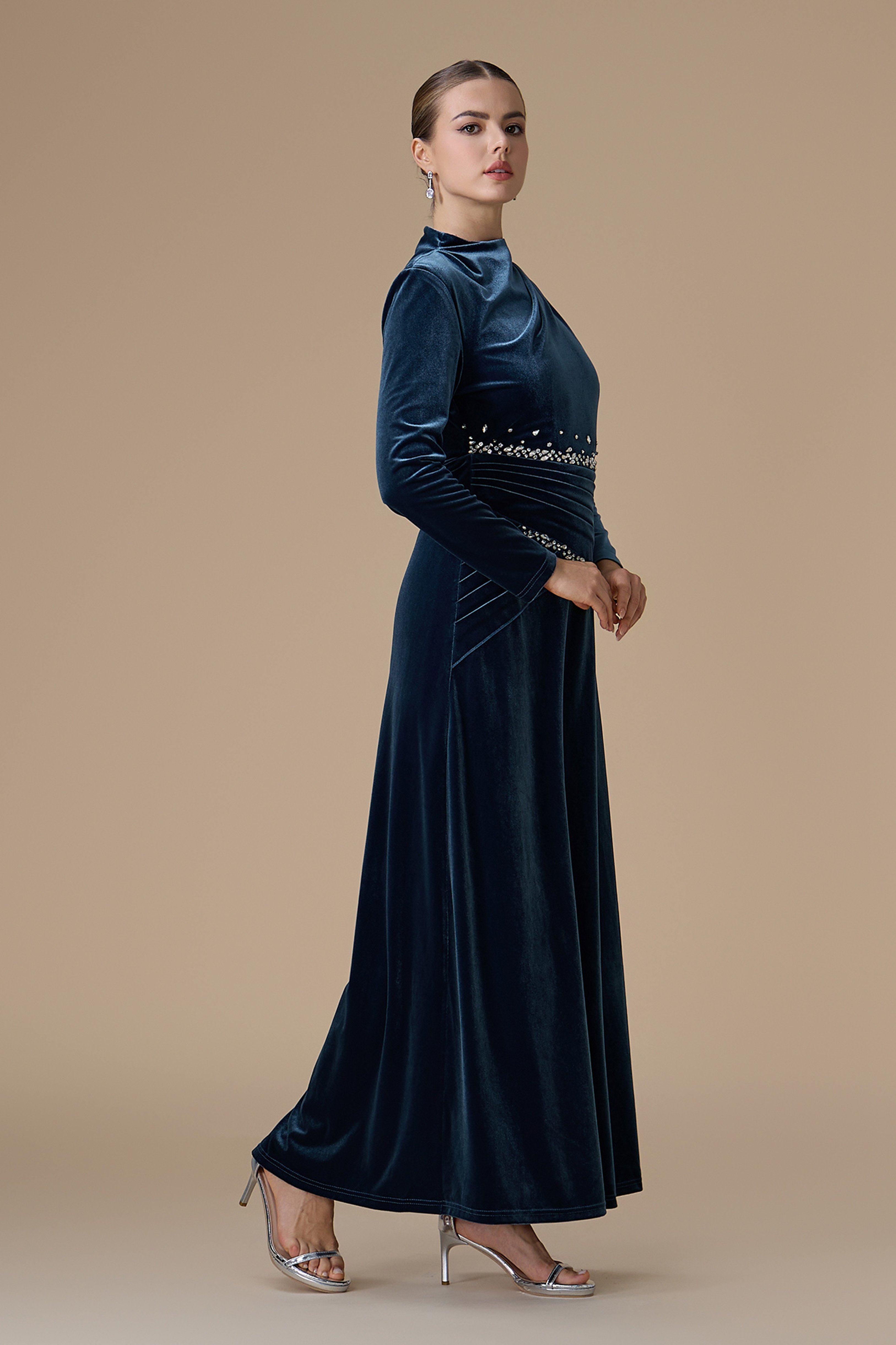 فستان أزرق طويل مخمل مزين بالكريستال