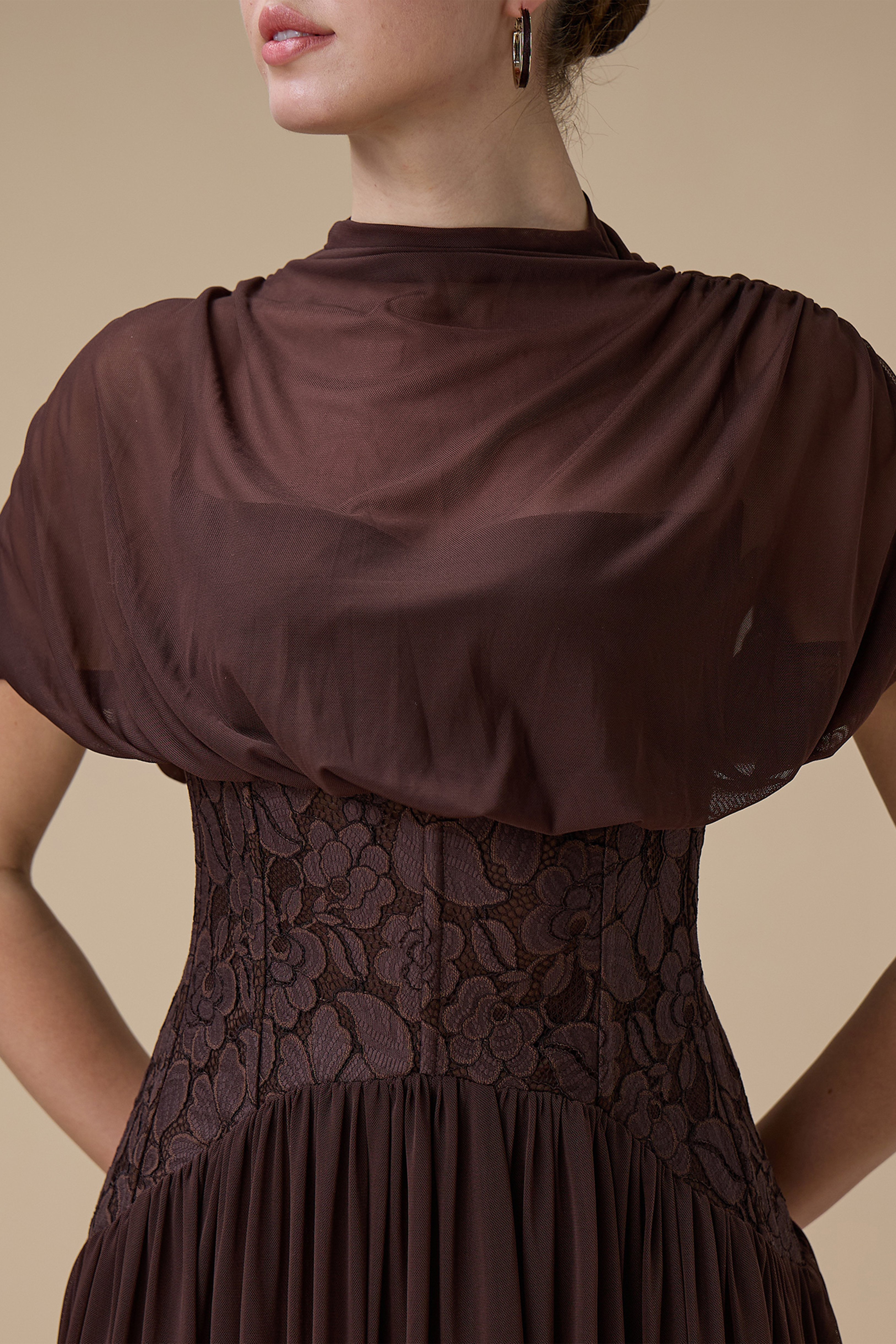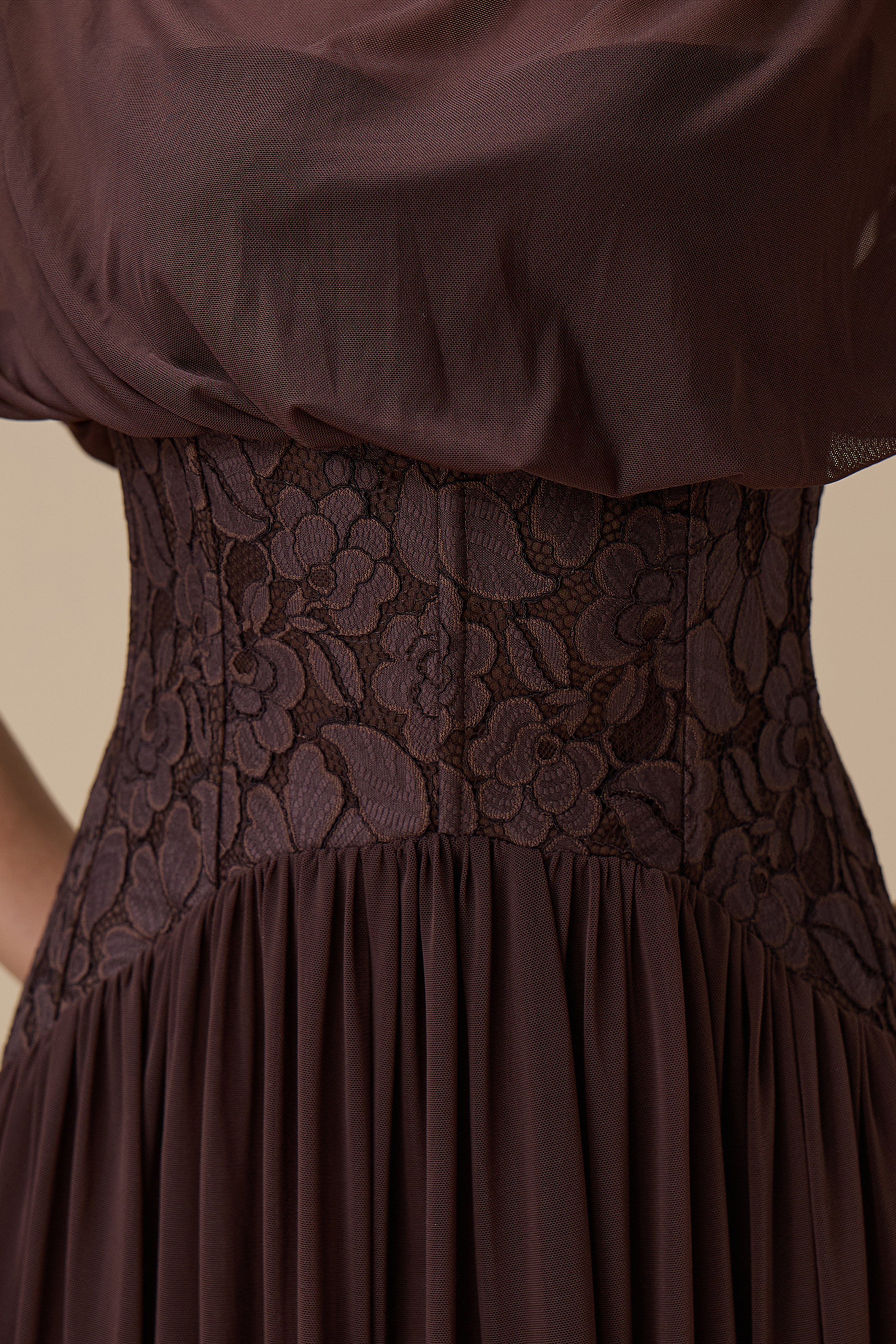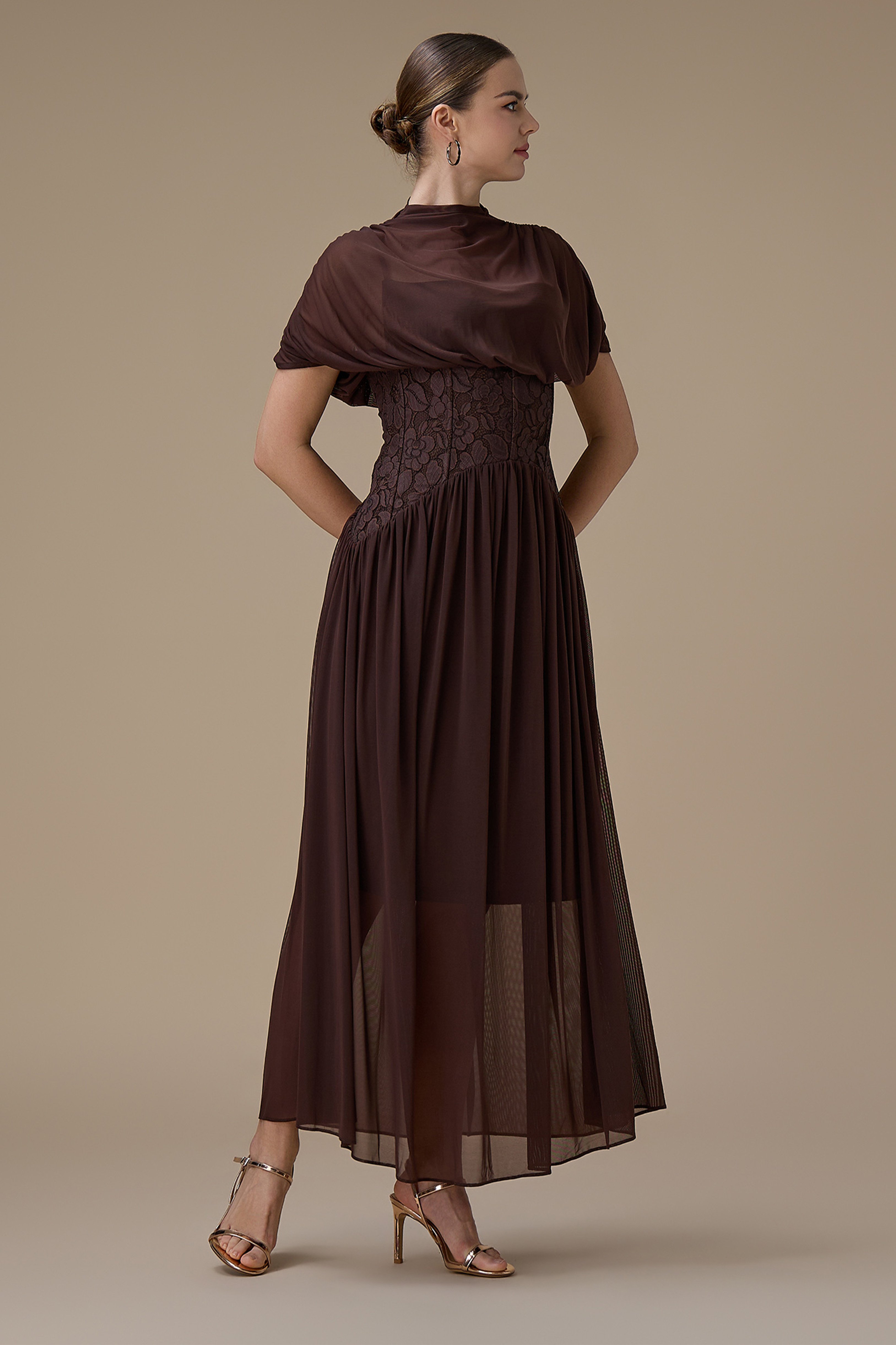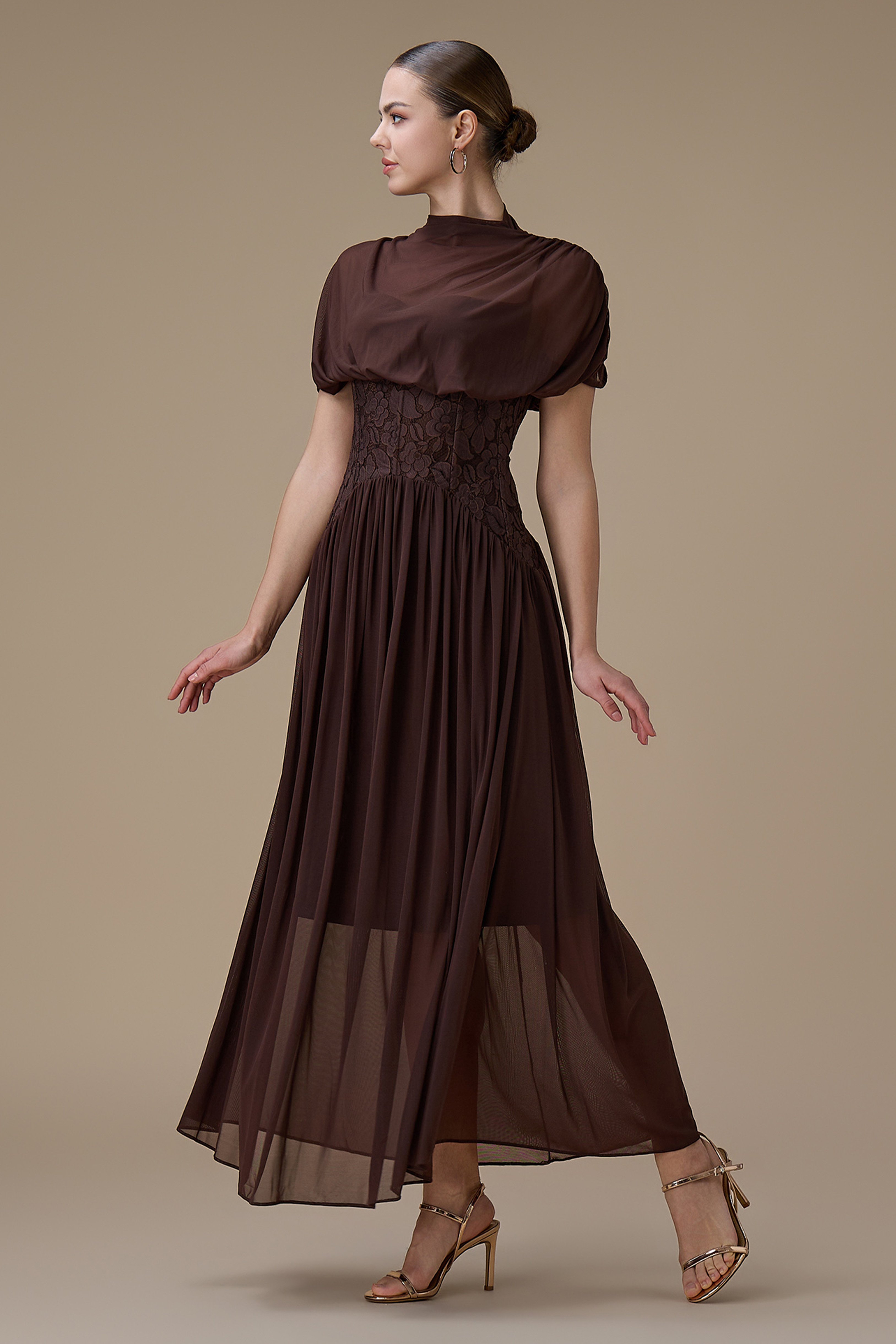 نوع القصة: فستان طويل بني شيفون ناعم مع دانتيل مطرز بأكمام قصيرة وياقة عالية