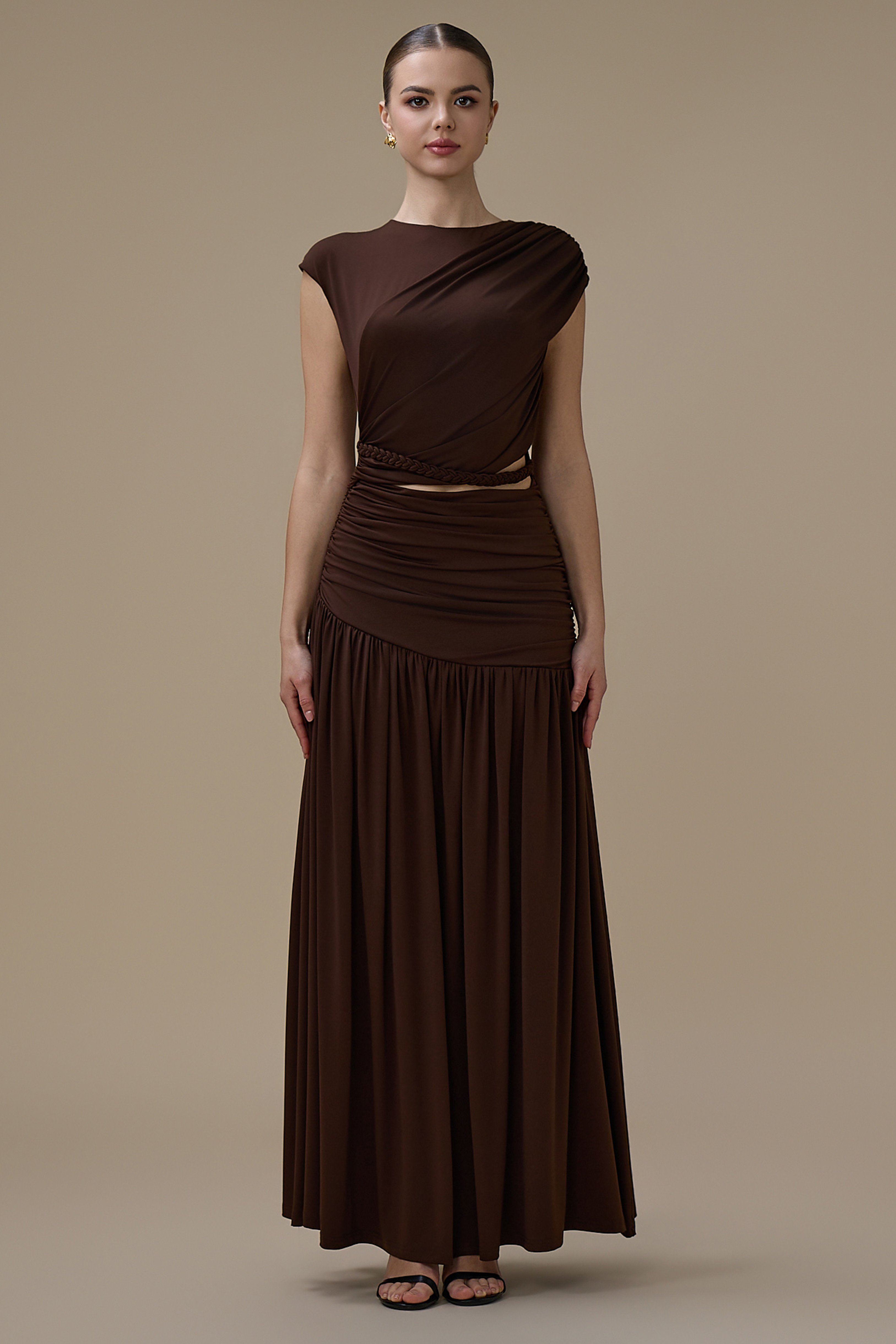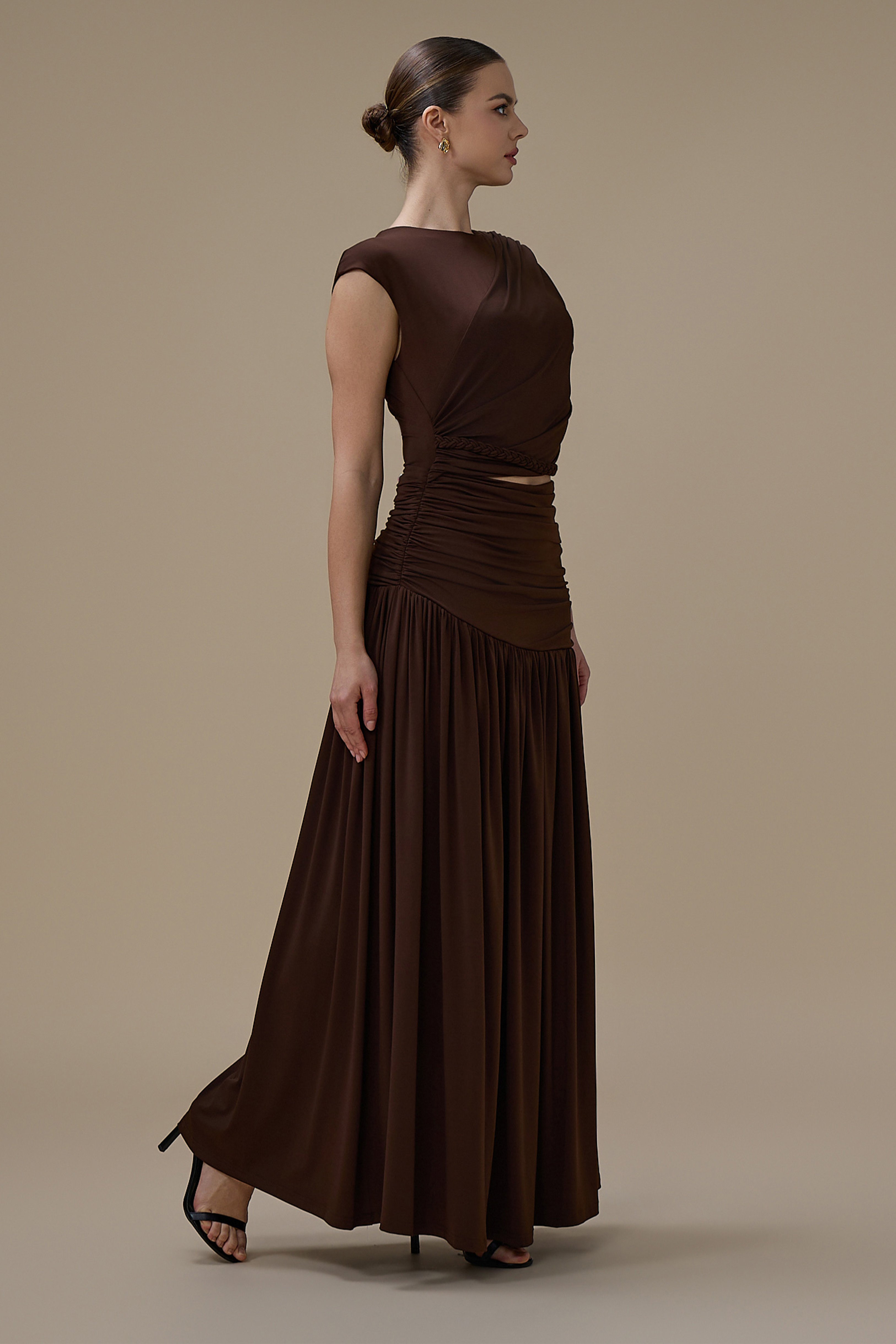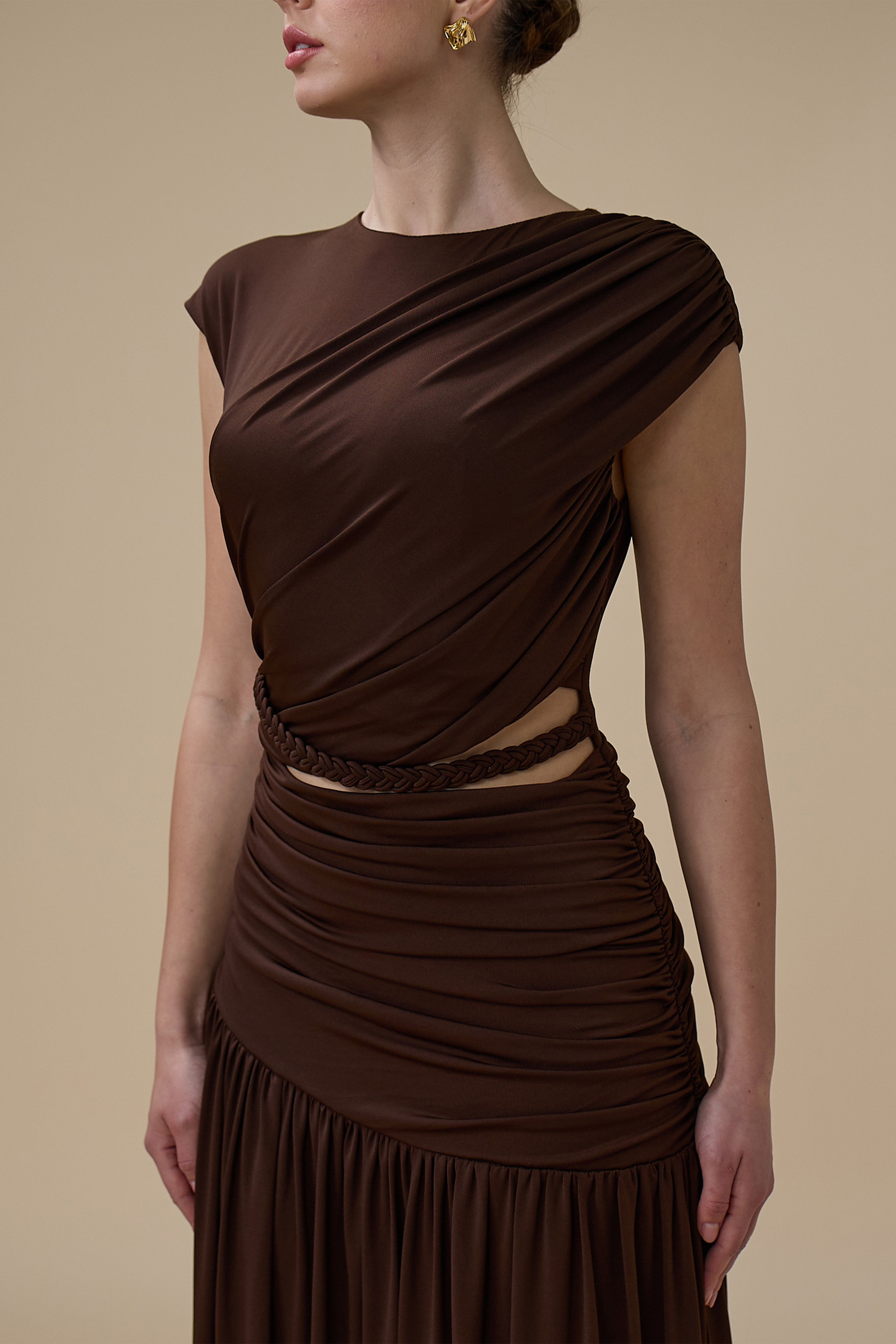 نوع القصة: فستان طويل بني درابيه بفتحة من الخصر وشكل حزام مضفّر بياقة مستديرة