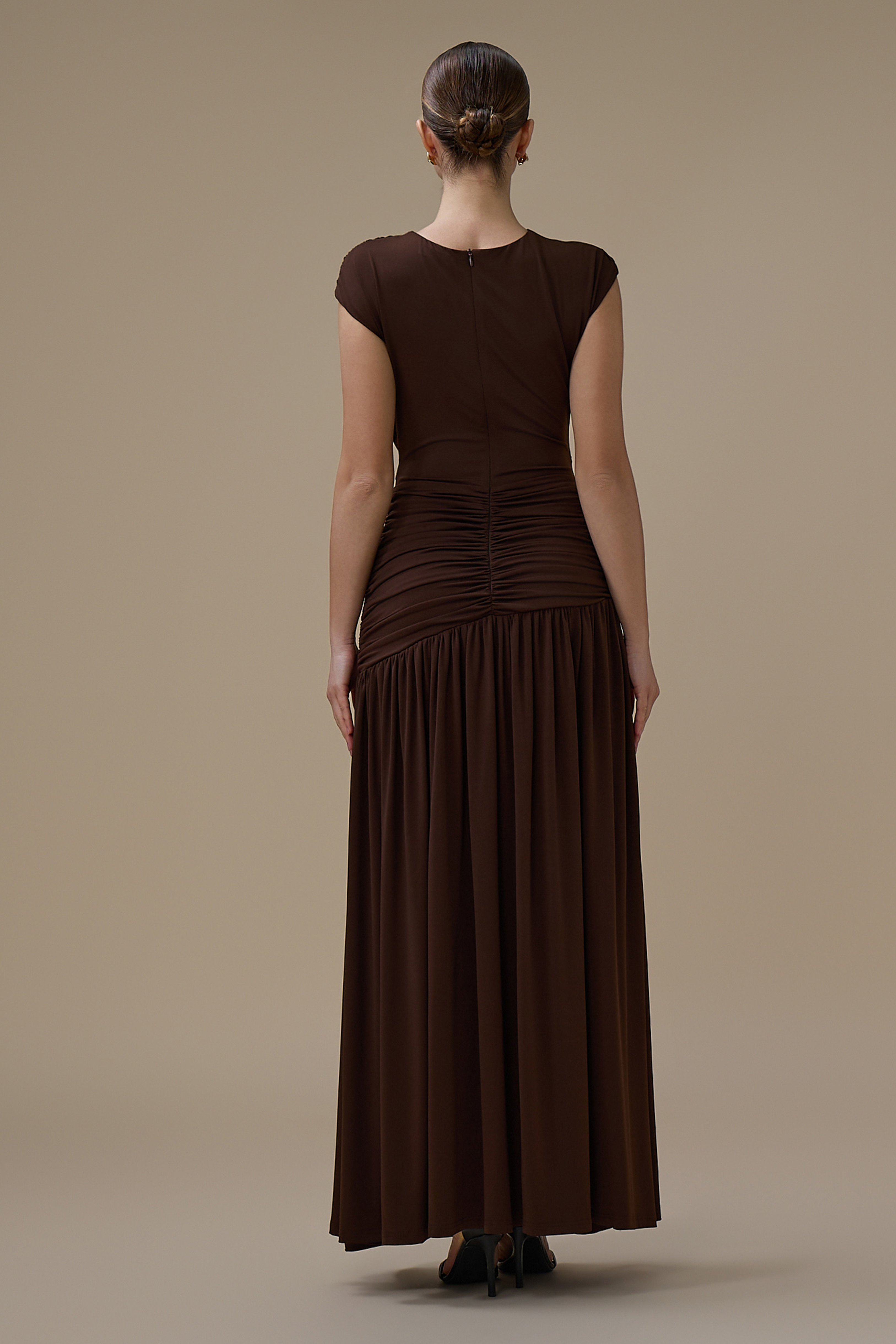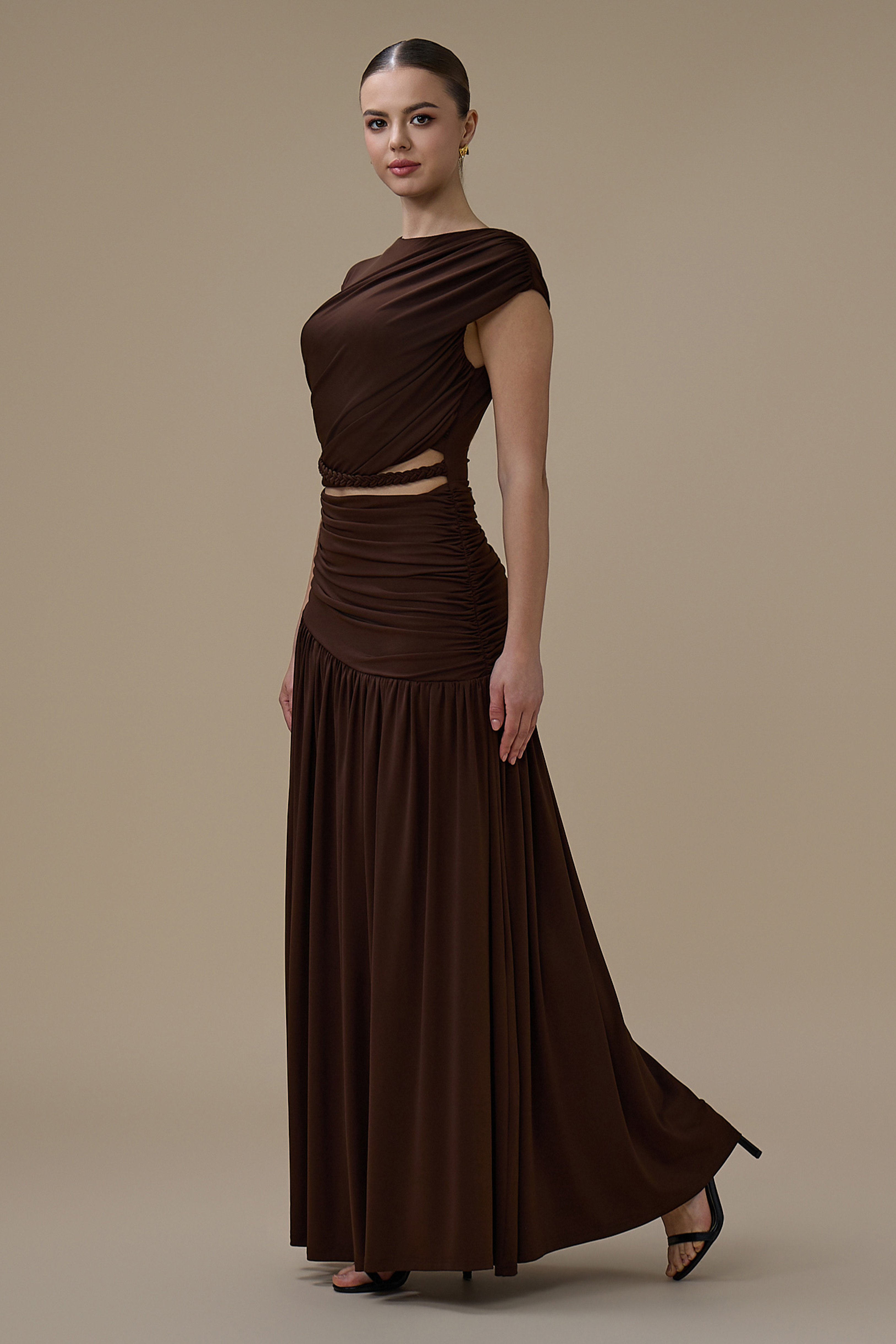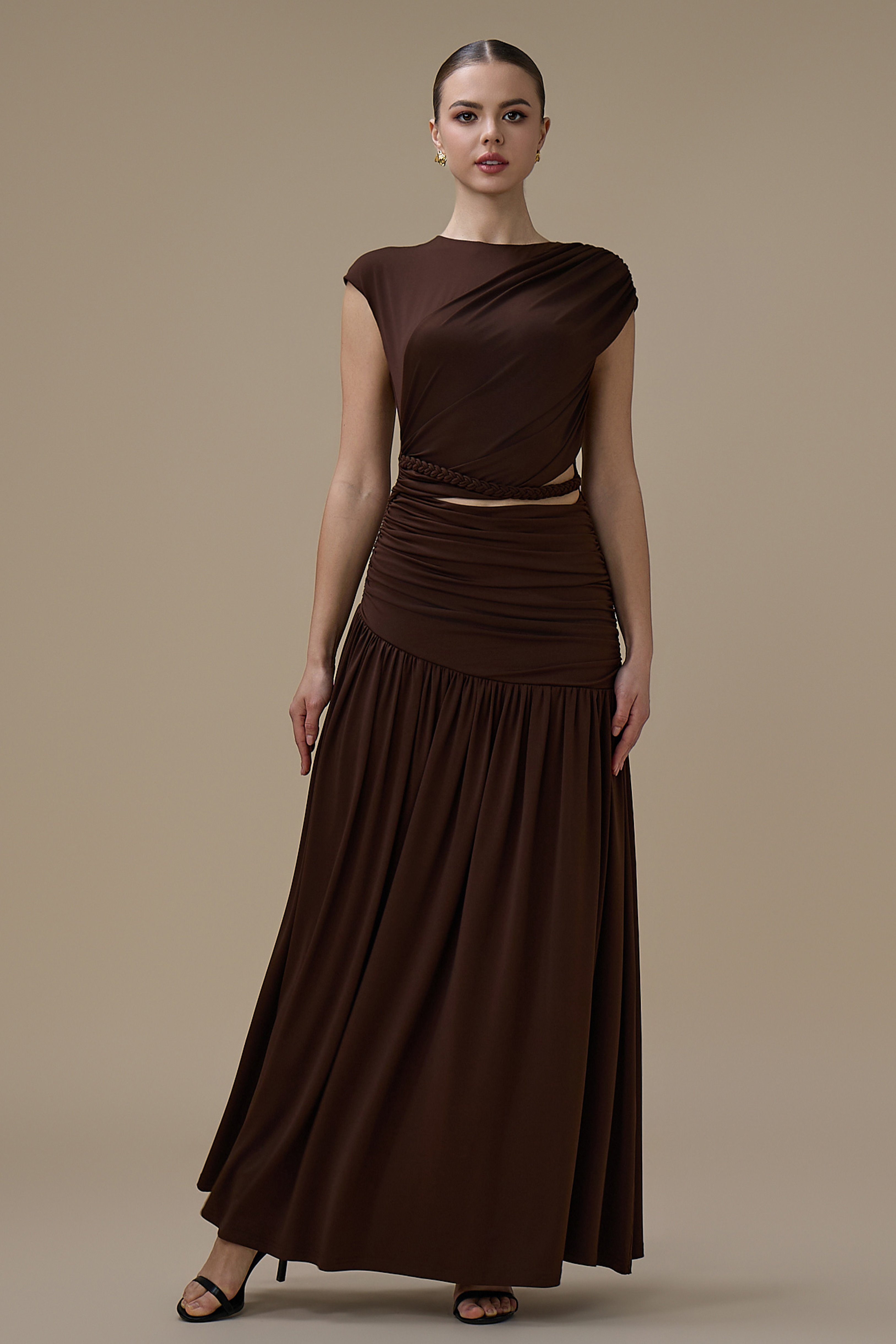 نوع القصة: فستان طويل بني درابيه بفتحة من الخصر وشكل حزام مضفّر بياقة مستديرة