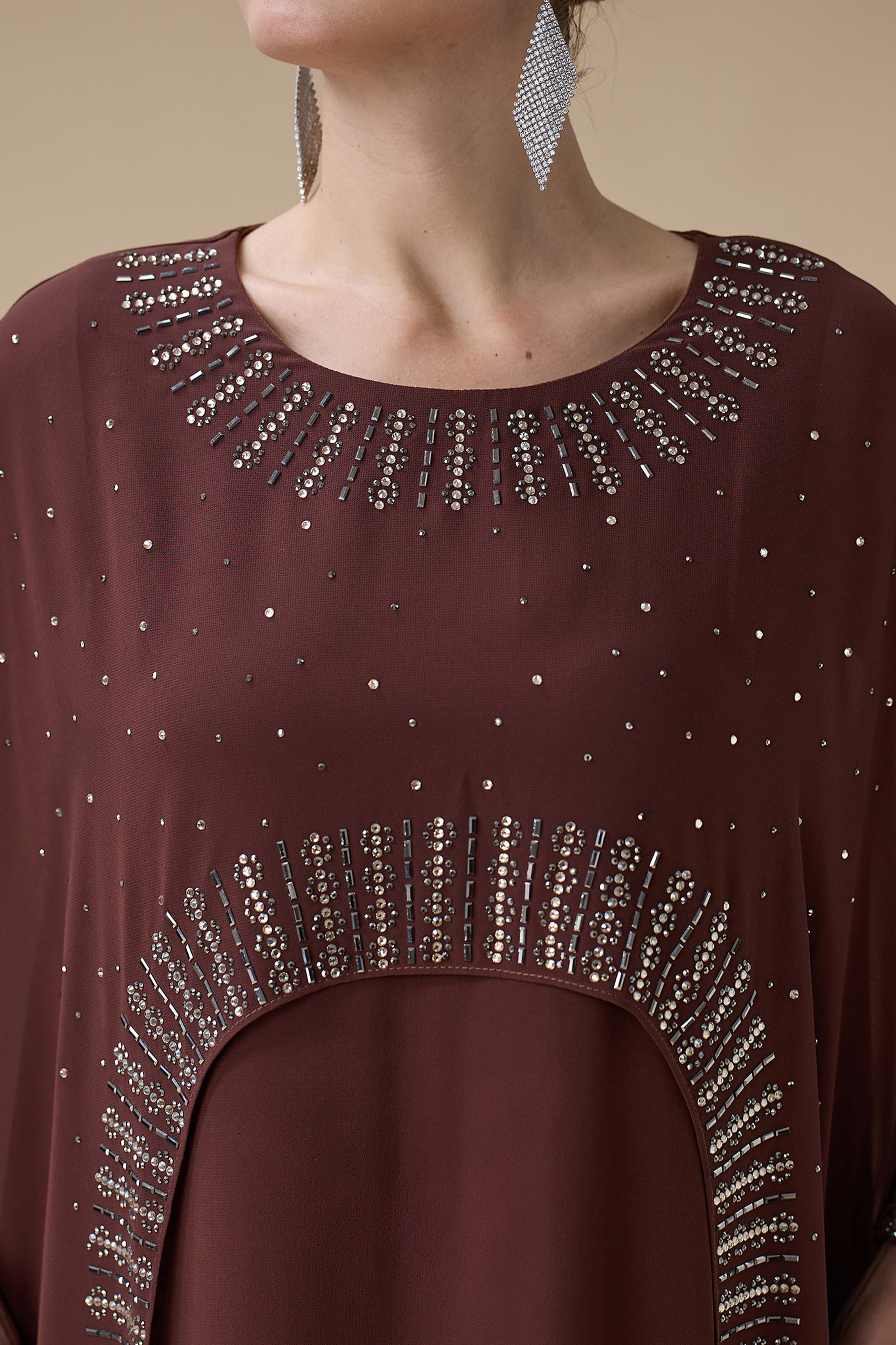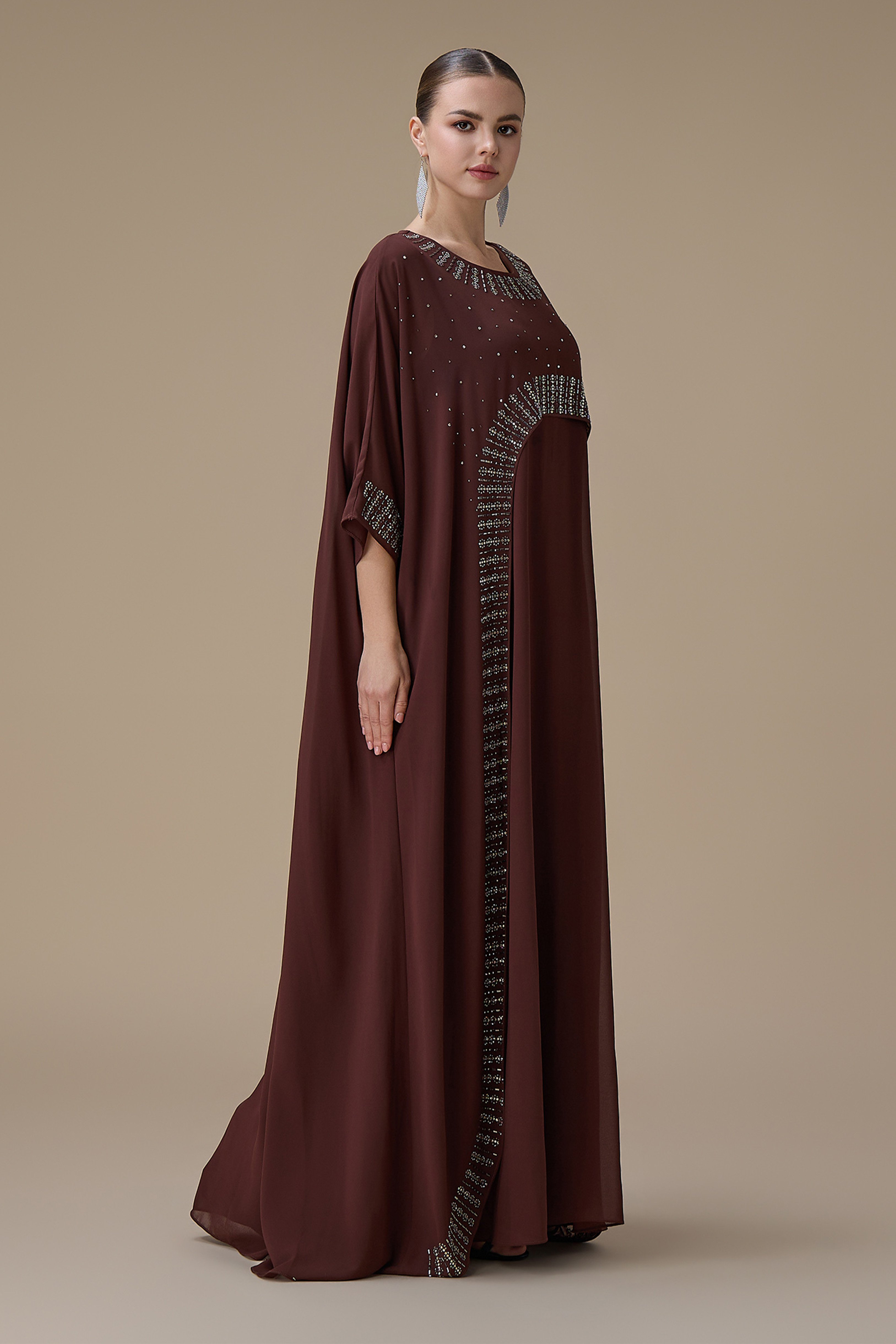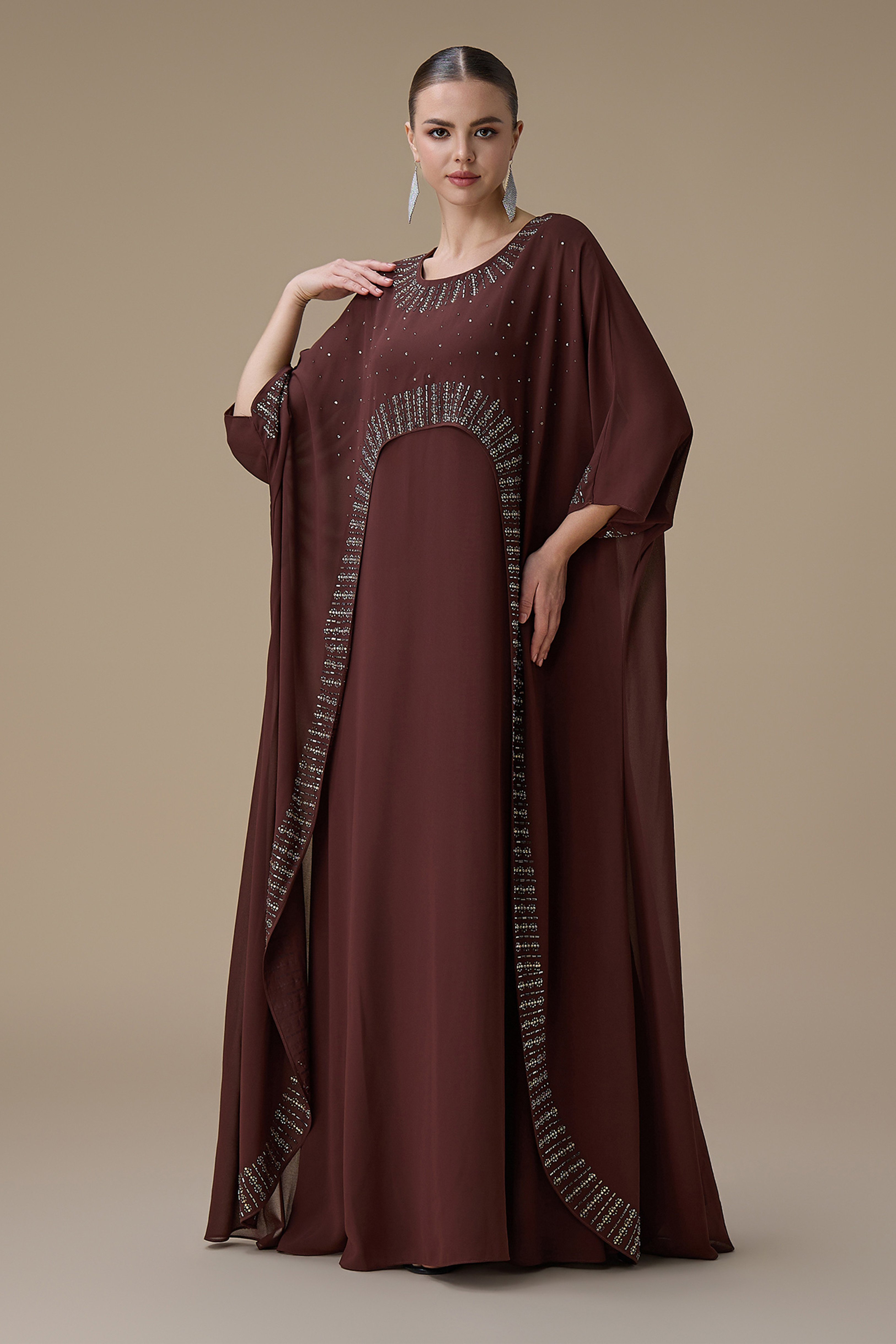 نوع القصة: جلابية طويلة بني واسعة بتطريز بقطعتين أكمام متوسطة الطول وياقة دائرية