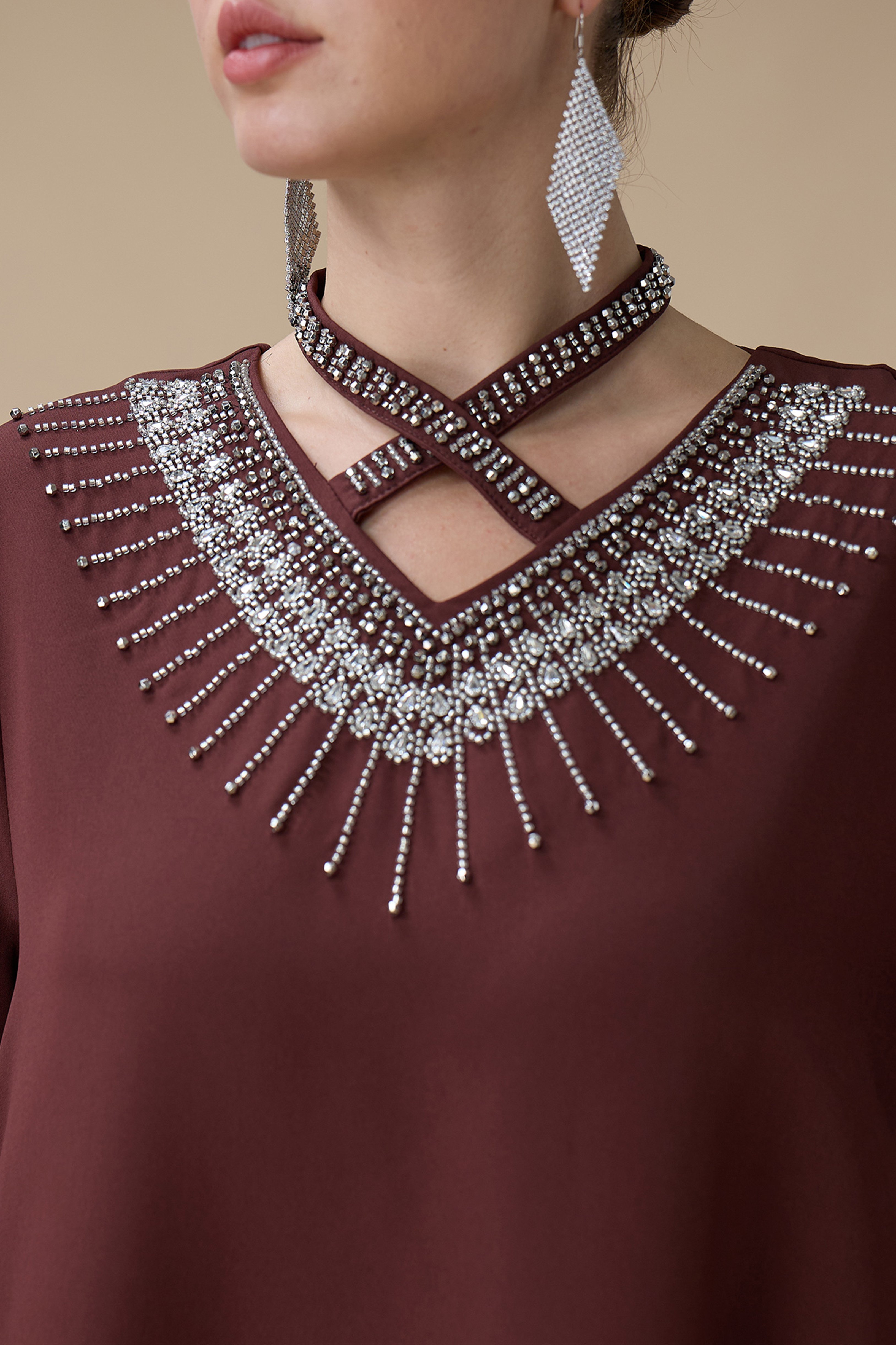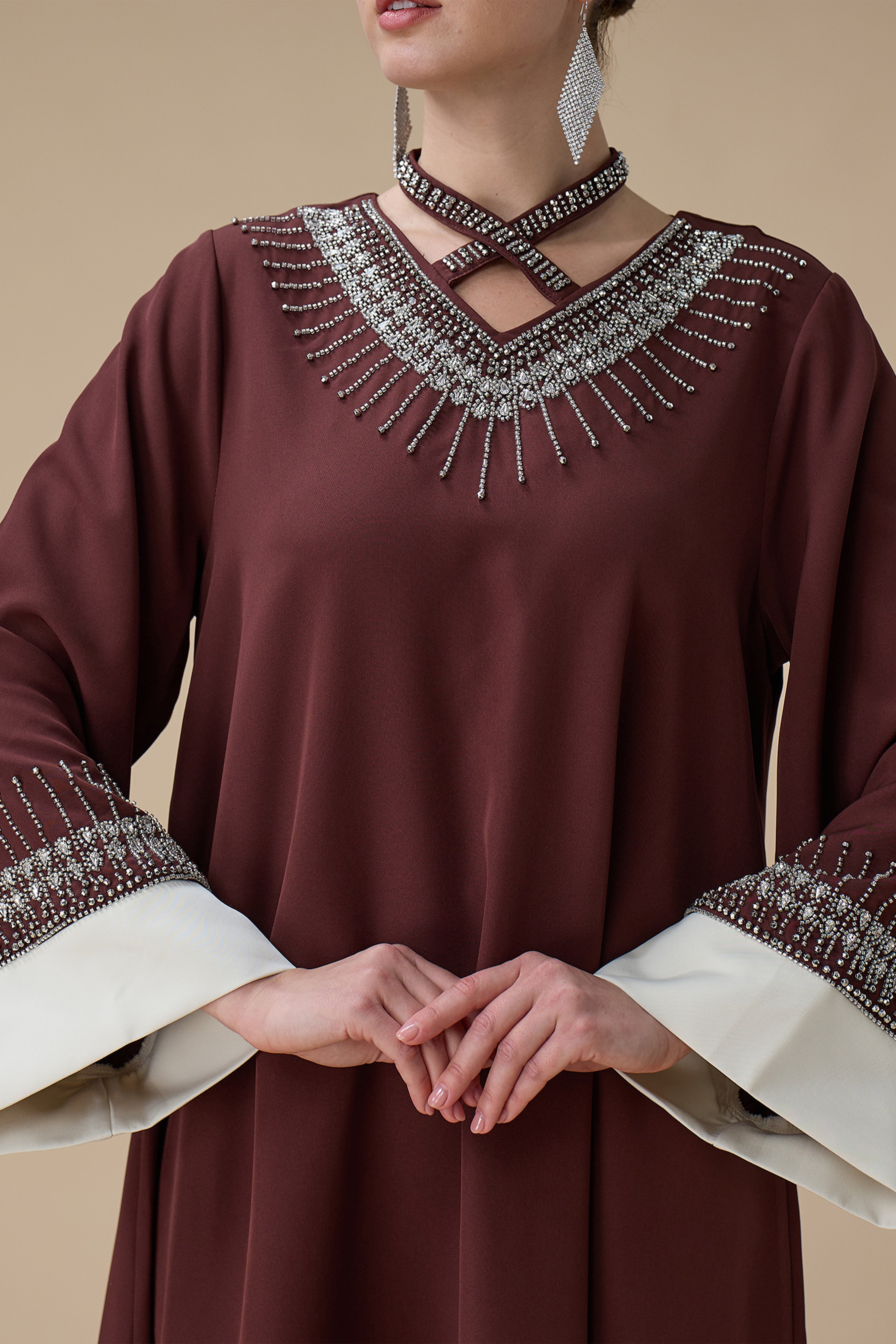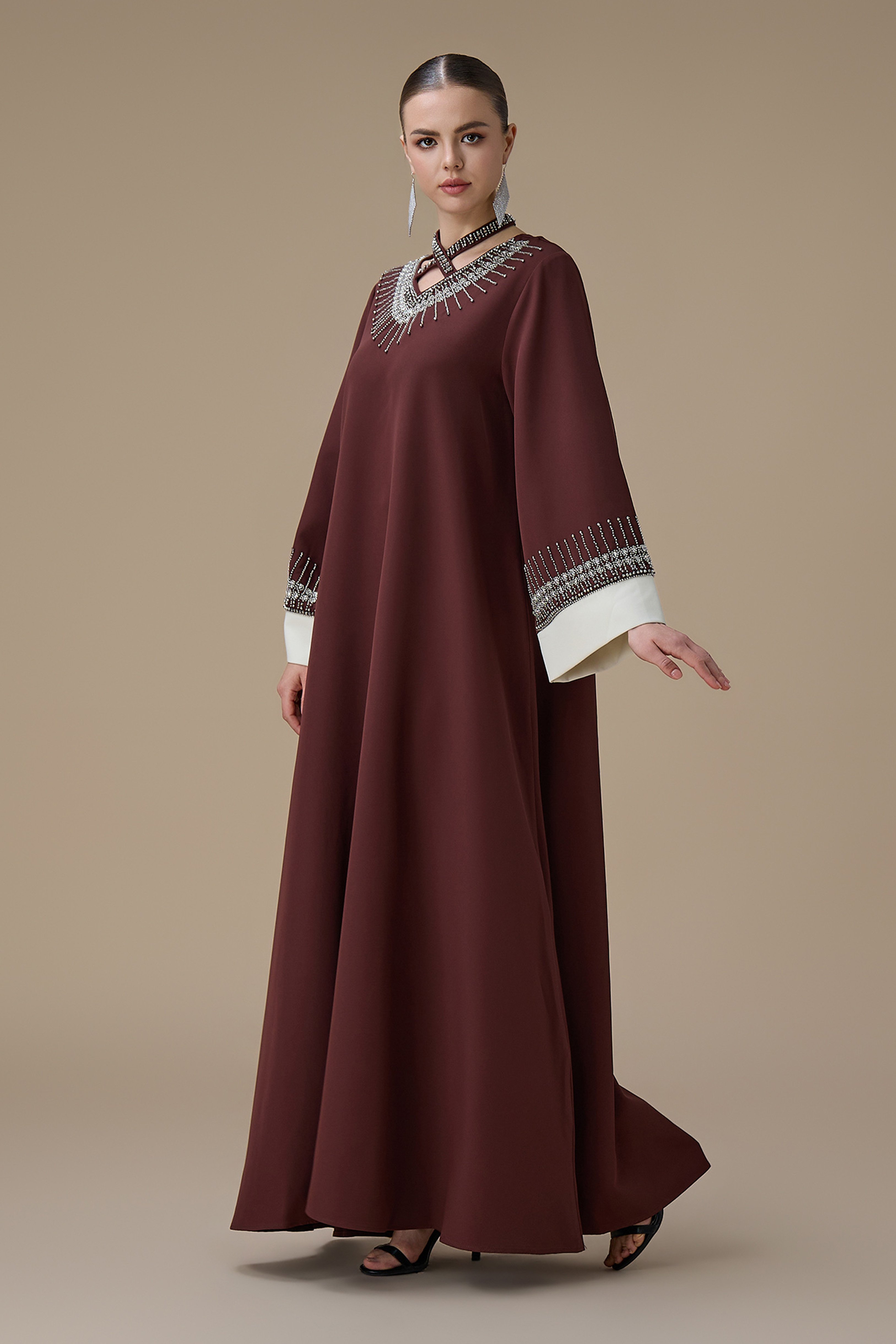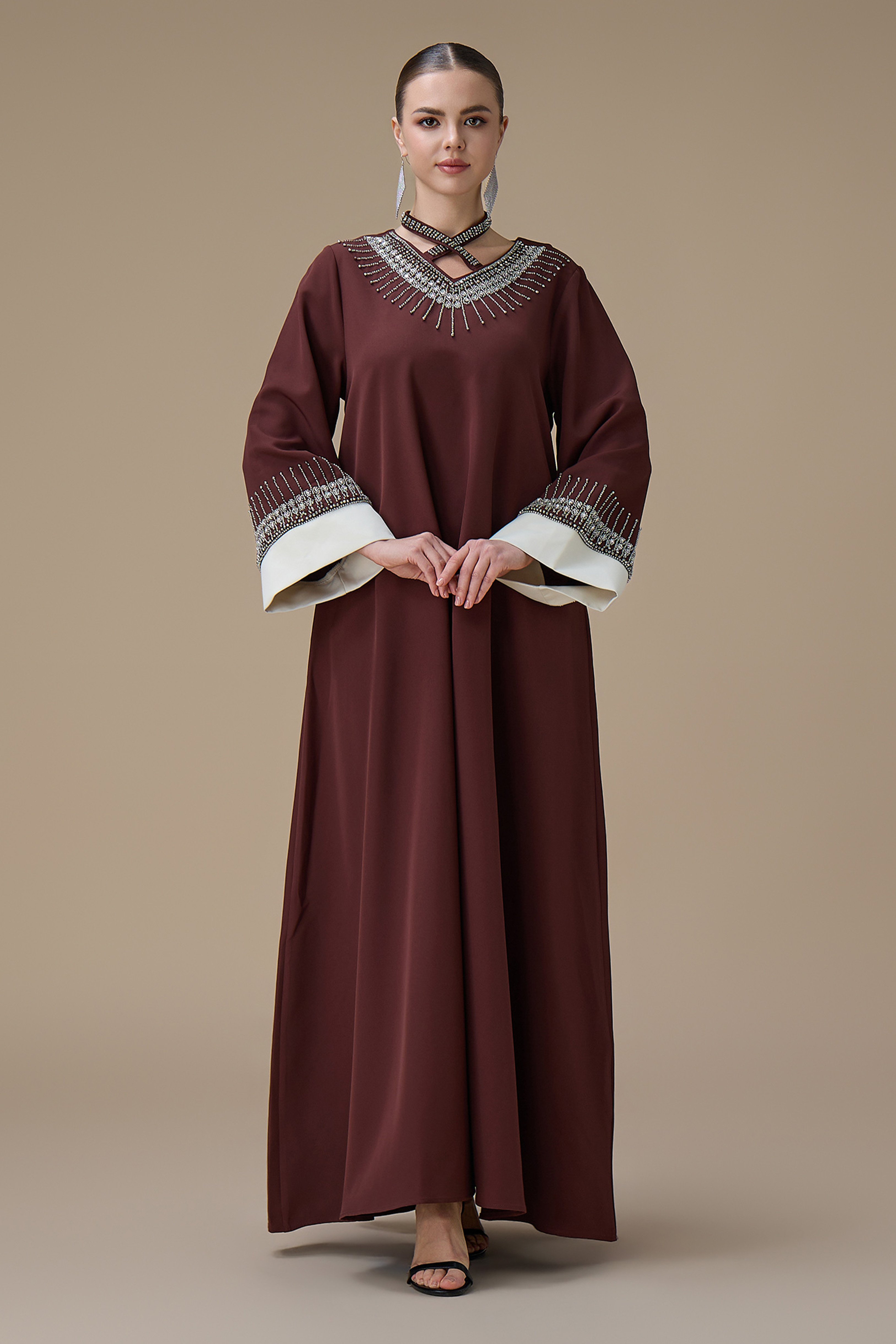 نوع القصة: جلابية طويلة بني بتطريز انيق بياقة متقاطعة وأكمام طويلة