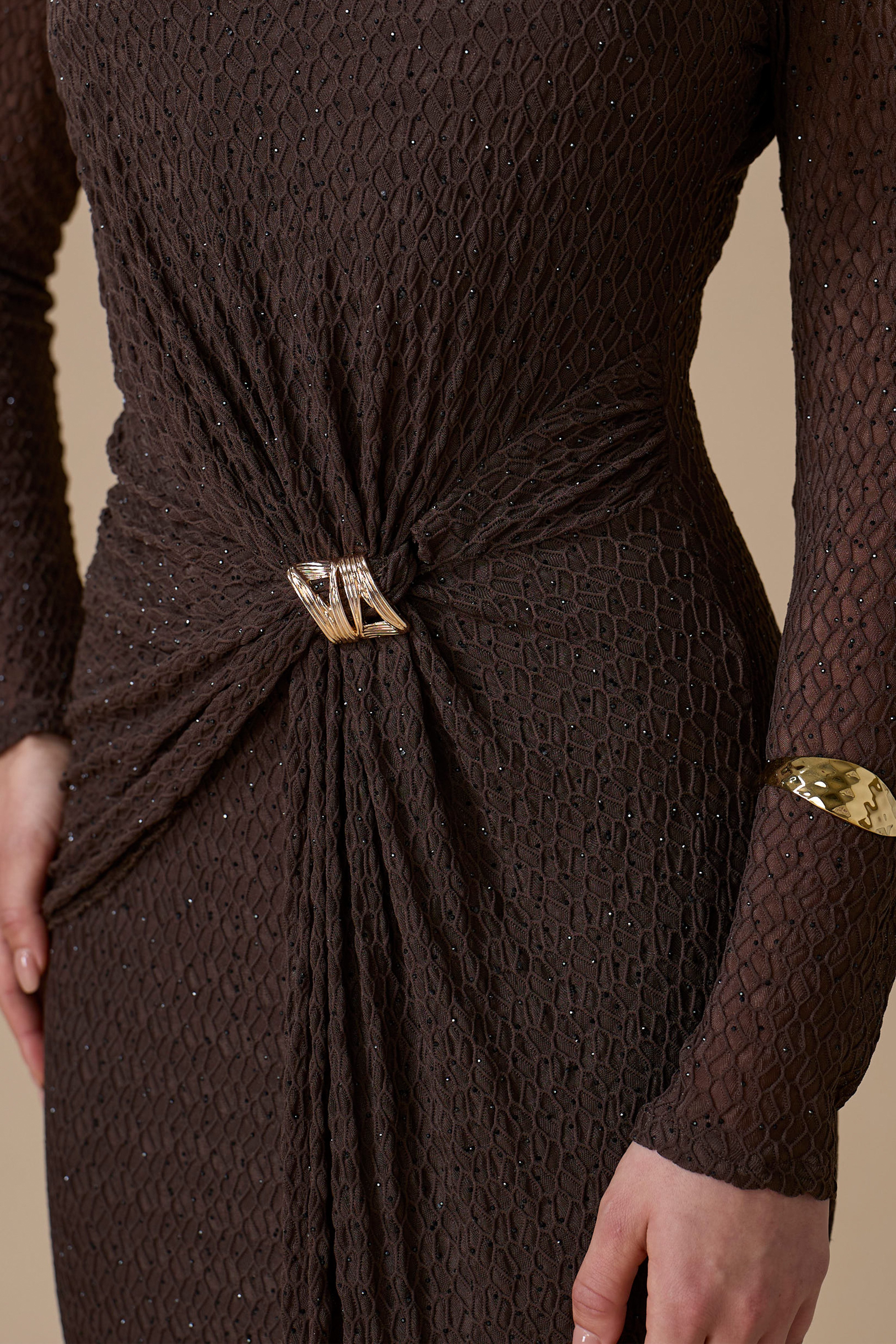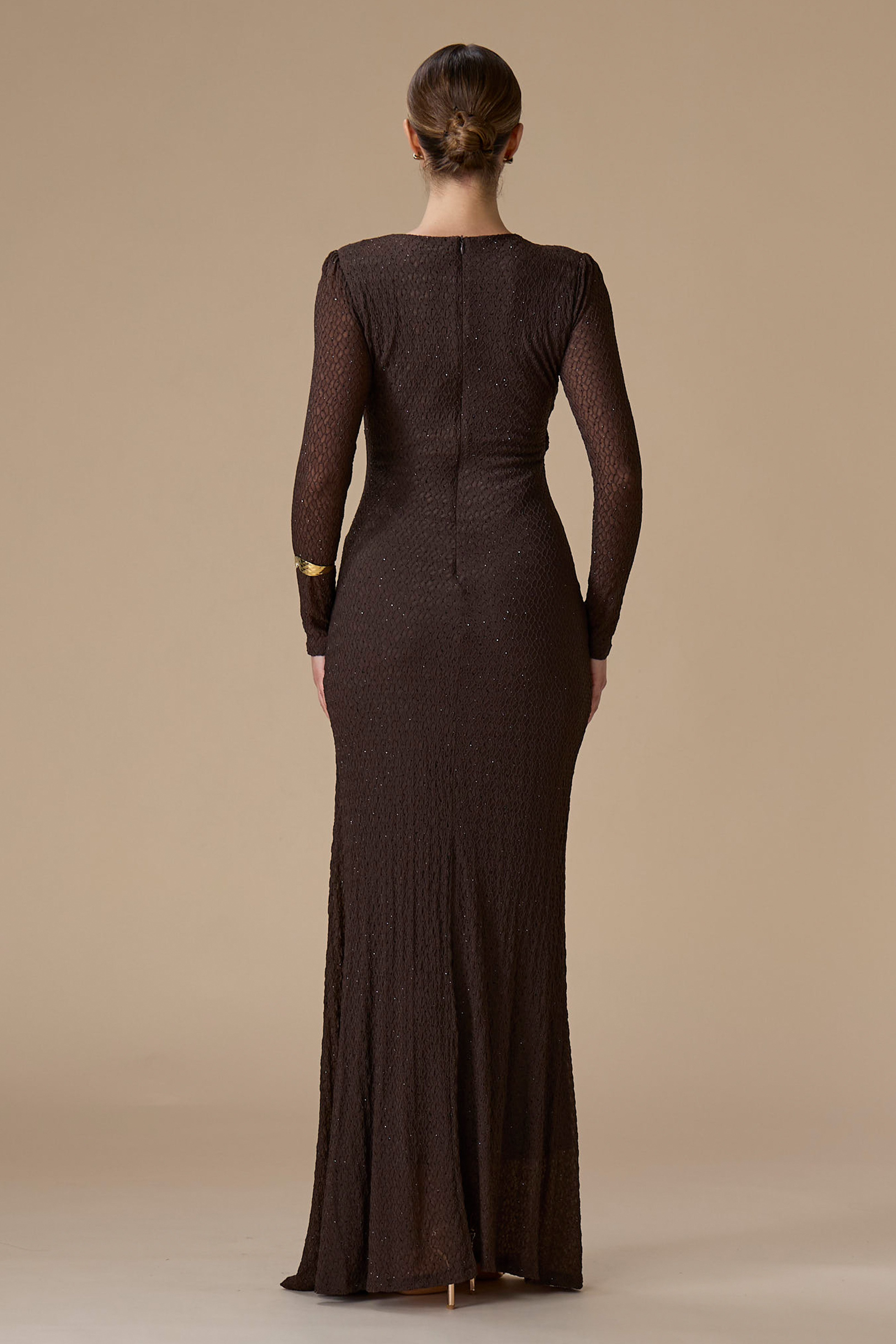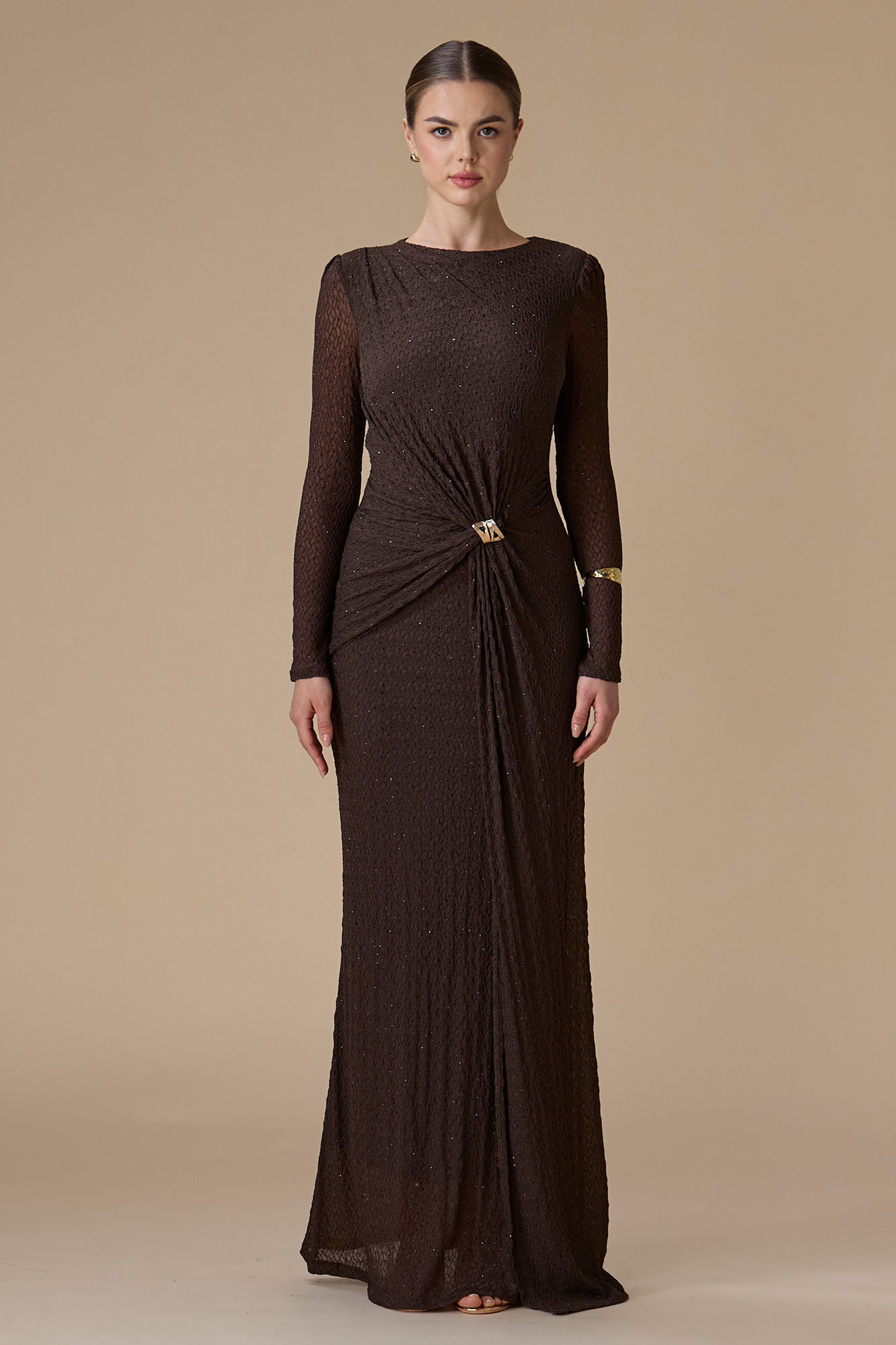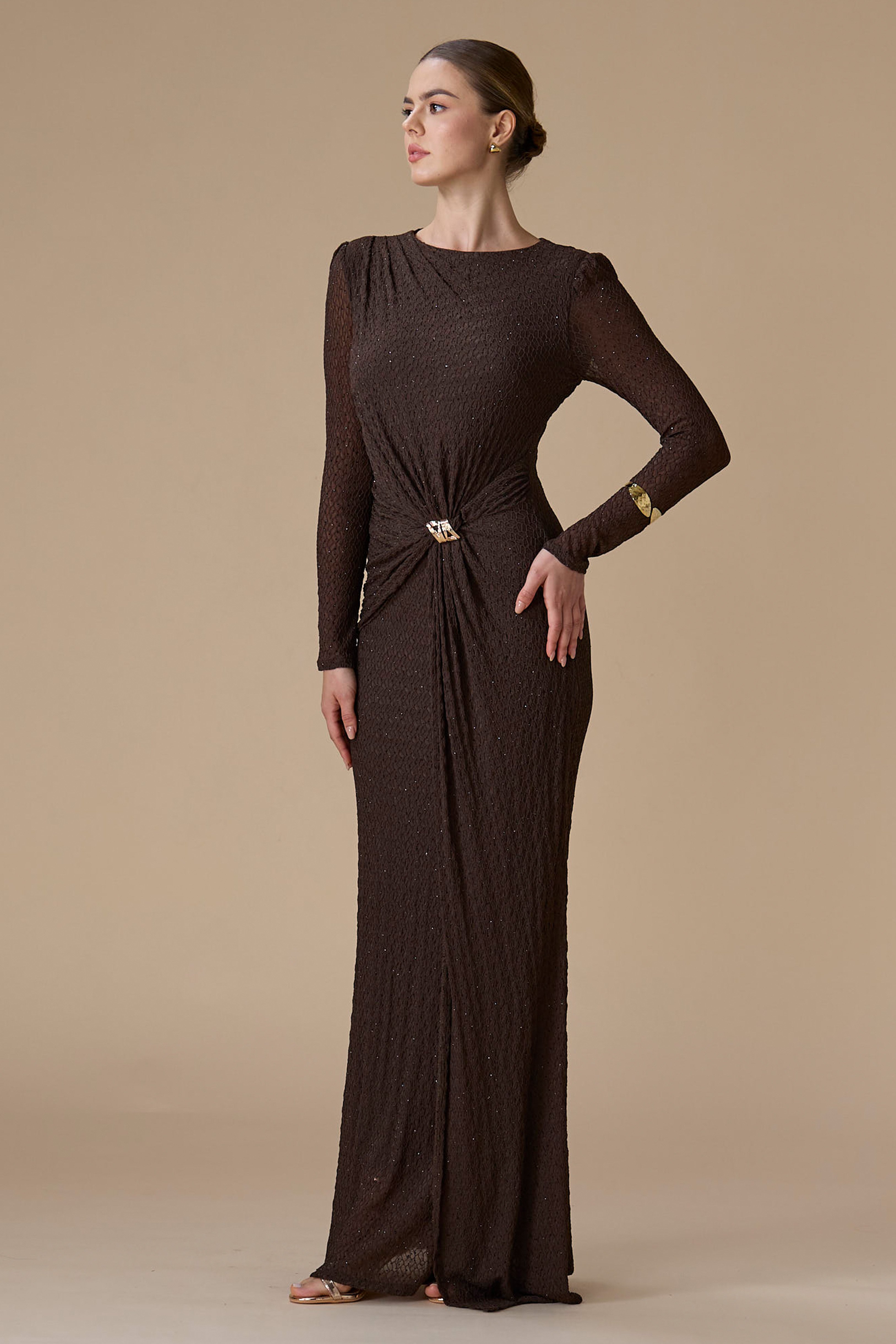 فستان بني طويل مزموم عند الخصر مزين بالفصوص بأكمام طويلة وضيقة