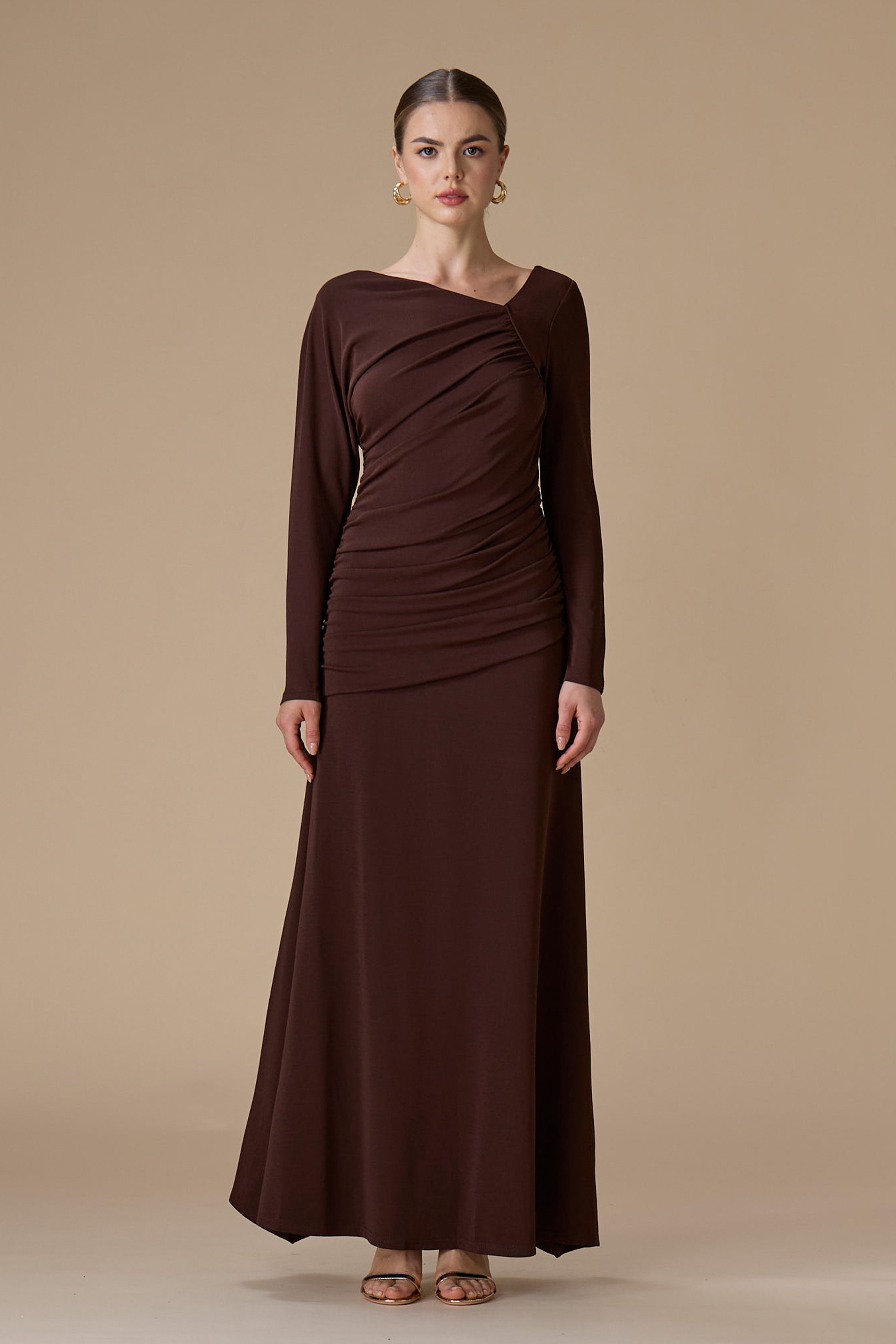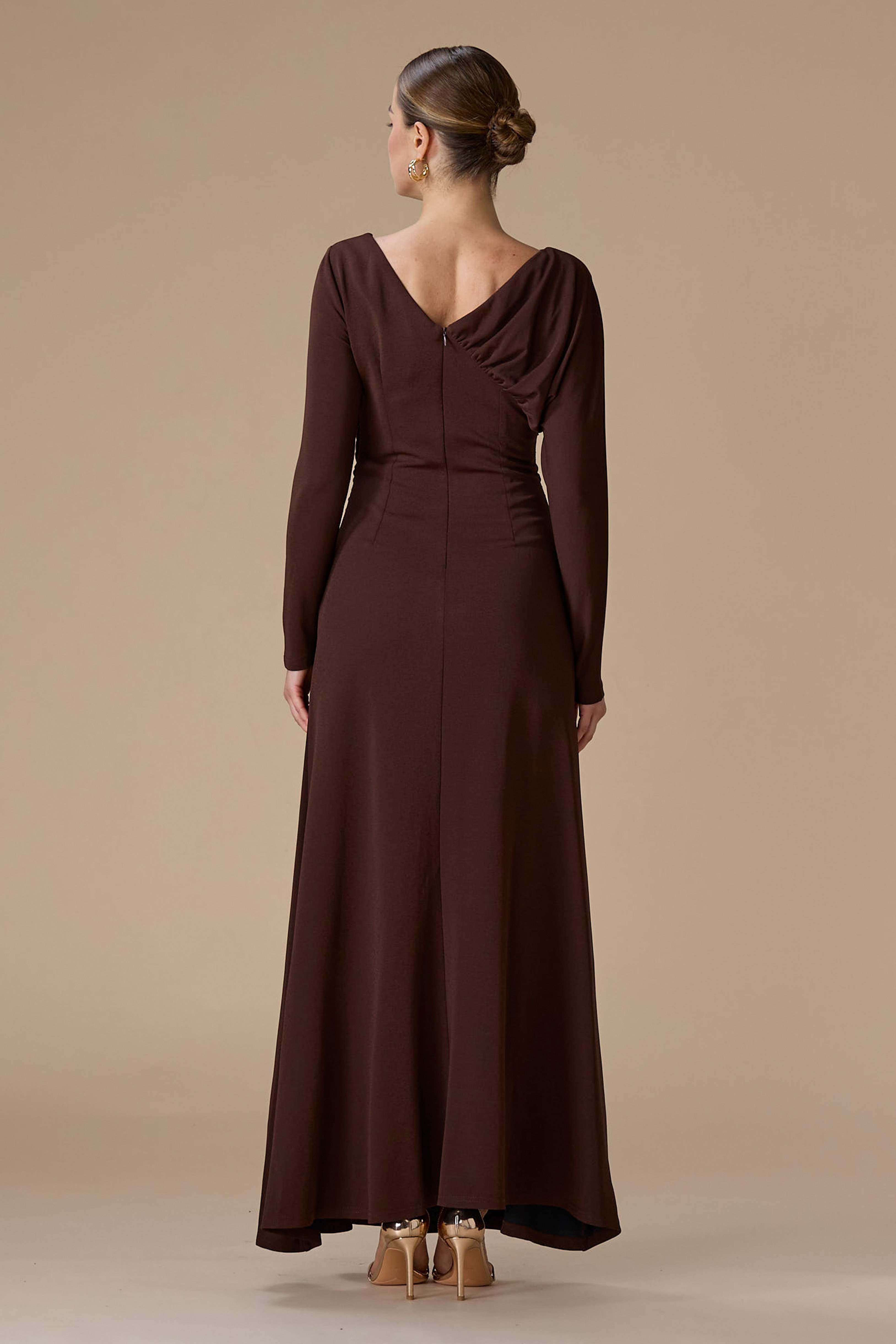 - نوع القصة: فستان بني درابيه طويل بقصة مستقيمة بياقة غير متماثلة وأكمام طويلة ضيقة