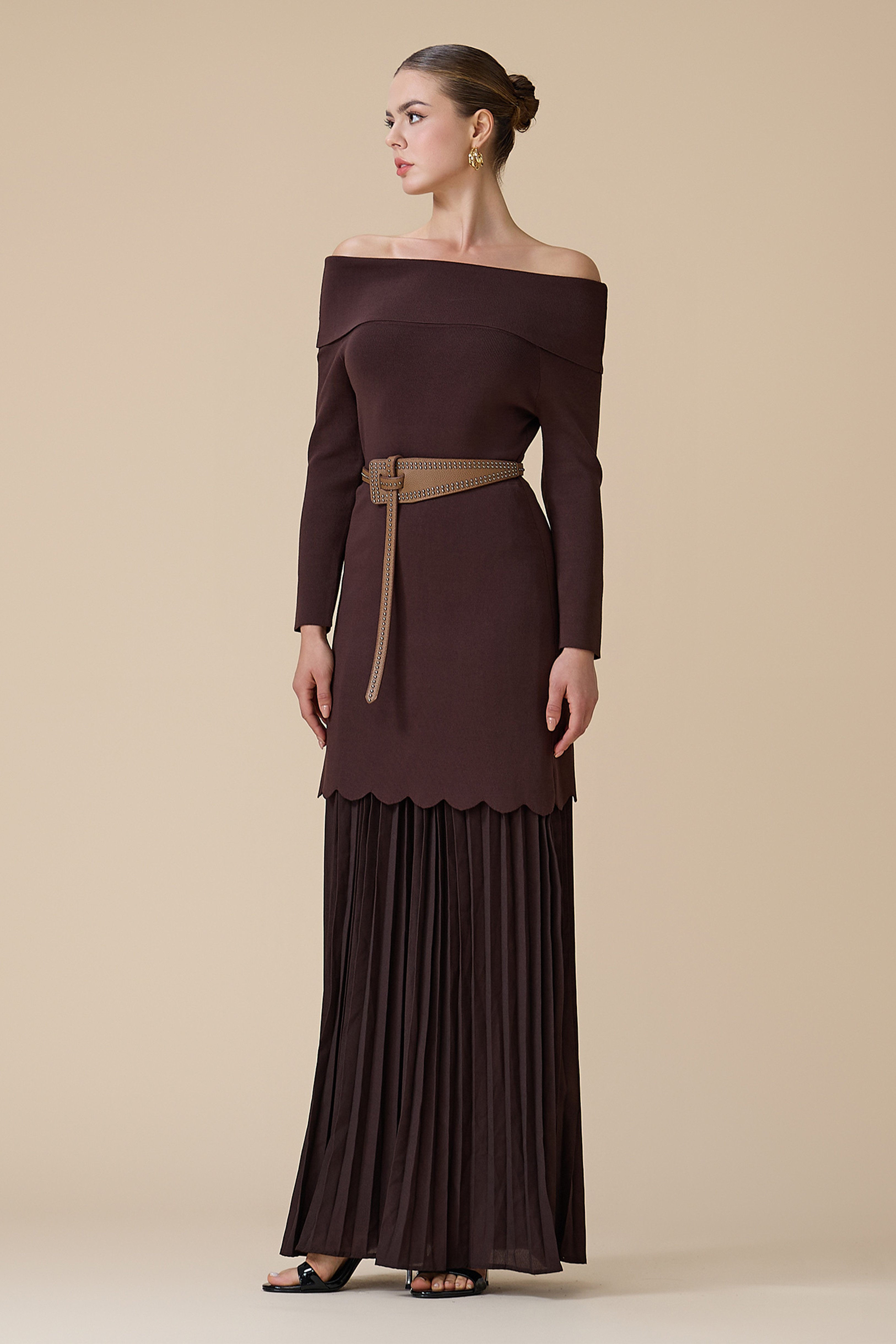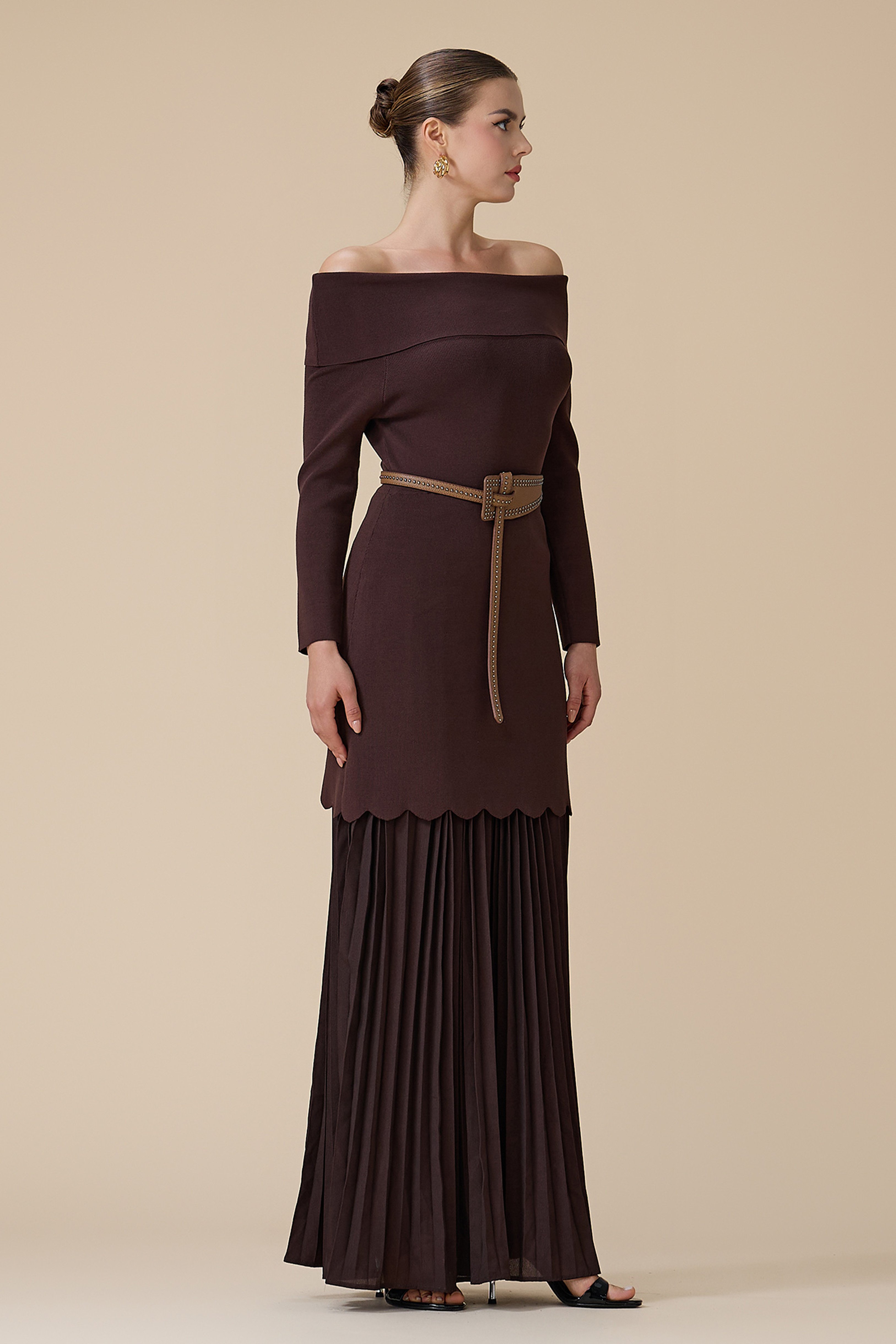 فستان بني طويل أوف شولدر بحزام وأكمام طويلة بأطراف بليسيه