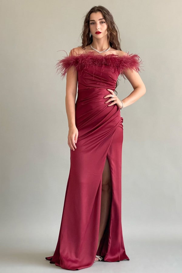 الخامة خفيف التمدد نوع التصميم فستان ساتان مزين بريش نوع القصة طويل قصة ورب بفتحه الاكمام اوف شولدر مزين بريش الصدر درابيه المناسبة خروج سهره الخصر مزموم الاكمام اوف شولدر التمدد غير قابل لتمدد الاضافات ريش عالاكمام ارشادات العناية قابل للغسيل والكي بدرجة حراره منخفضه
