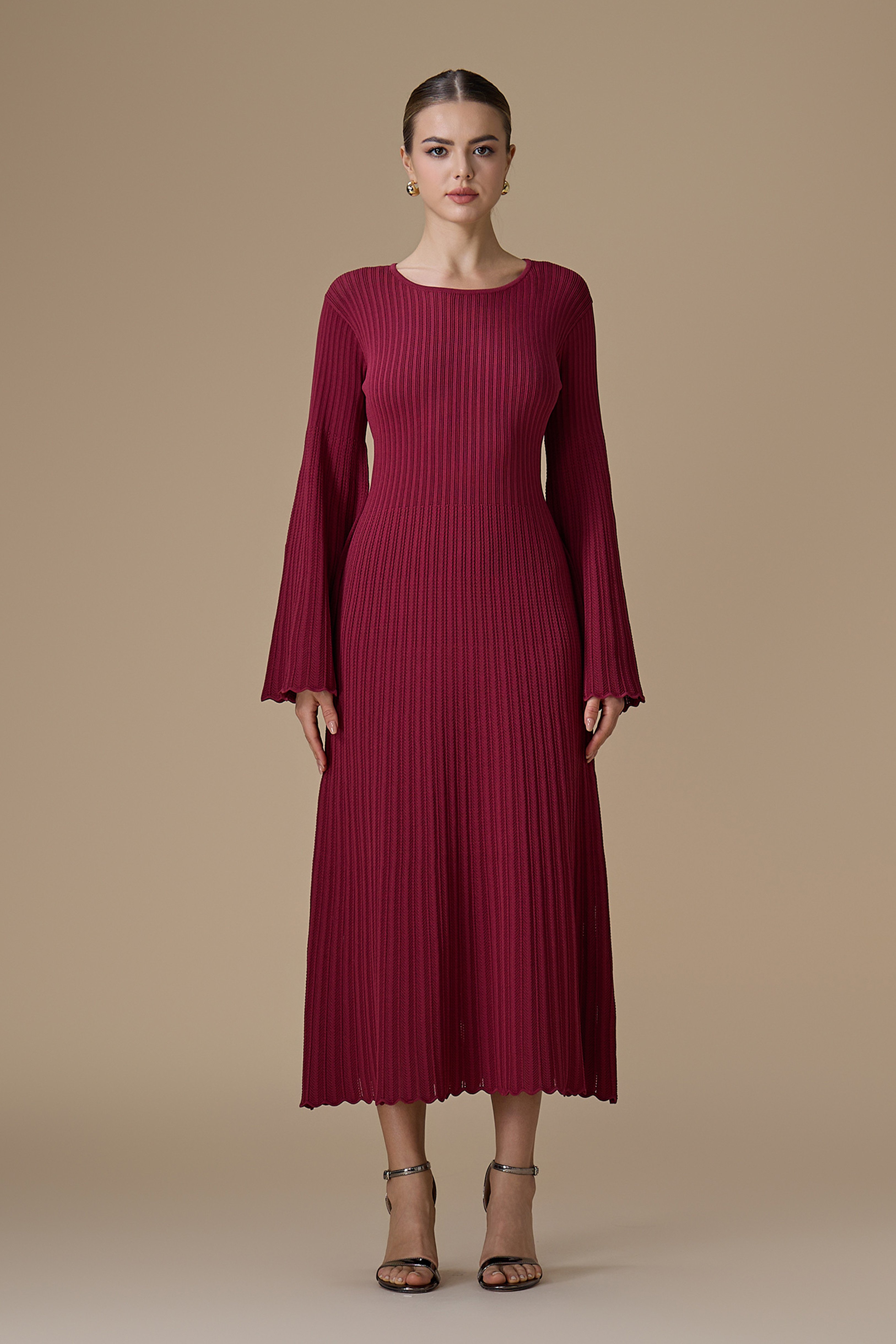 فستان ميدي برغندي من تريكو انسيابي بقصة مخصّرة، بياقة دائرية وأكمام طويلة واسعة مع تمدد مريح