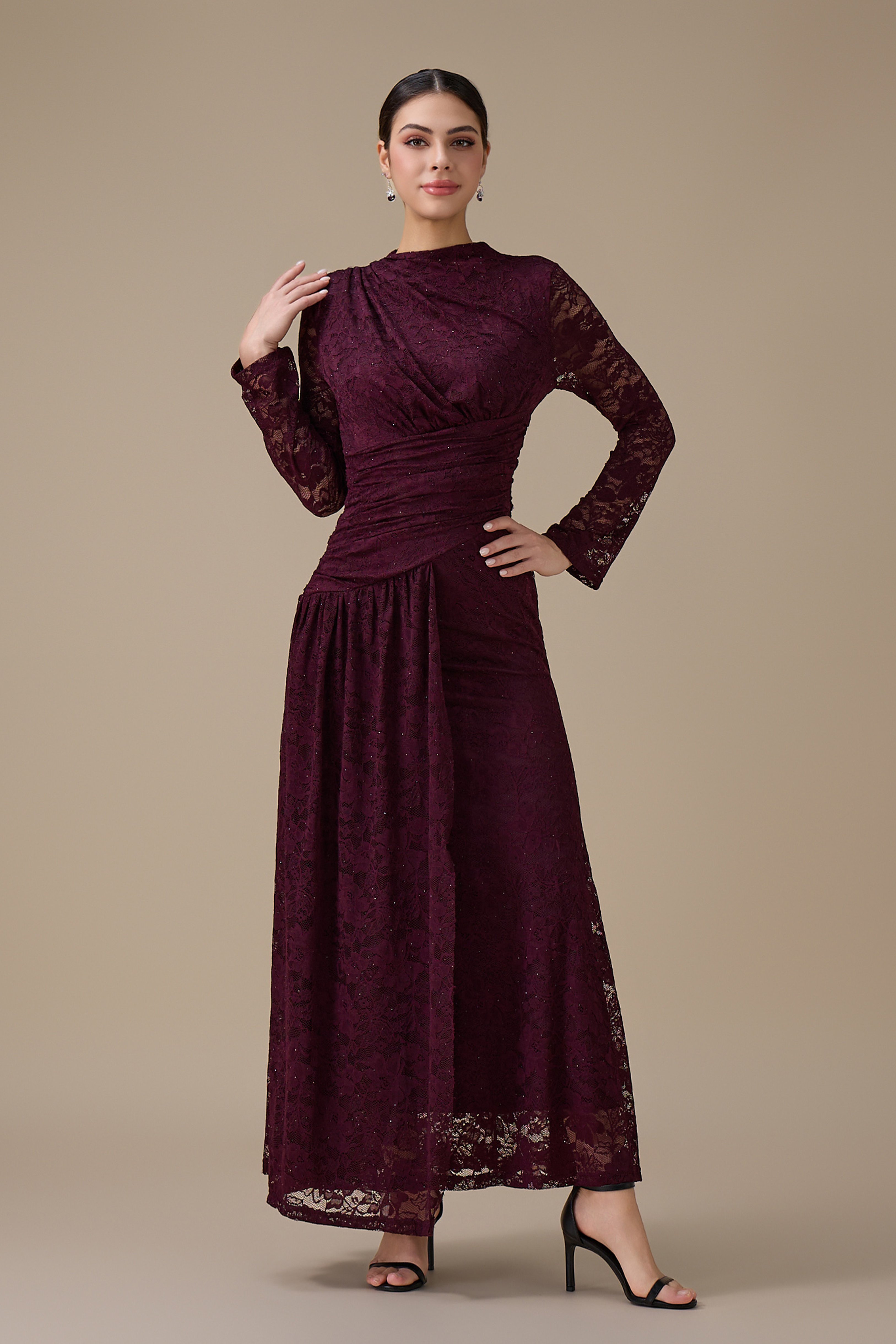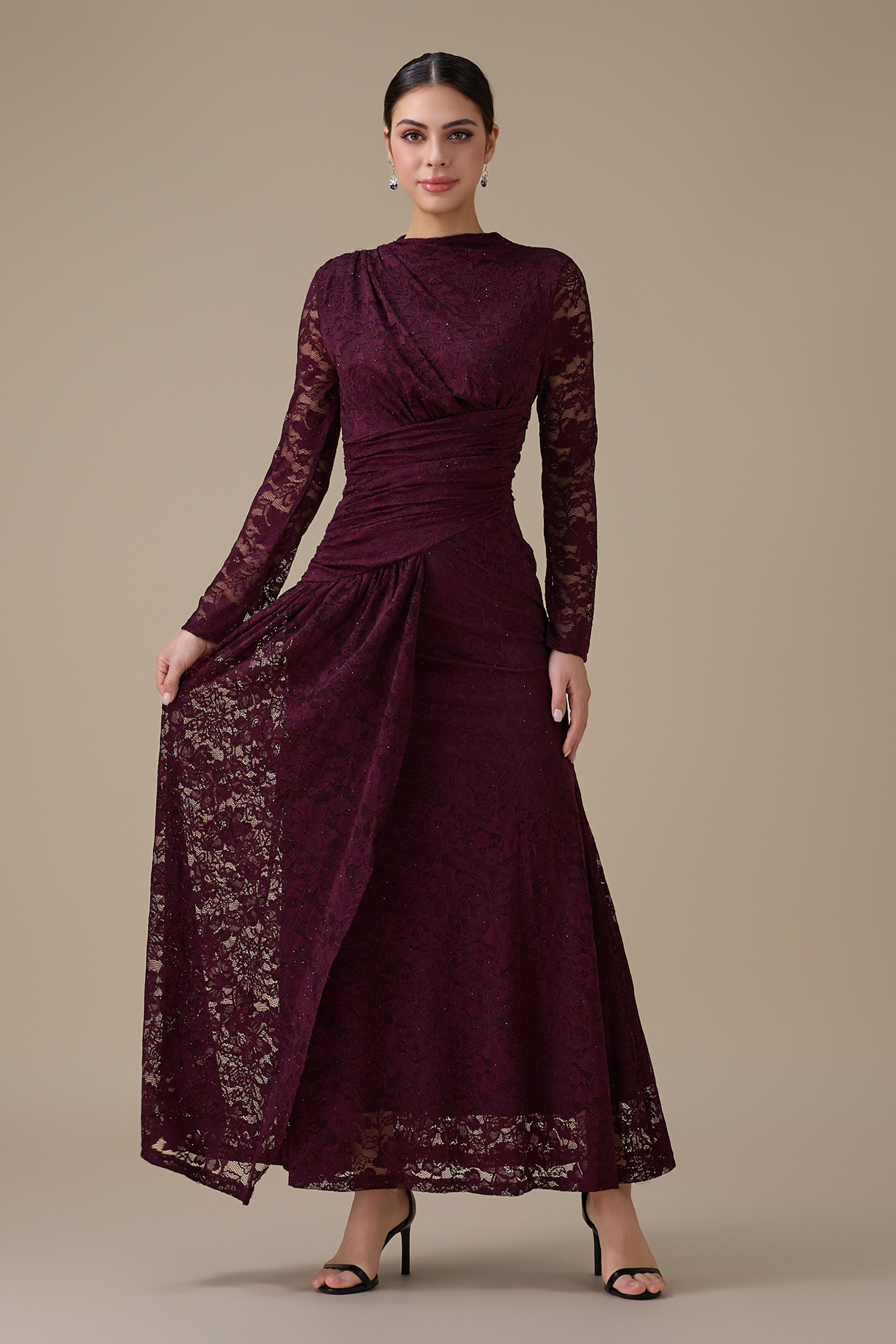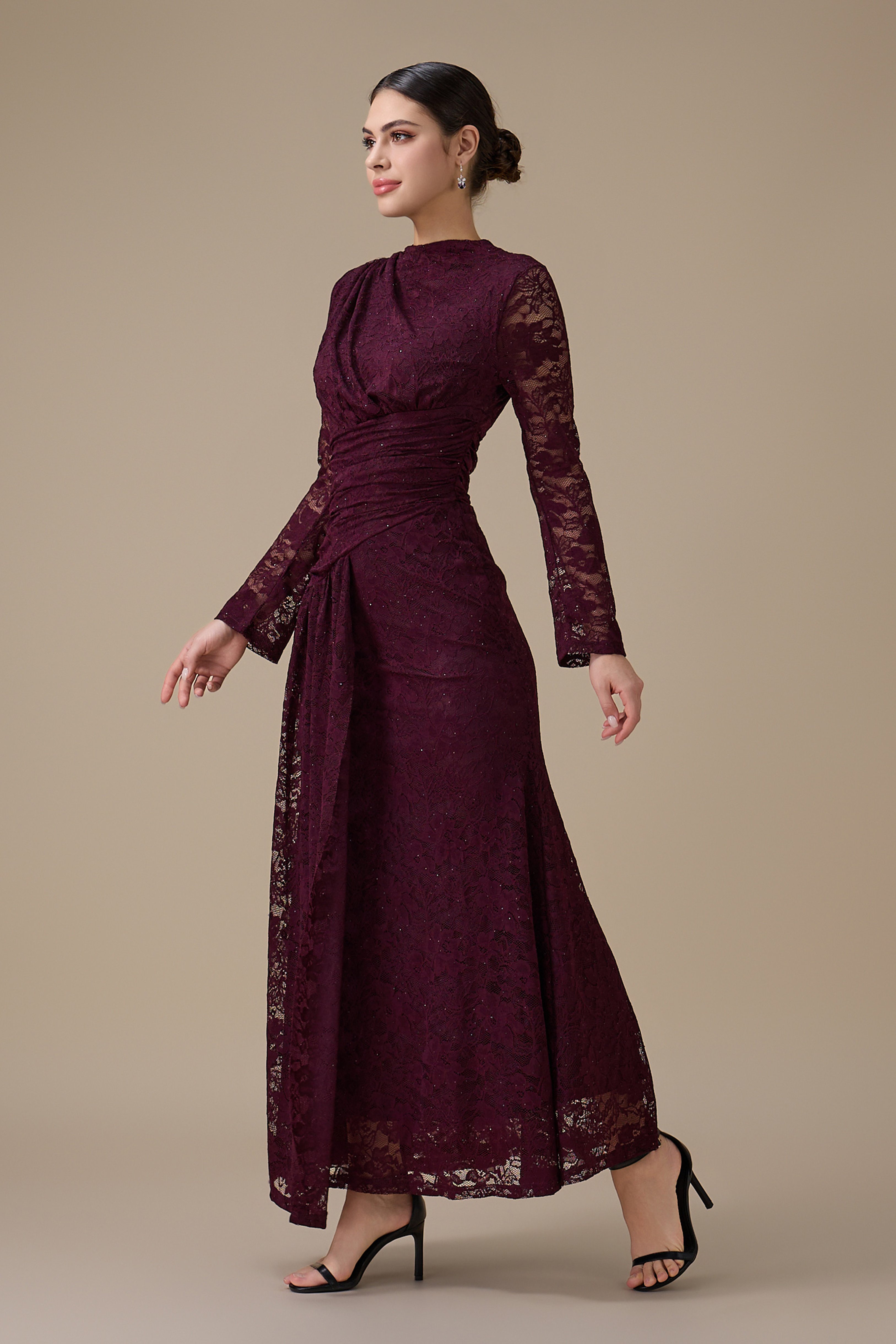 - نوع القصة: فستان طويل دانتيل برغندي محدد بثنيات جانبية ناعمة بأكمام طويلة بياقة عالية مغلقة