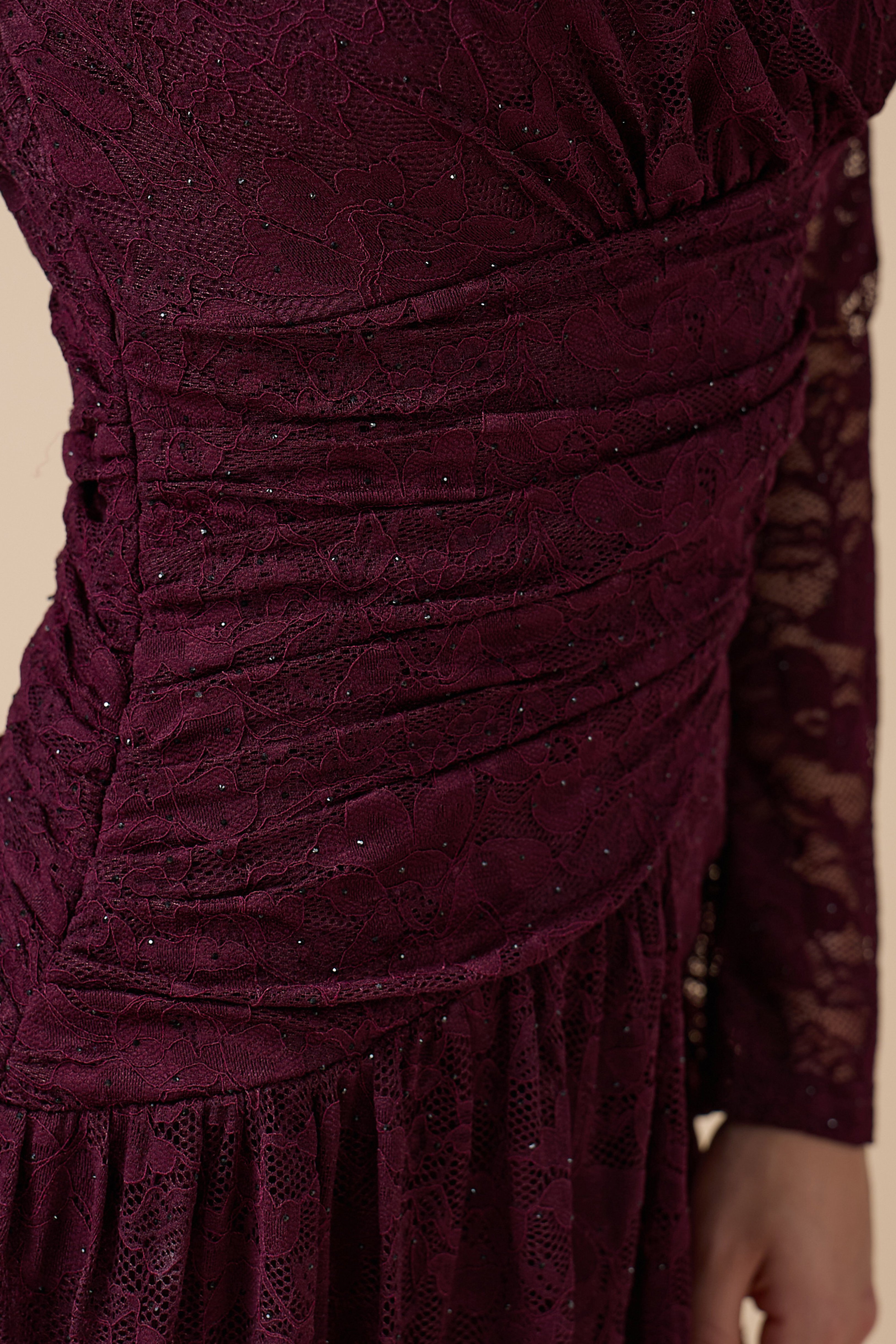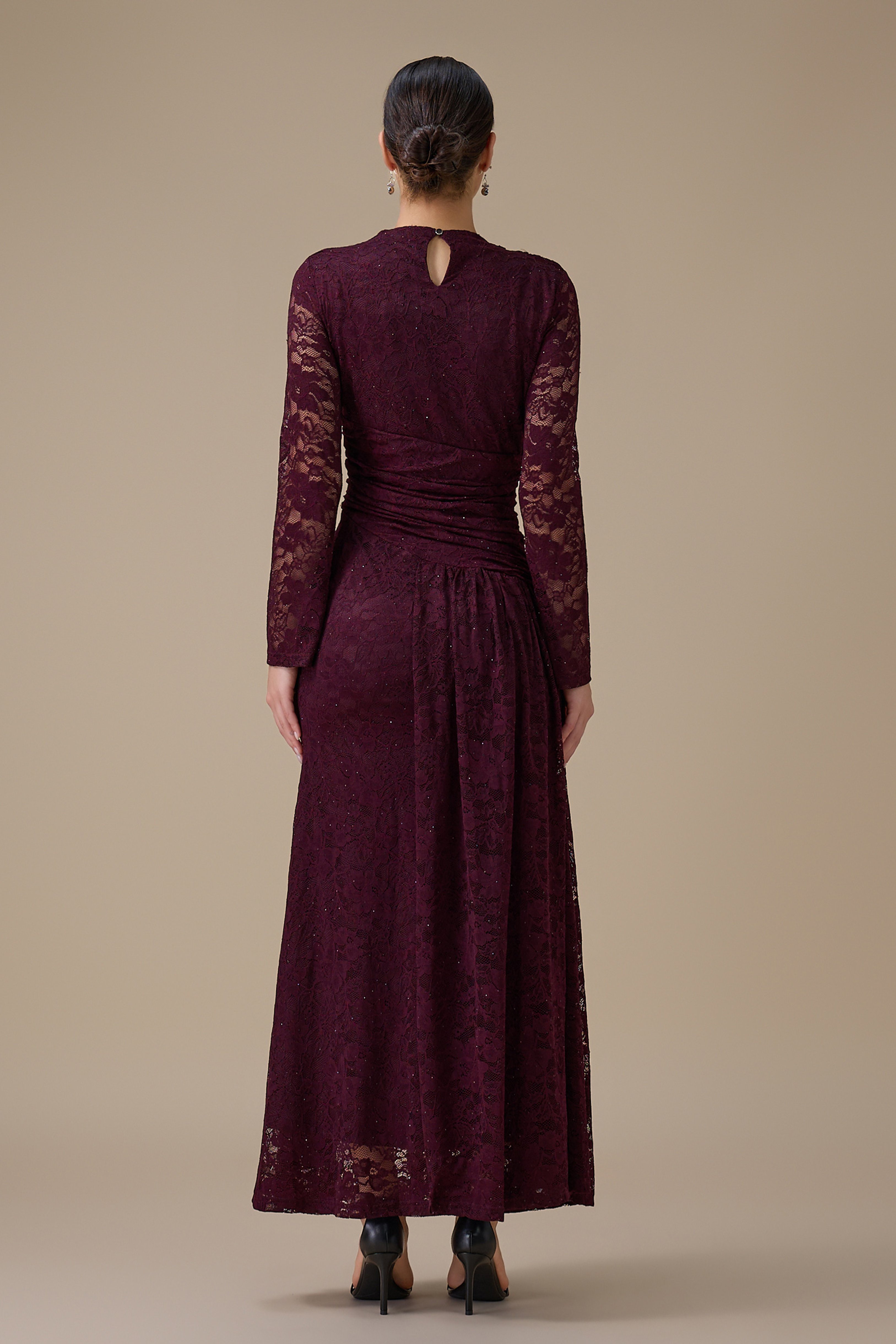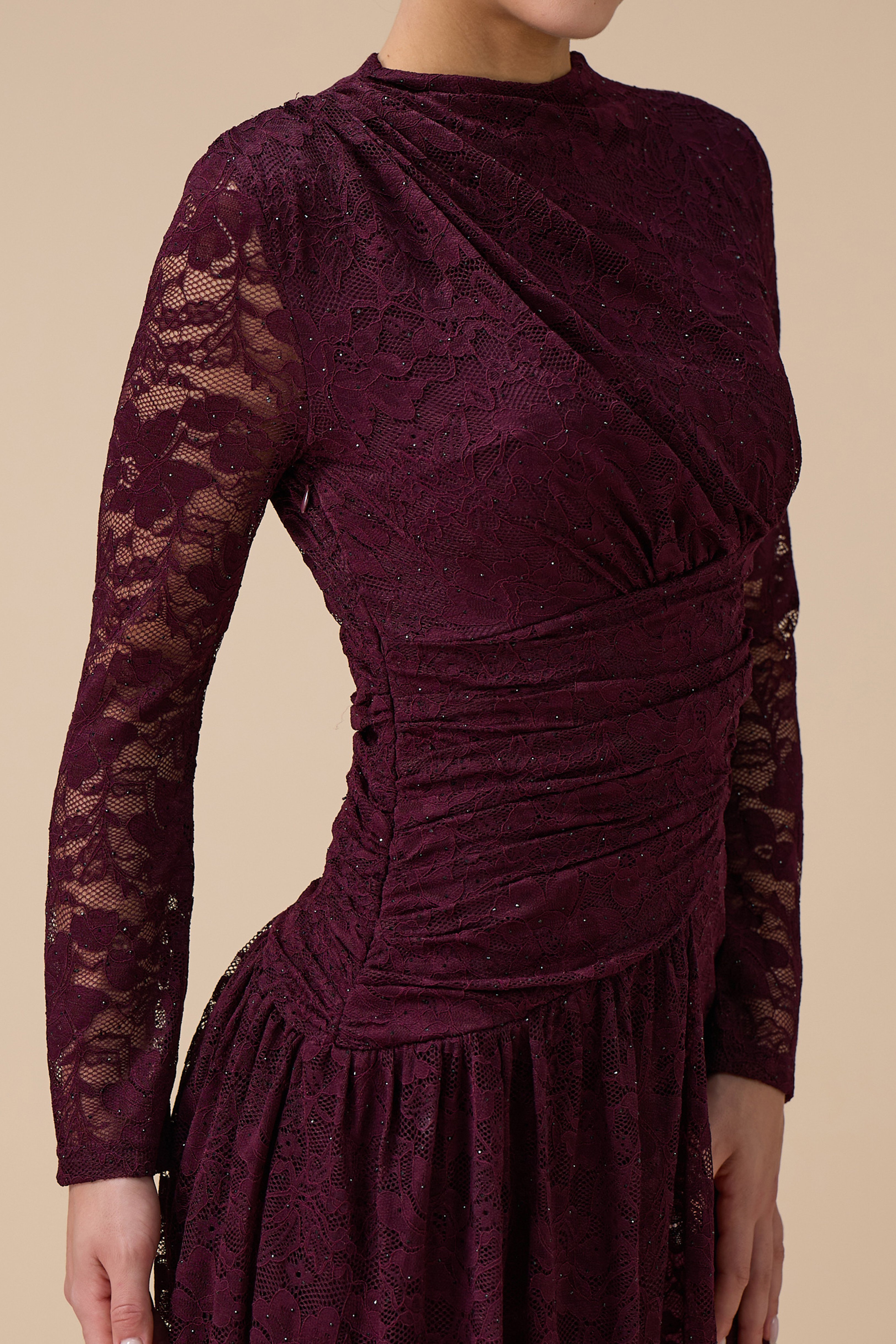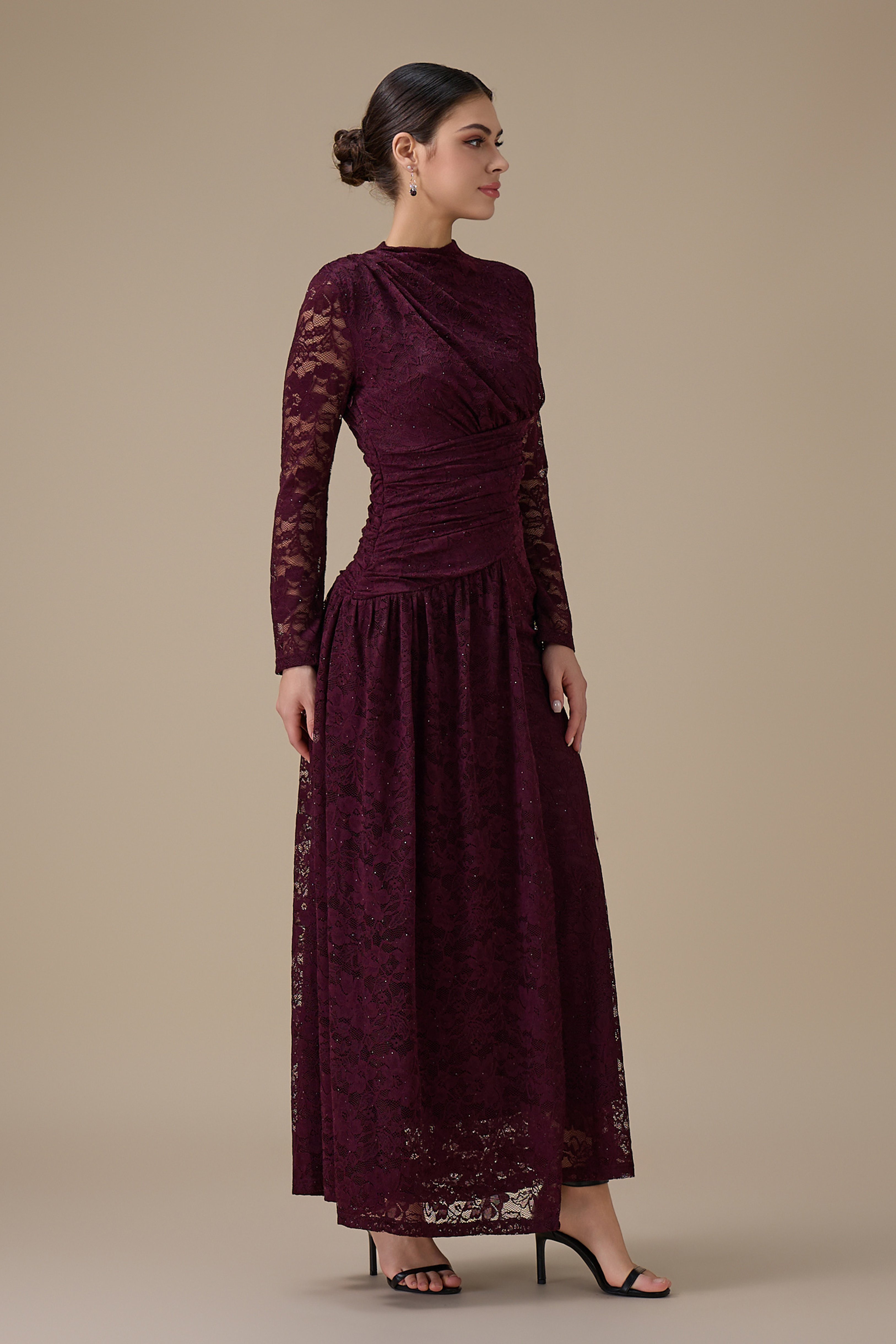 - نوع القصة: فستان طويل دانتيل برغندي محدد بثنيات جانبية ناعمة بأكمام طويلة بياقة عالية مغلقة