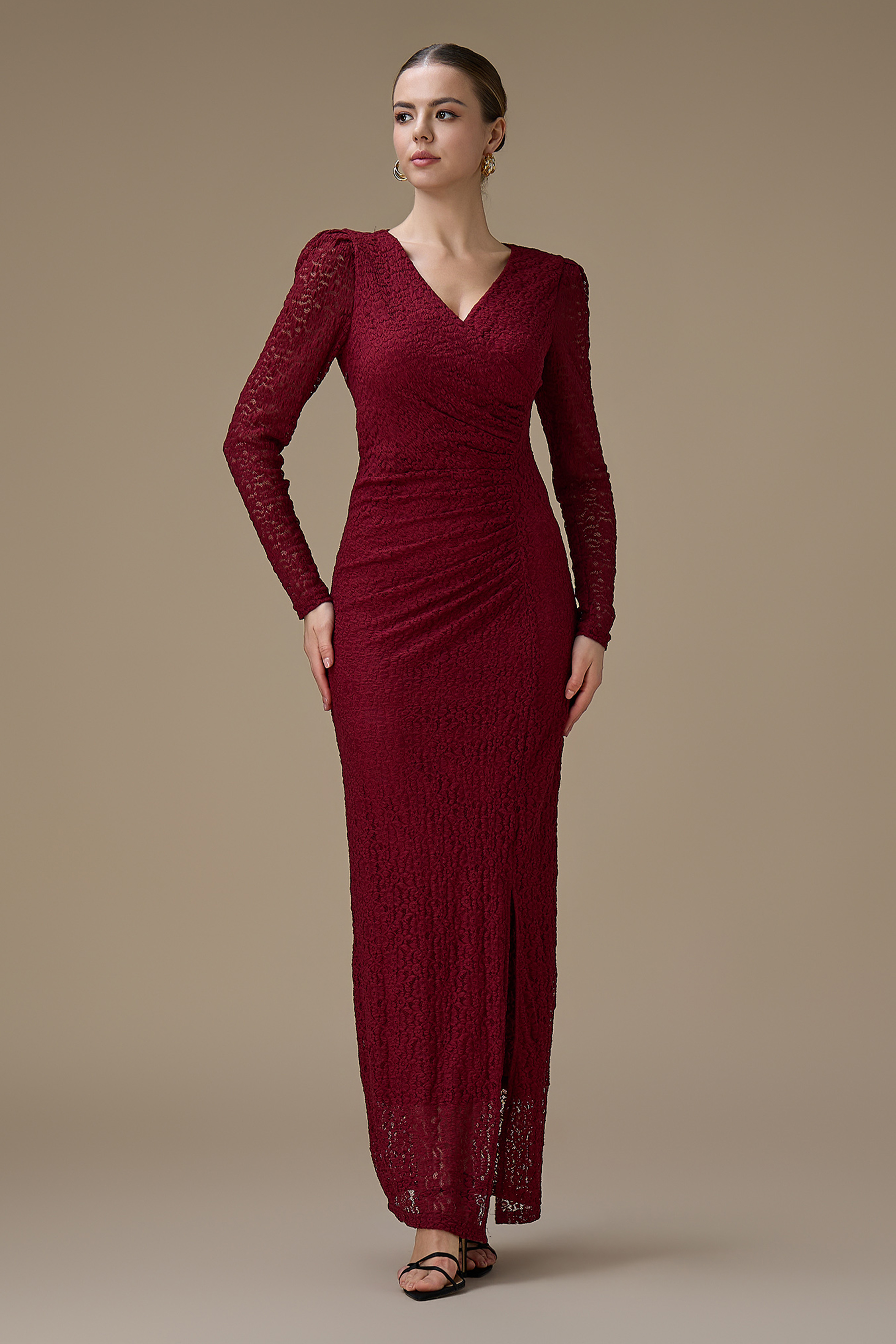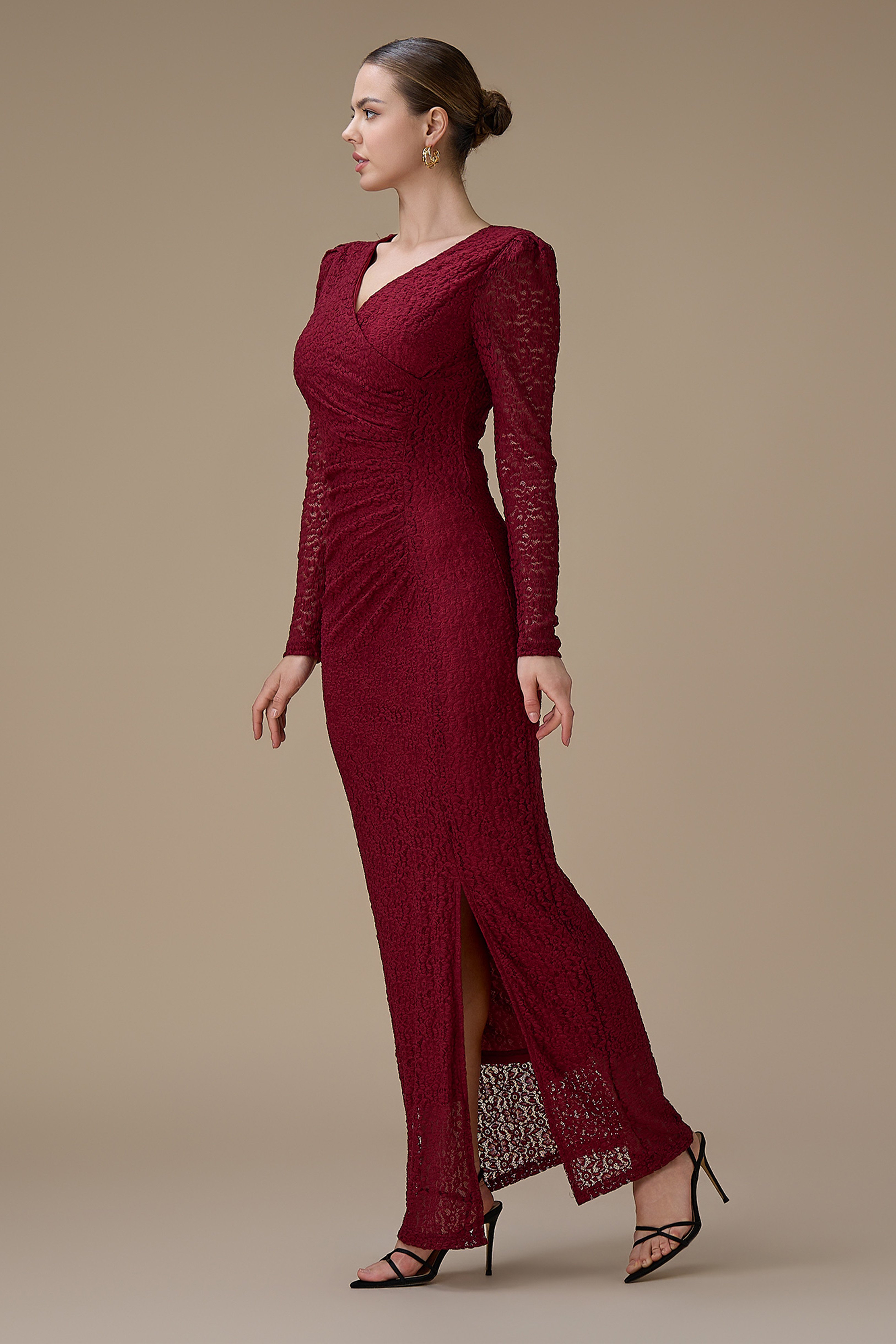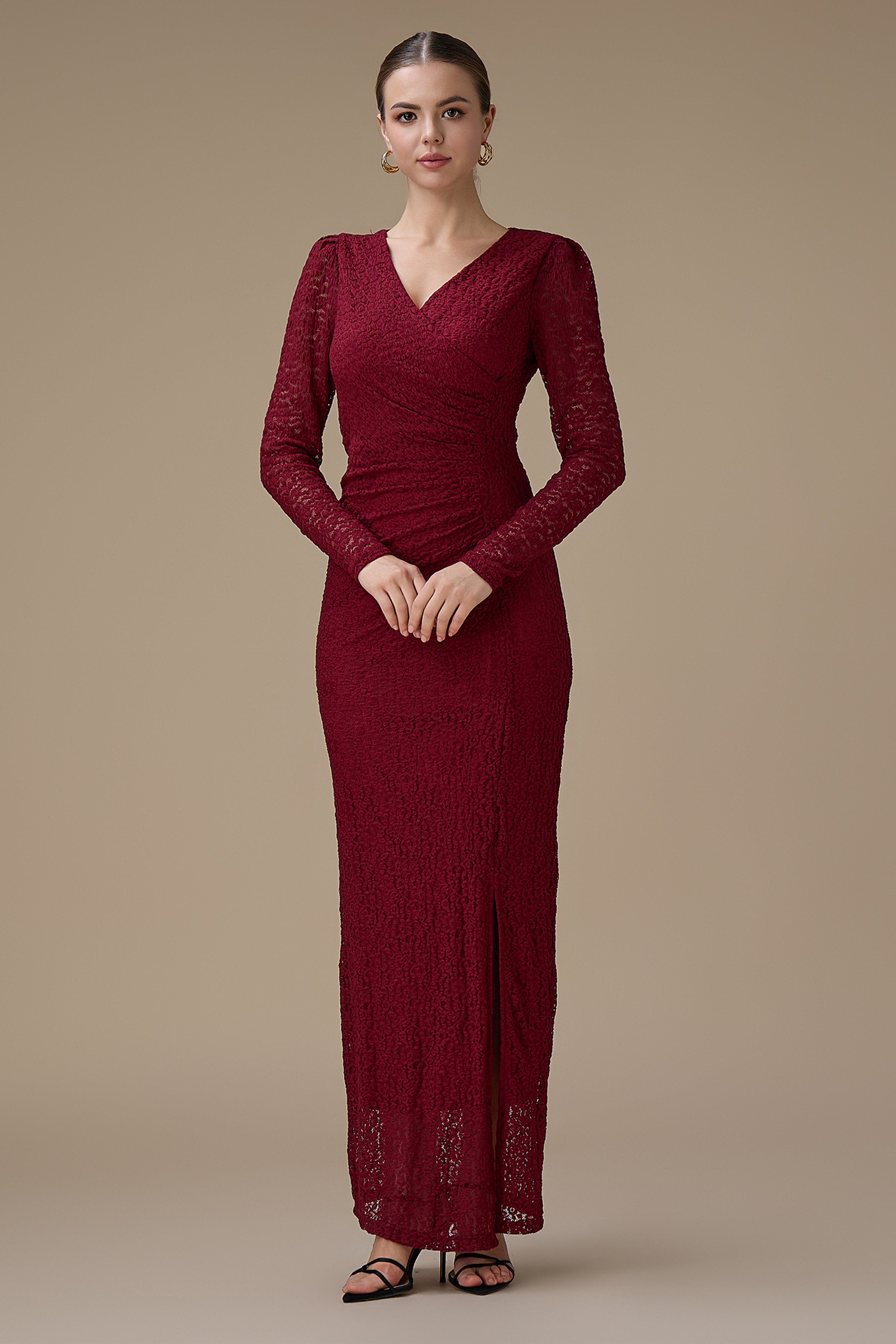 نوع القصة: فستان طويل برغندي دانتيل أنيق بأكمام طويلة بياقة V