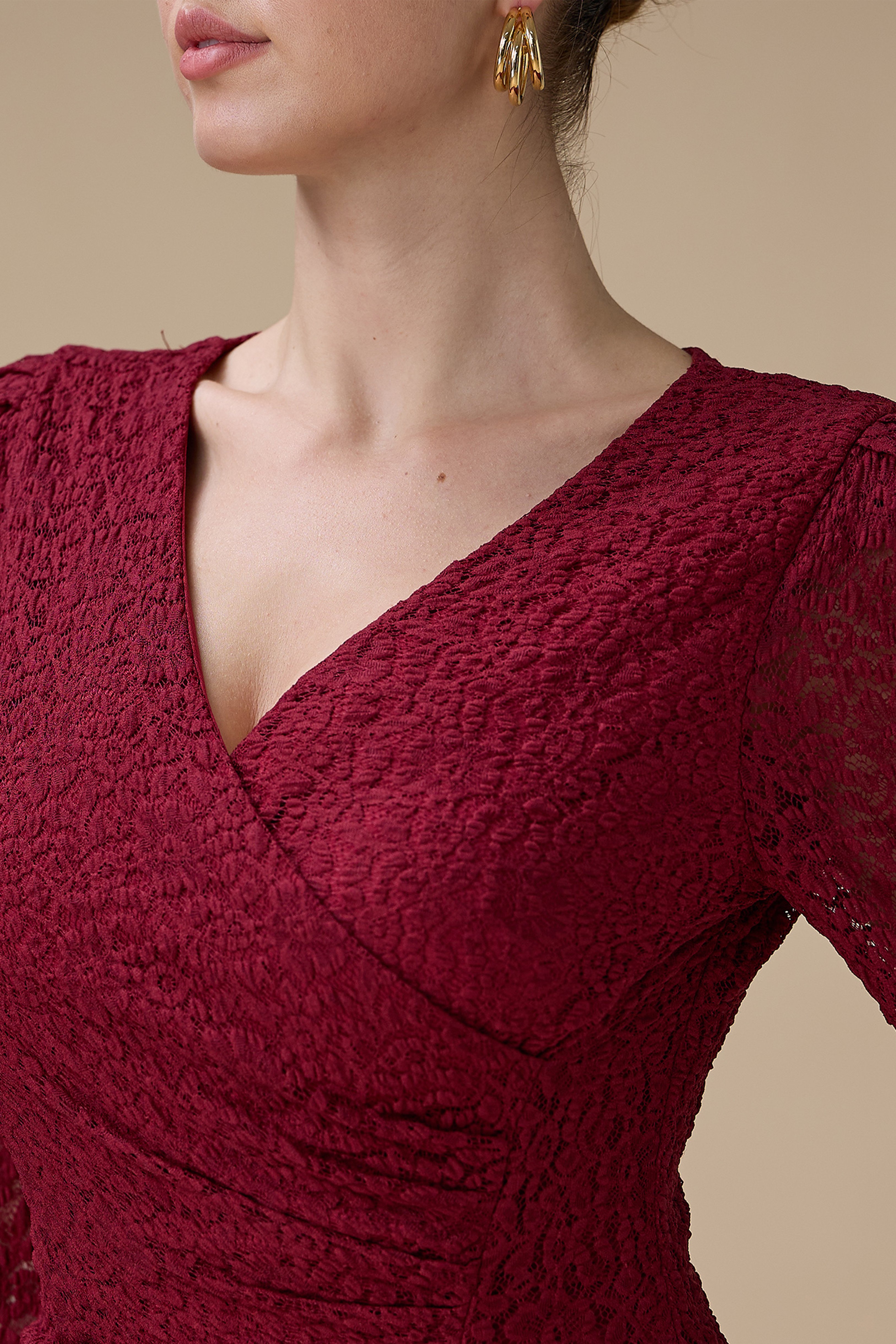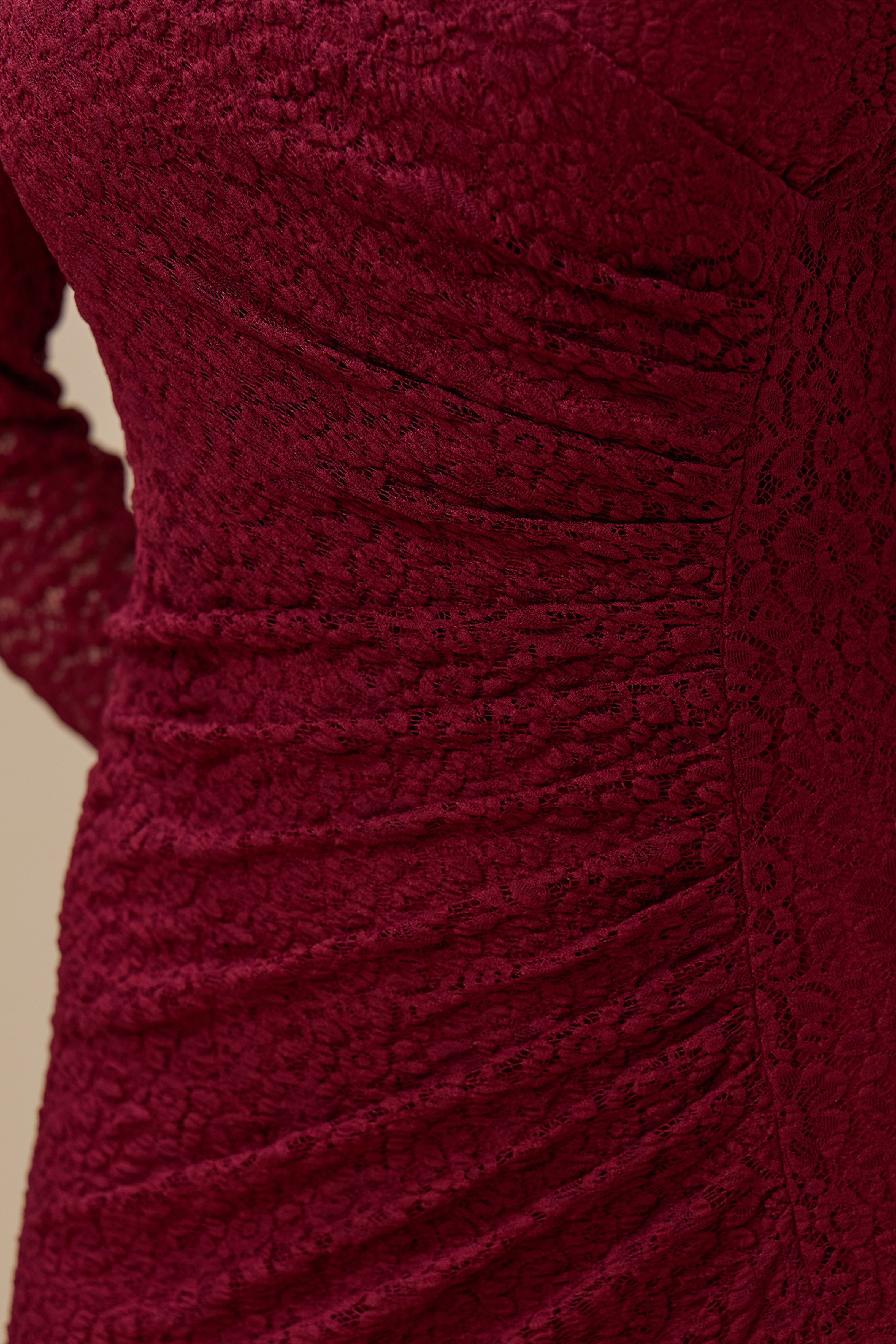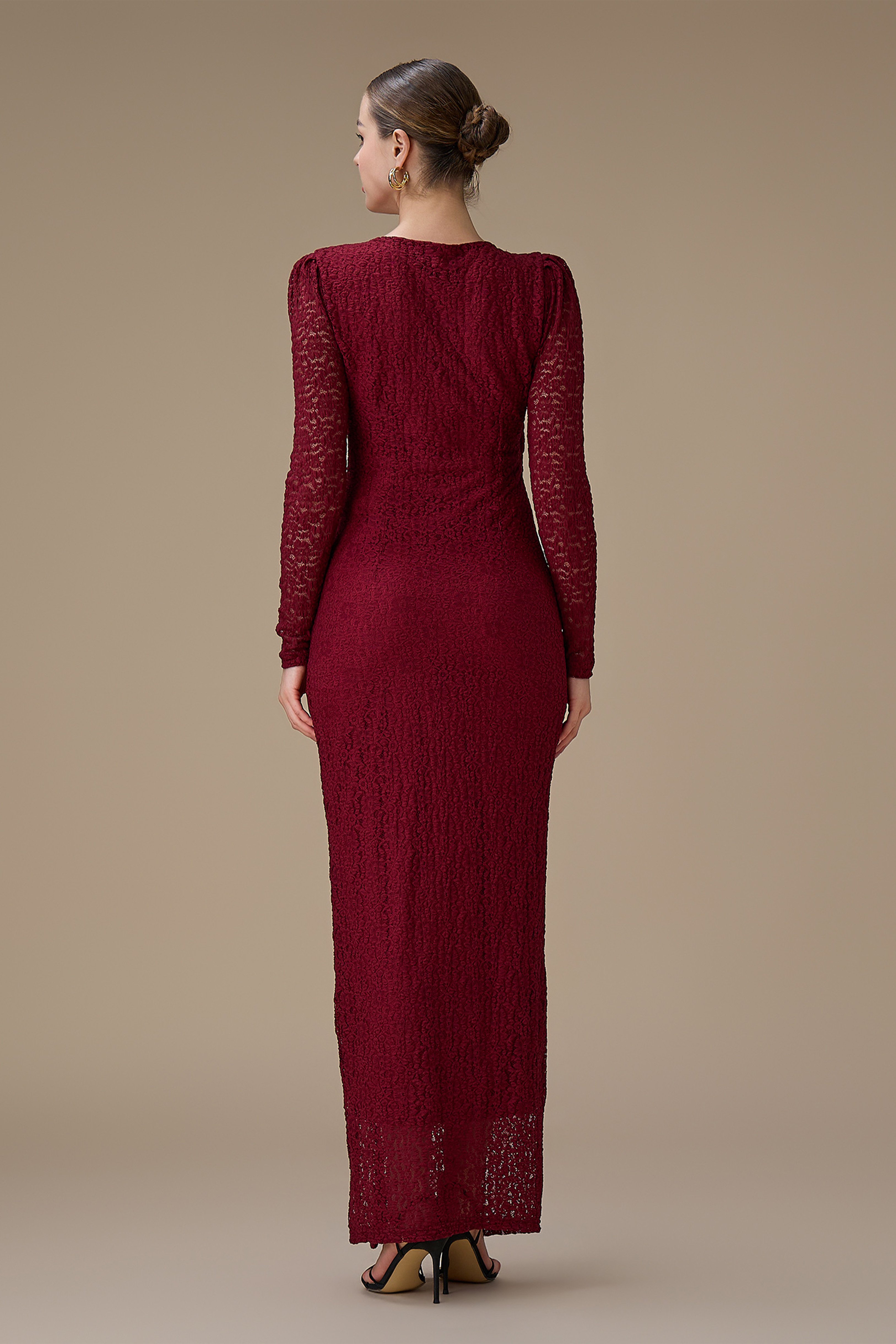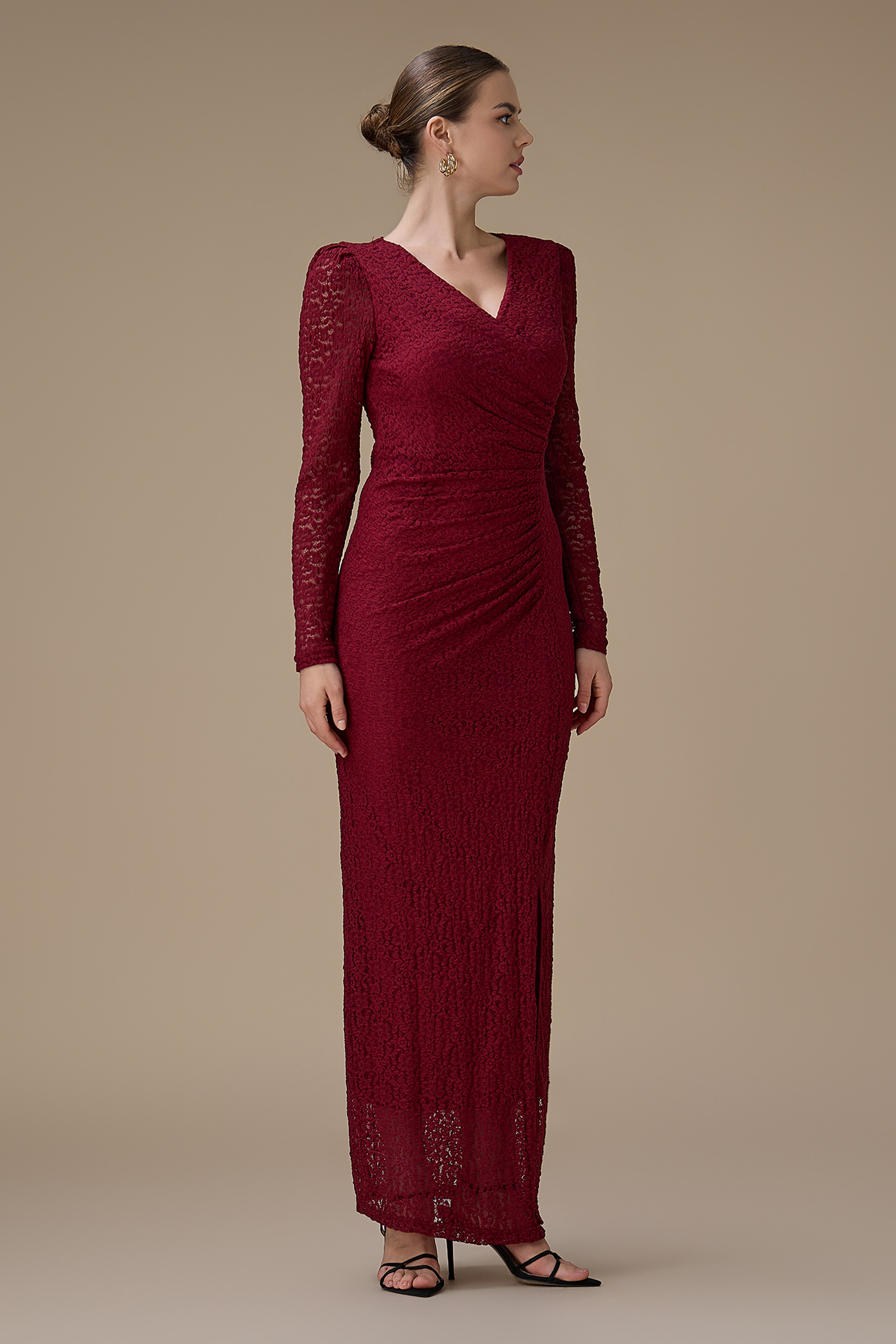 نوع القصة: فستان طويل برغندي دانتيل أنيق بأكمام طويلة بياقة V