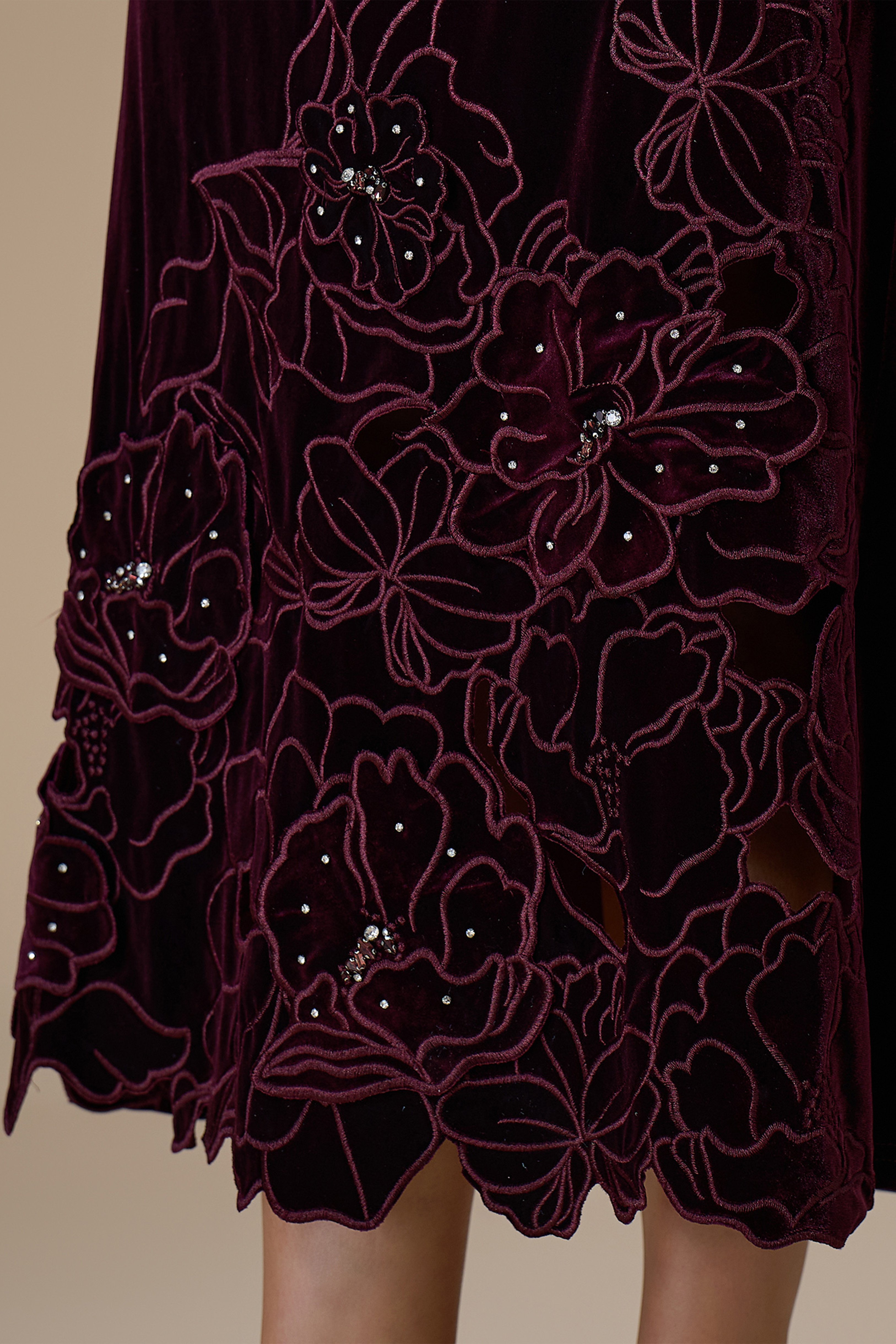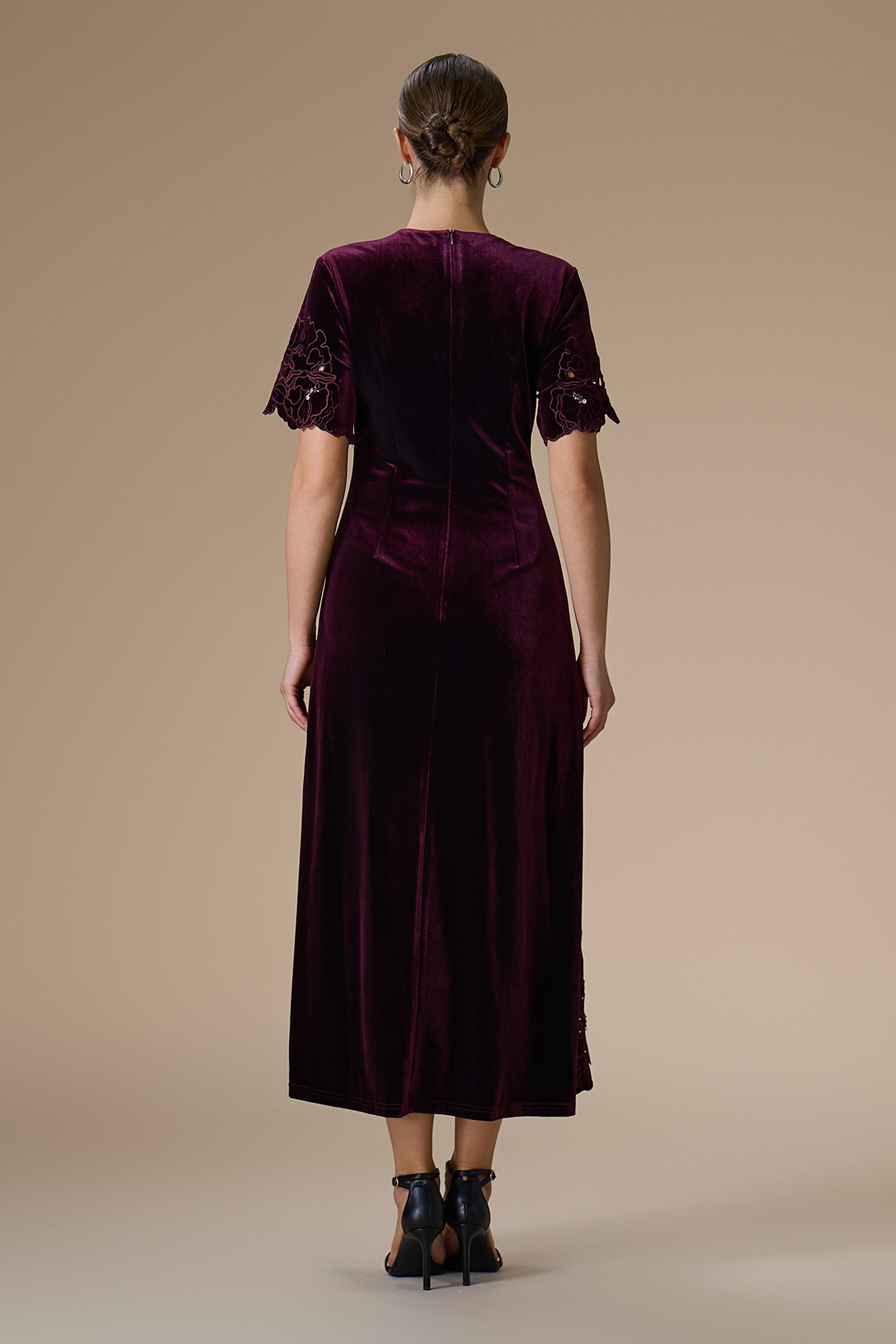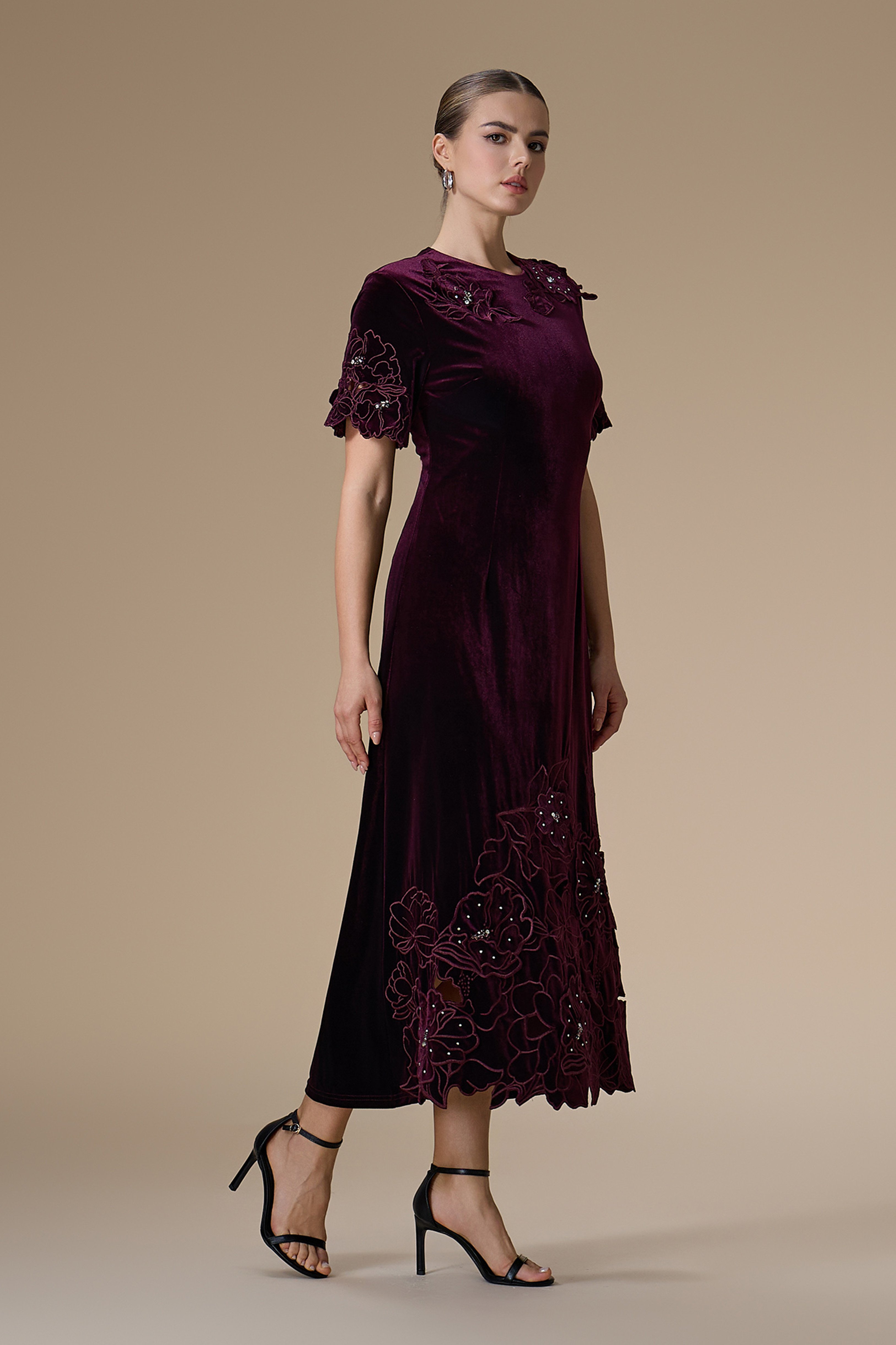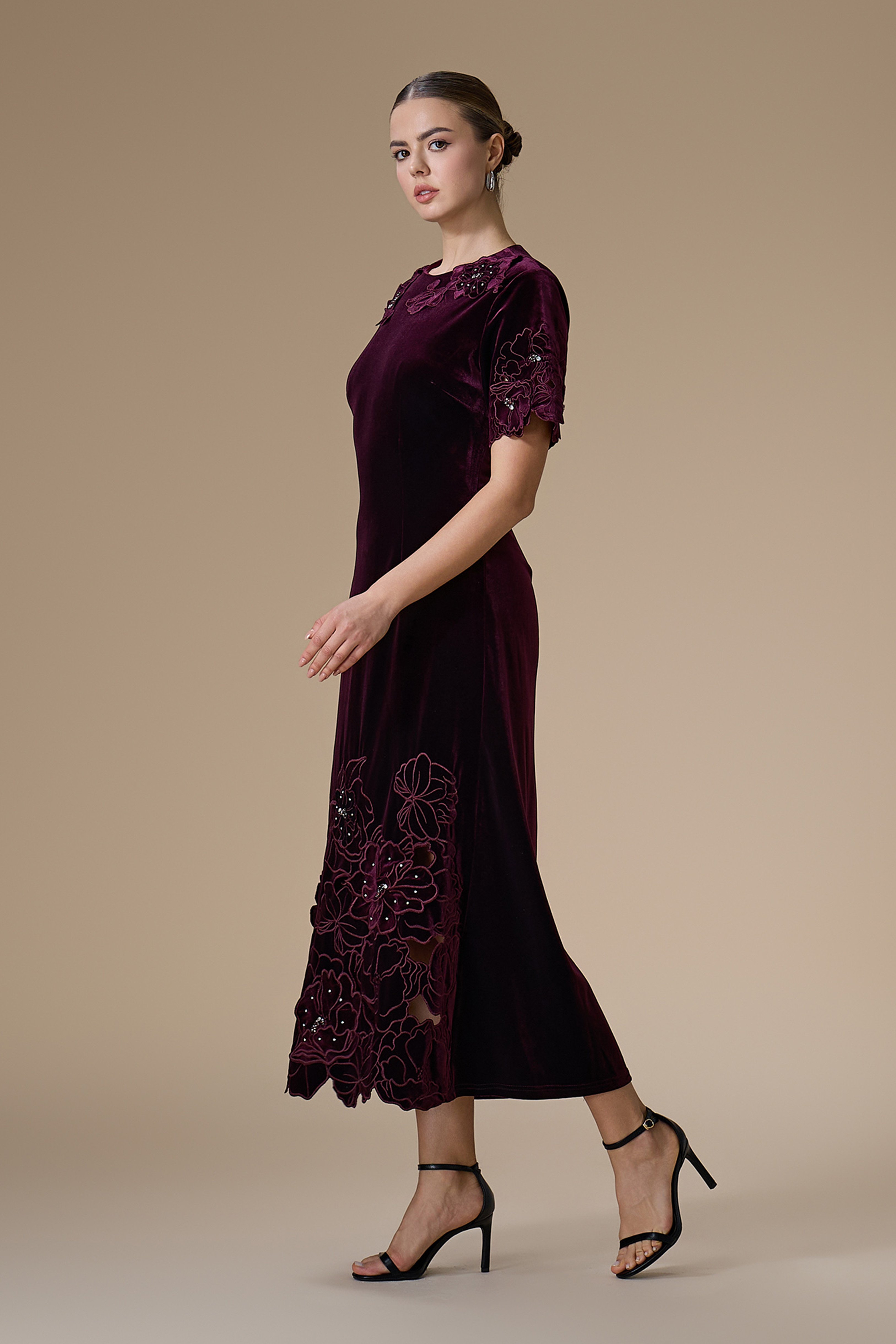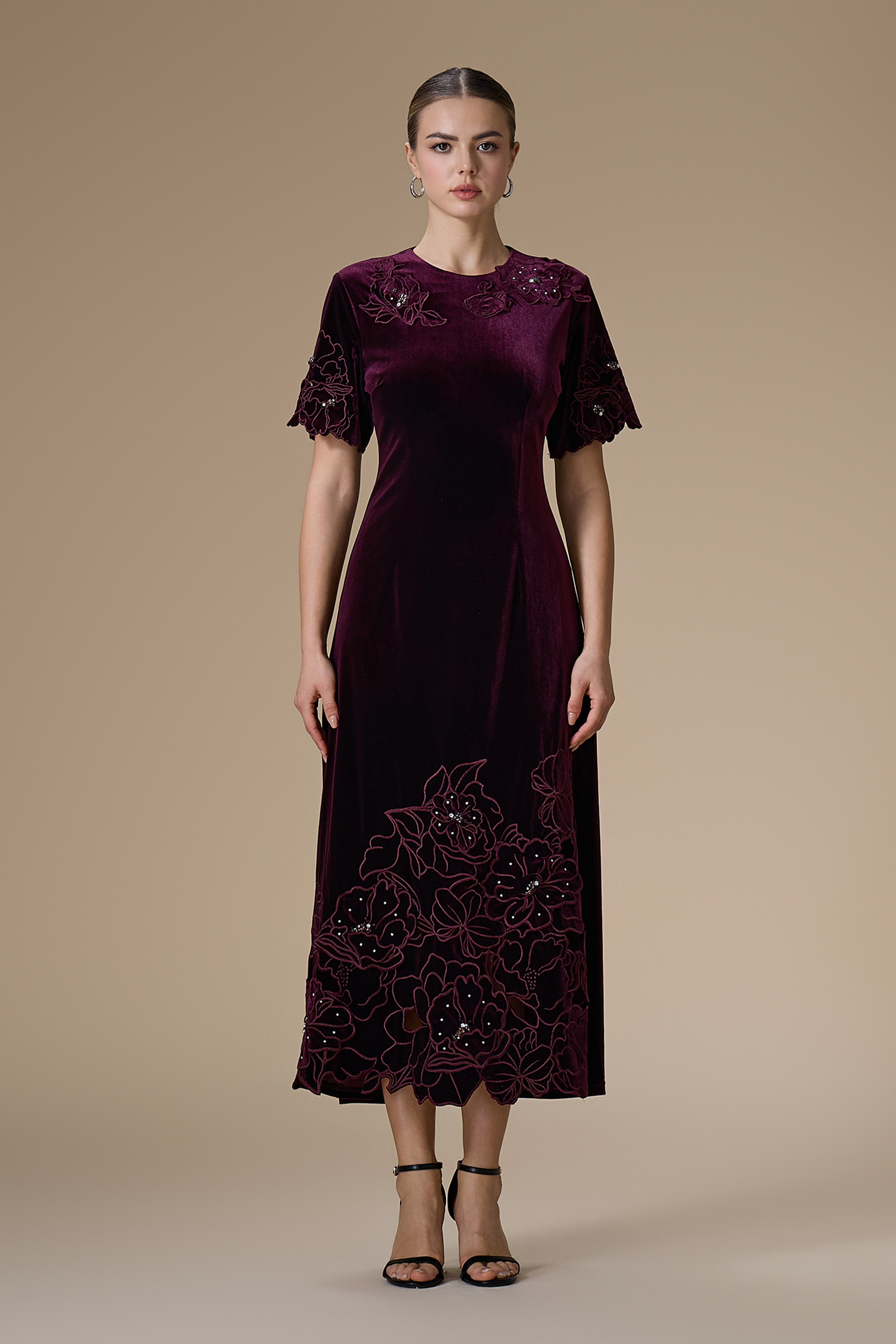 - نوع القصة: فستان ميدي مخمل عنابي مزين بتطريزات زهرية، ياقة دائرية مغلقة وأكمام قصيرة مع قصة مخصرة غير قابلة للتمدد