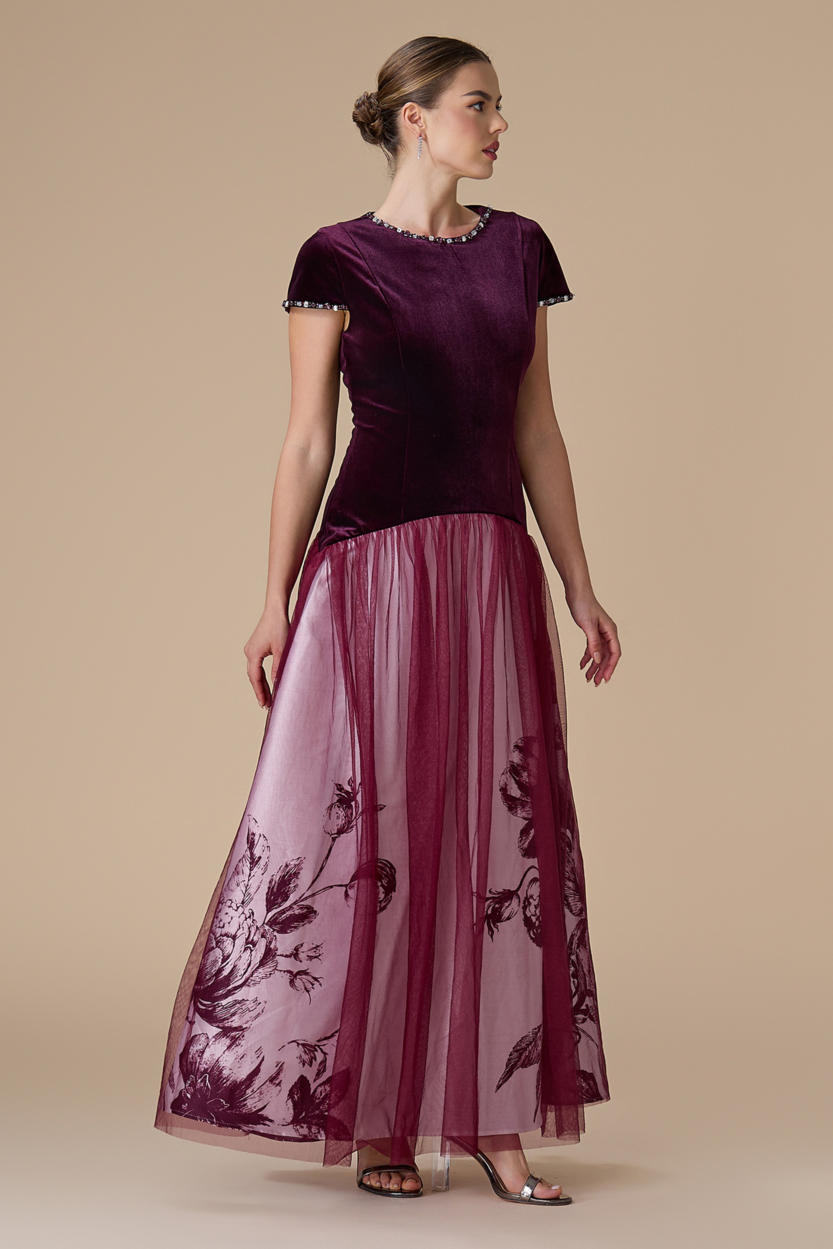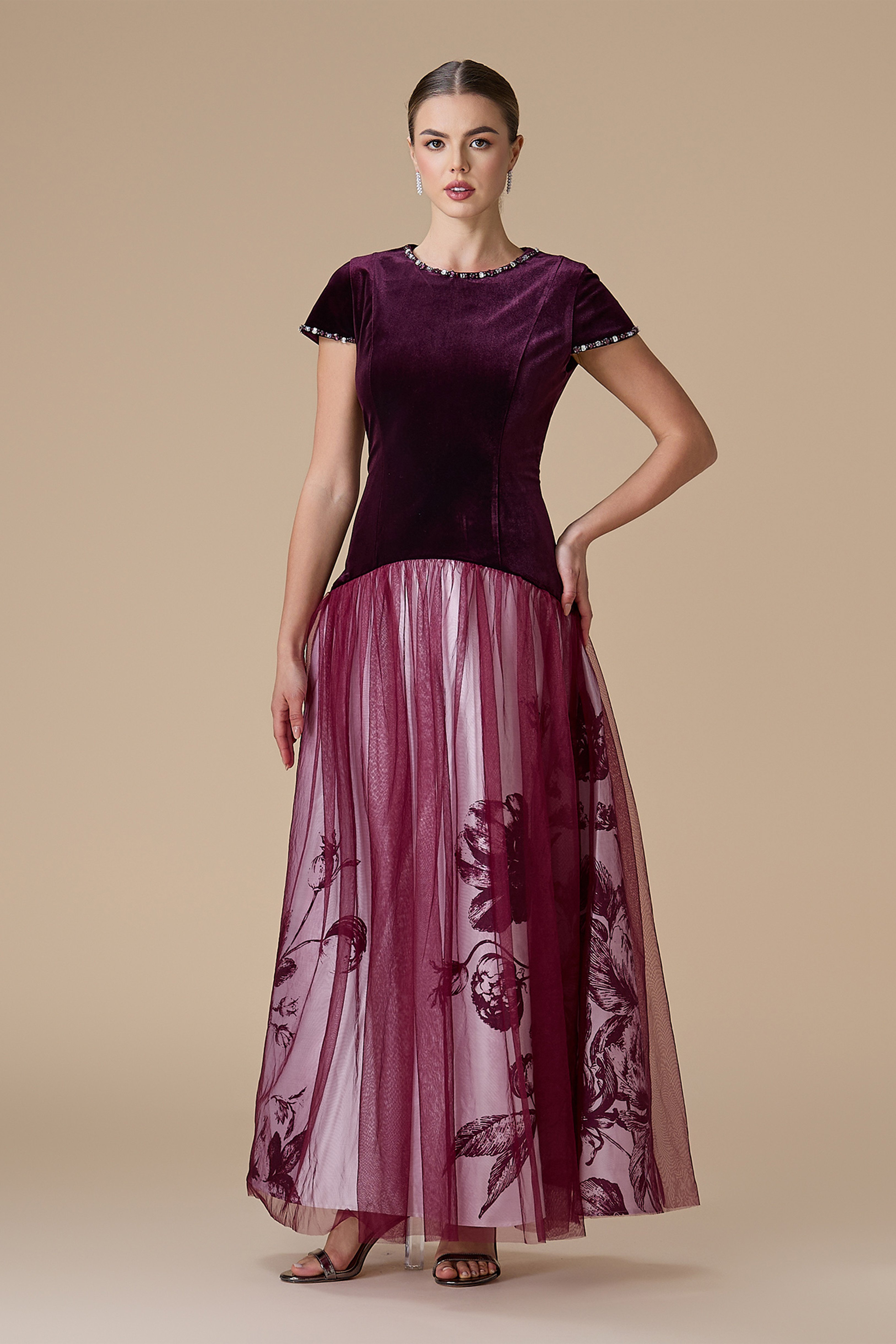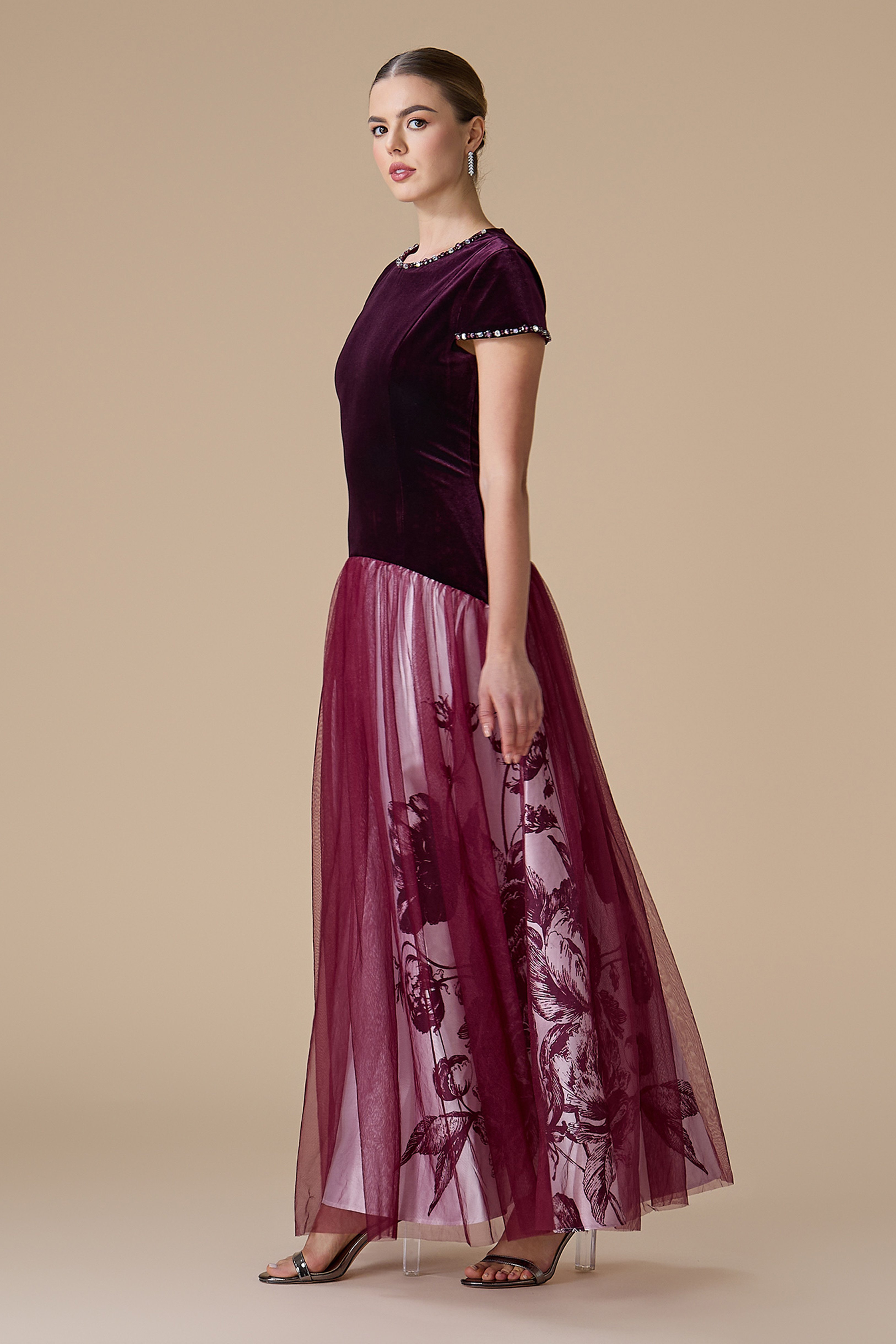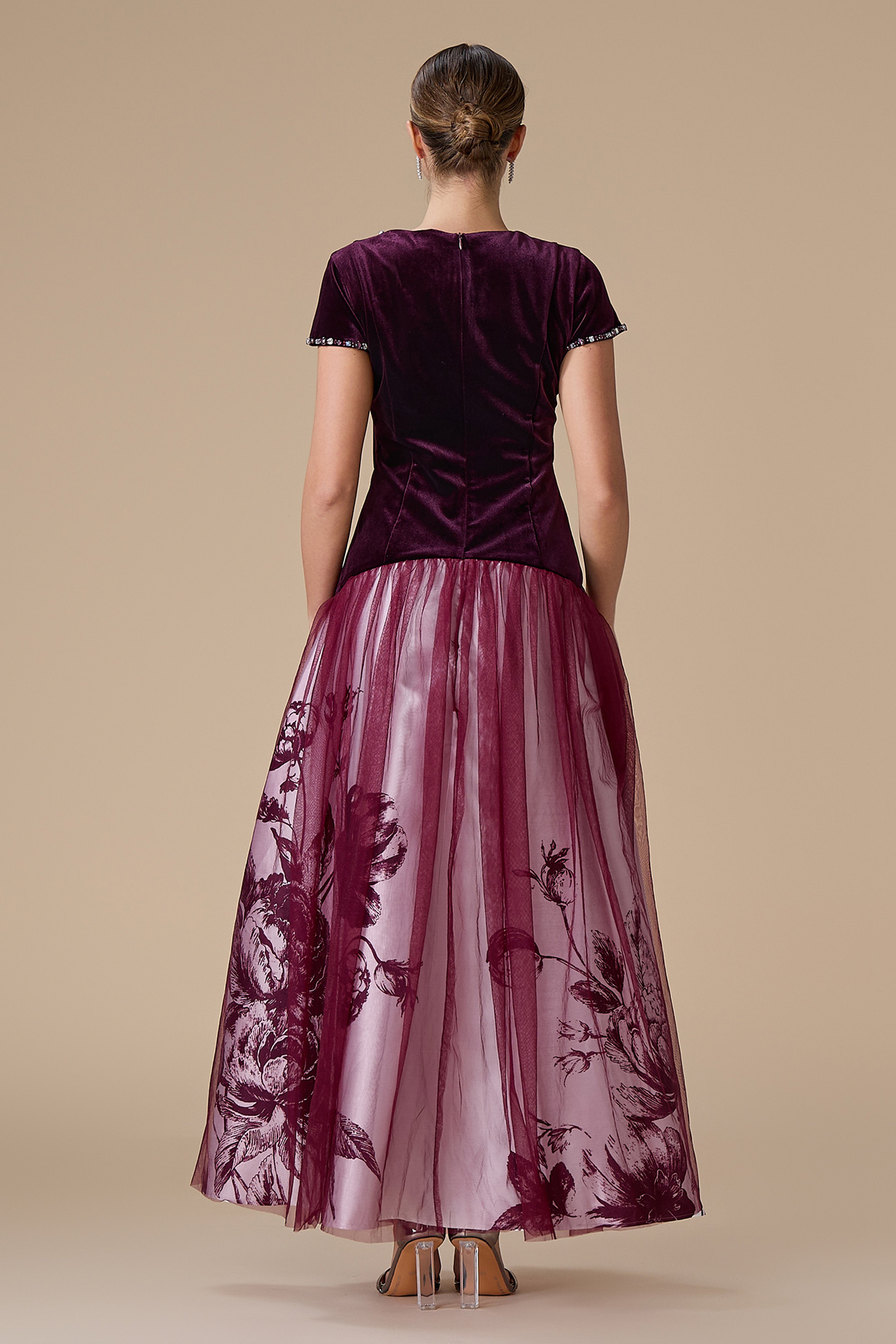 فستان طويل برغندي بتفاصيل خرزية وتنورة بطبعة زهرية، ياقة دائرية وأكمام قصيرة، بخامة مخمل مع تول غير قابلة للتمدد