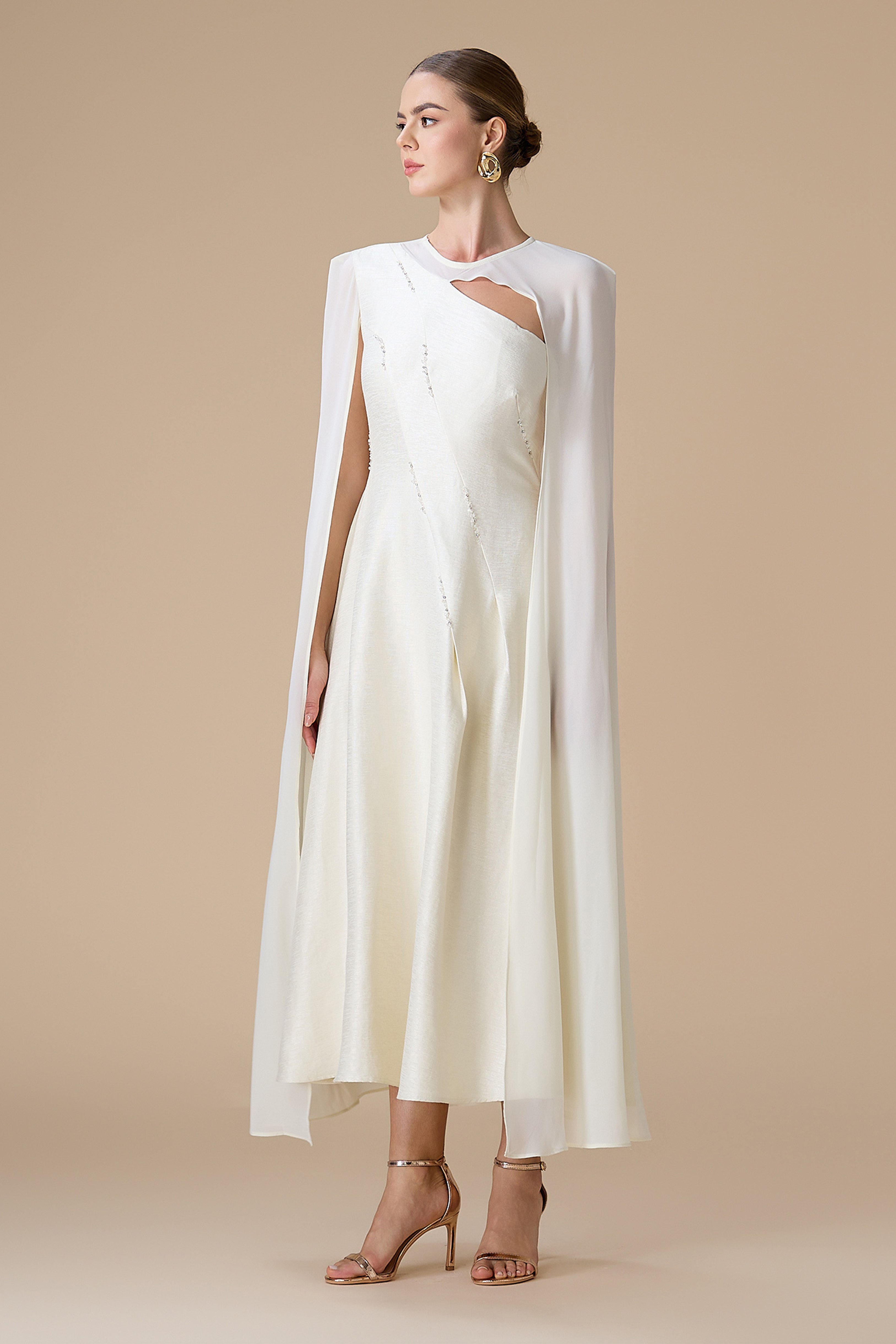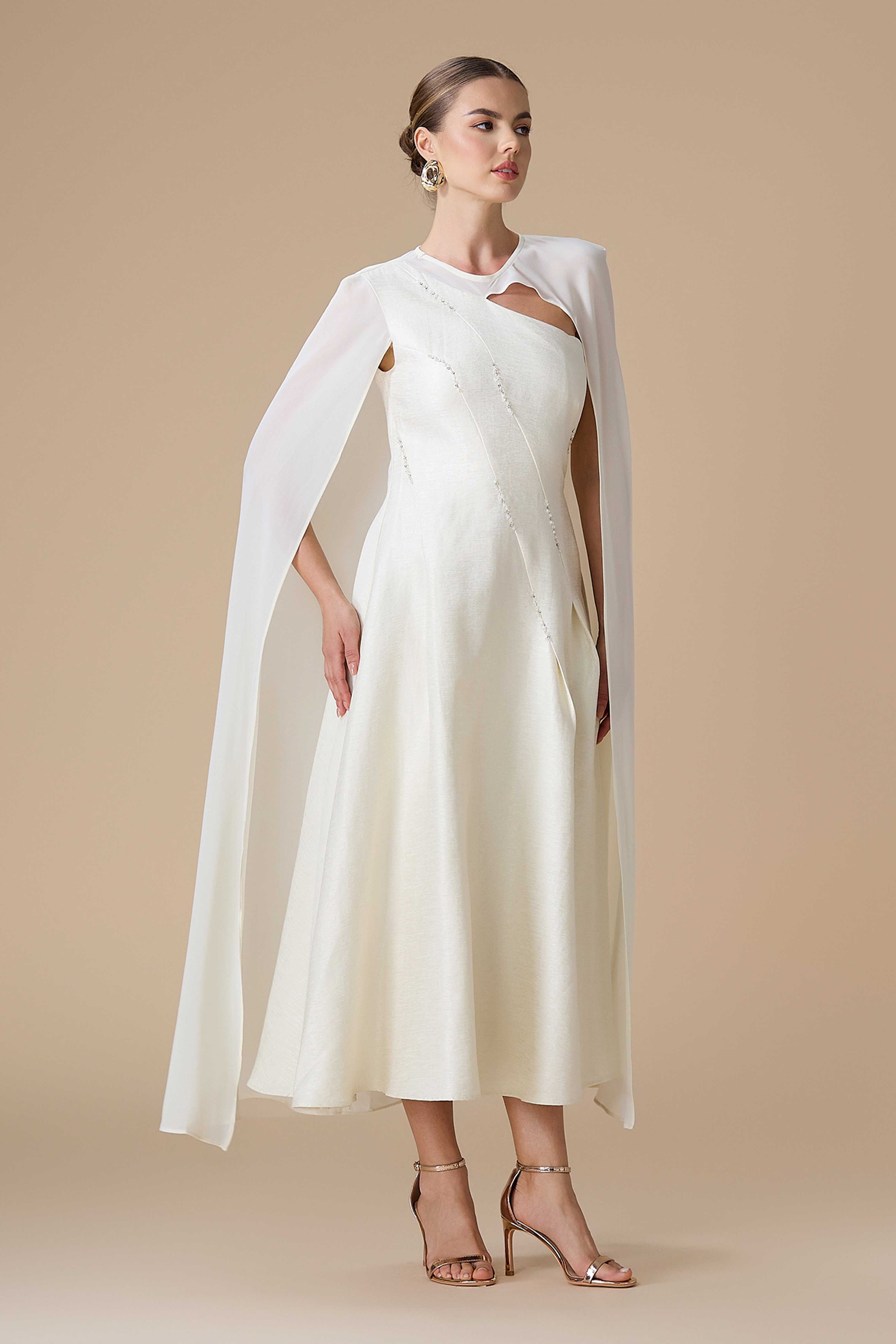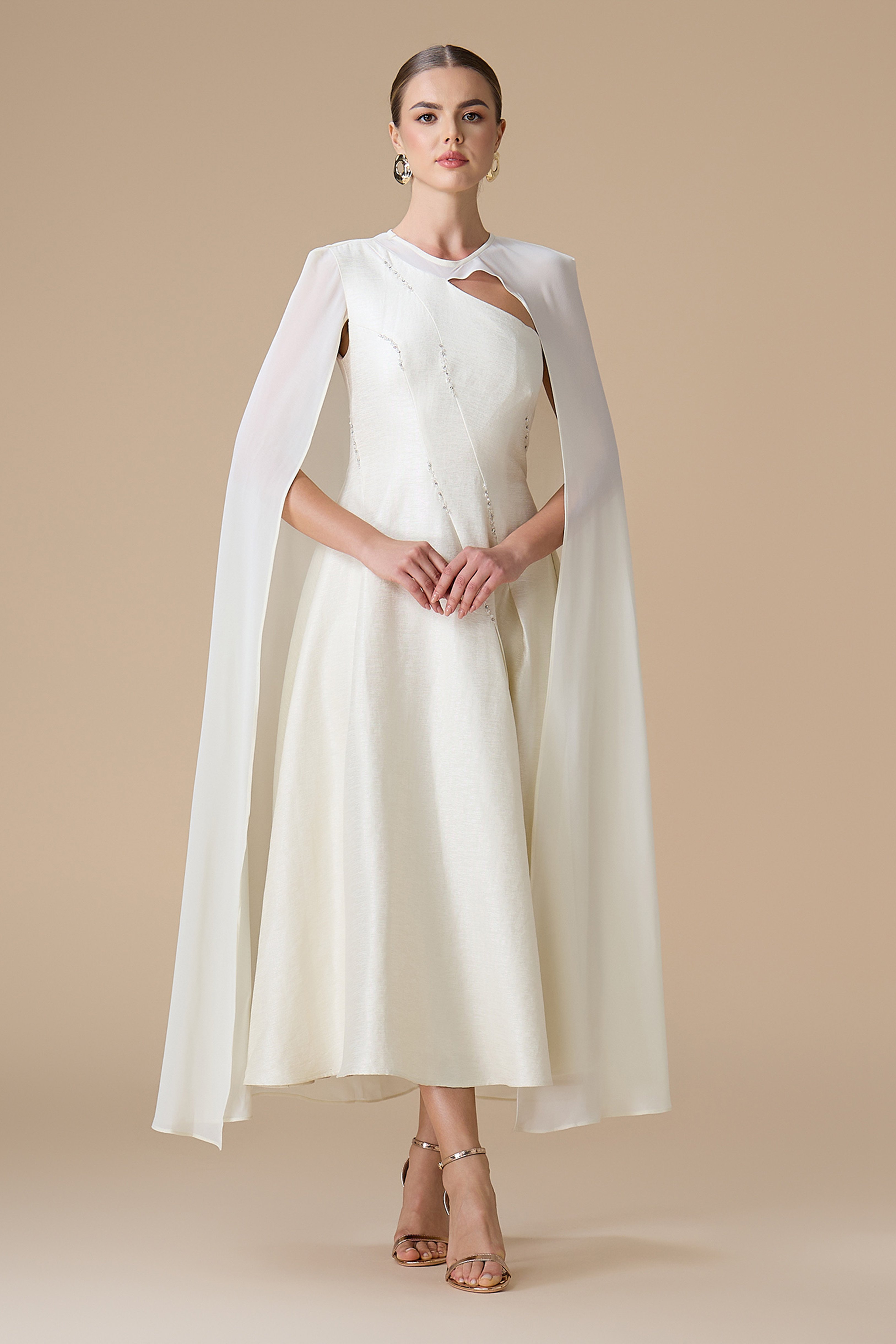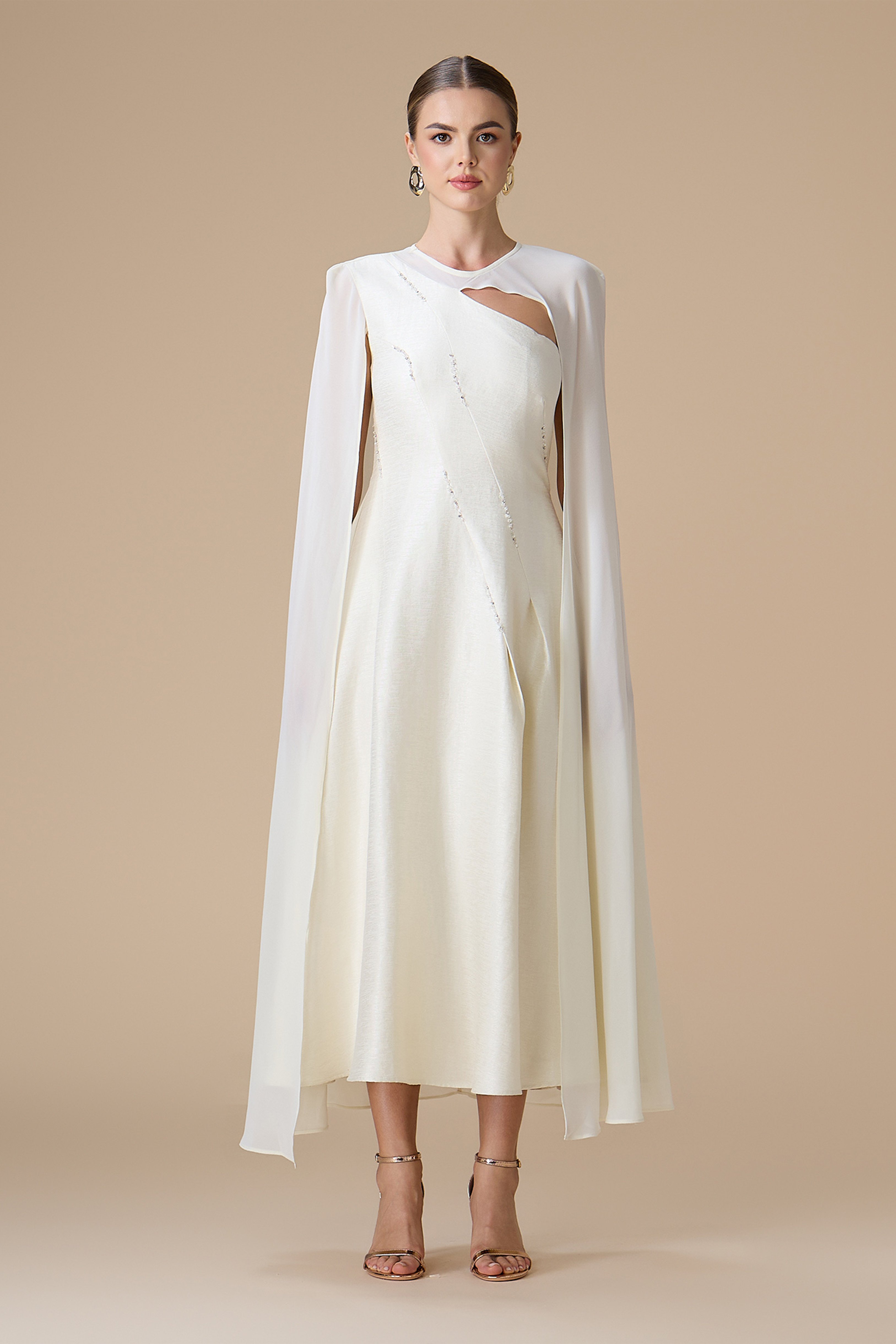 فستان ميدي سكري من الشيفون مزين بالخرز، بياقة دائرية مع فتحة Cut-out وأكمام كاب، بقصة مخصّرة غير قابلة للتمدد