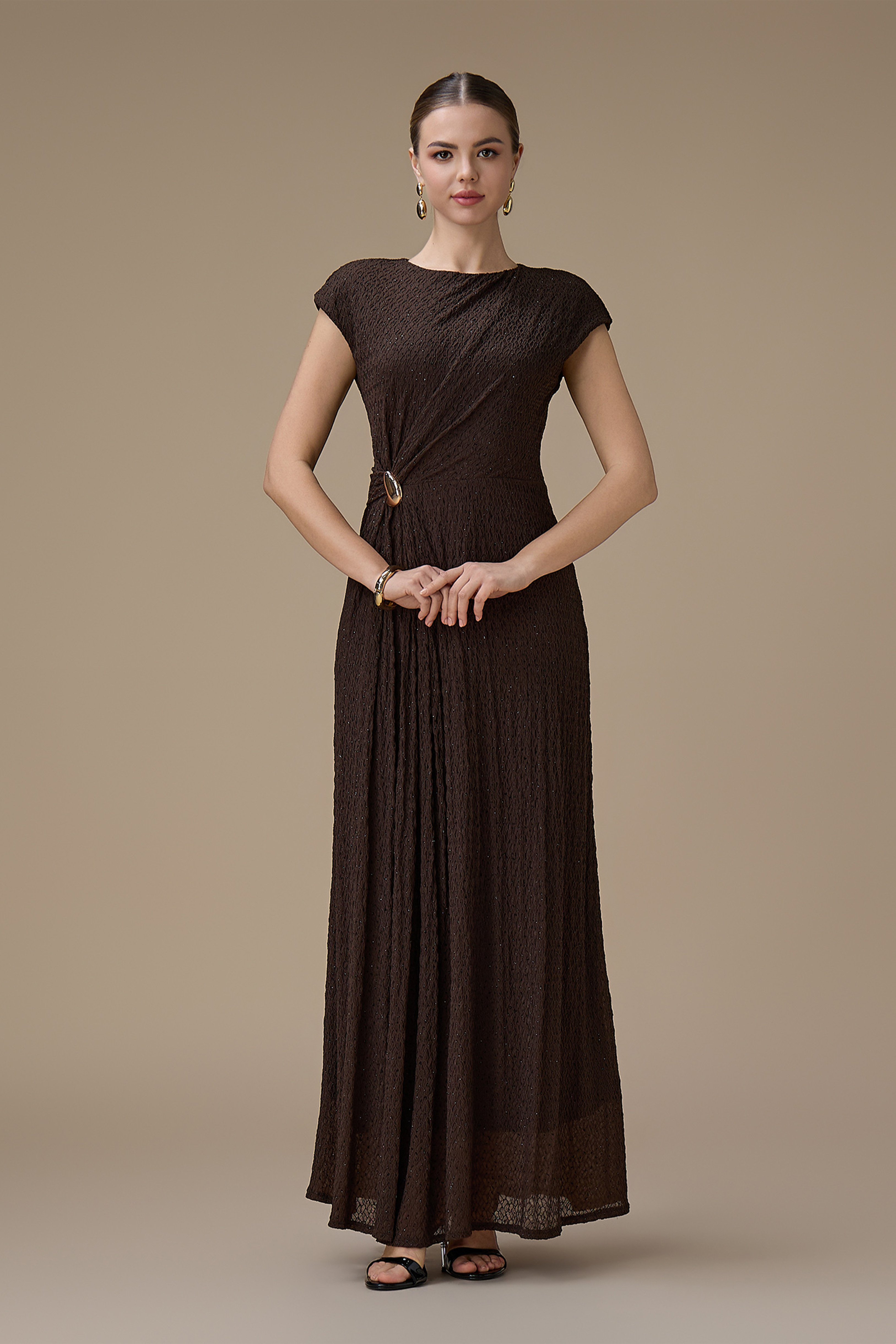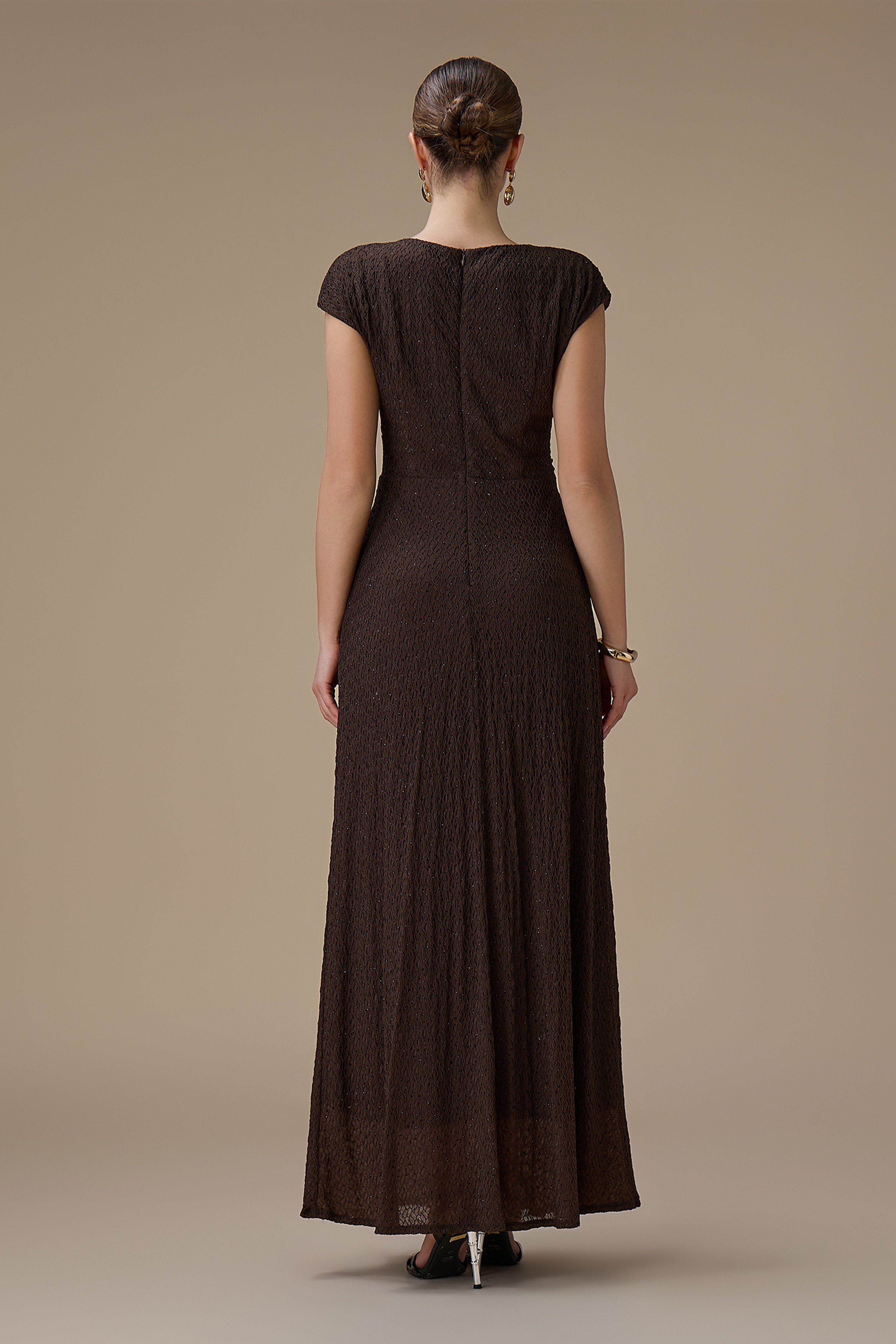 نوع القصة: فستان طويل بني بتفصيلية جانبية مطرز بأكمام قصيرة وياقة دائرية