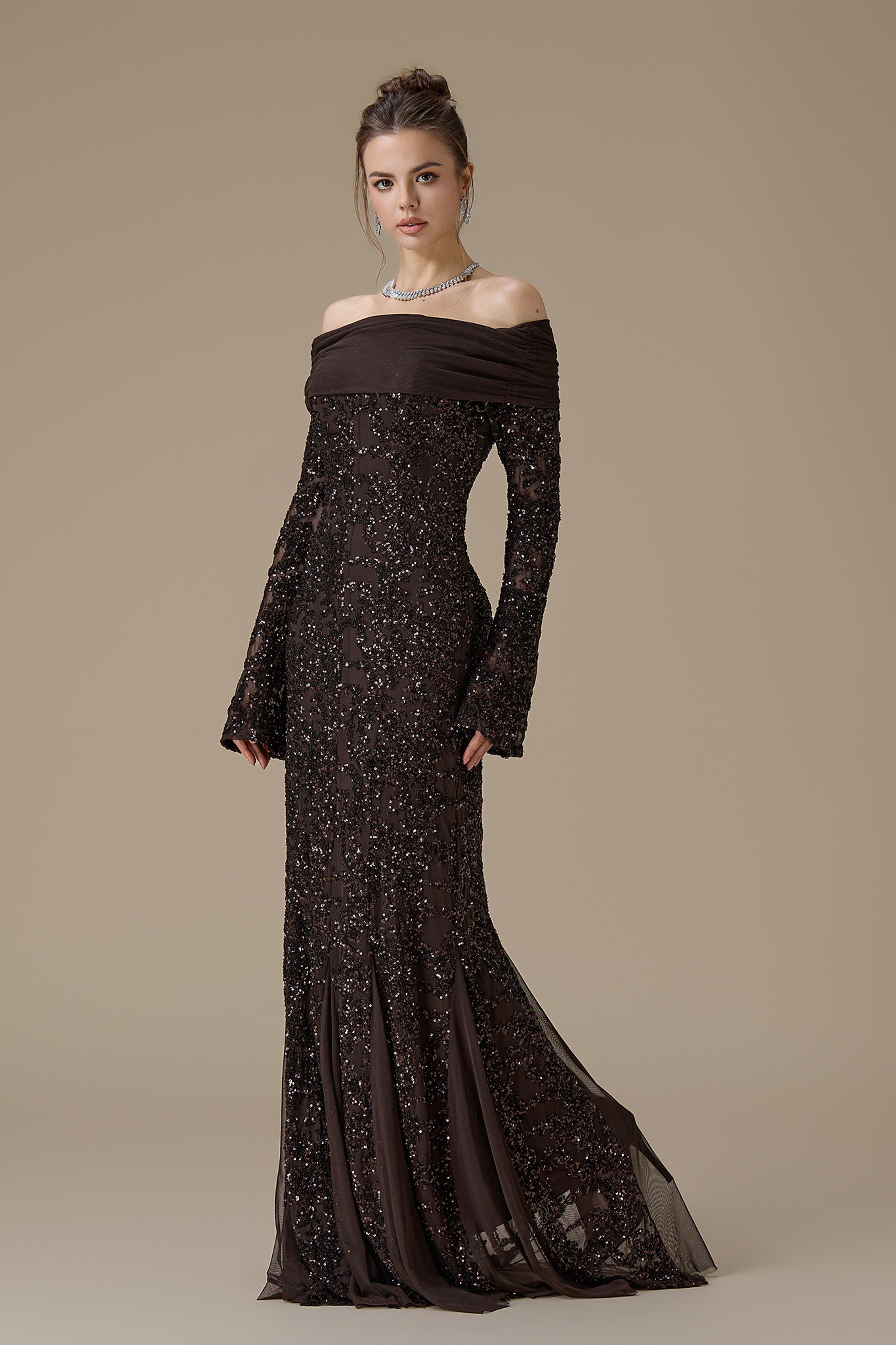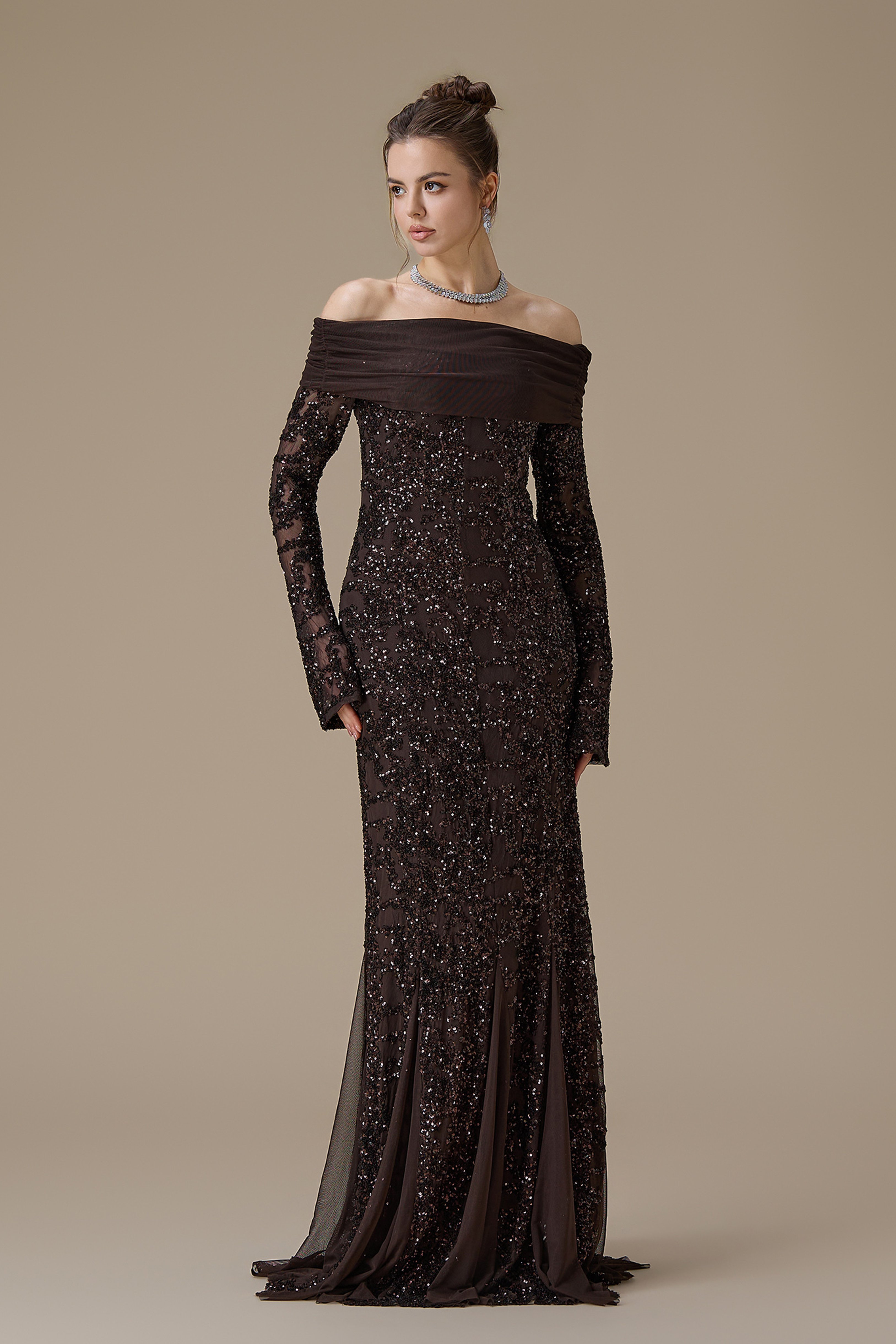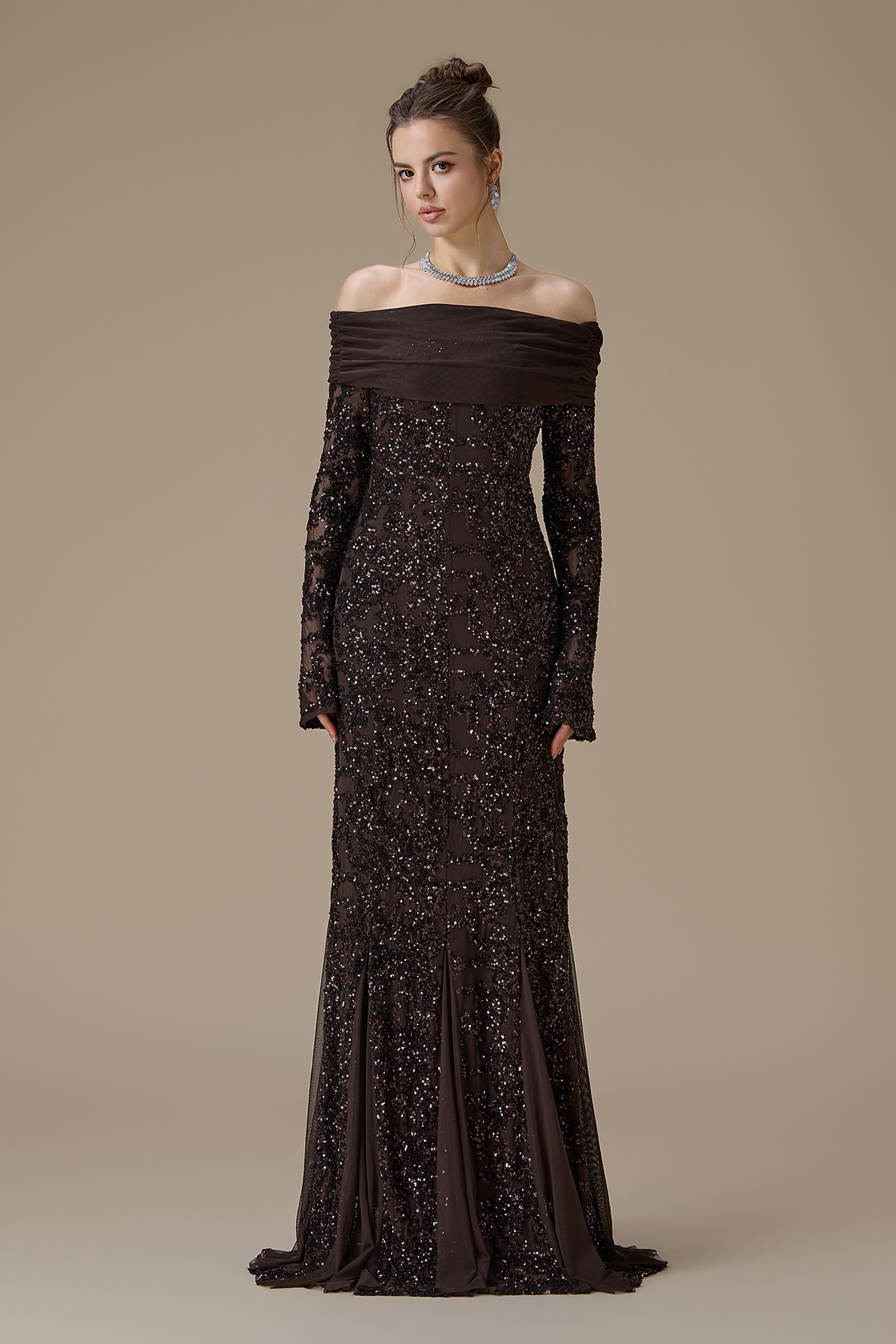 • نوع القصة: فستان طويل ترتر بني اوف شولدر بأكمام طويلة