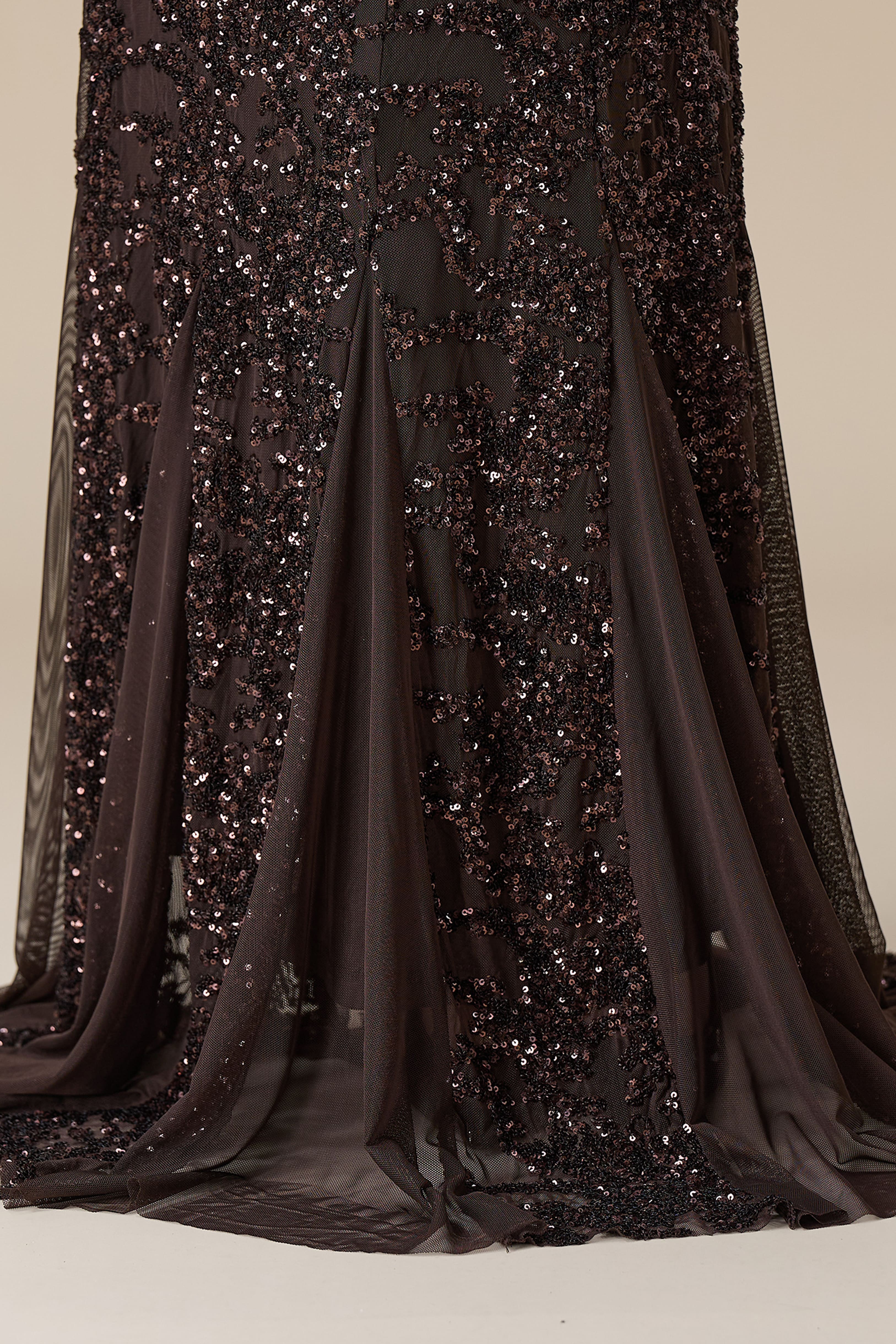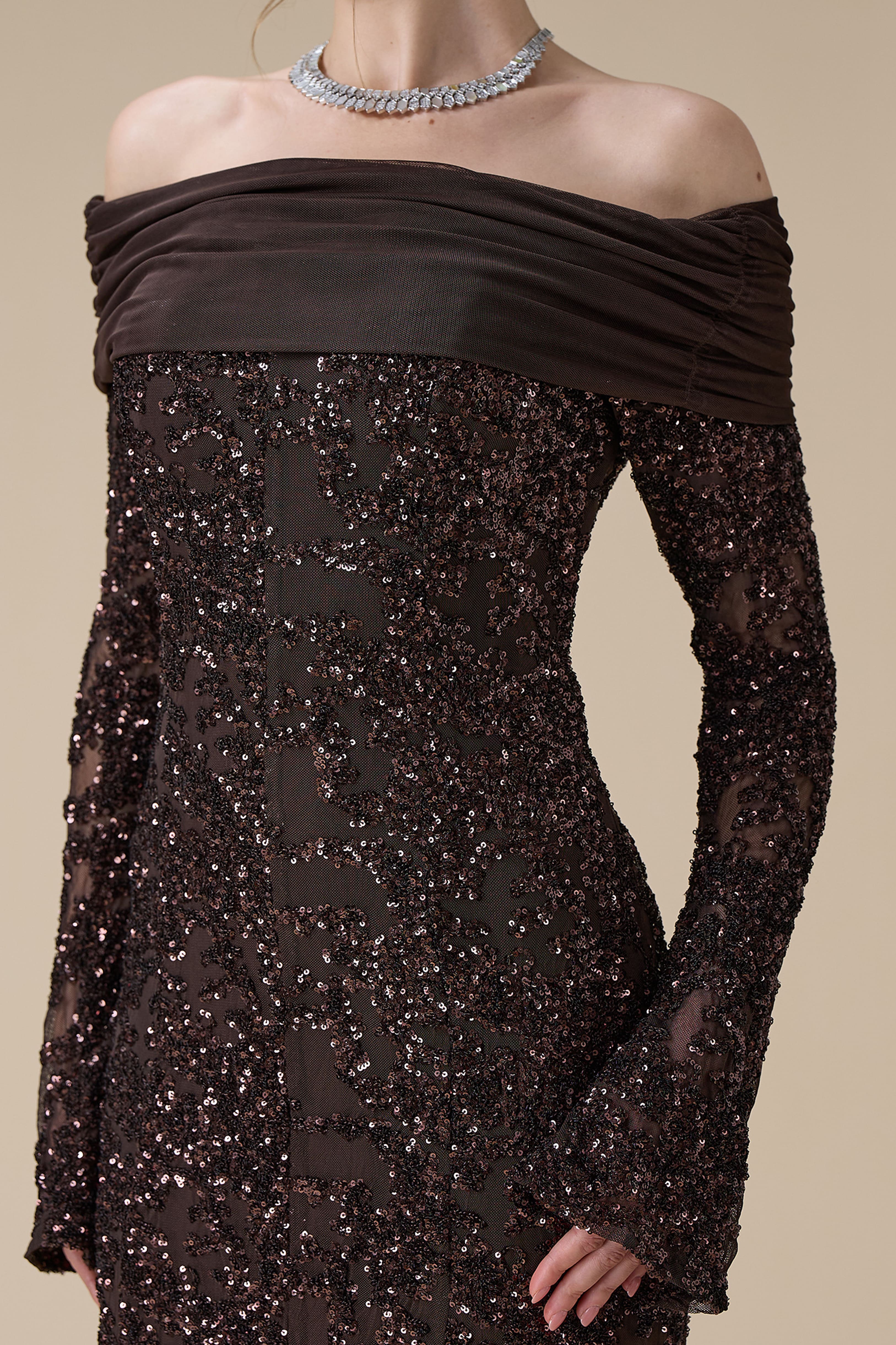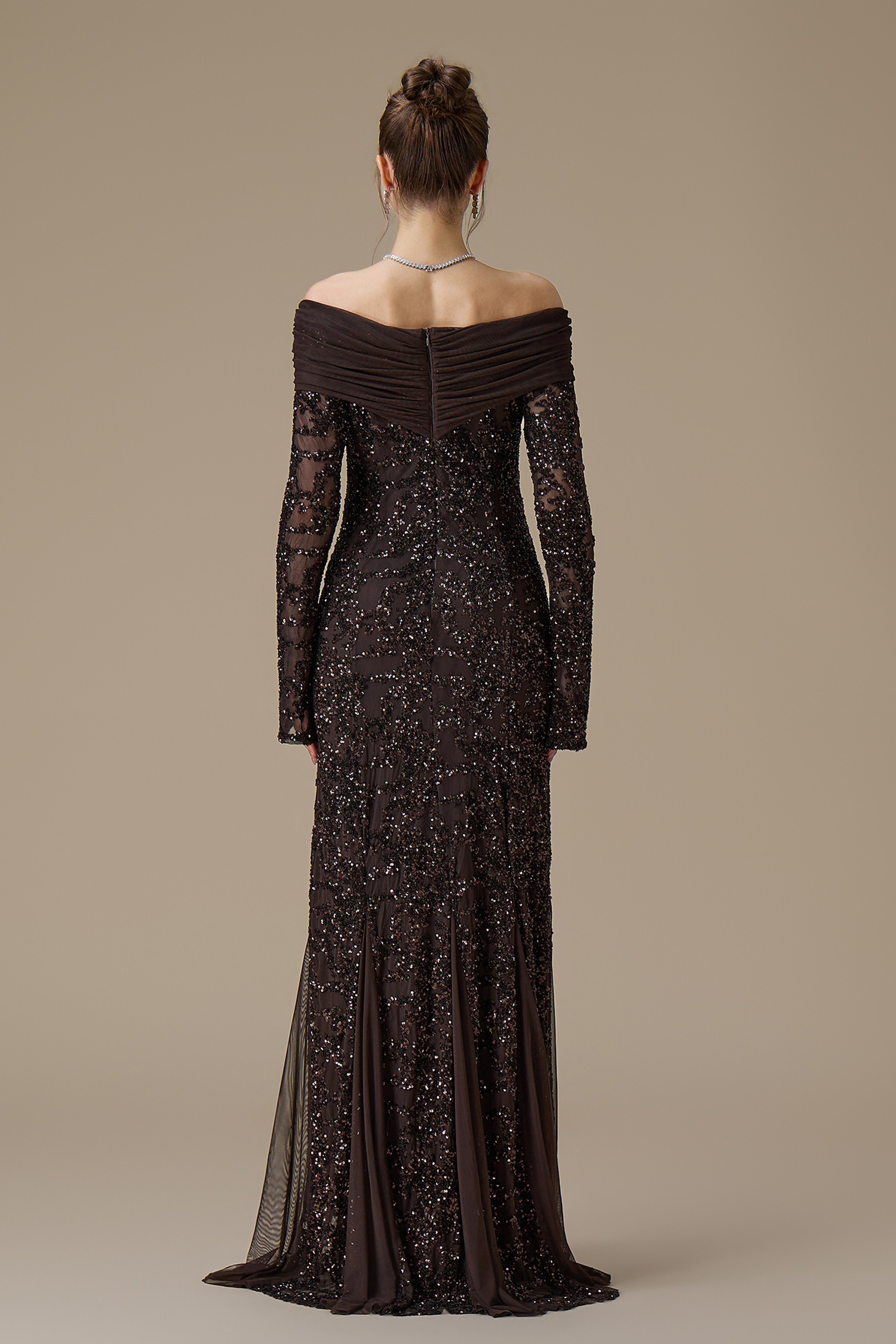 • نوع القصة: فستان طويل ترتر بني اوف شولدر بأكمام طويلة