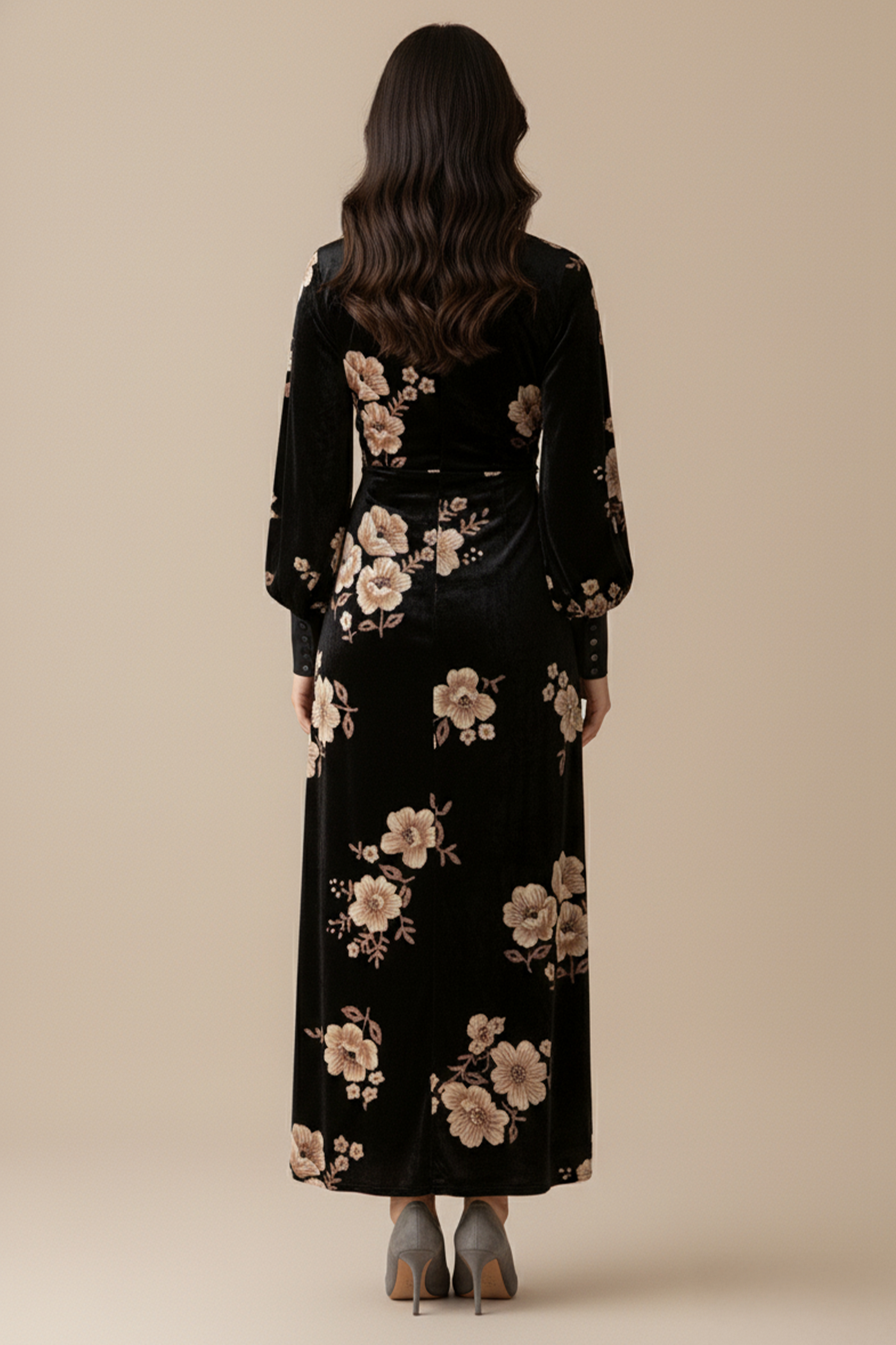 نوع القصة: فستان مخملي درابية بطبعة زهور بأكمام طويلة.