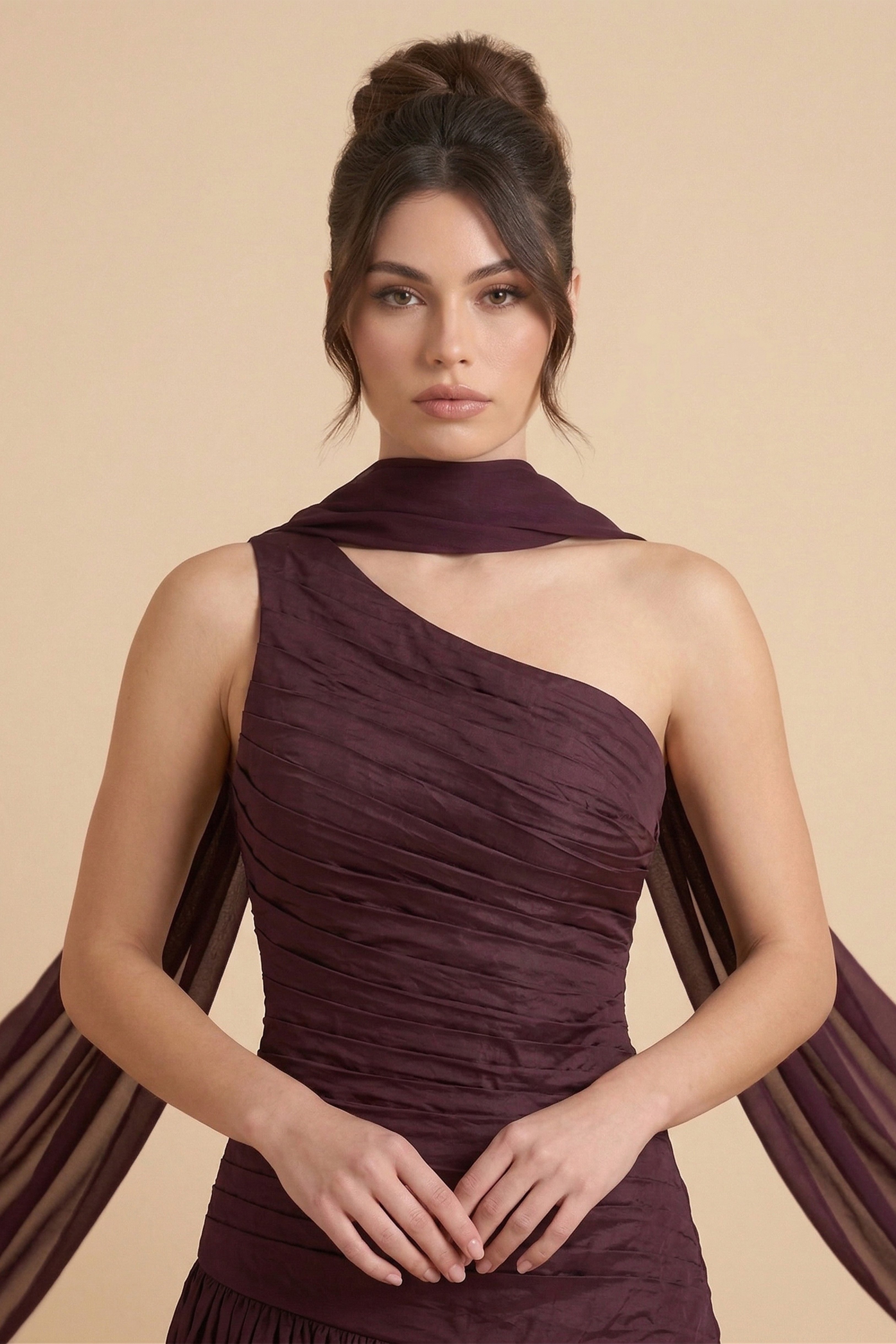 فستان تفتة عنابي طويل بشال وتصميم درابيه على الصدر بكتف واحد