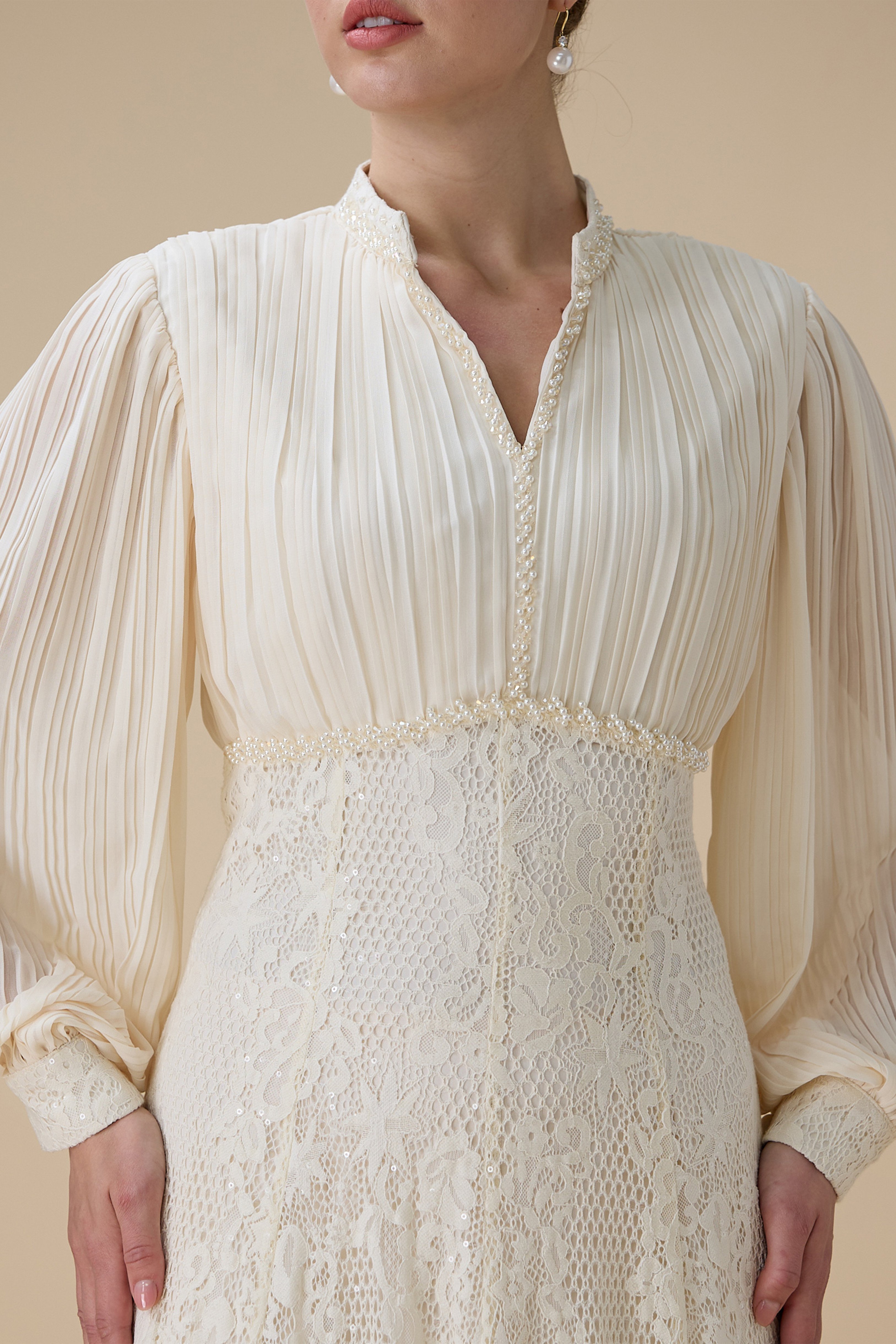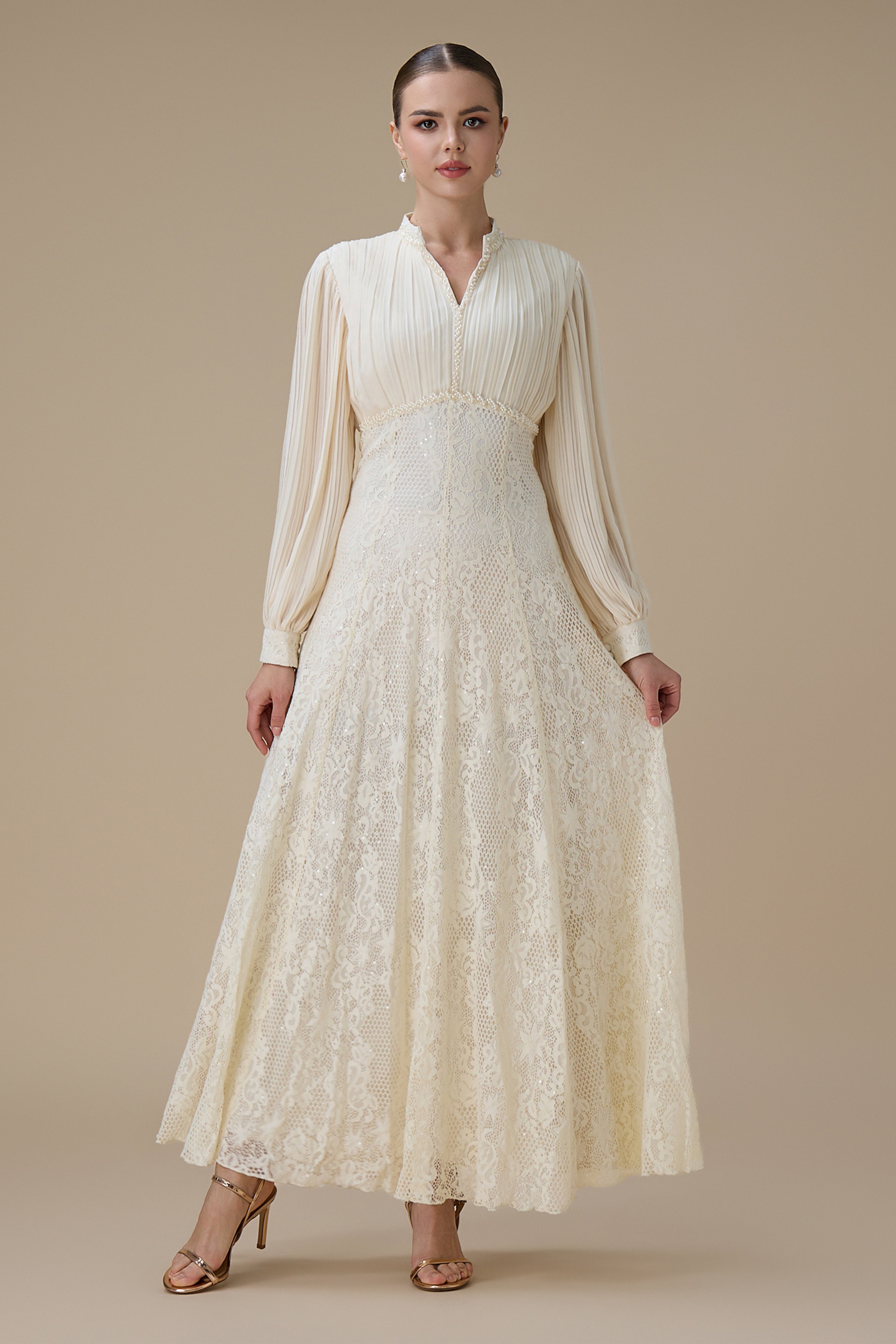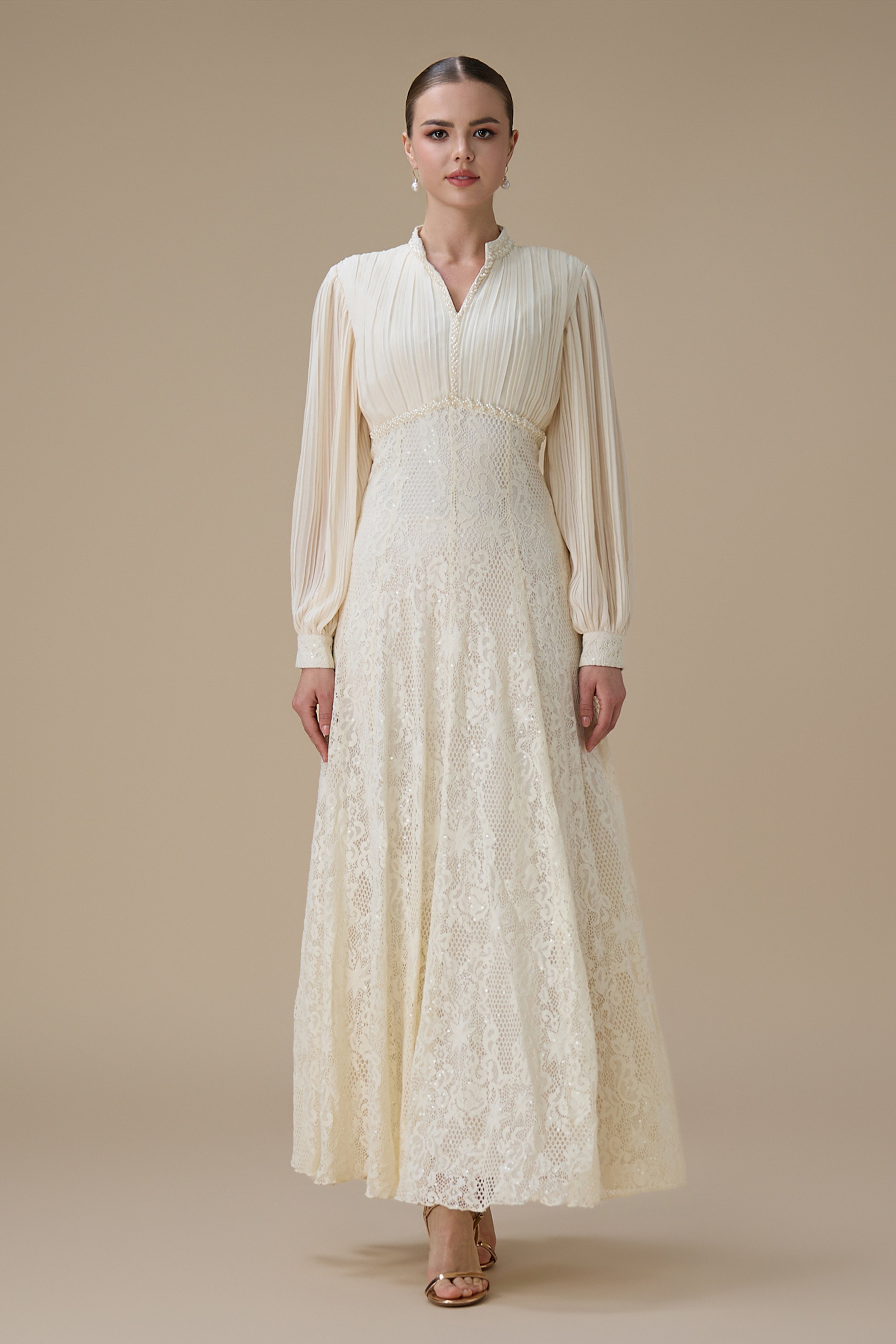 نوع القصة: فستان طويل بلون سكري بتفاصيل دانتيل بأكمام طويلة وياقة على شكل V بتفاصيل دقيقة