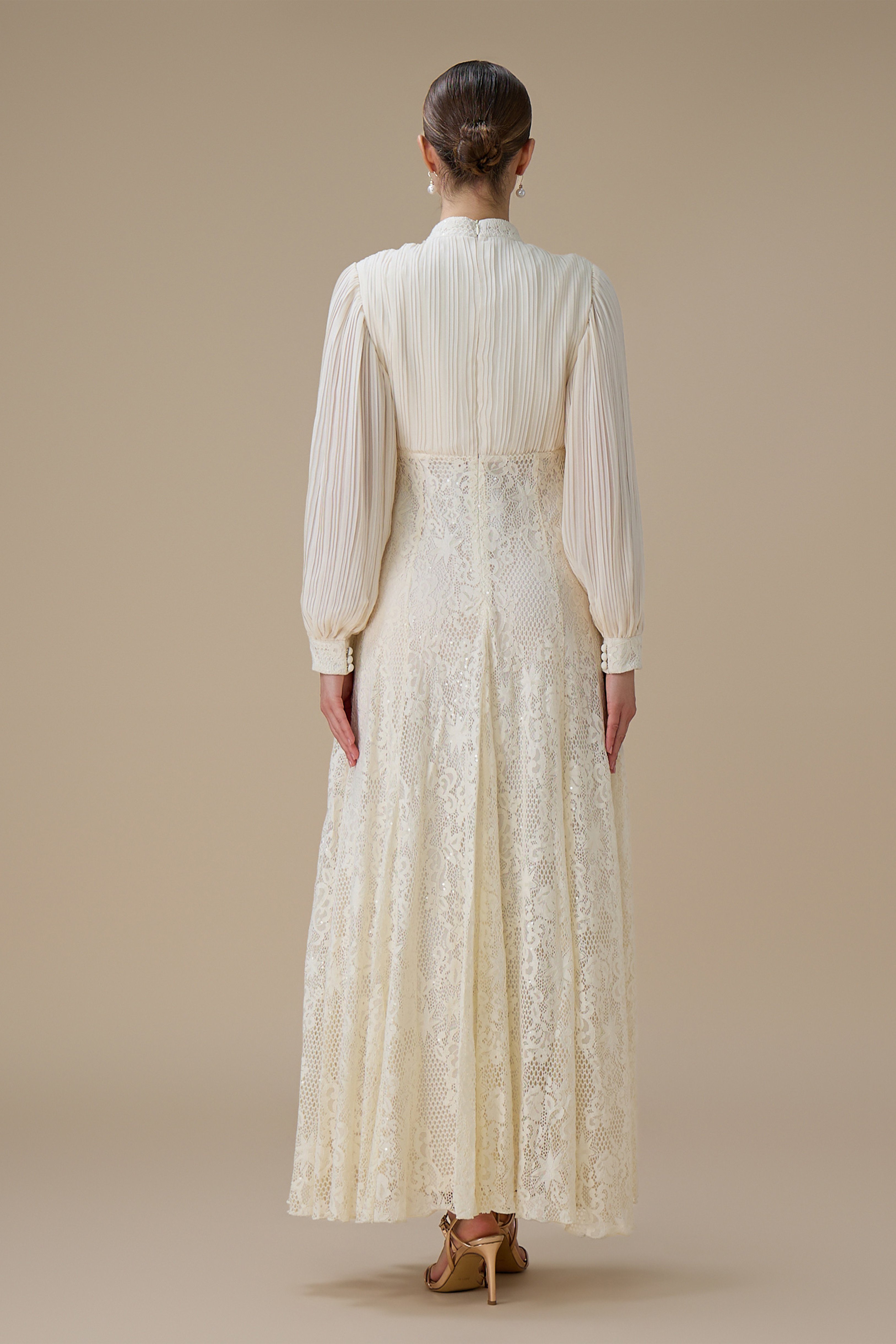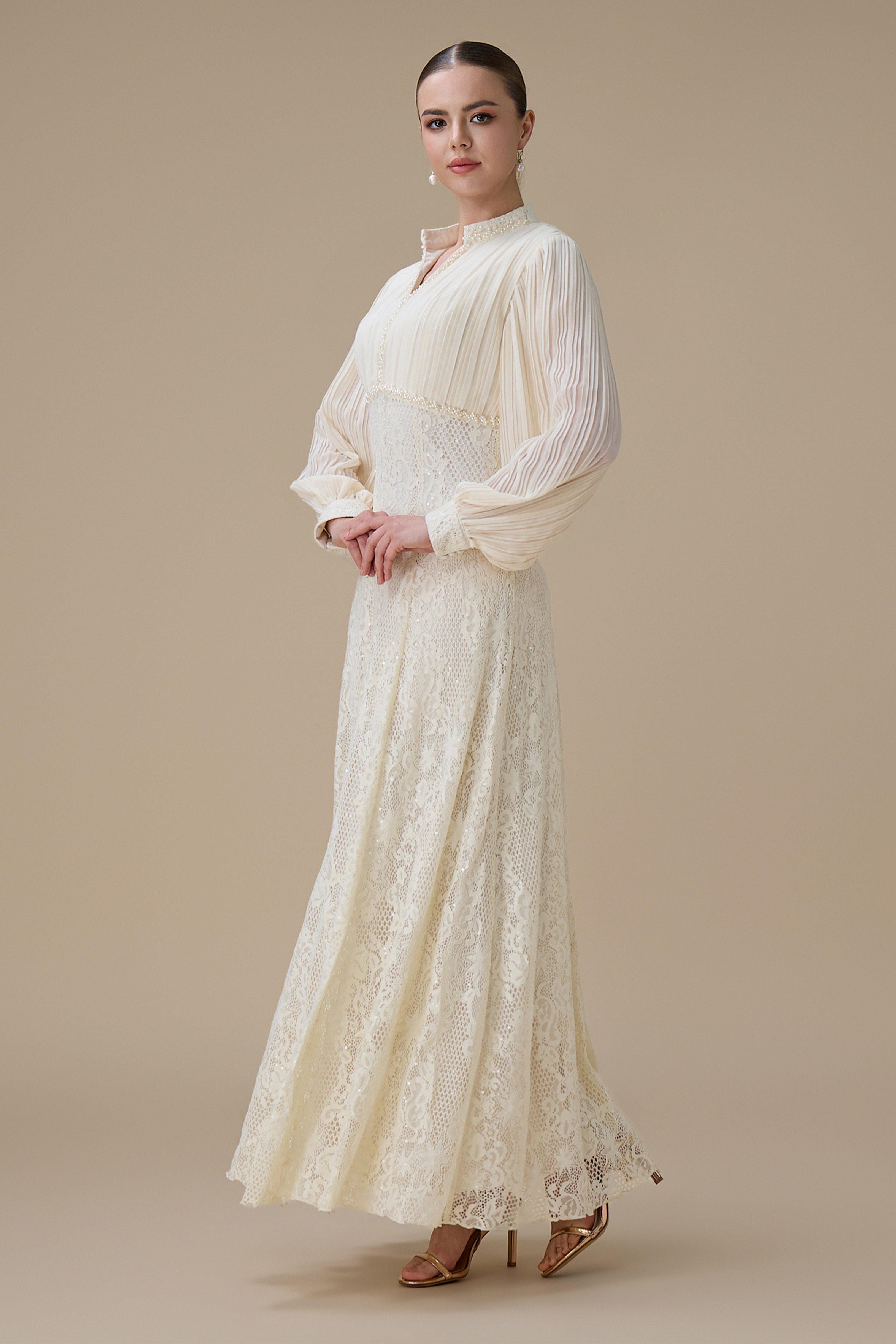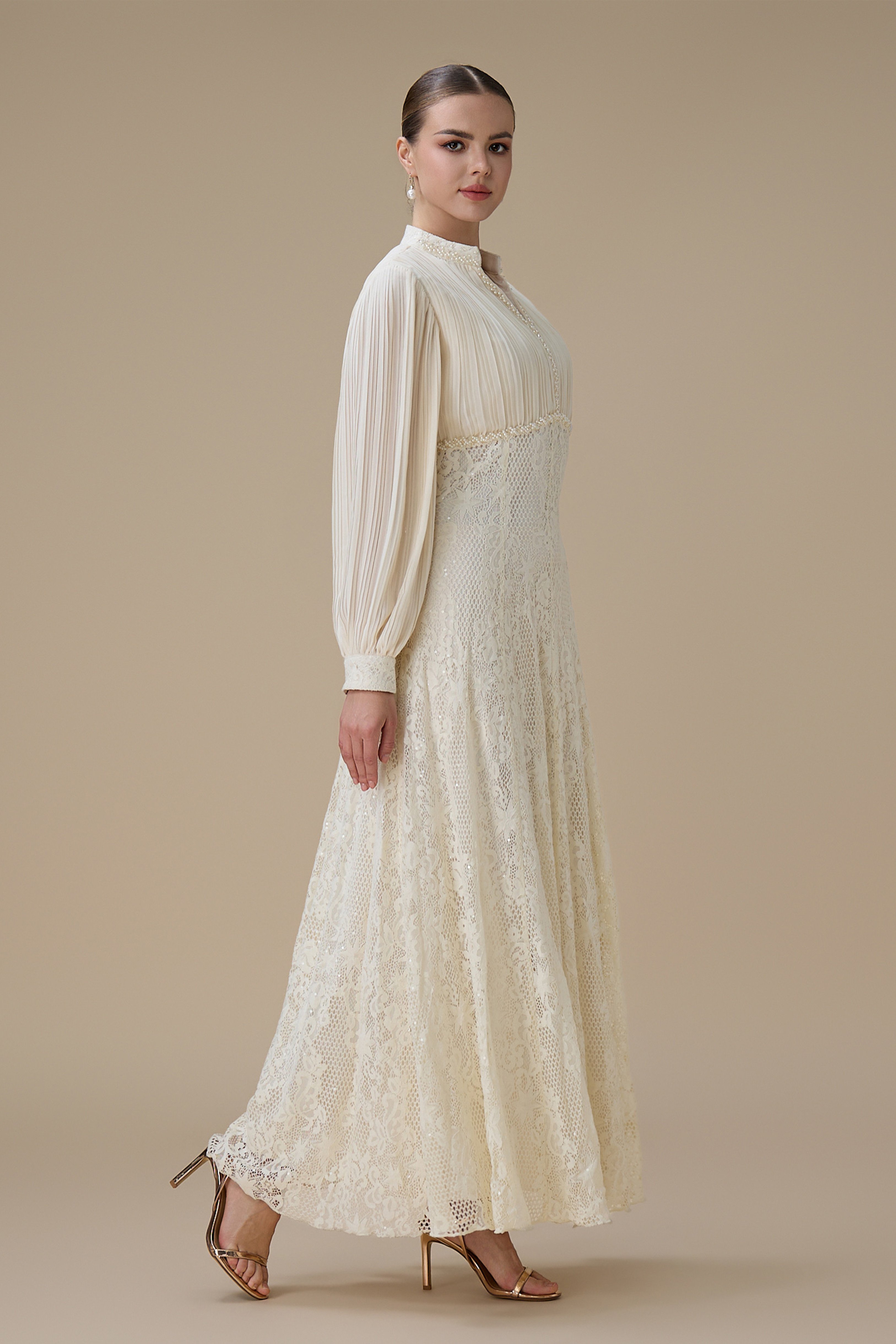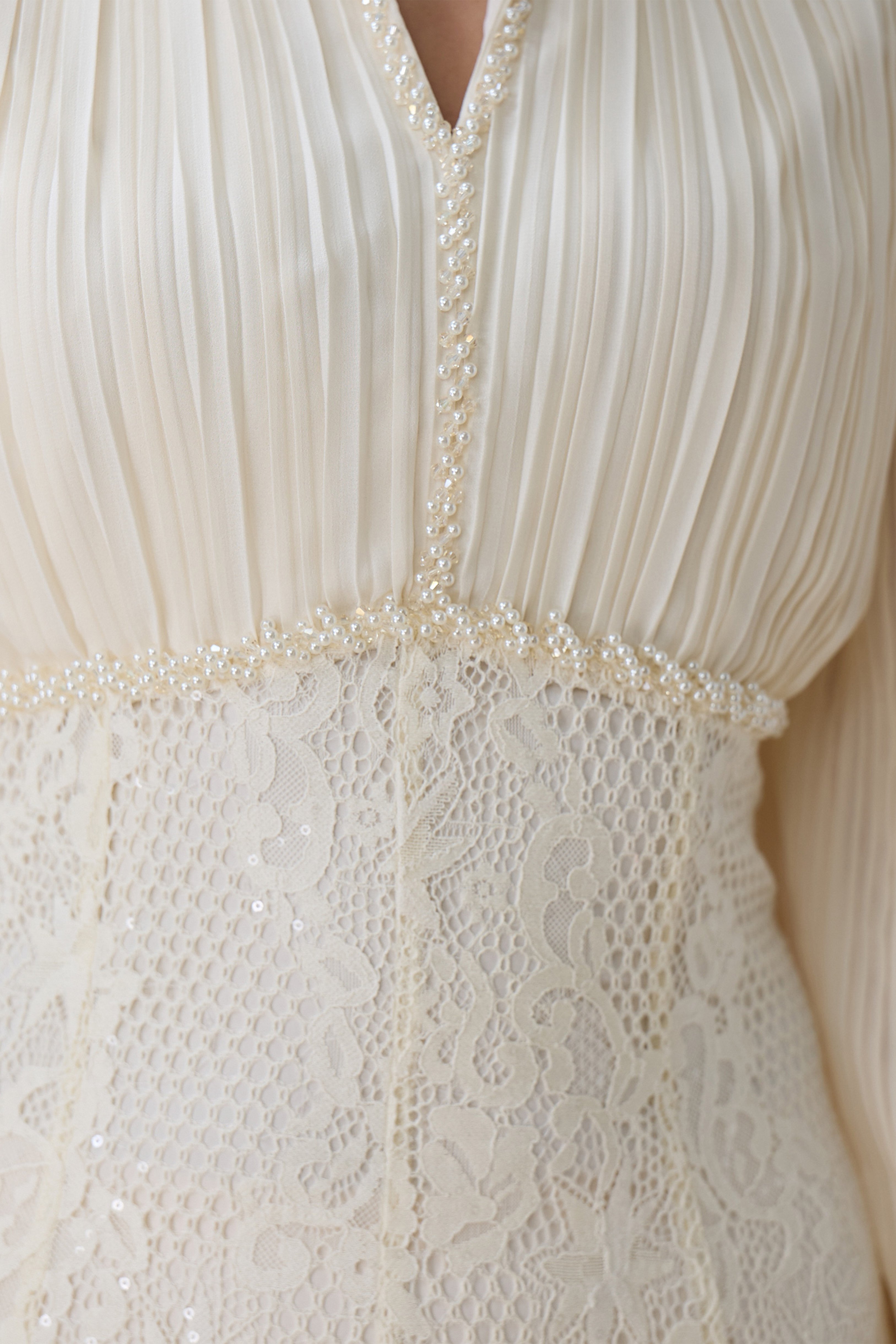 نوع القصة: فستان طويل بلون سكري بتفاصيل دانتيل بأكمام طويلة وياقة على شكل V بتفاصيل دقيقة