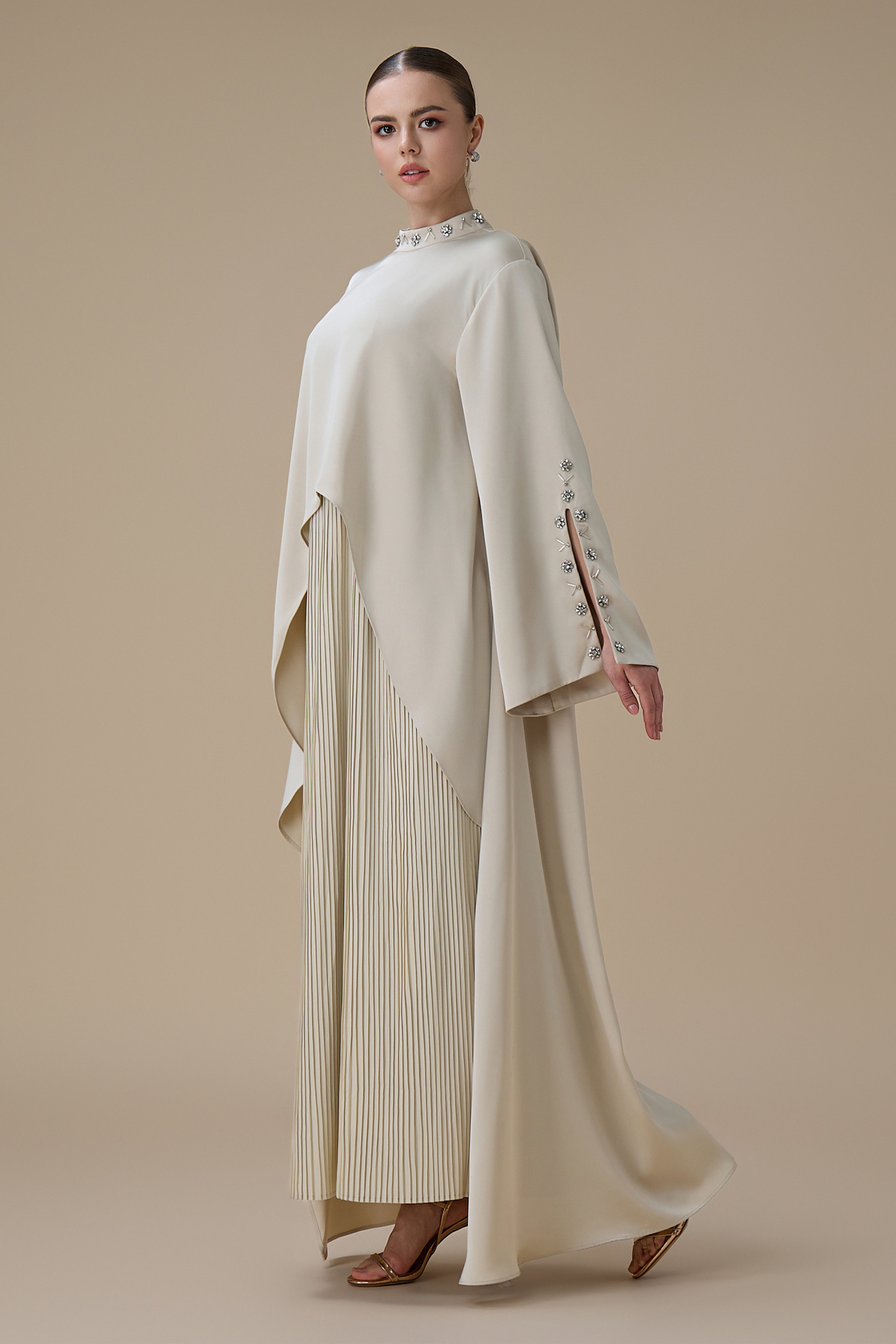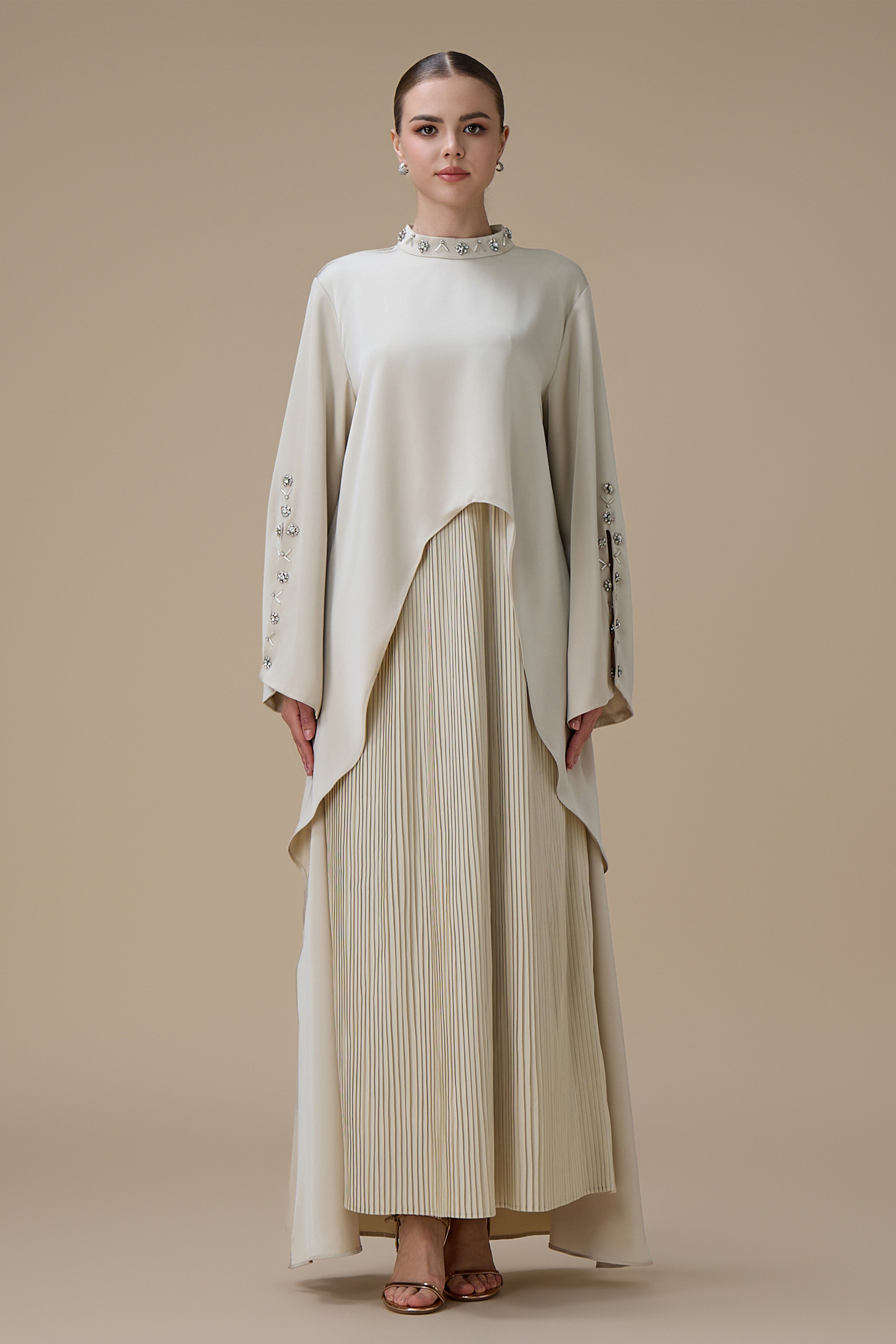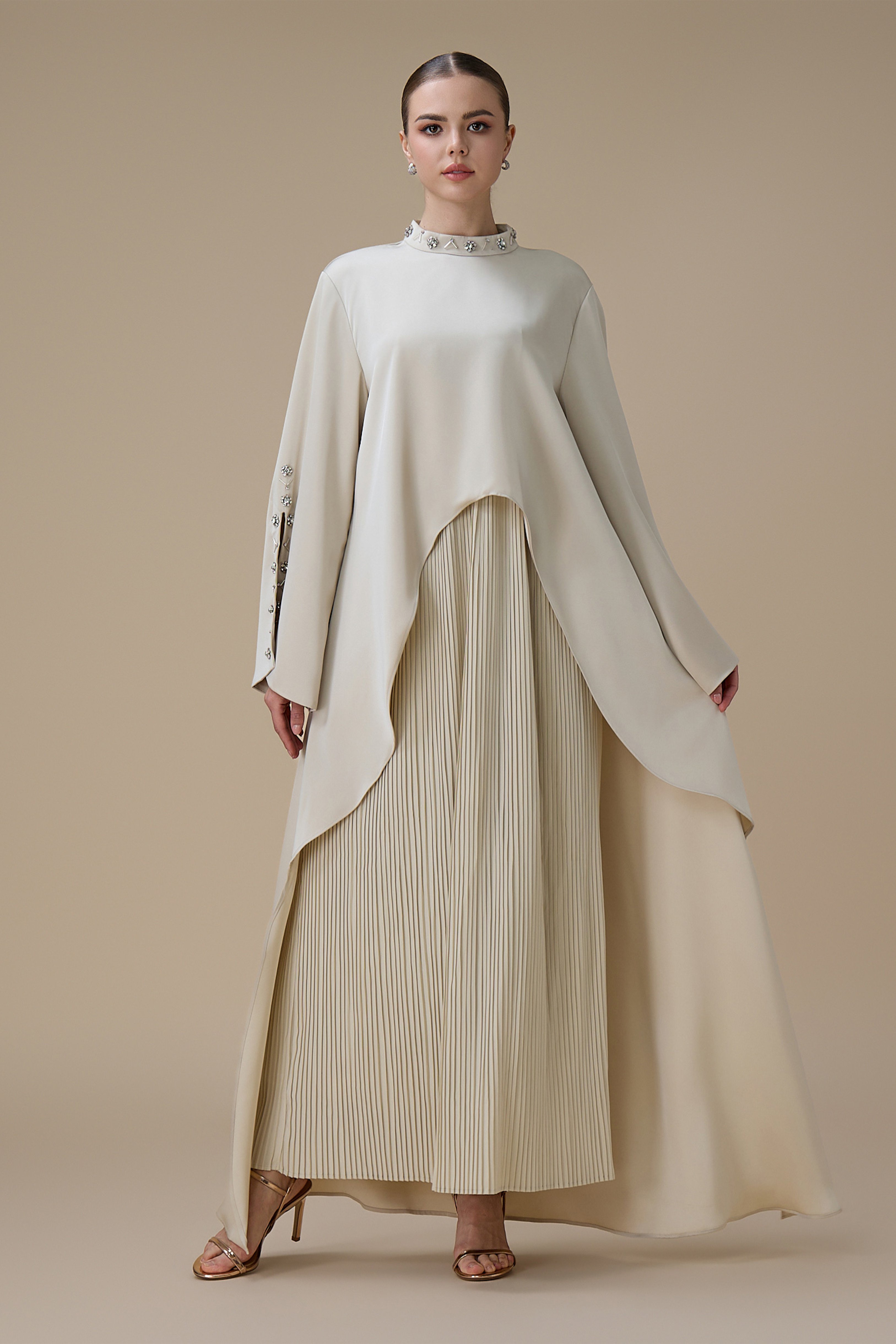 نوع القصة: جلابية أنيقة بيج بتصميم بليسيه بقصة مستقيمة مع طبقة علوية غير متماثلة بياقة مرتفعة