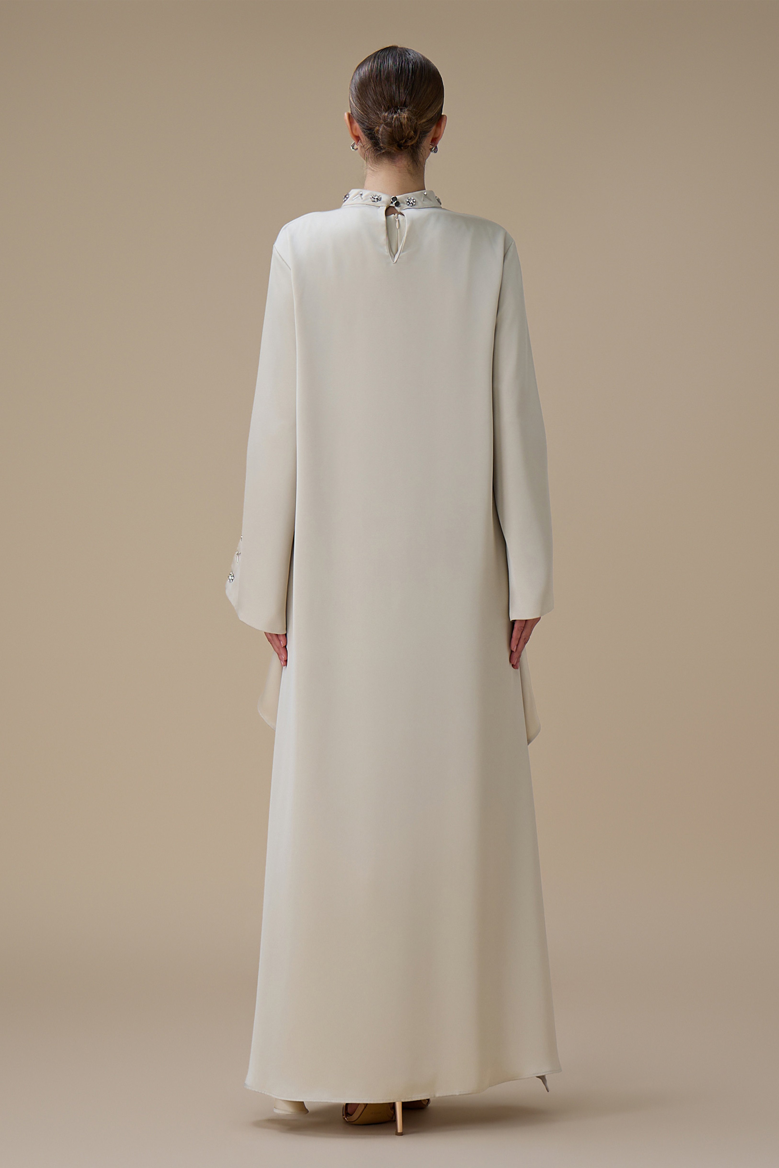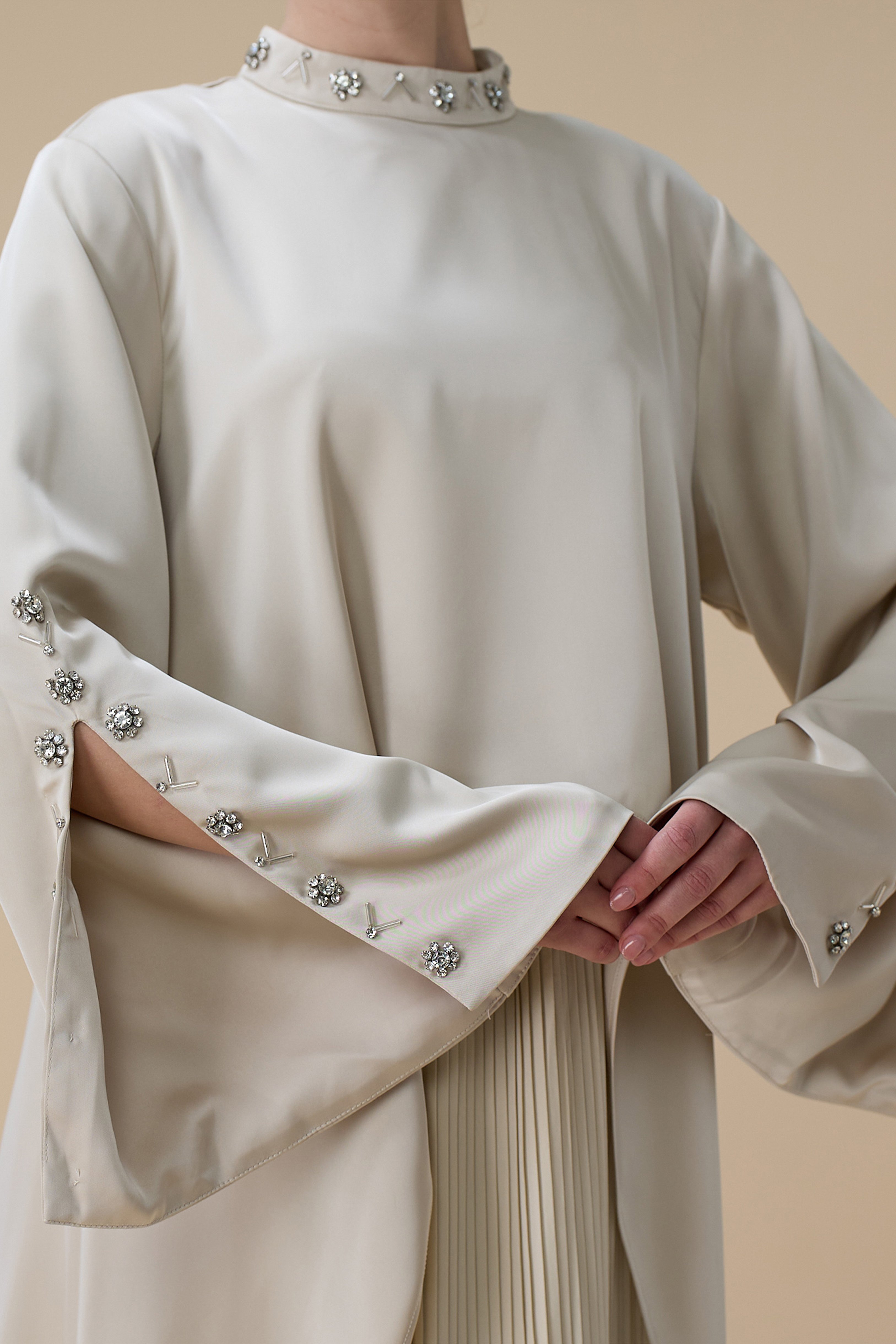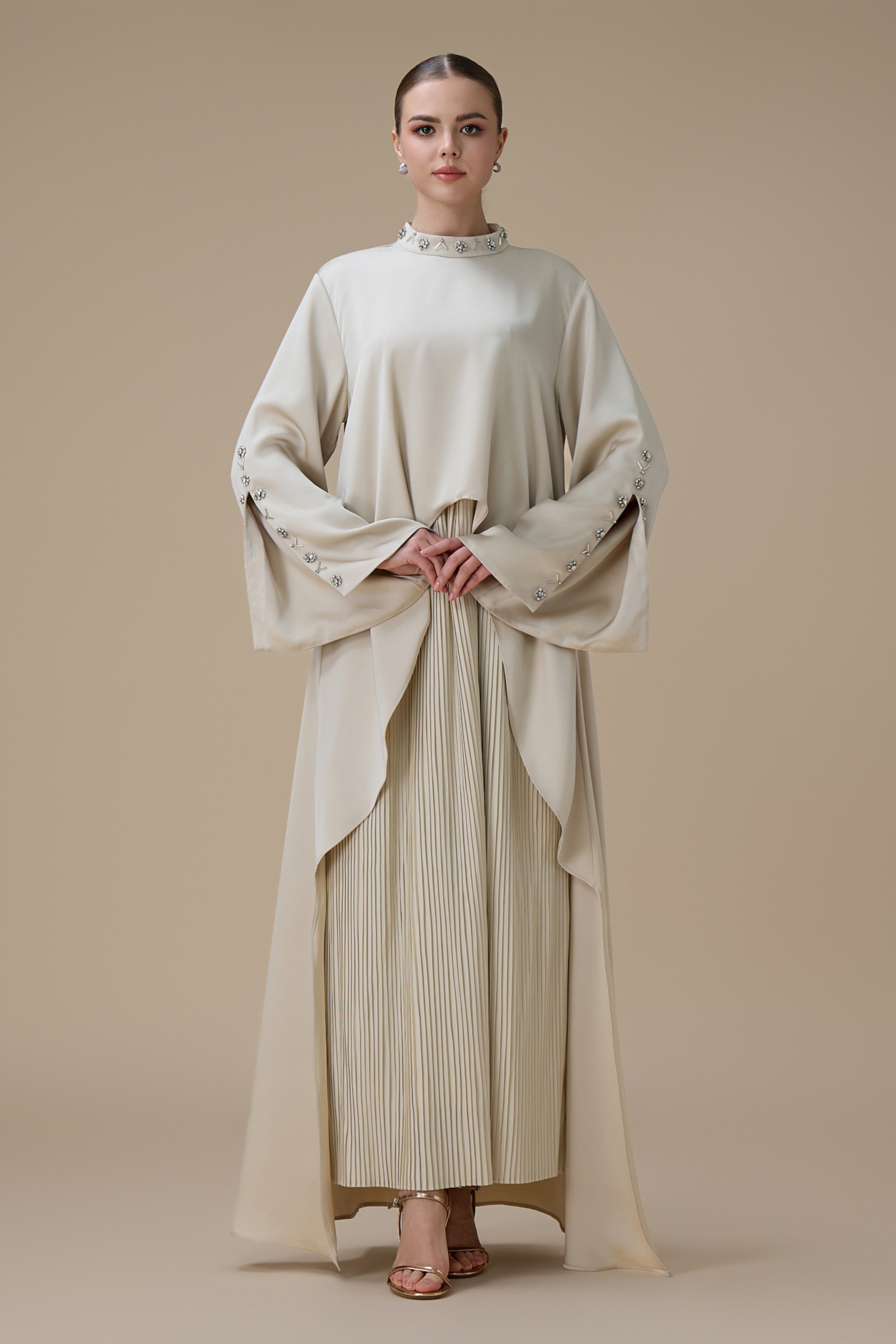نوع القصة: جلابية أنيقة بيج بتصميم بليسيه بقصة مستقيمة مع طبقة علوية غير متماثلة بياقة مرتفعة