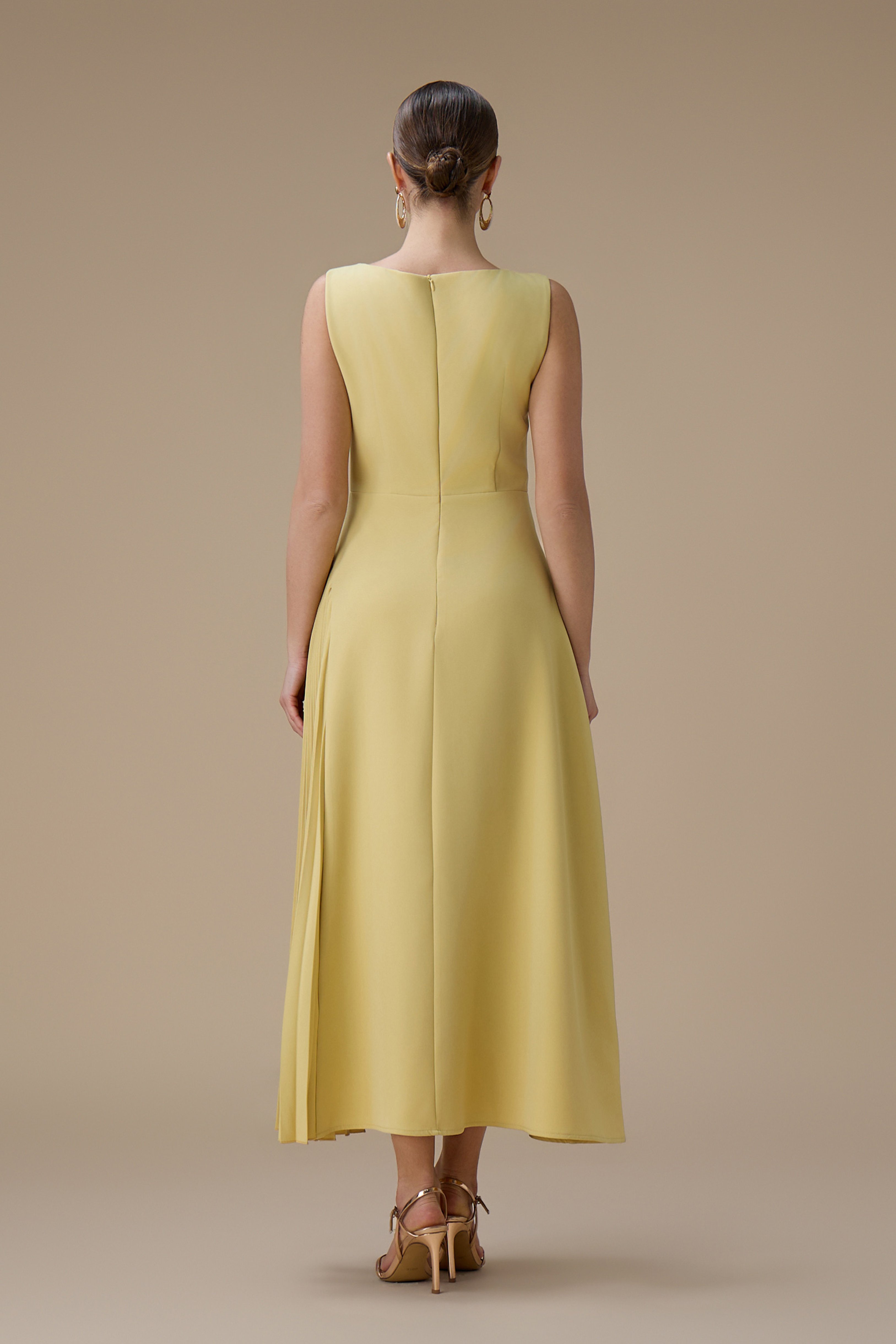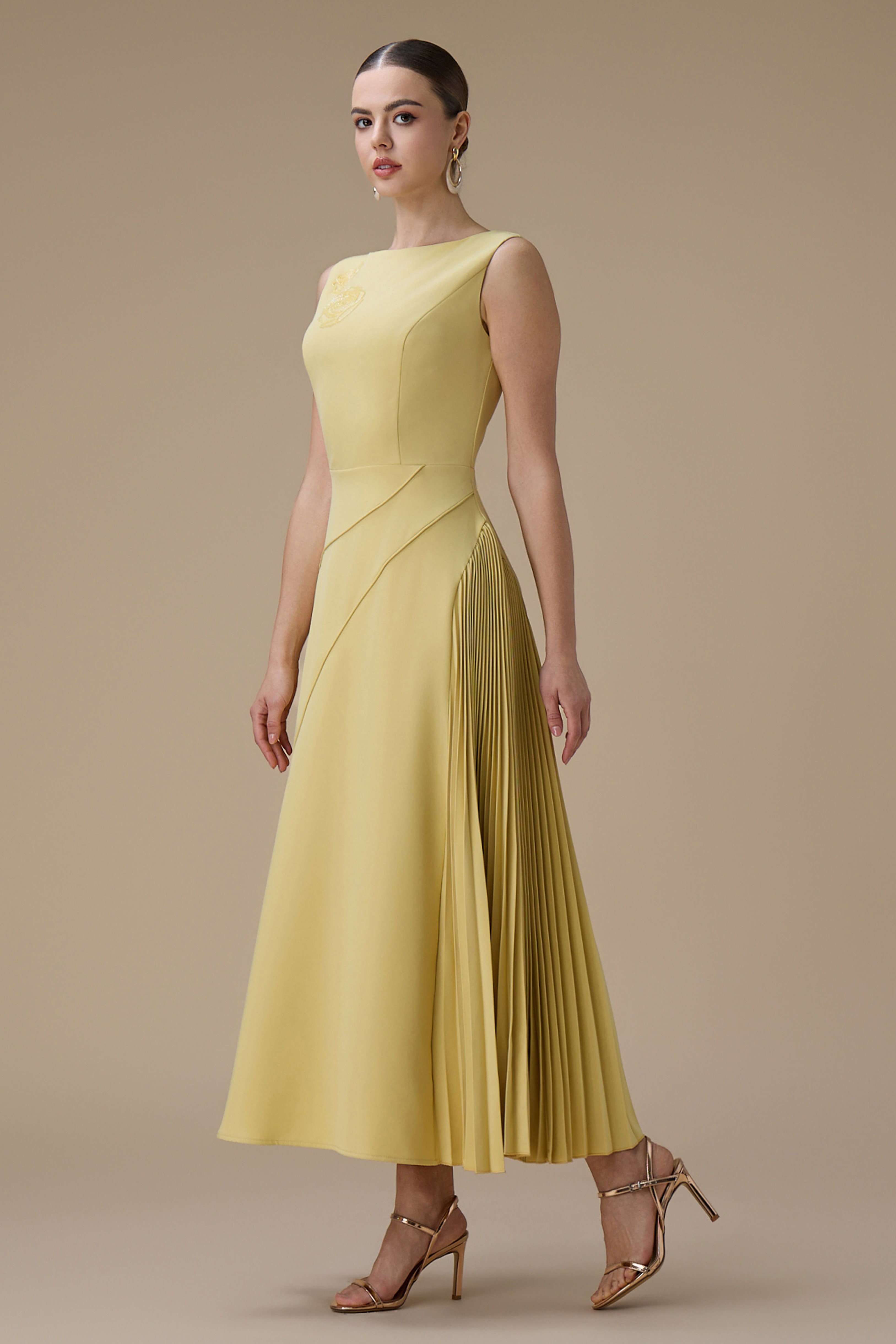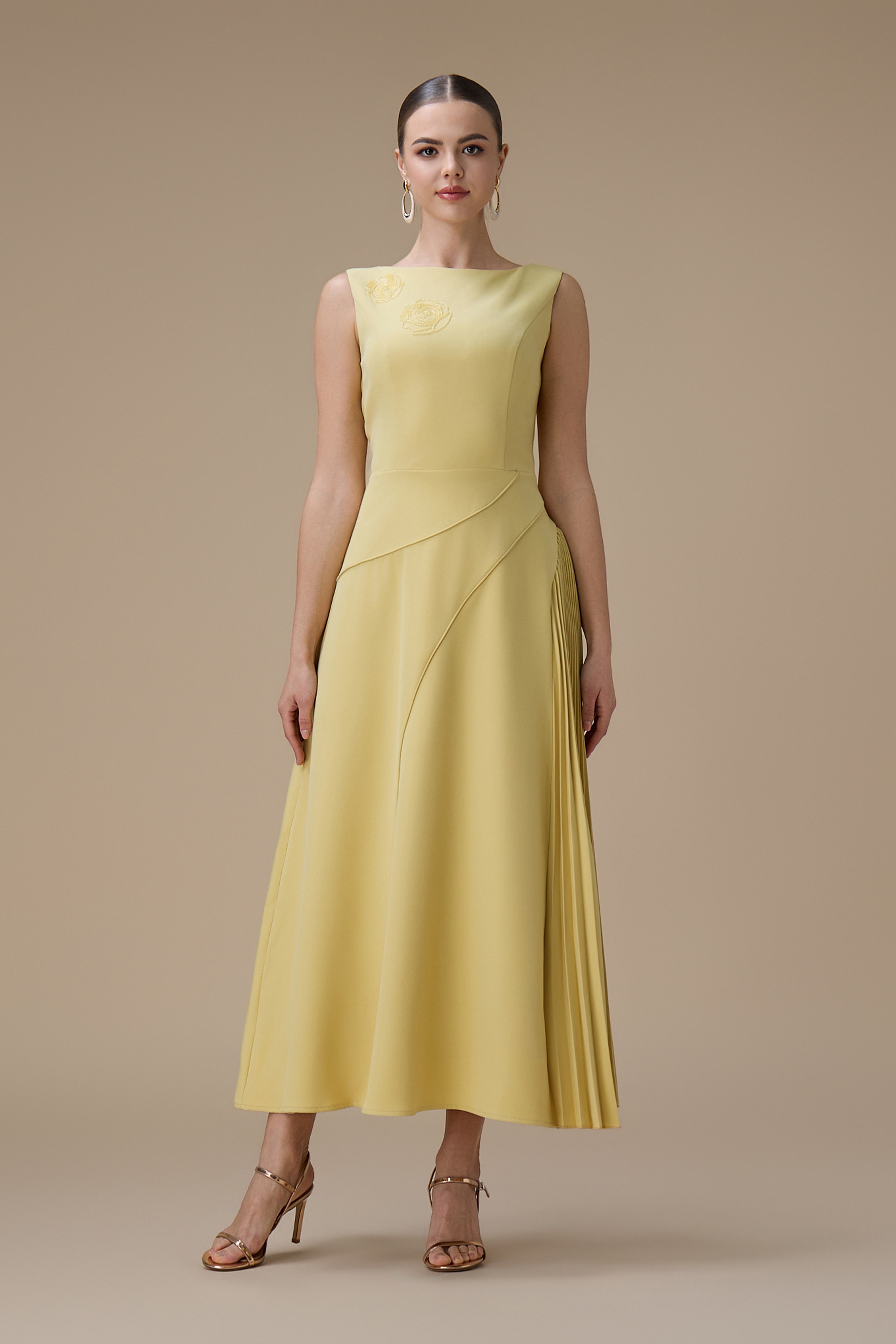 فستان اصفر طويل بكسرات من الجانب