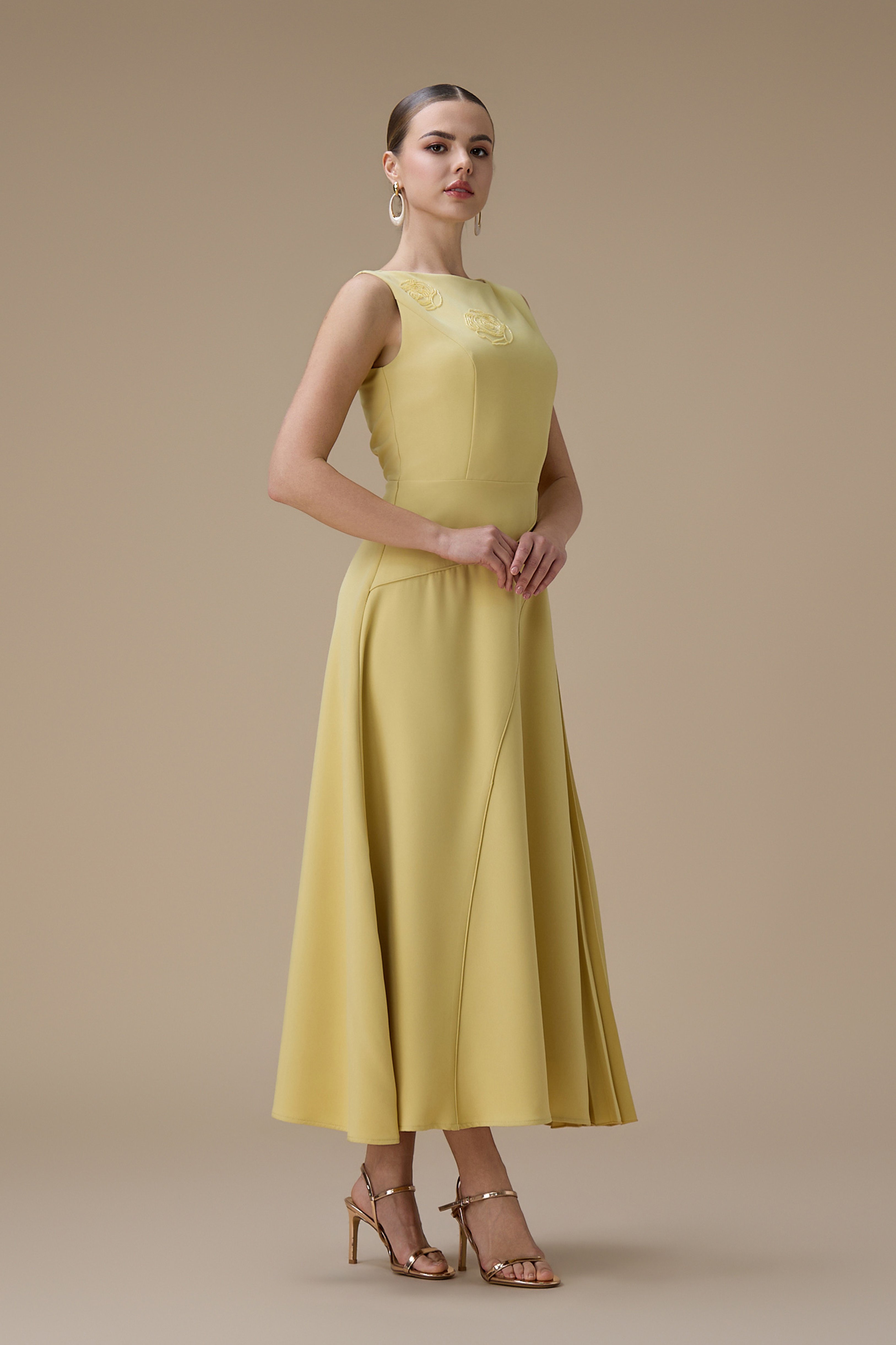 نوع القصة: فستان أصفر طويل بكسرات جانبية مع خصر محدد وياقة أنيقة بدون أكمام