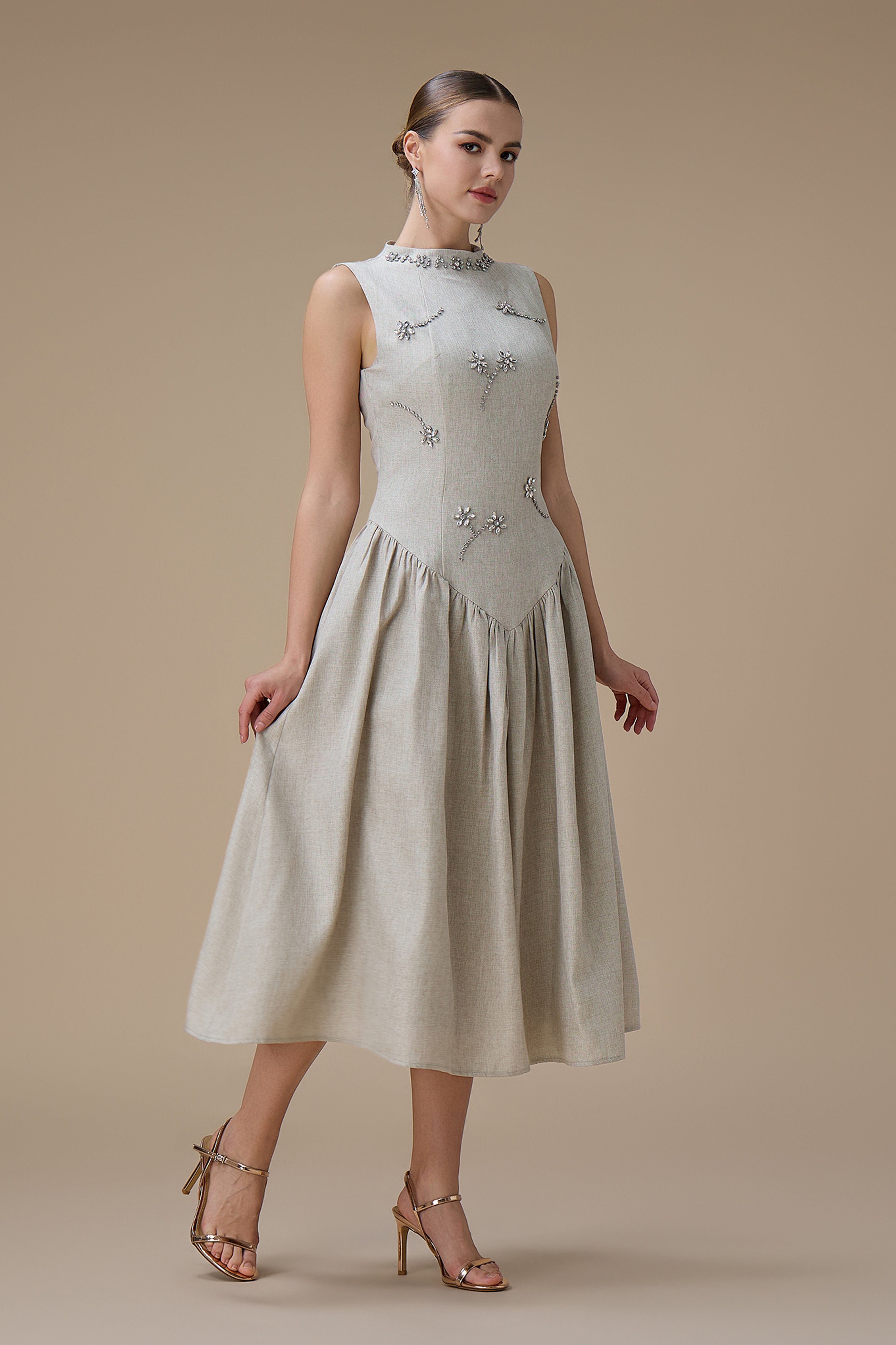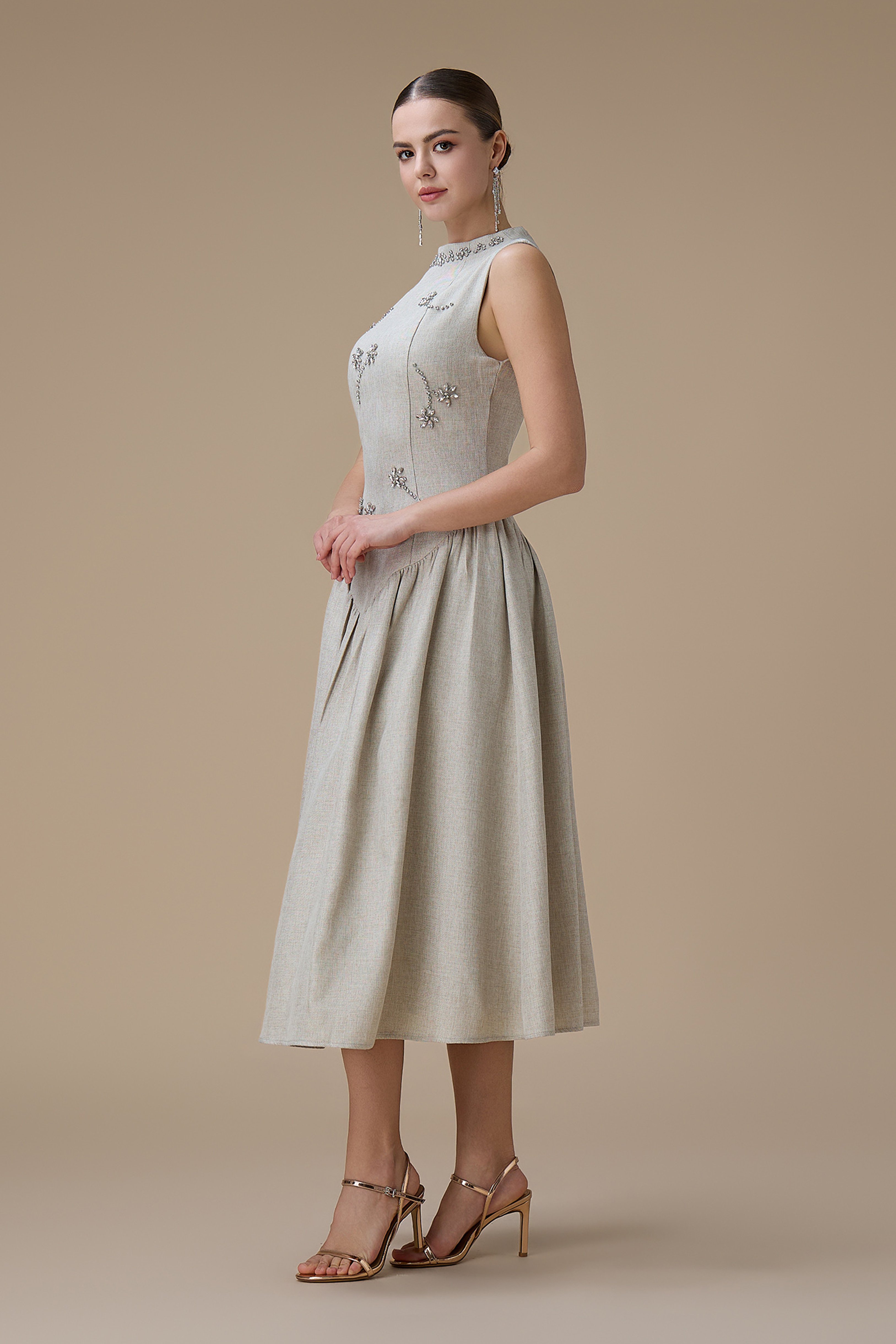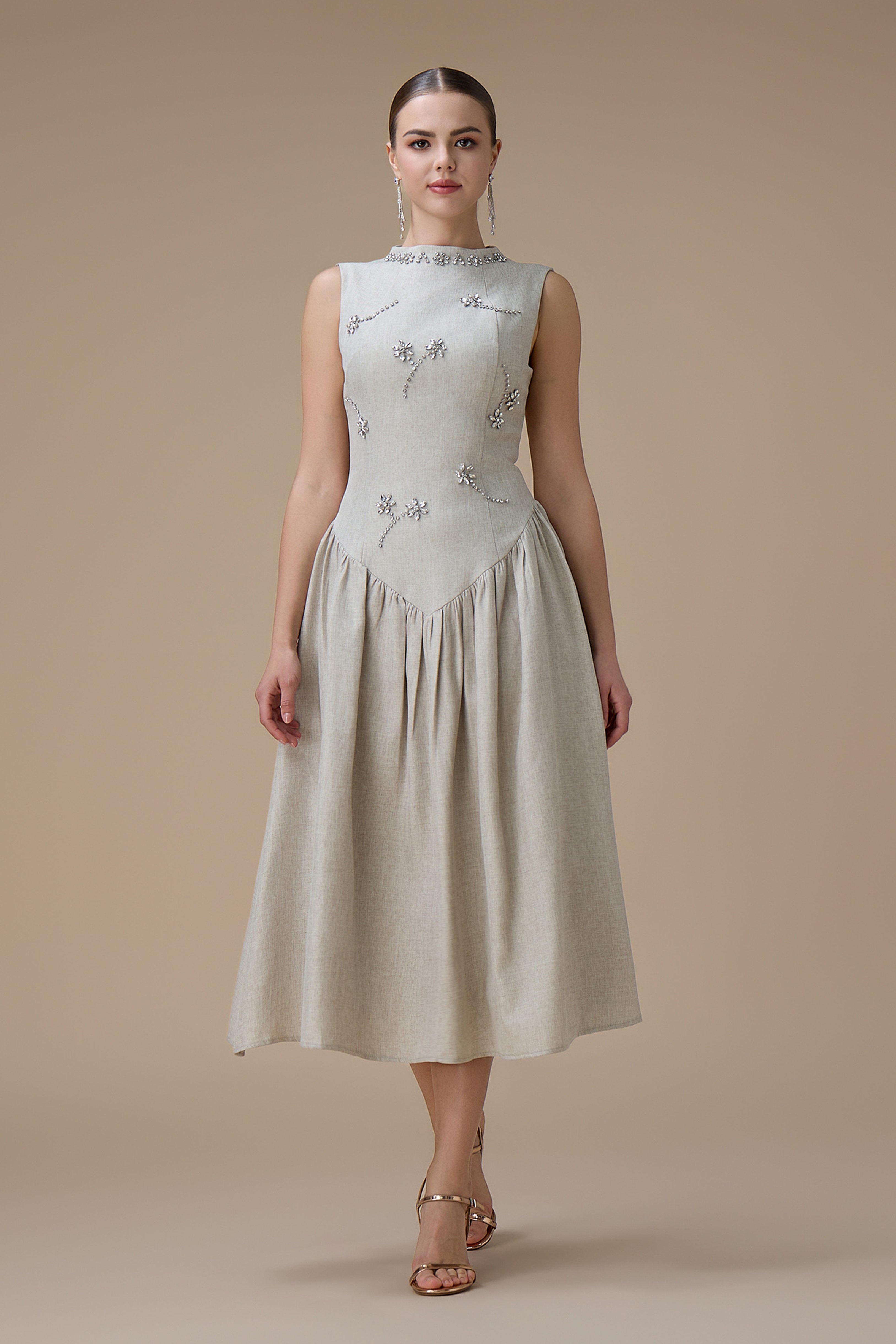 نوع القصة: فستان ميدي أنيق بتطريز ناعم وقصة خصر محددة بياقة عالية