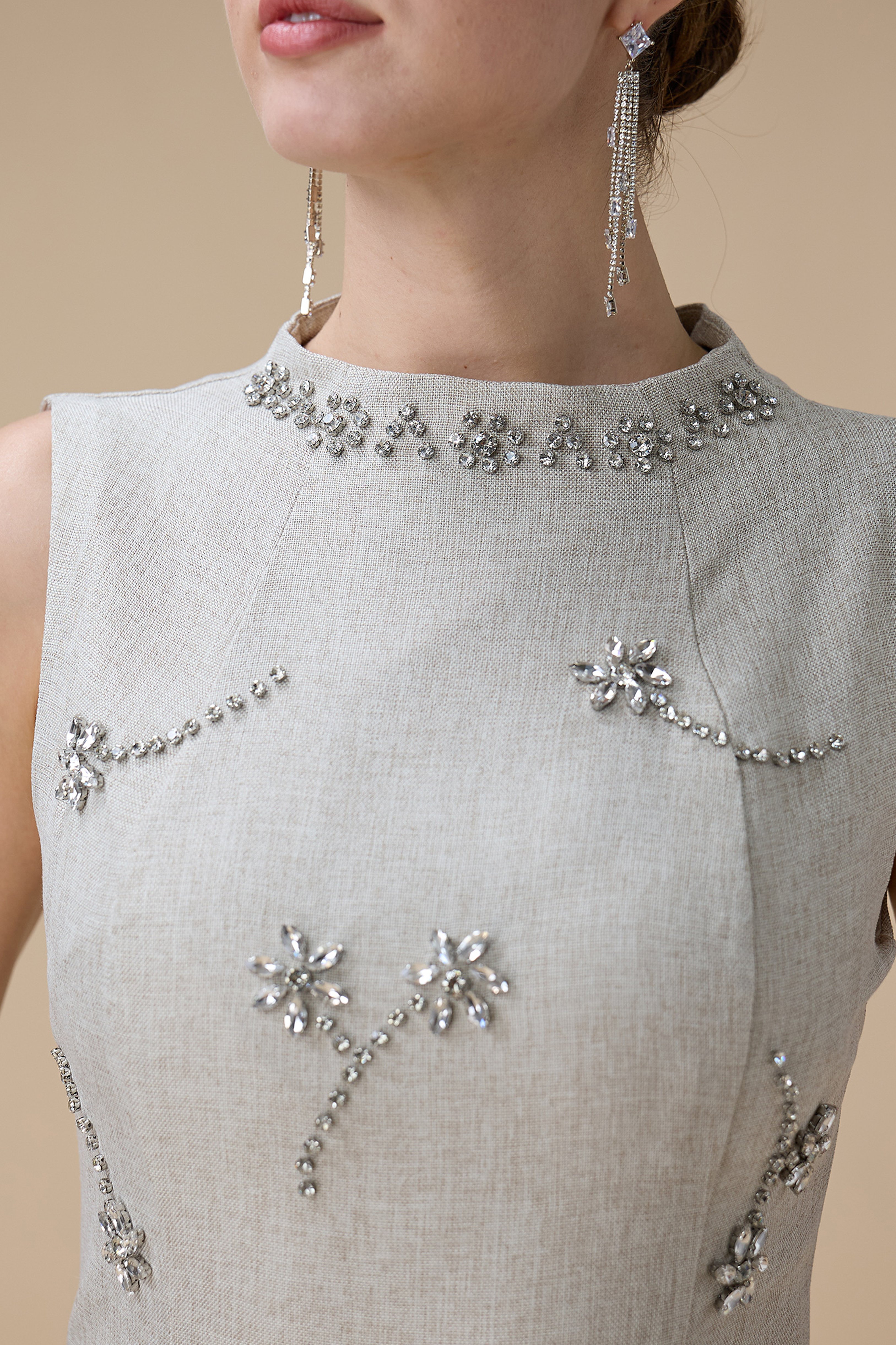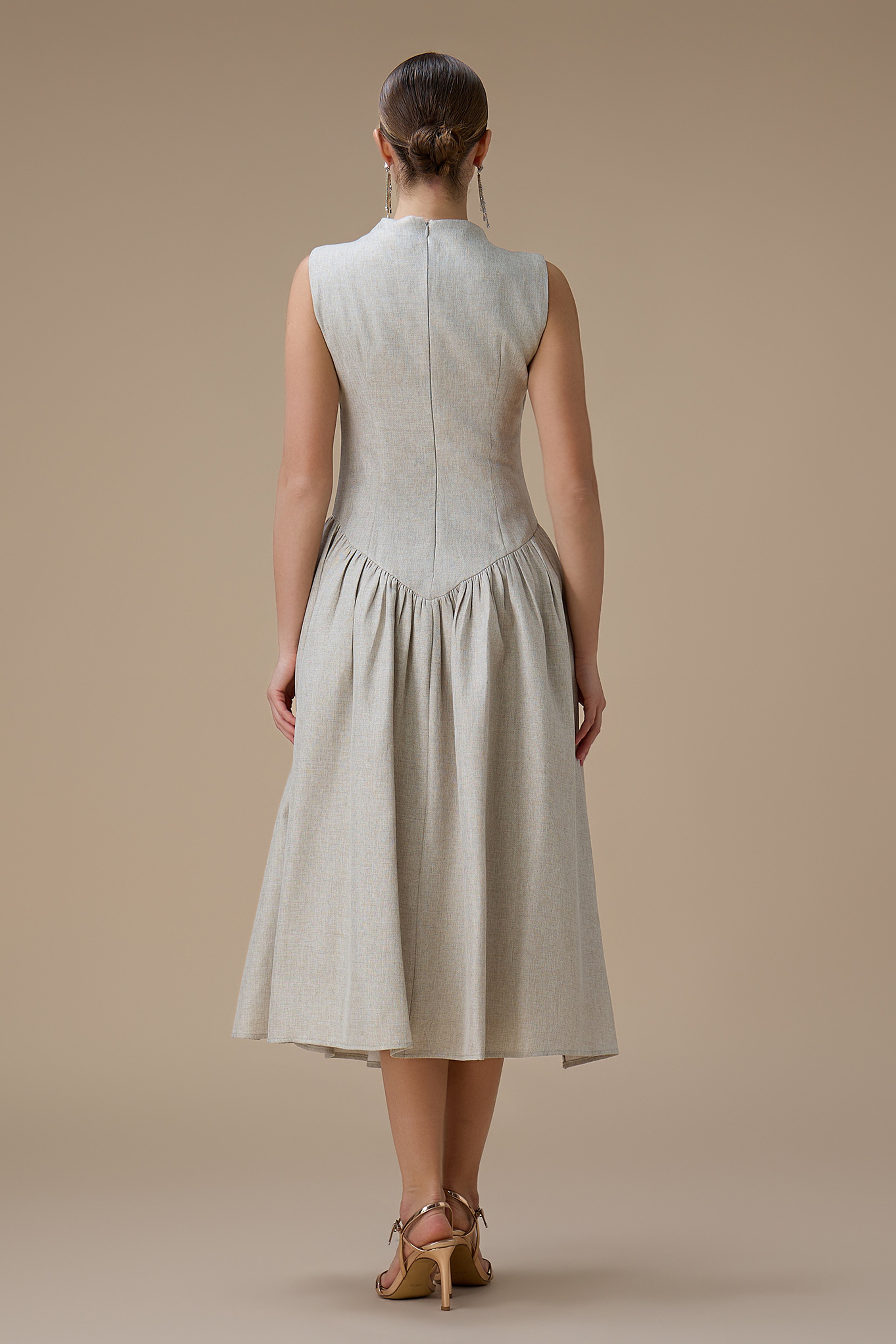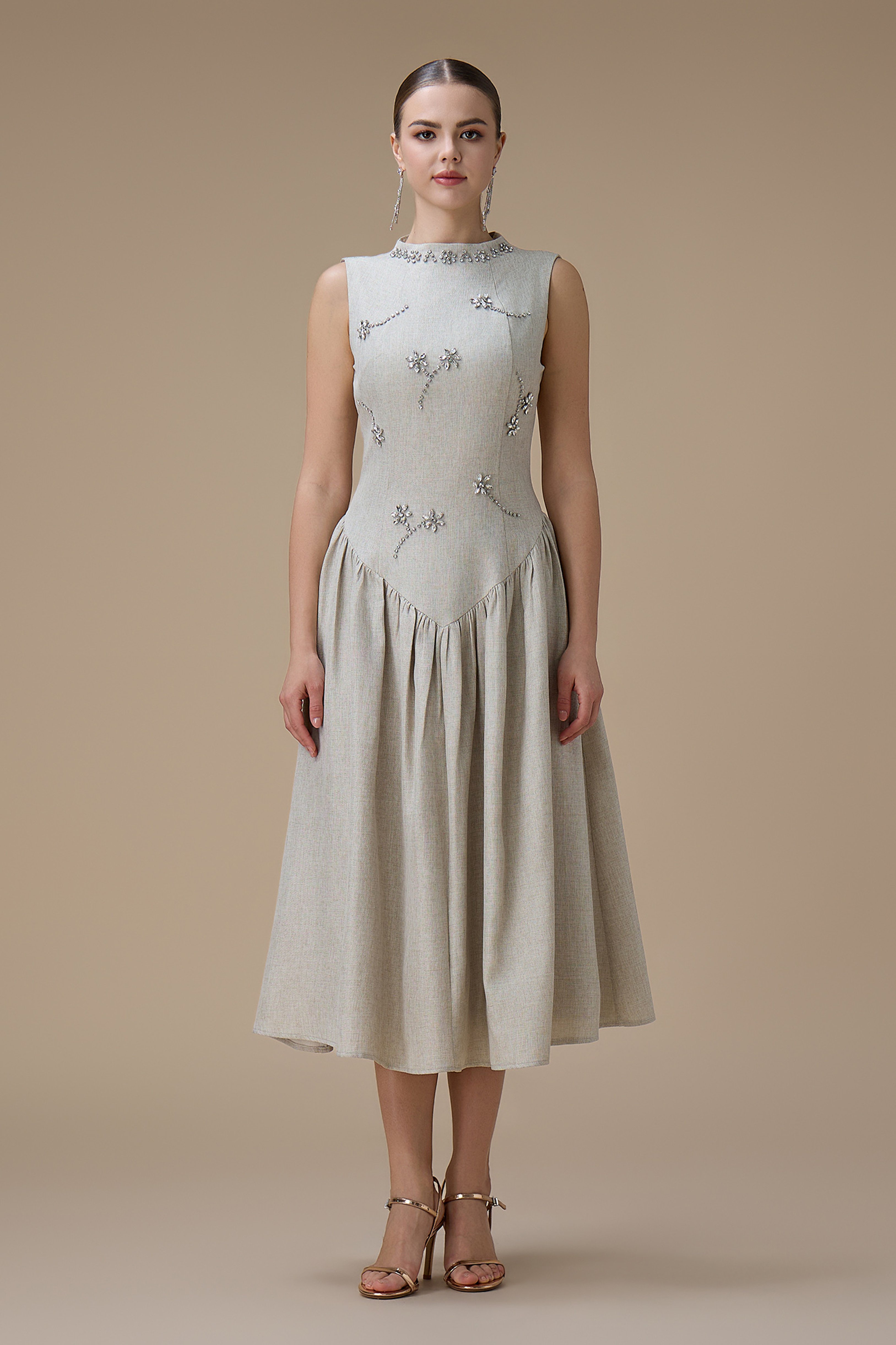 نوع القصة: فستان ميدي أنيق بتطريز ناعم وقصة خصر محددة بياقة عالية