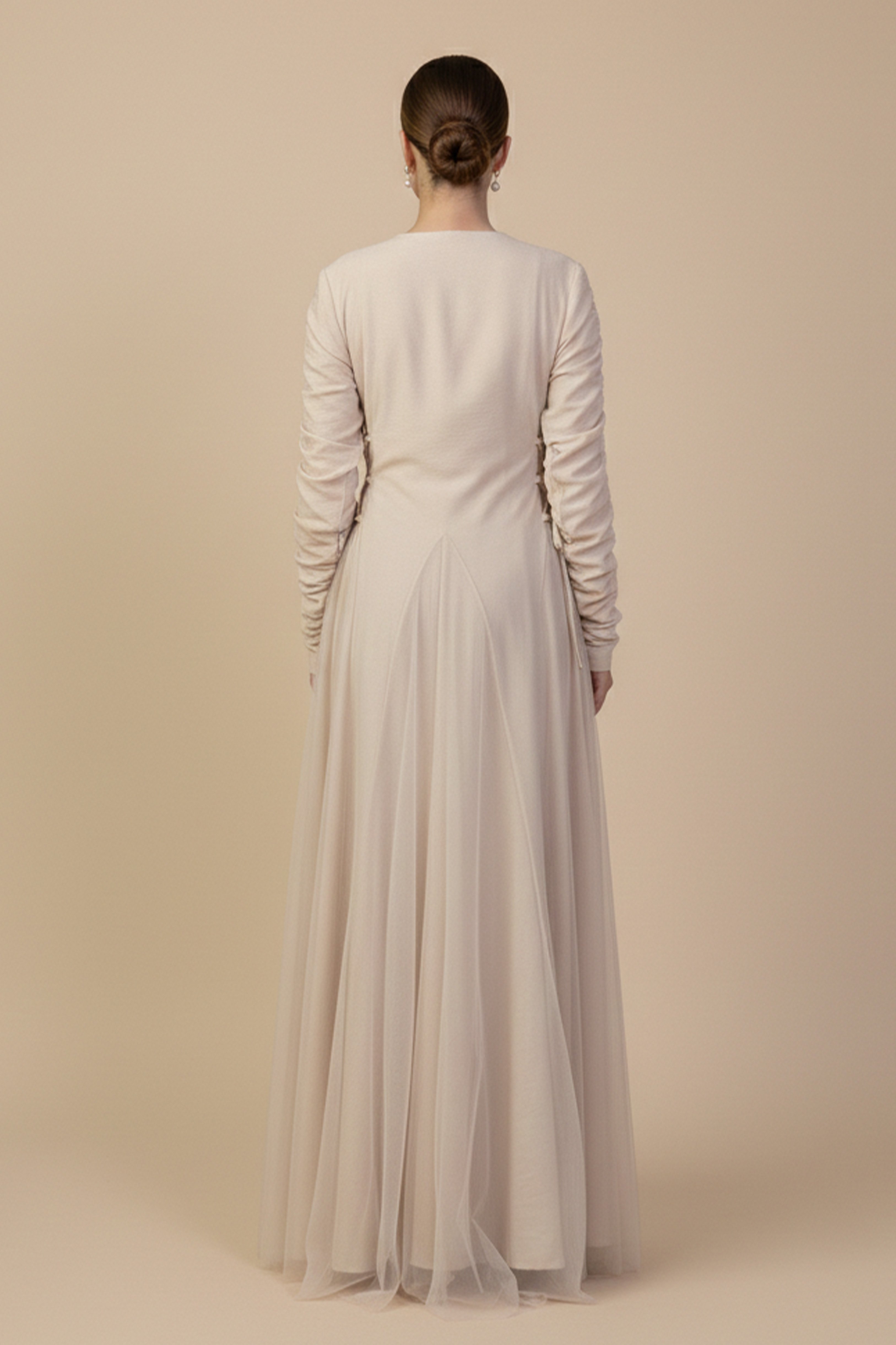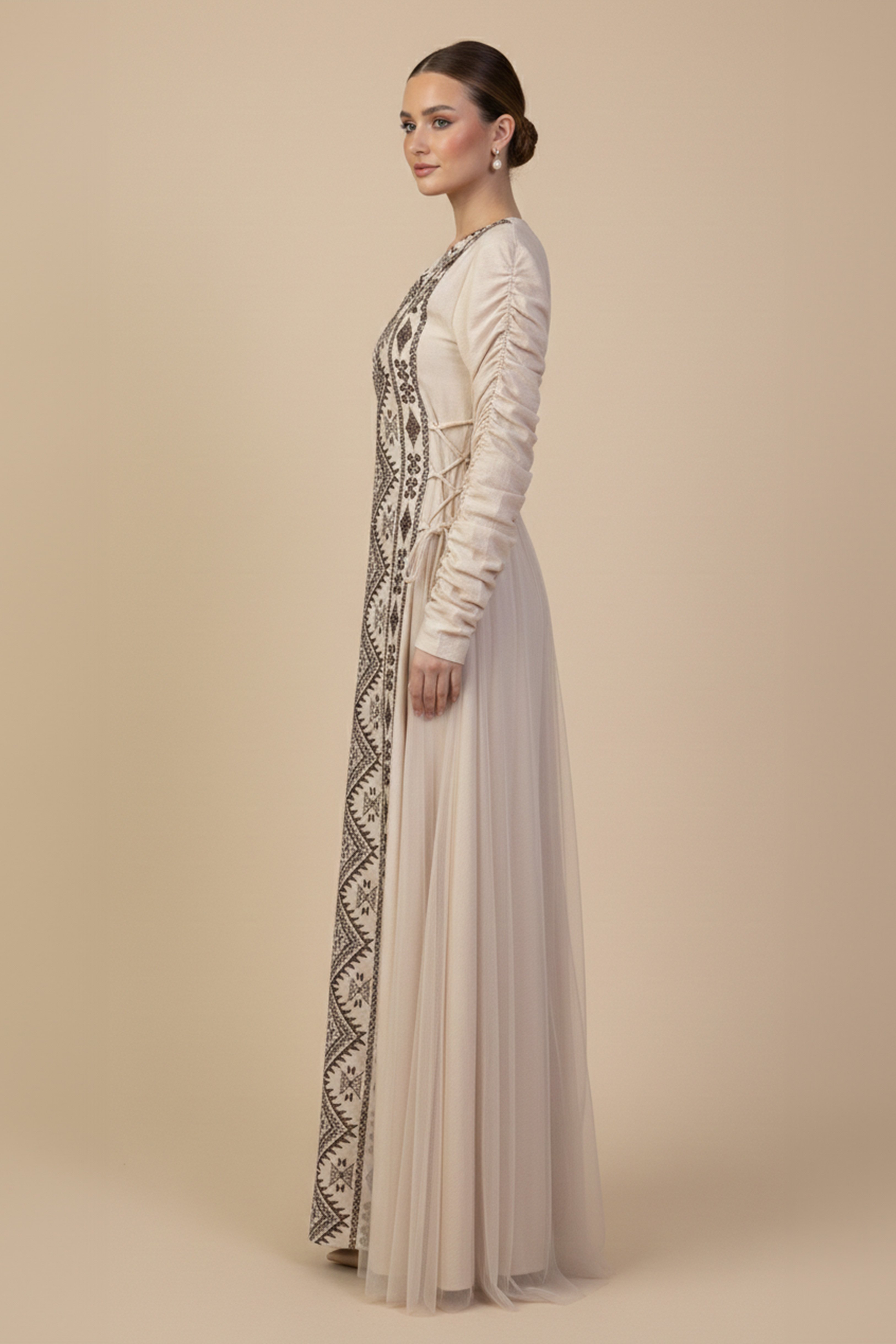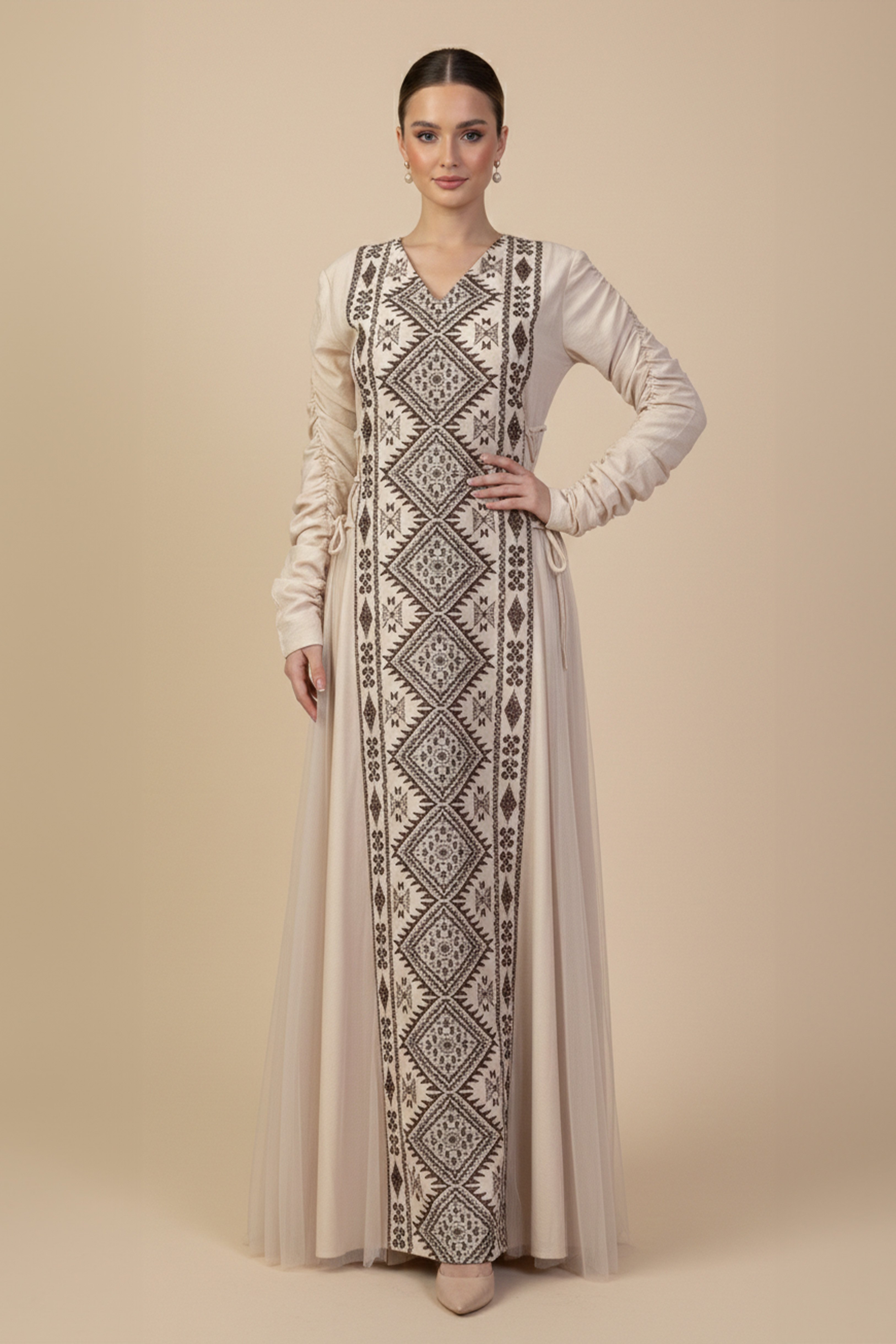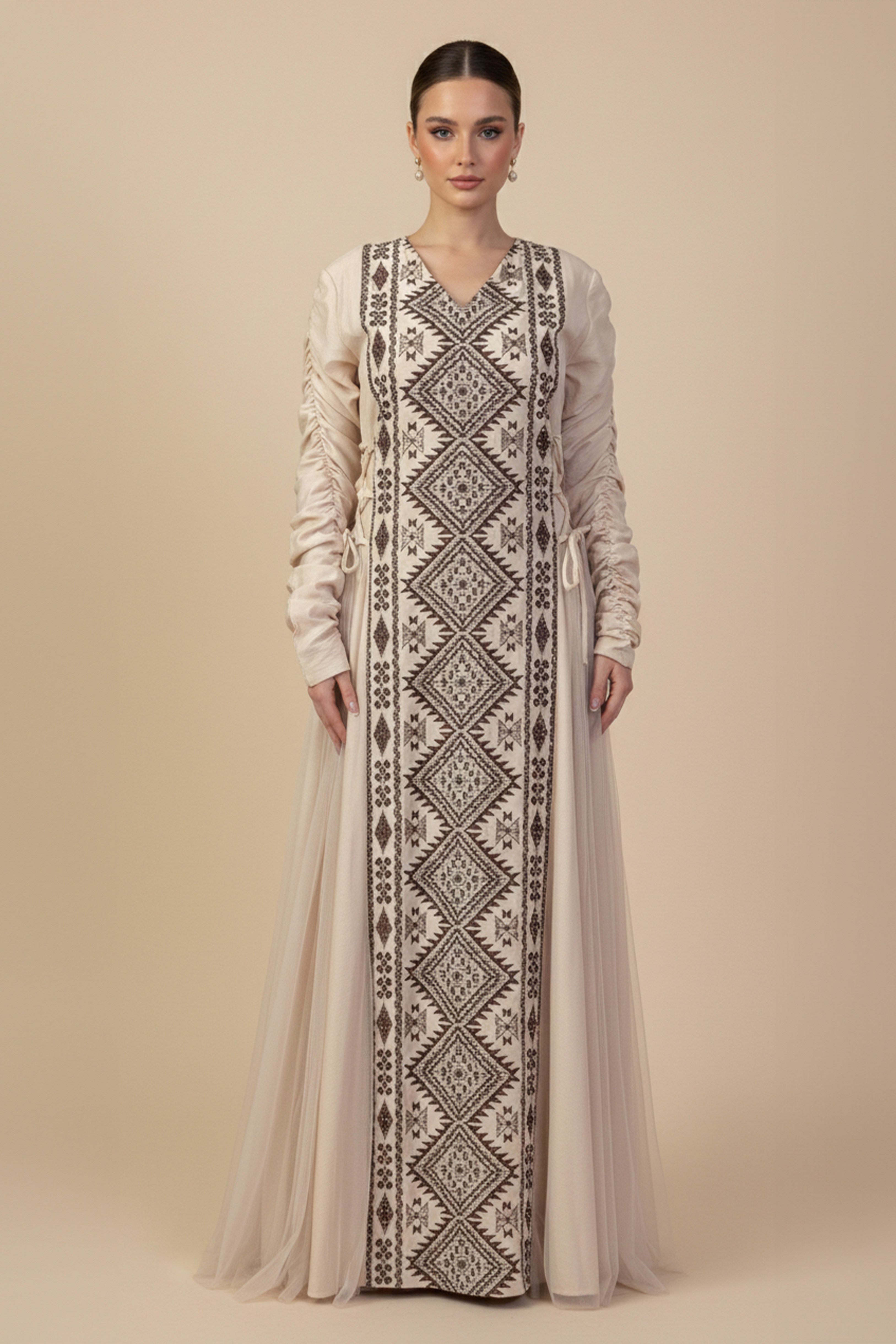 جلابية بيج طويلة بتطريز تراثي