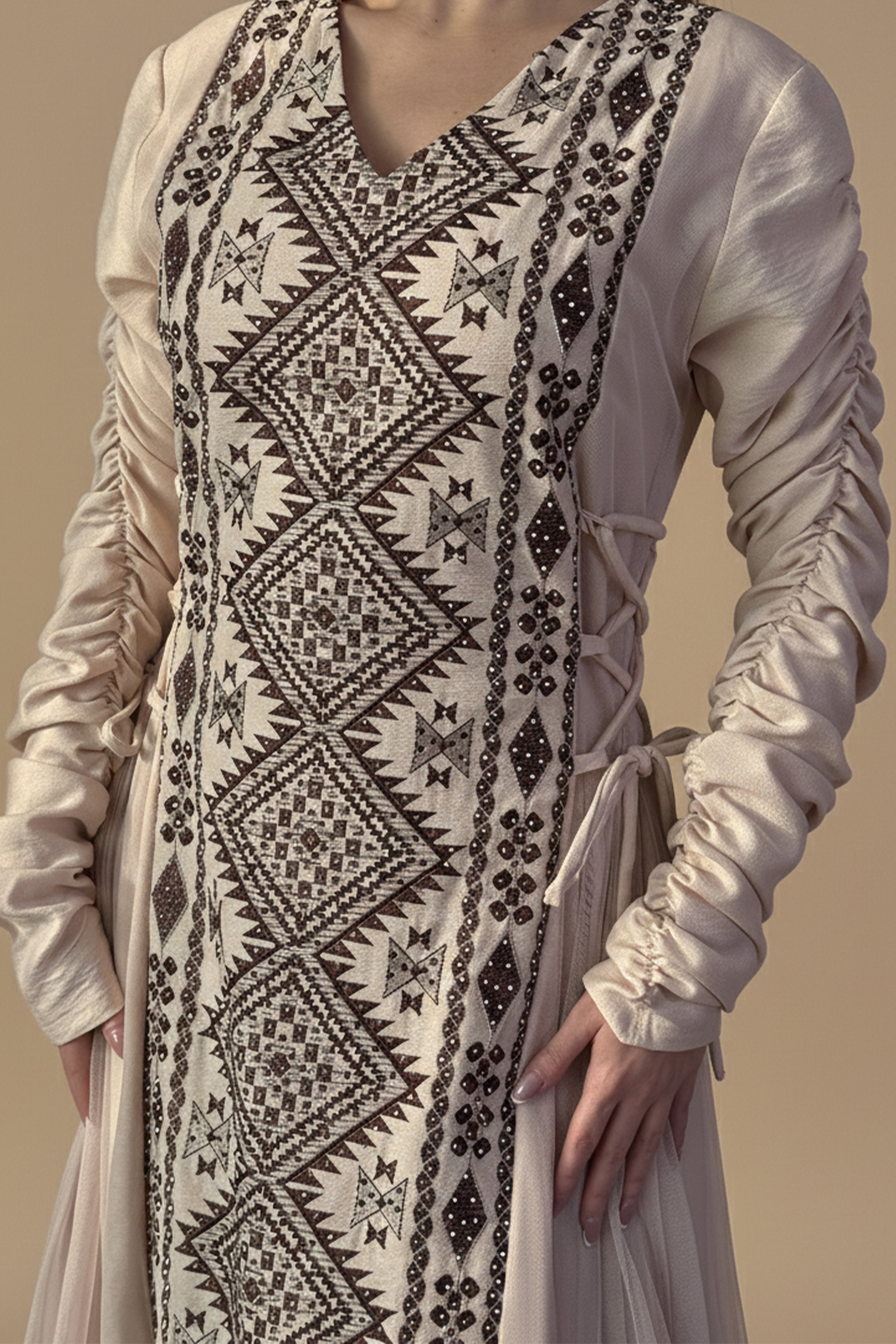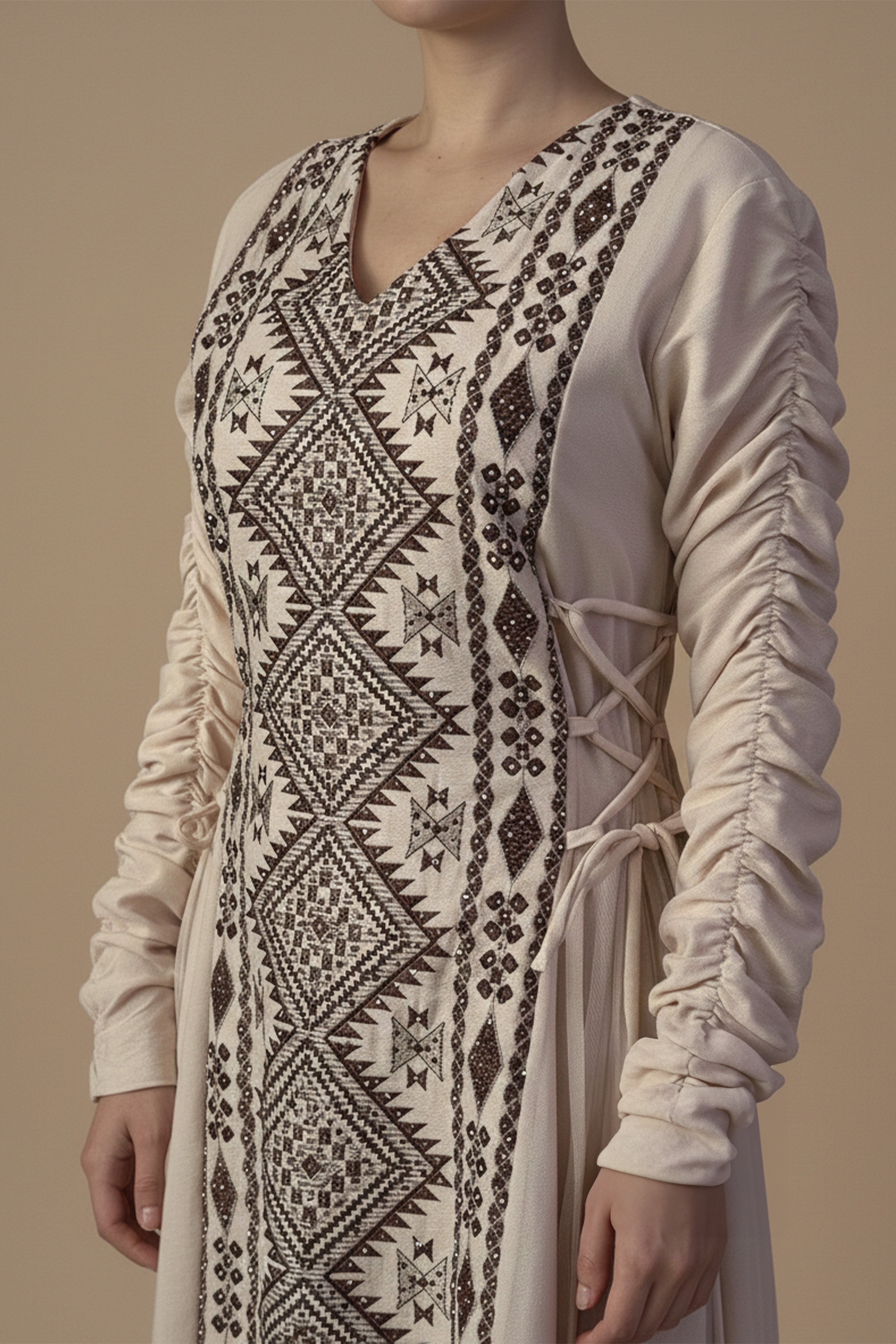 • نوع القصة: جلابية بيج طويلة بتطريز تراثي برباط من الجانب وأكمام طويلة بياقة v