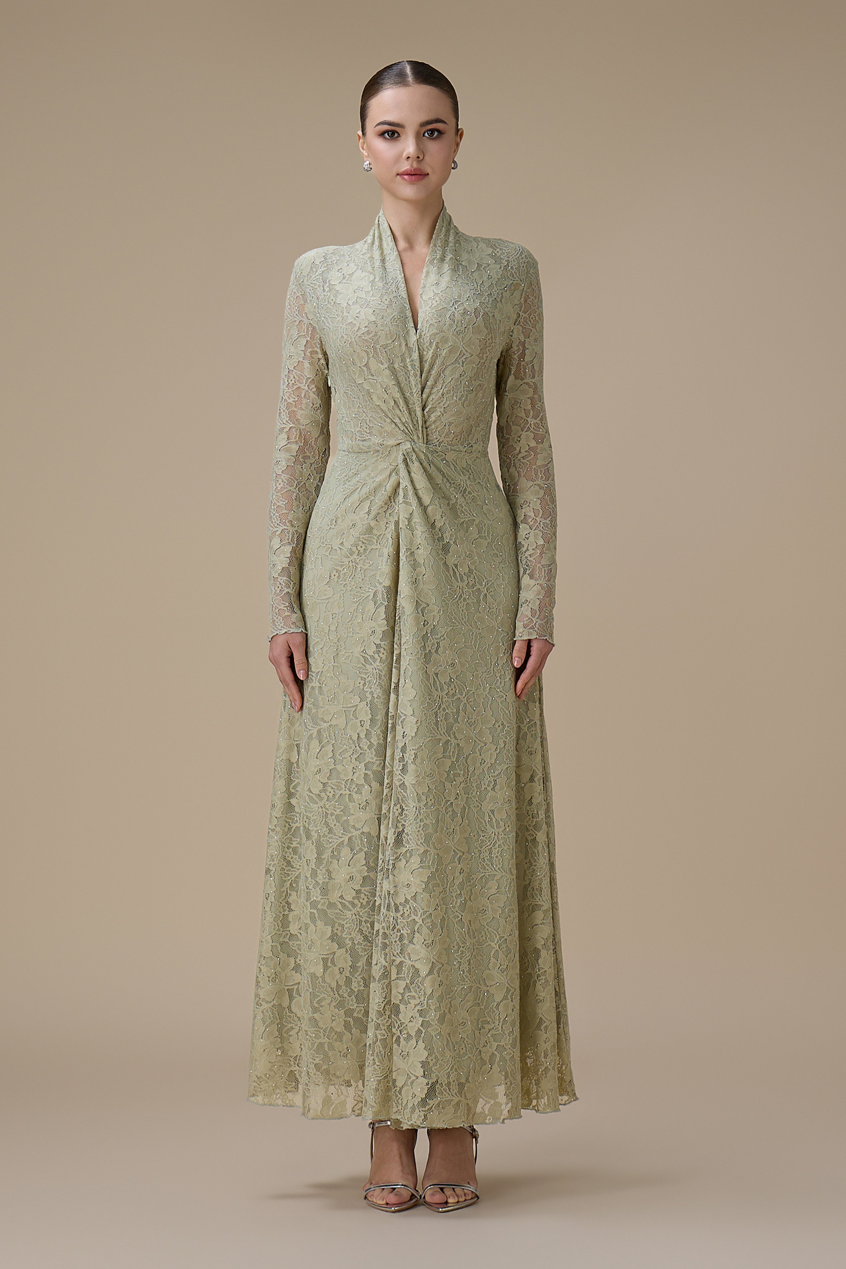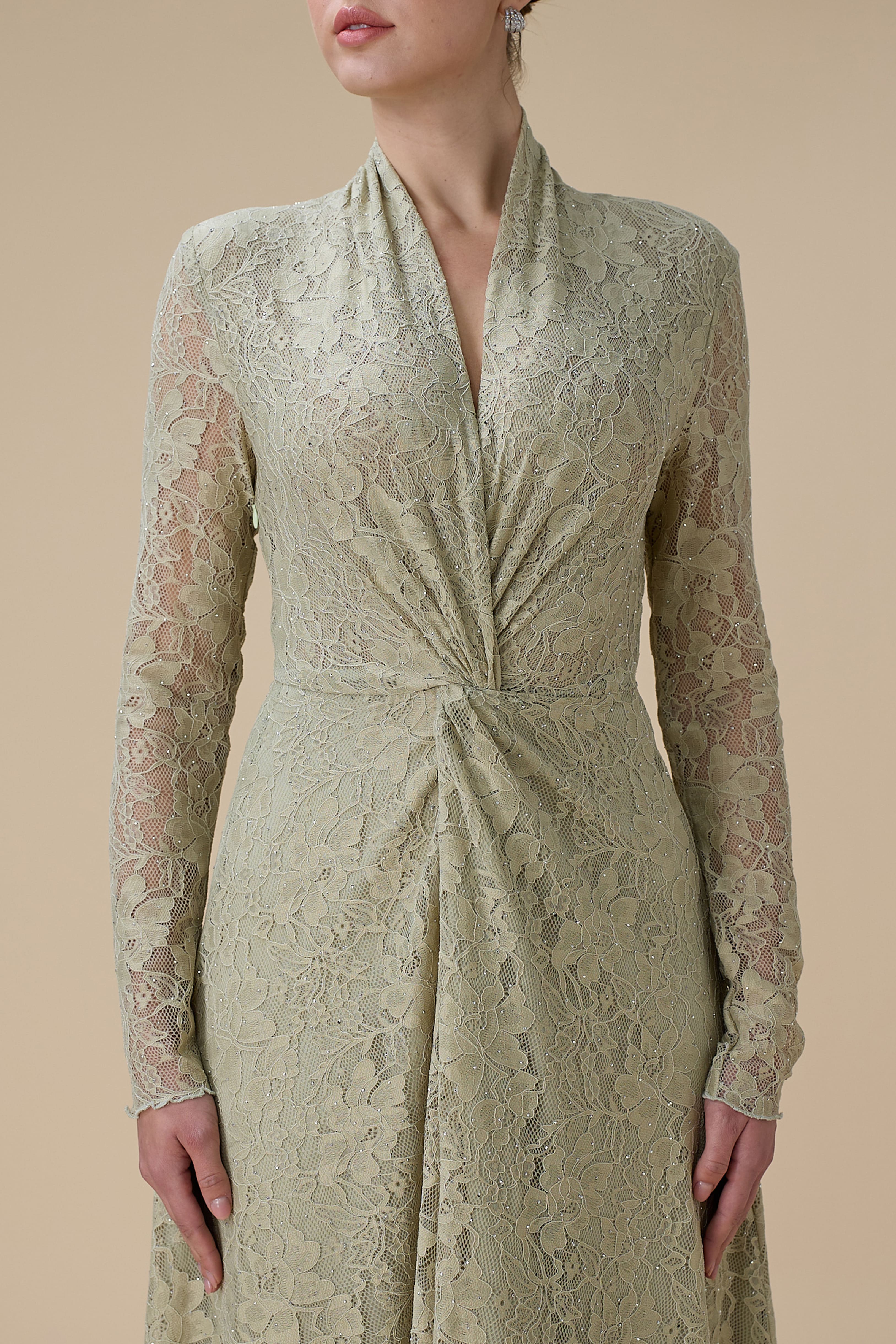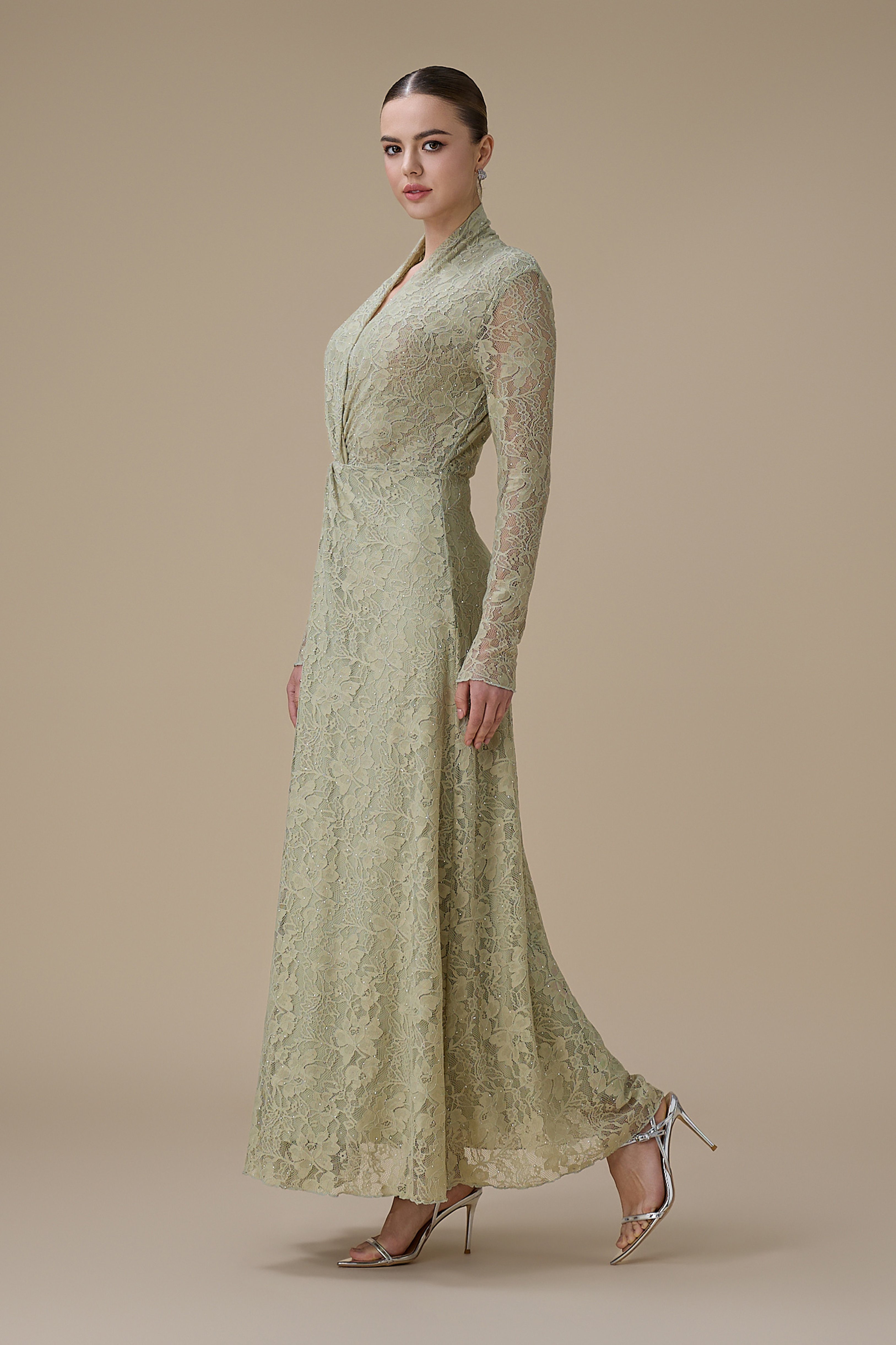 نوع القصة: فستان أخضر فاتح طويل دانتيل مع لفّة أنيقة وياقة مفتوحة بشكل V وأكمام طويلة