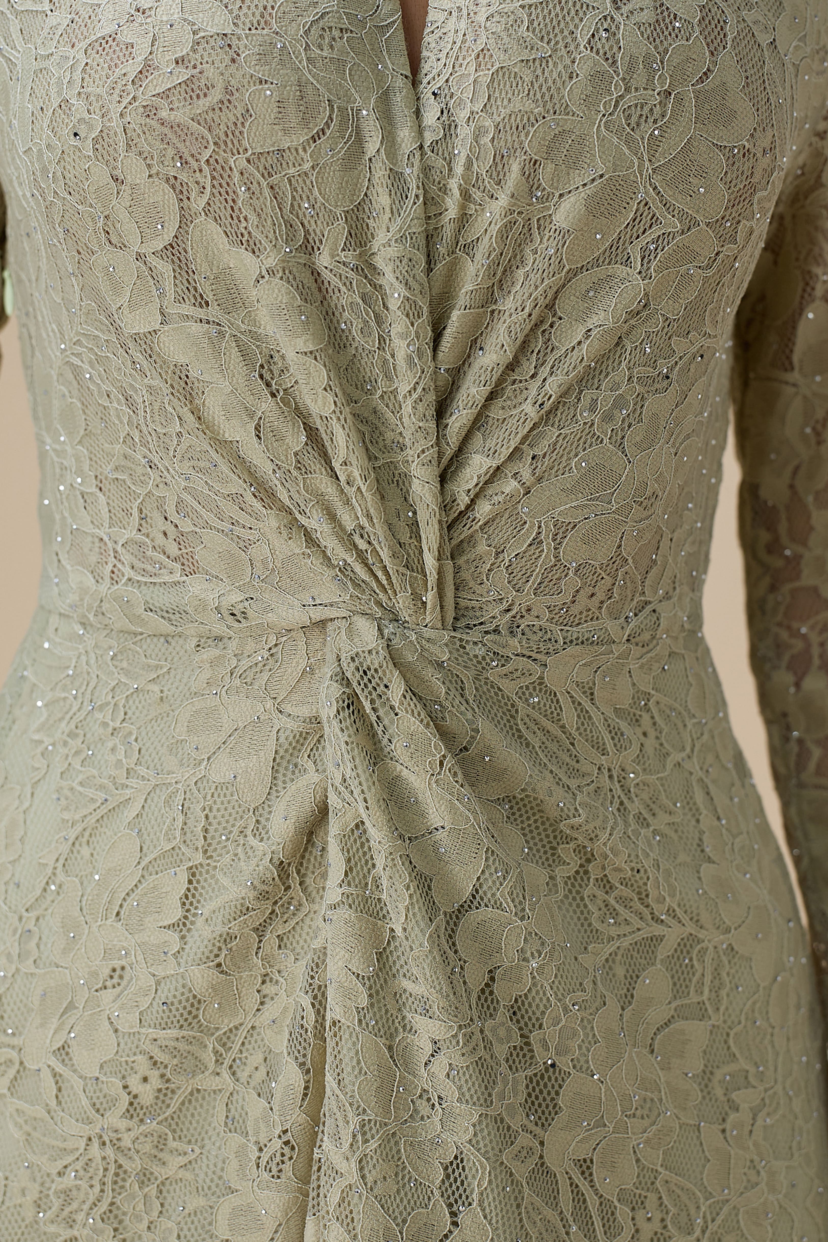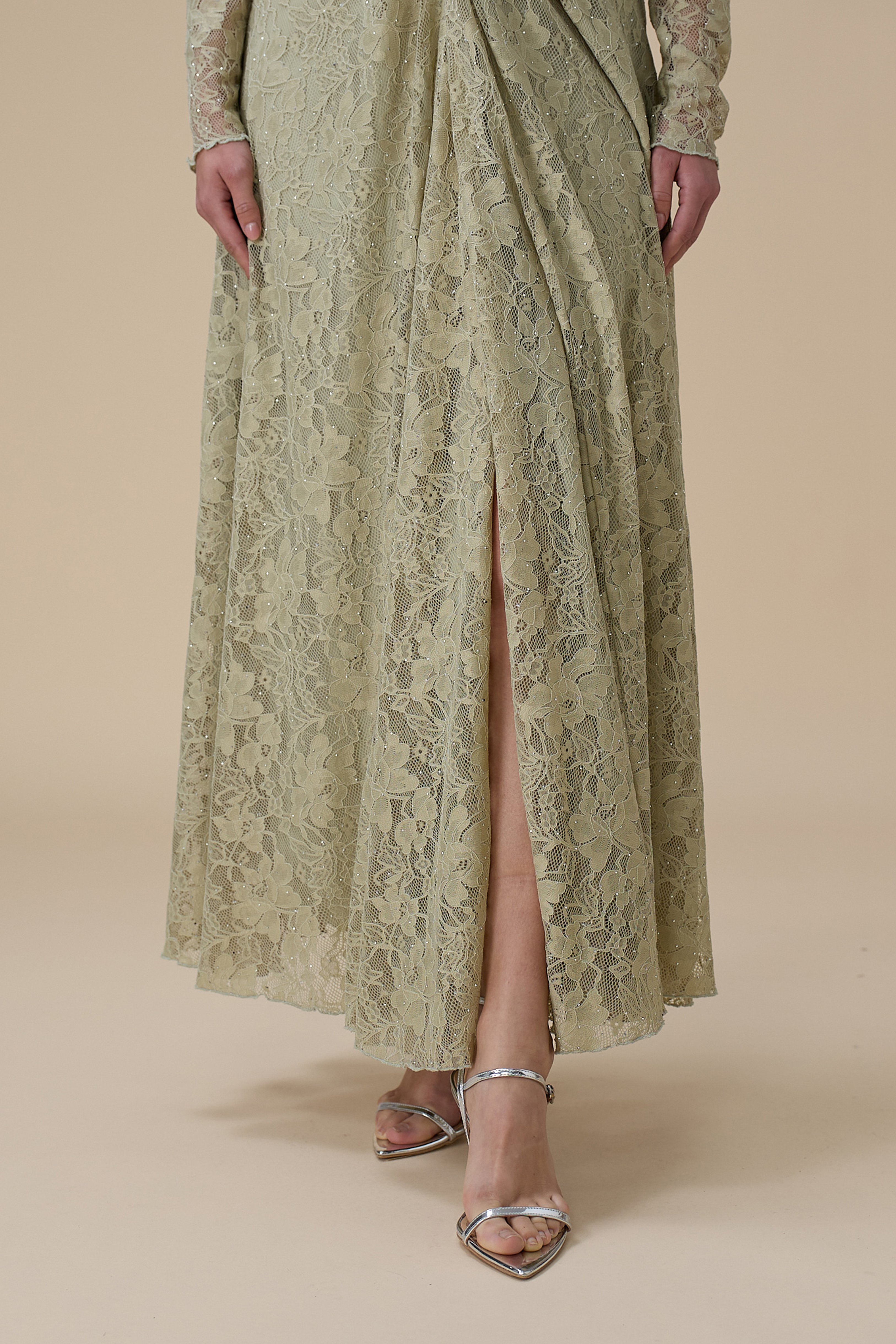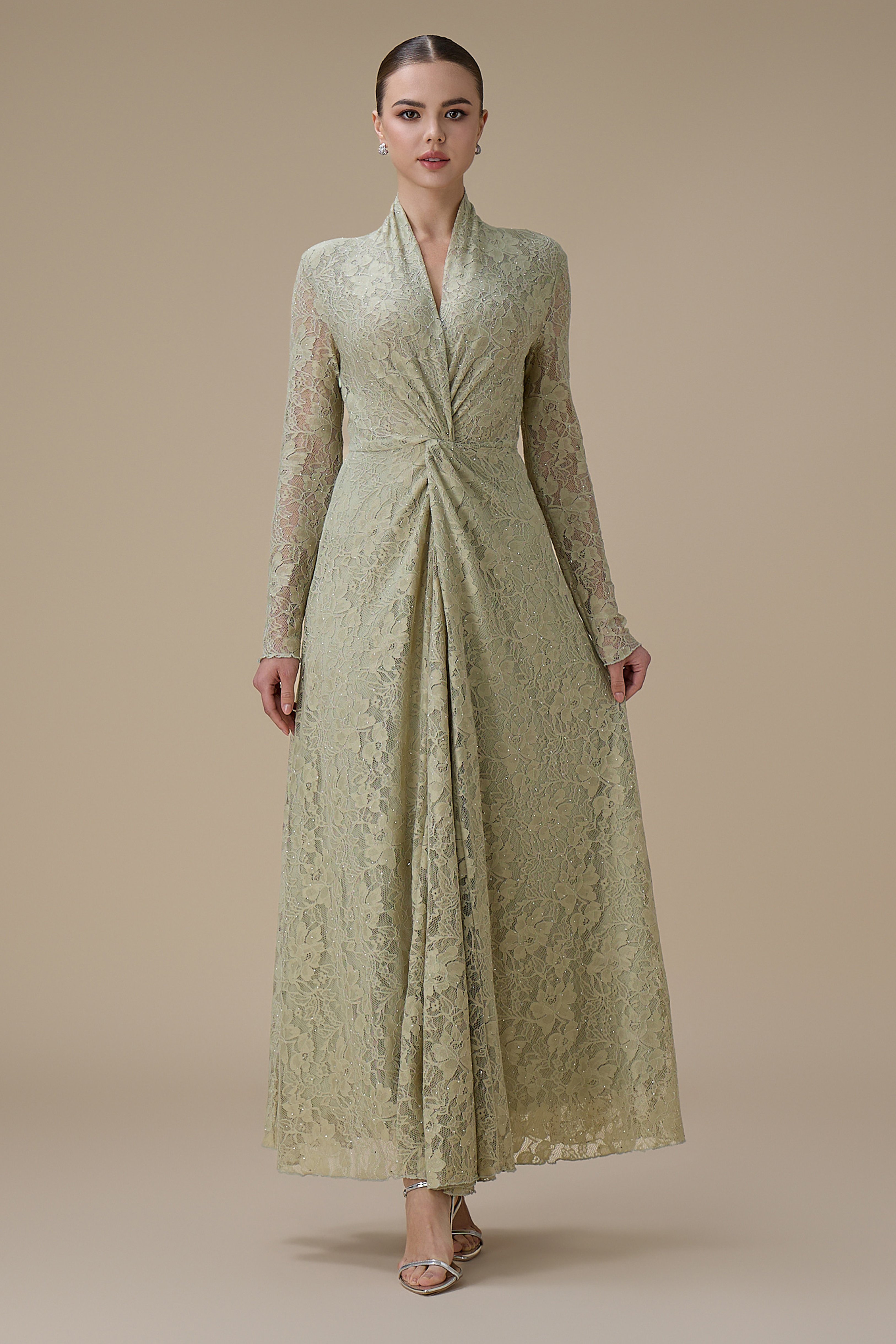 نوع القصة: فستان أخضر فاتح طويل دانتيل مع لفّة أنيقة وياقة مفتوحة بشكل V وأكمام طويلة
