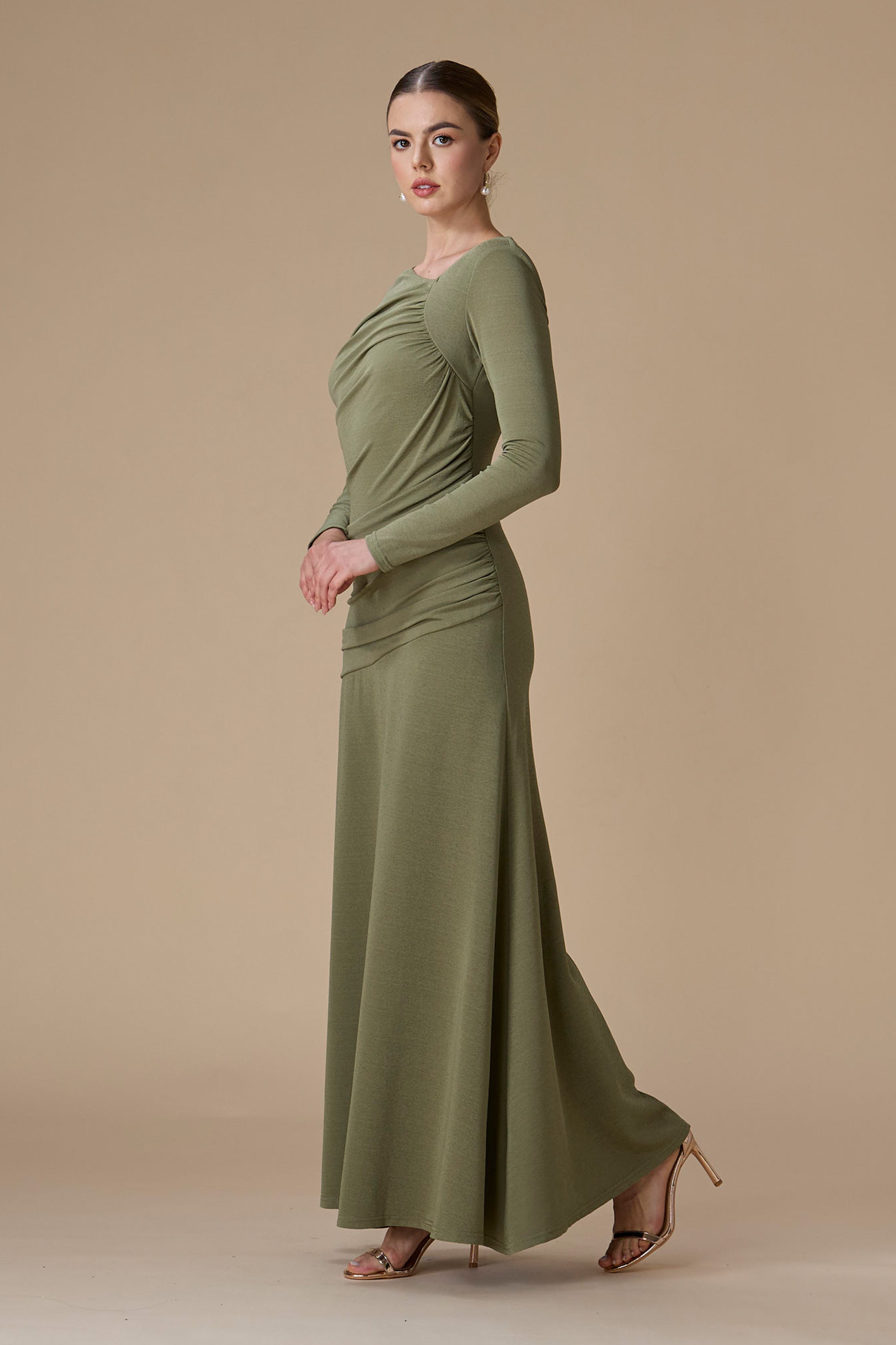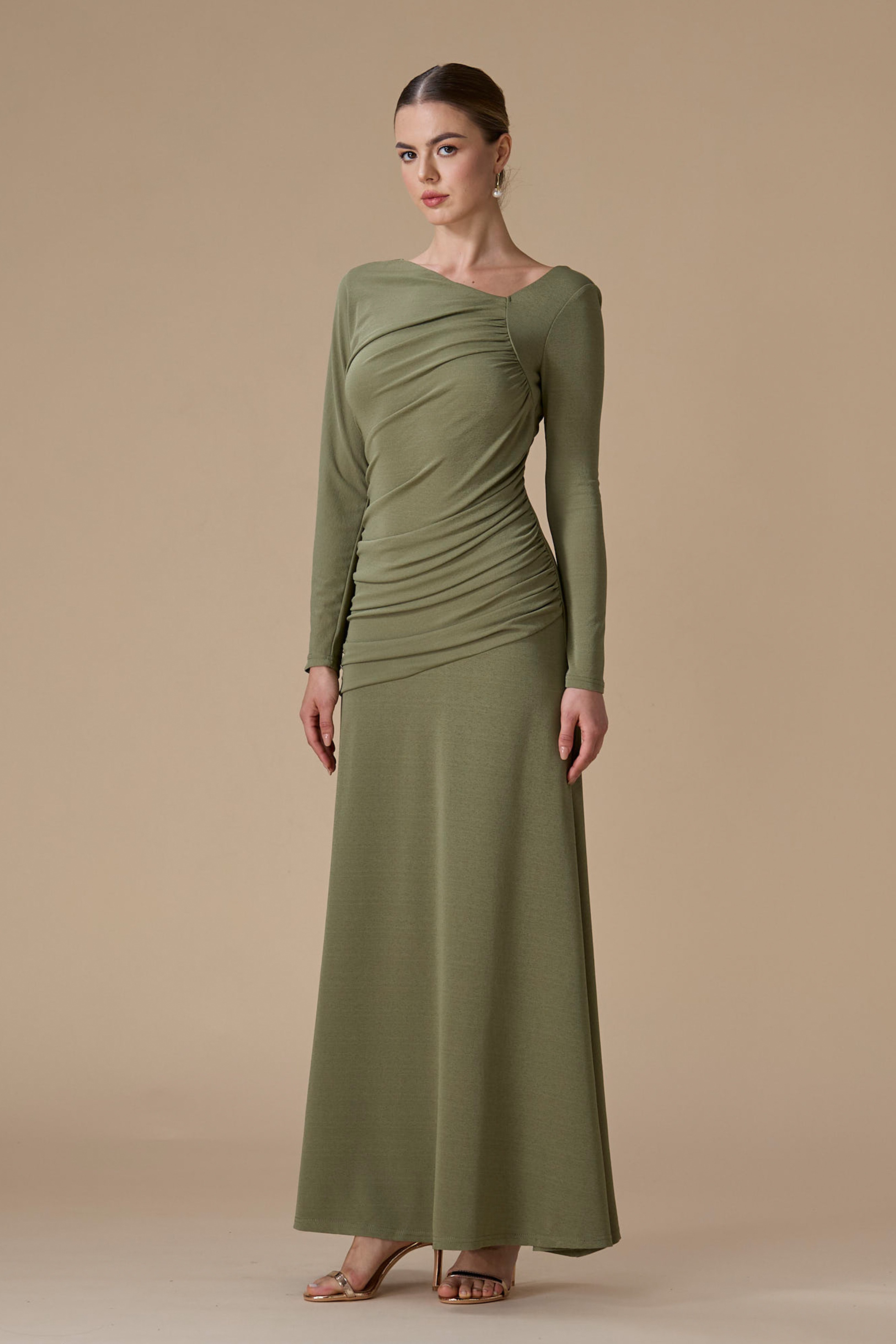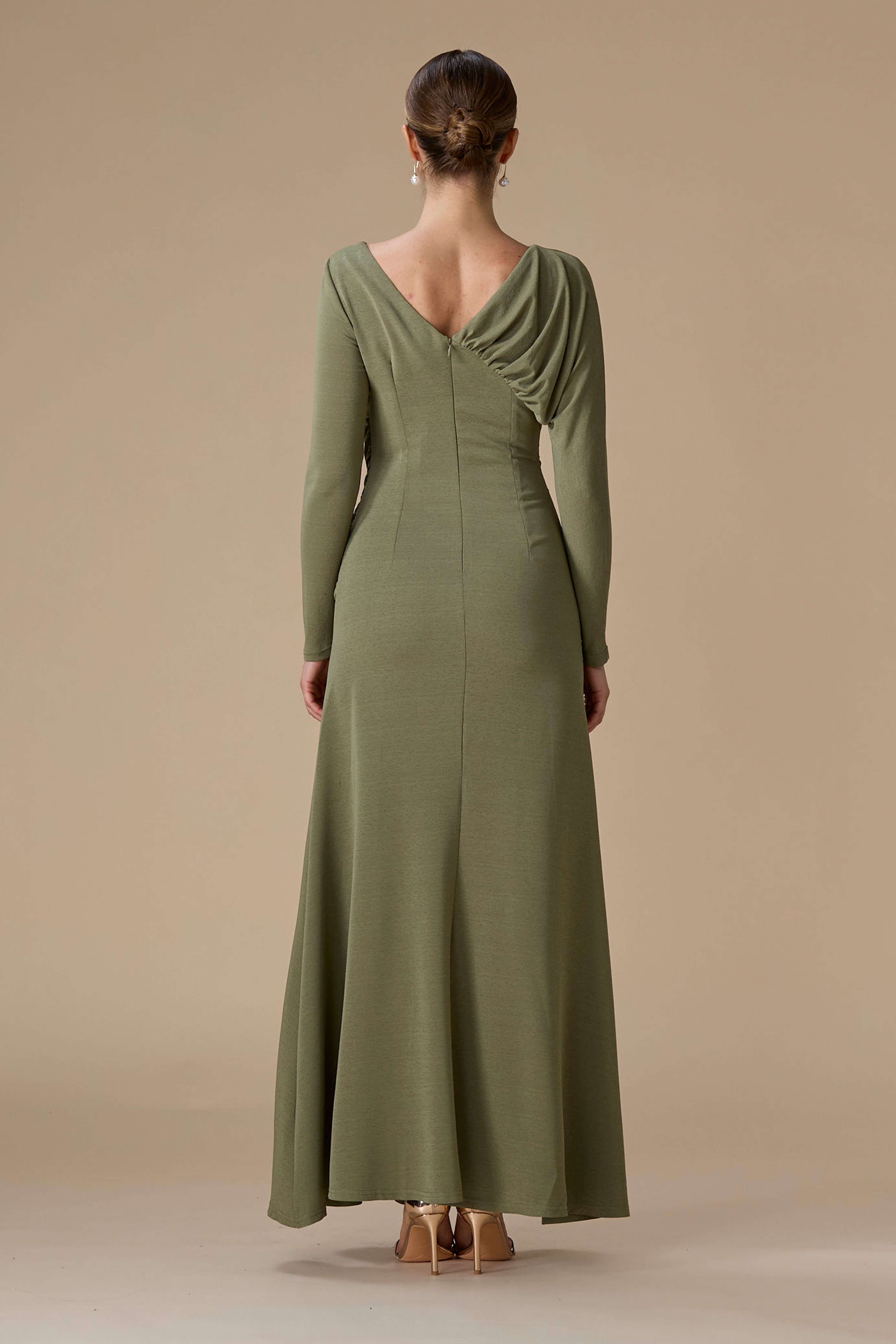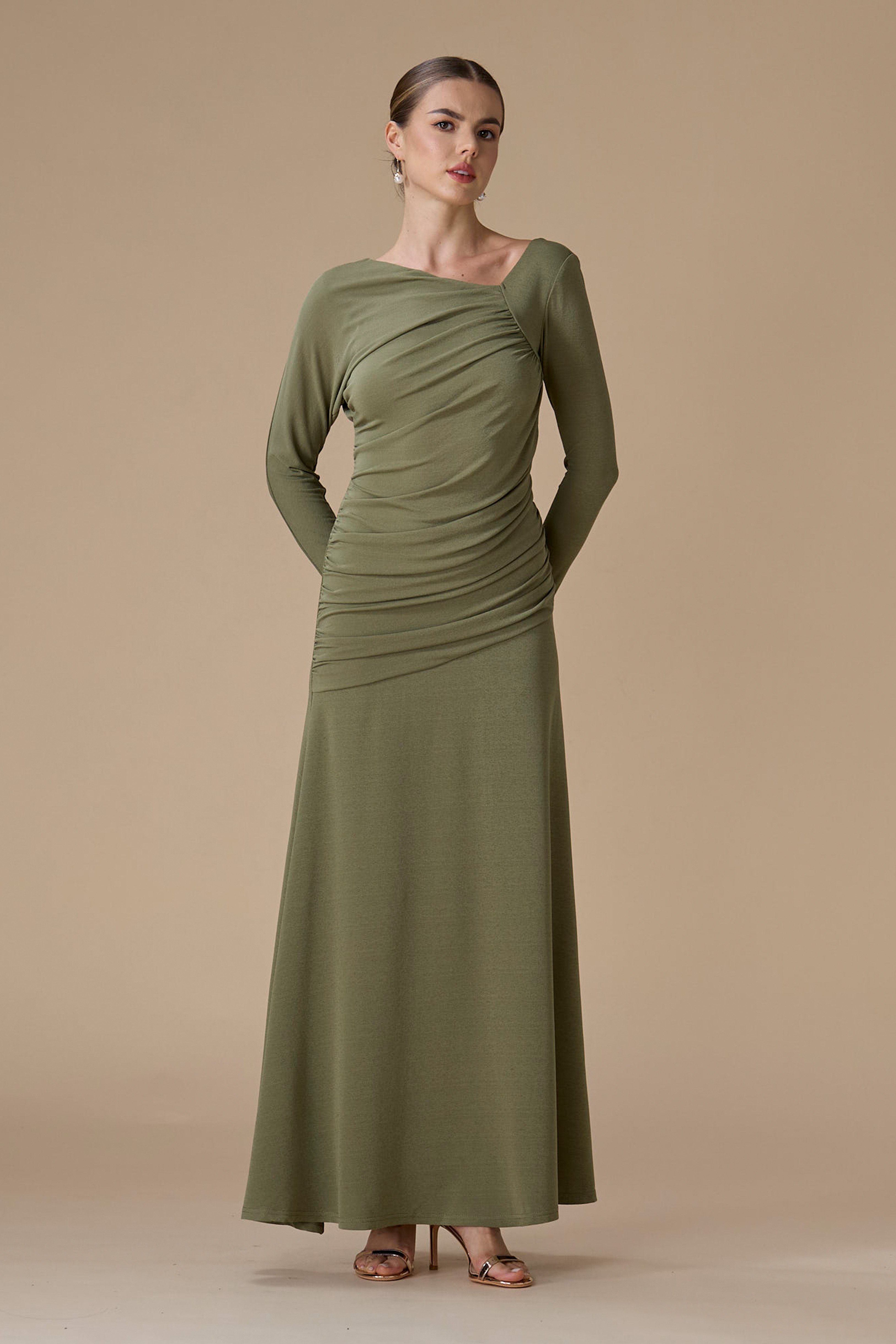 - نوع القصة: فستان أخضر درابيه طويل بقصة مستقيمة بياقة غير متماثلة وأكمام طويلة ضيقة