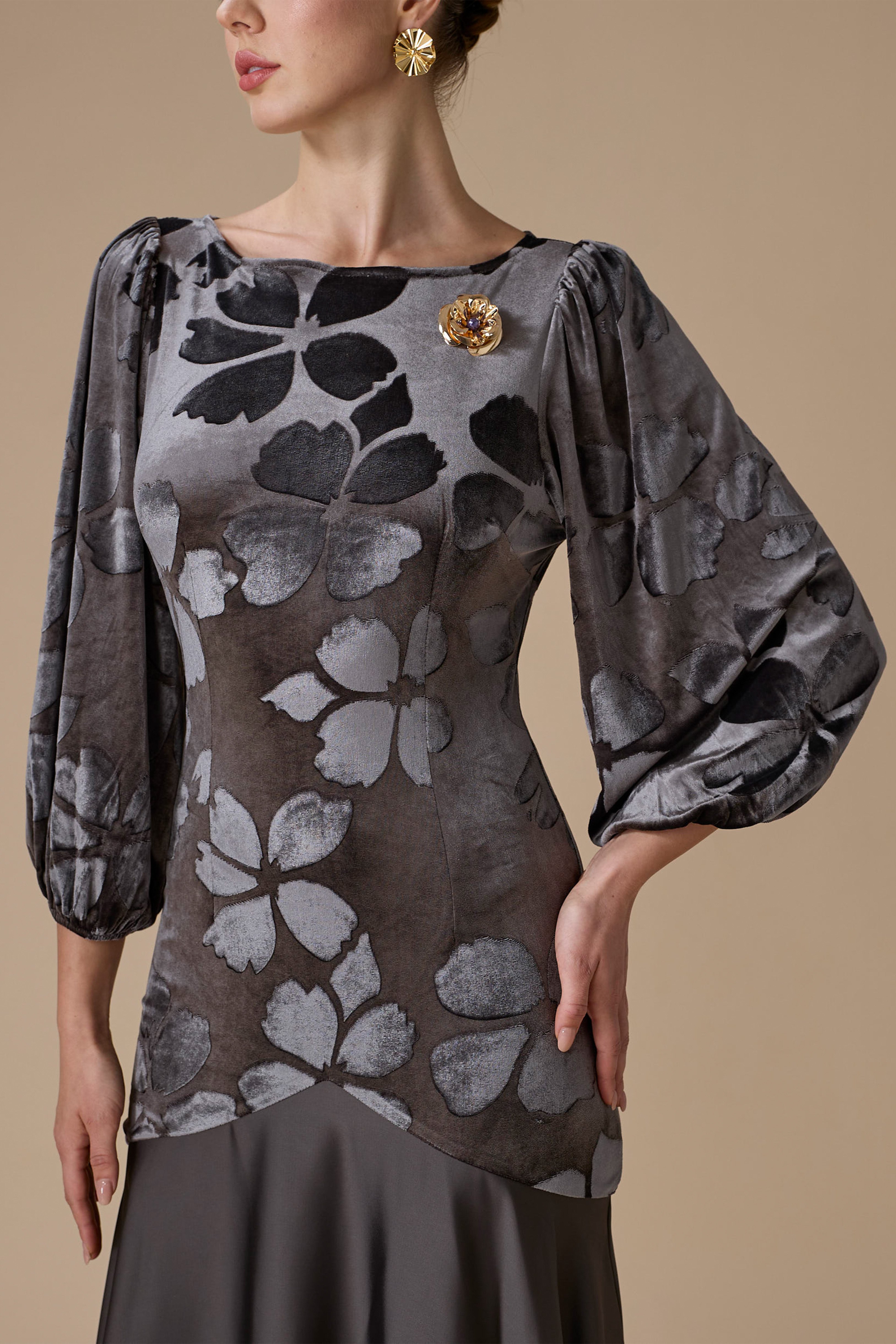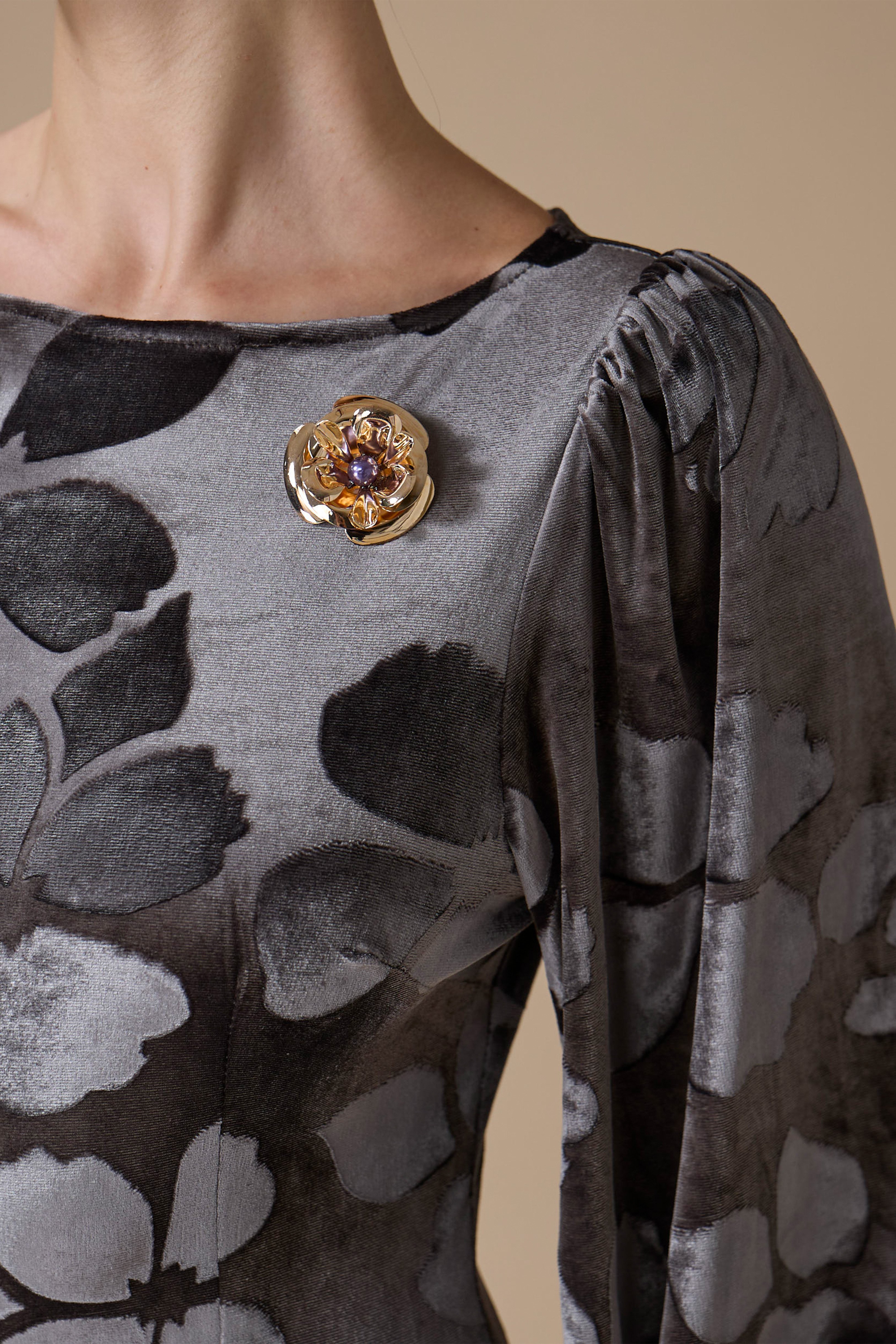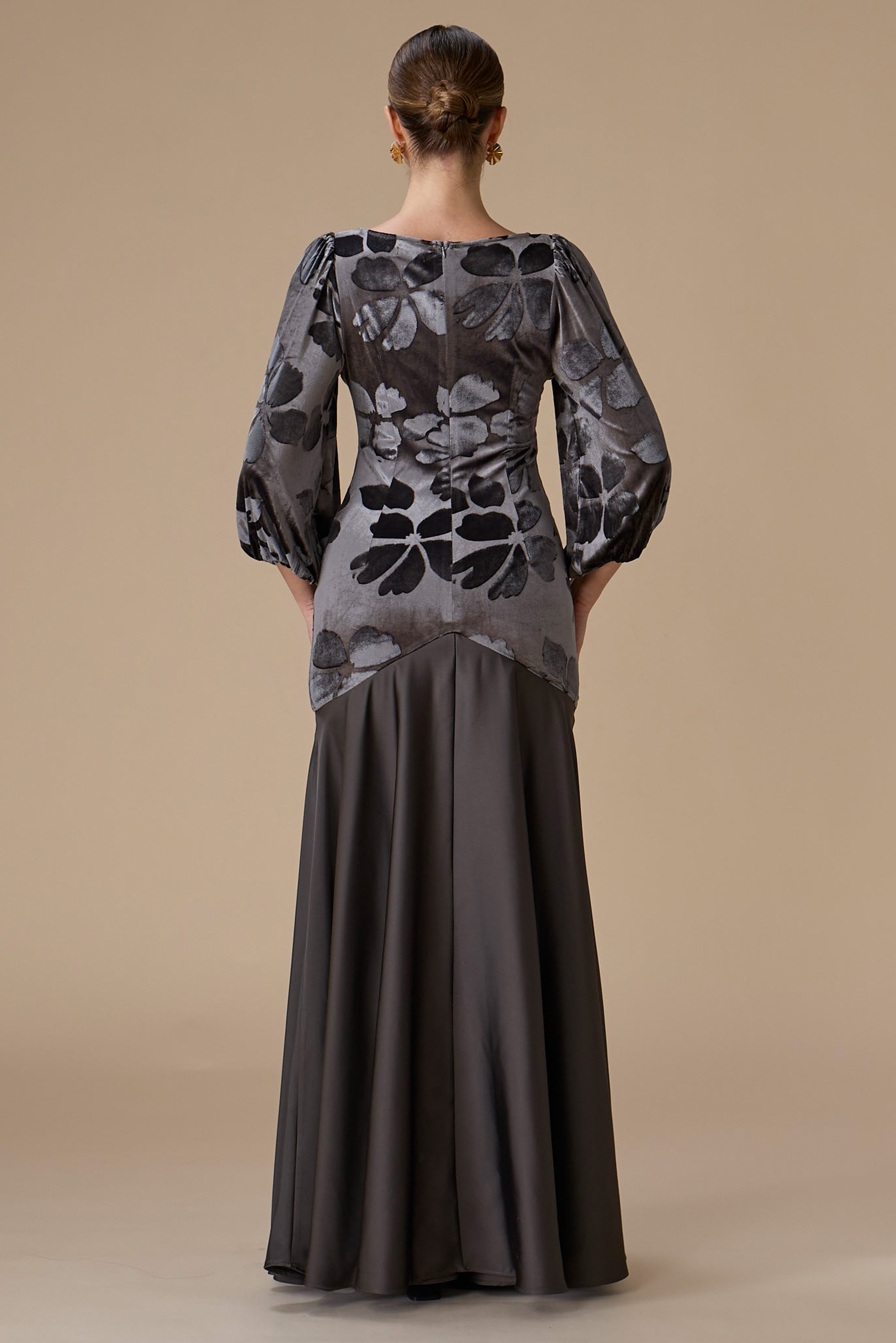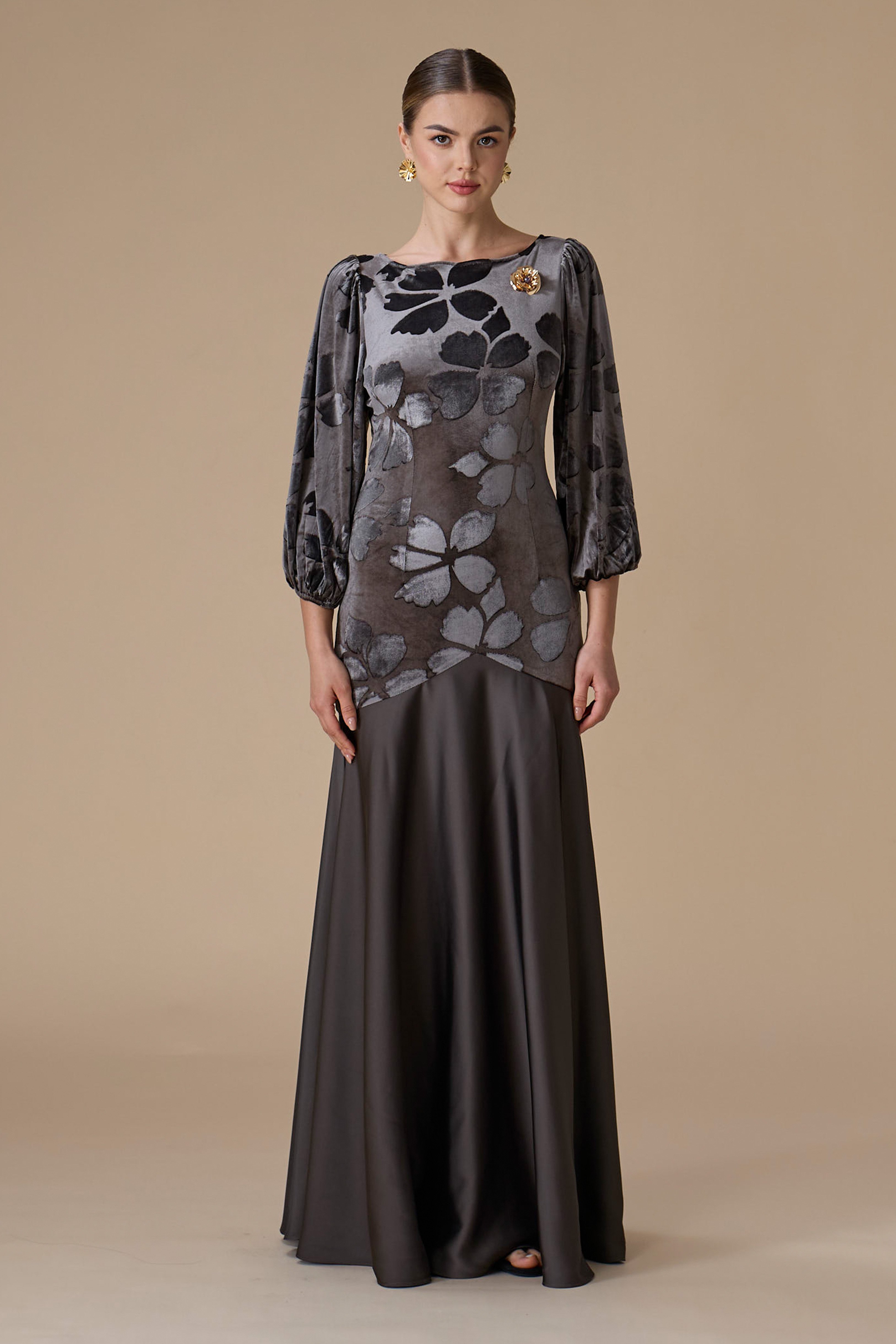 فستان طويل رمادي من المخمل بنقوش زهرية، بياقة مستديرة وأكمام طويلة وواسعة مع خصر مخصّر وتمدد مريح، مزين ببروش