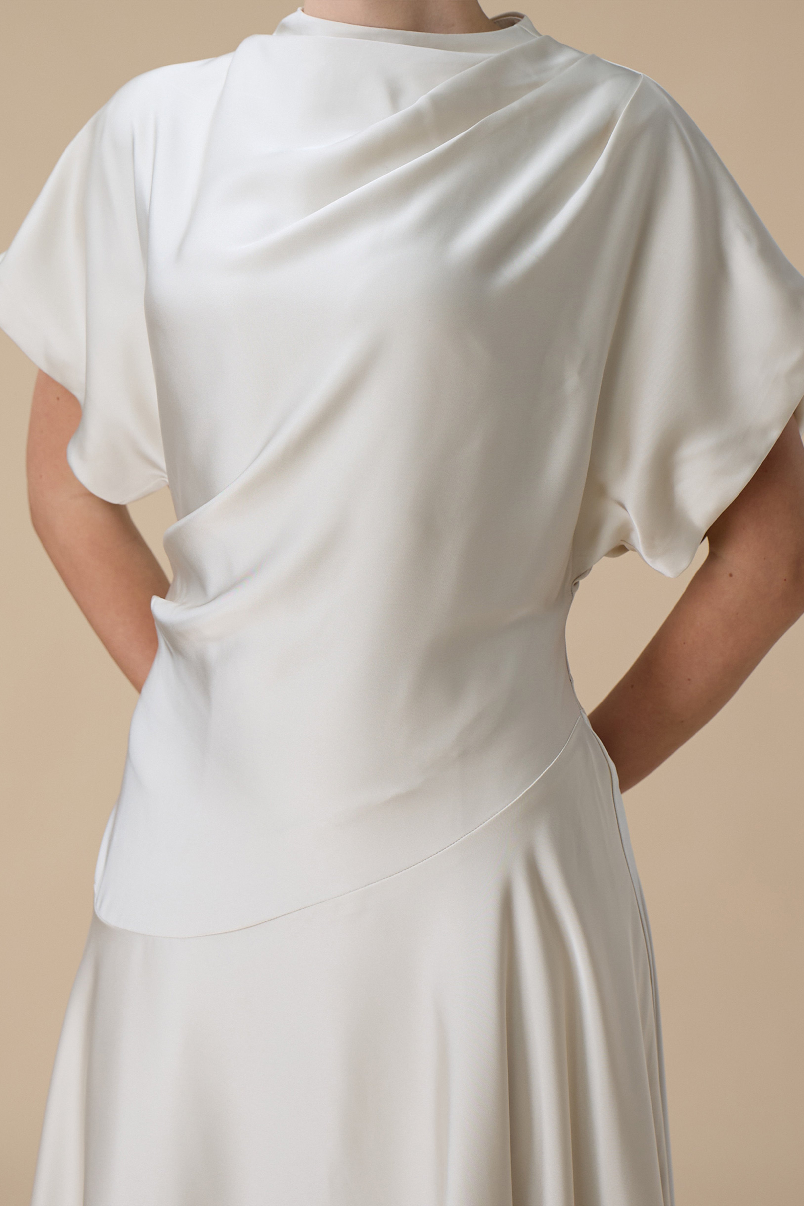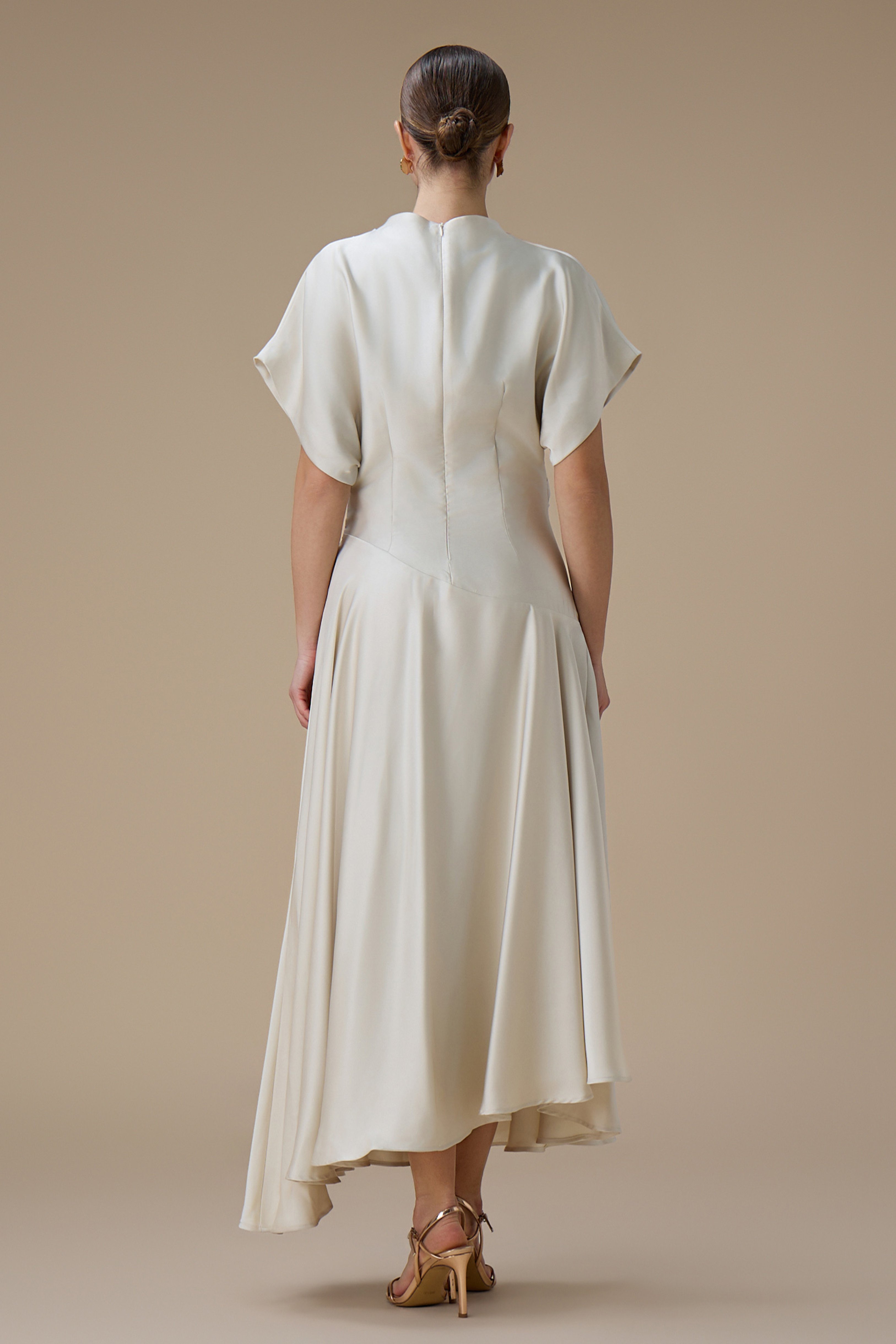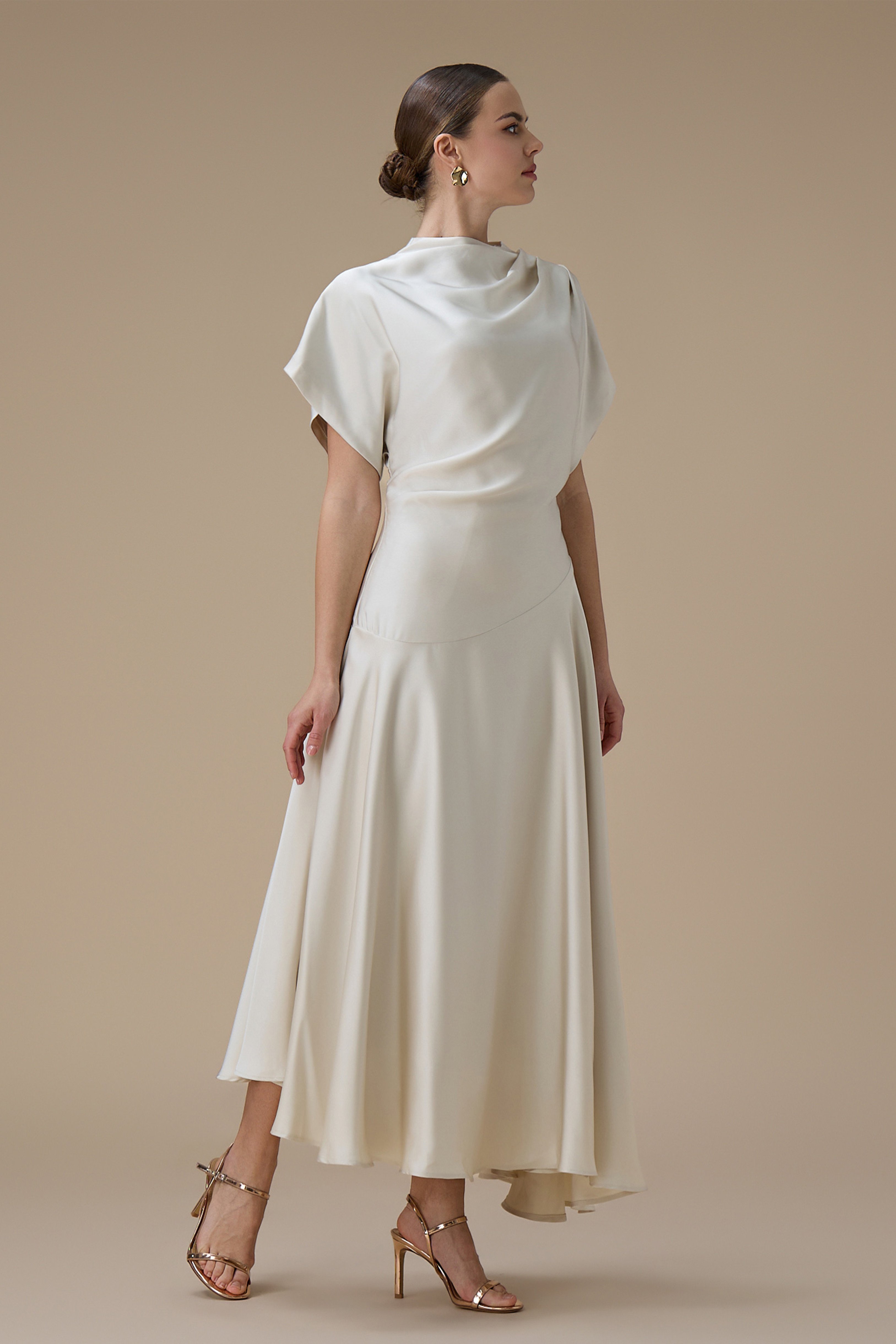 نوع القصة: فستان سكري ميدي بقصة انسيابية وأكمام قصيرة واسعة بياقة مرتفعة