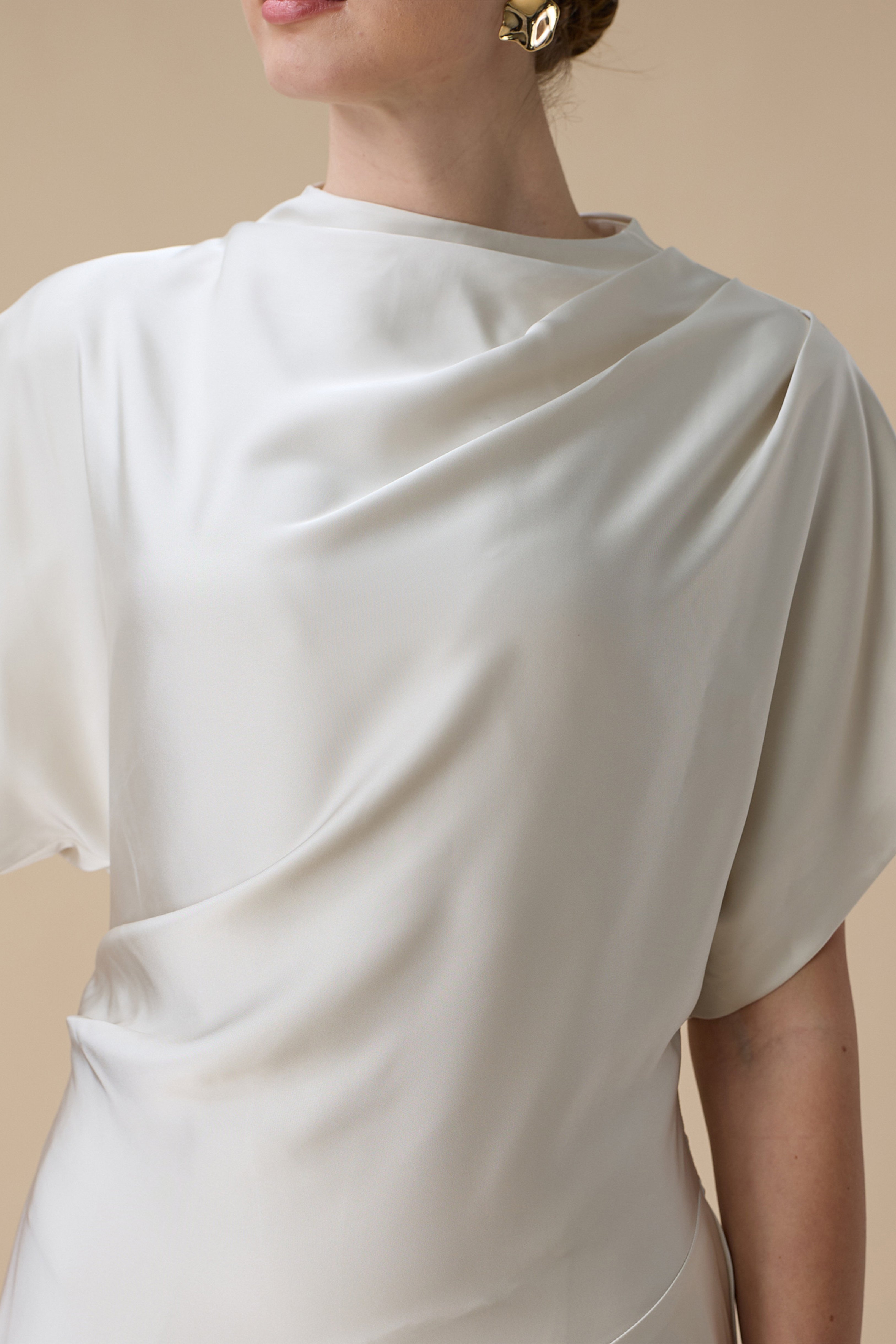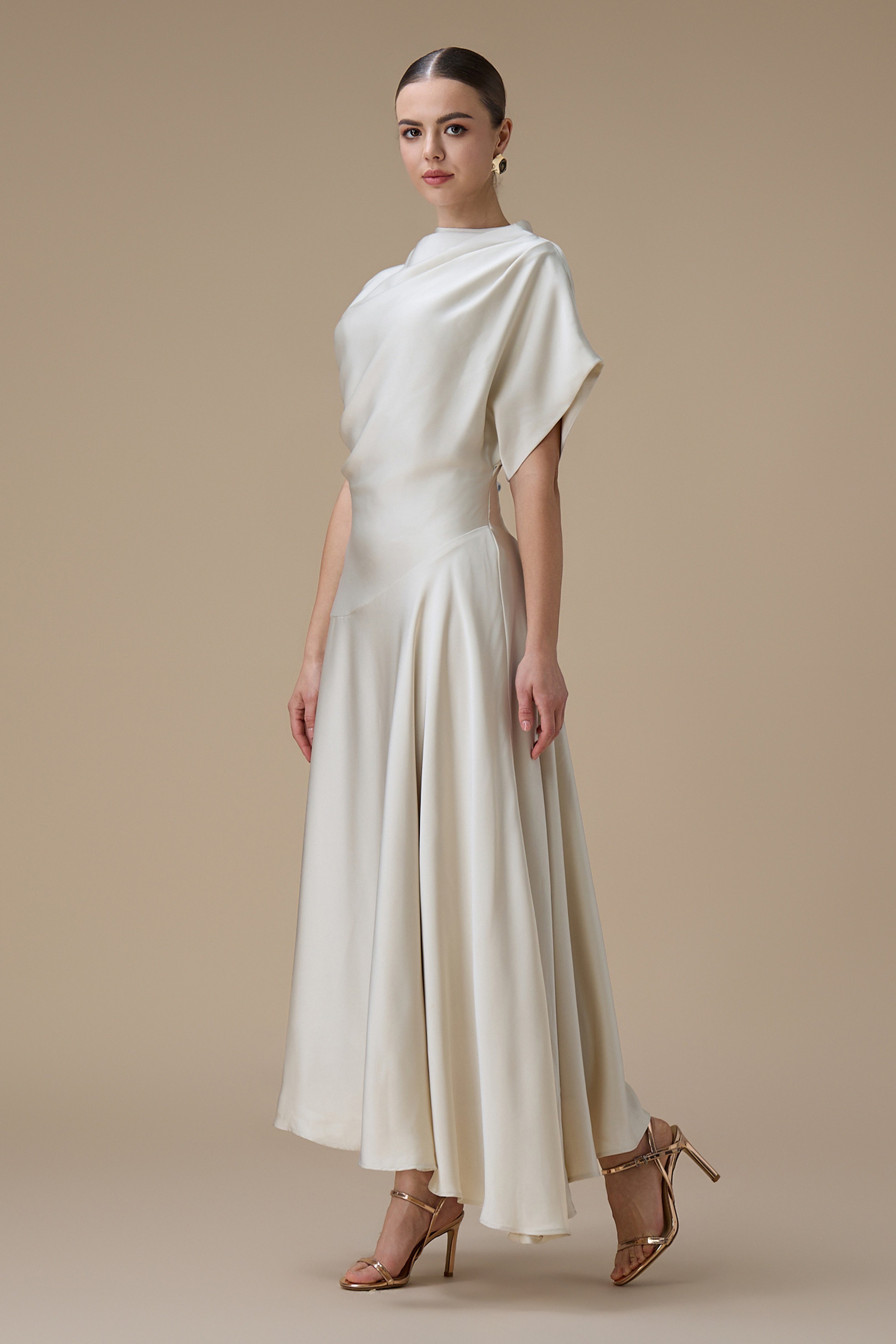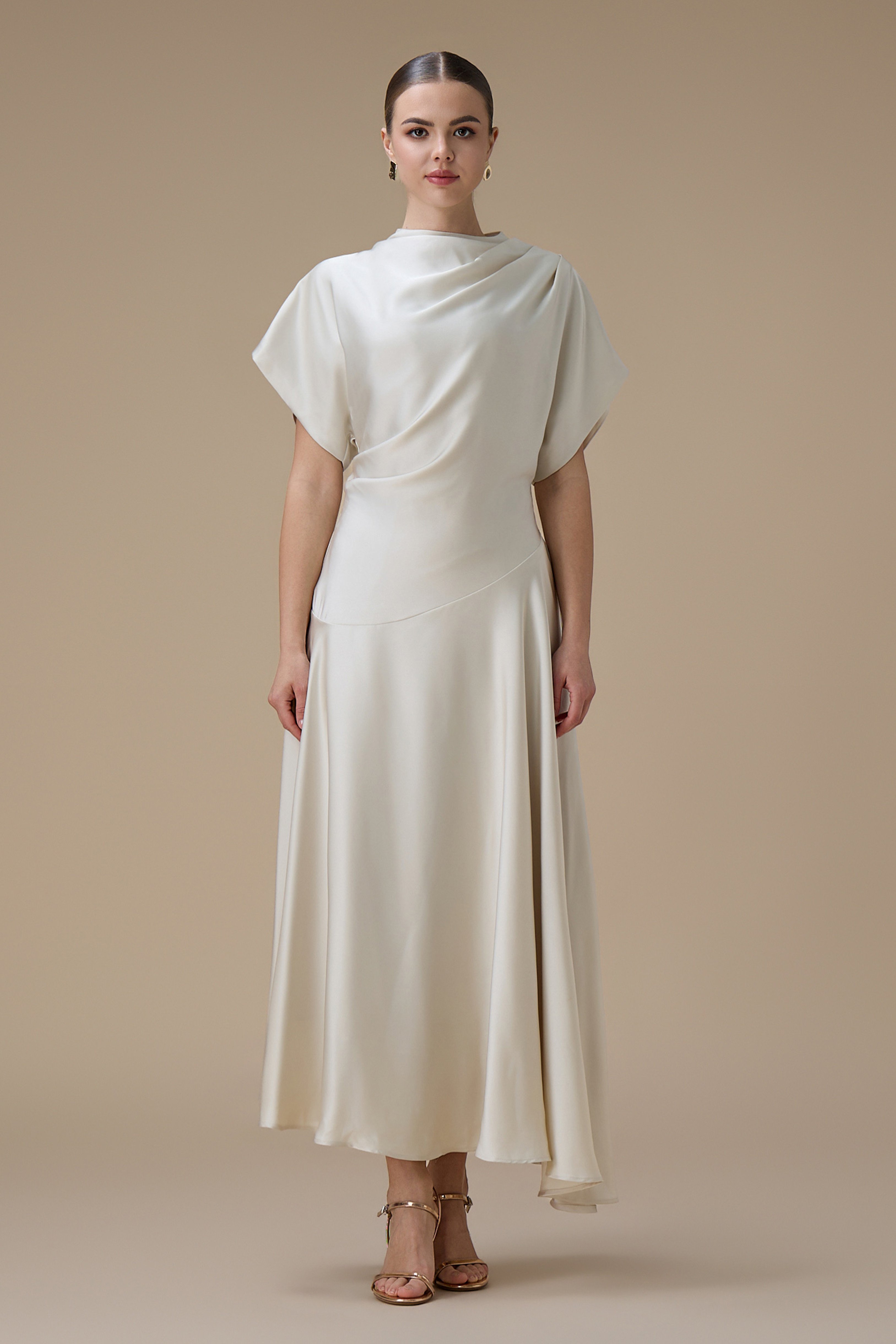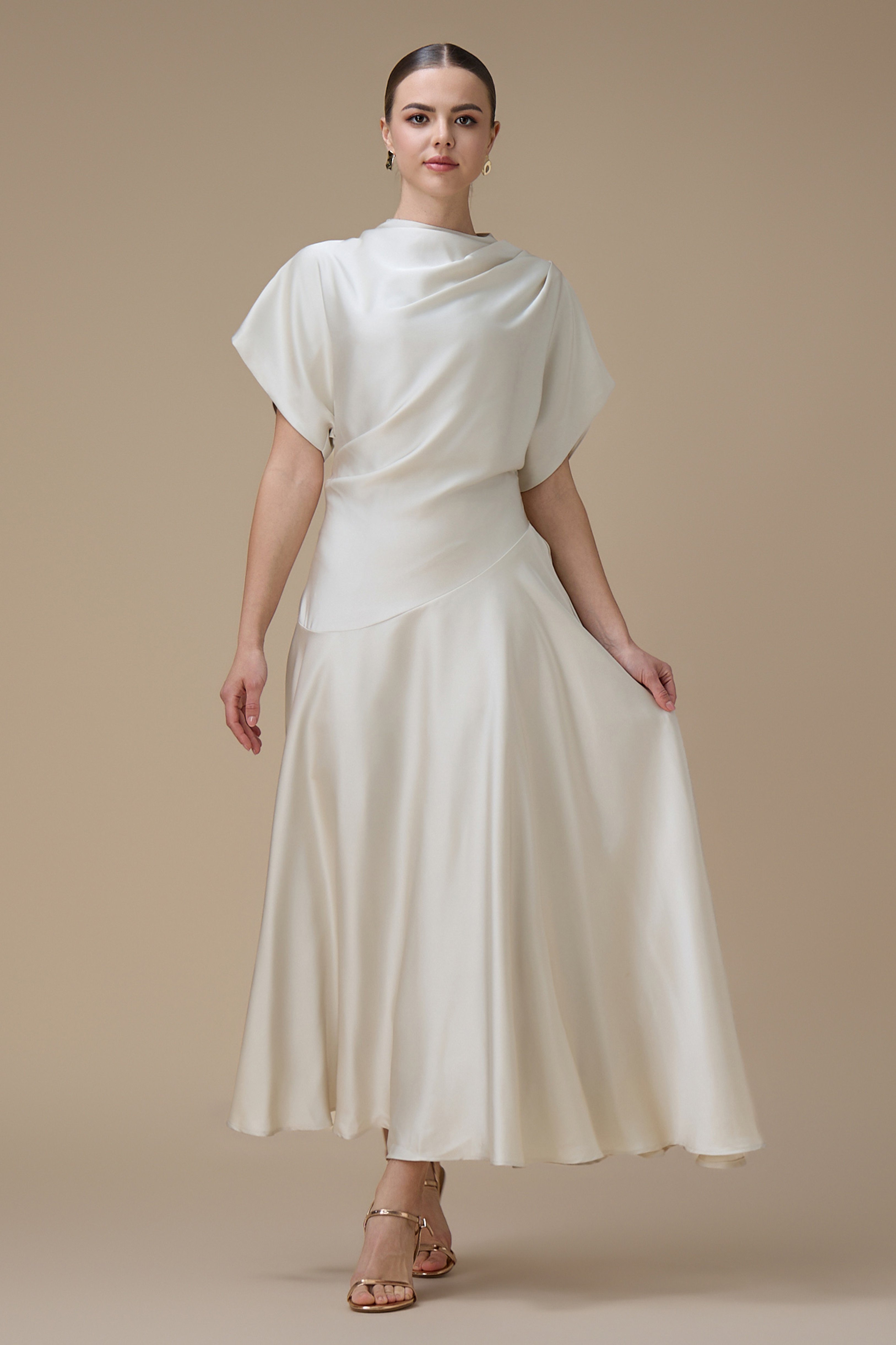نوع القصة: فستان سكري ميدي بقصة انسيابية وأكمام قصيرة واسعة بياقة مرتفعة