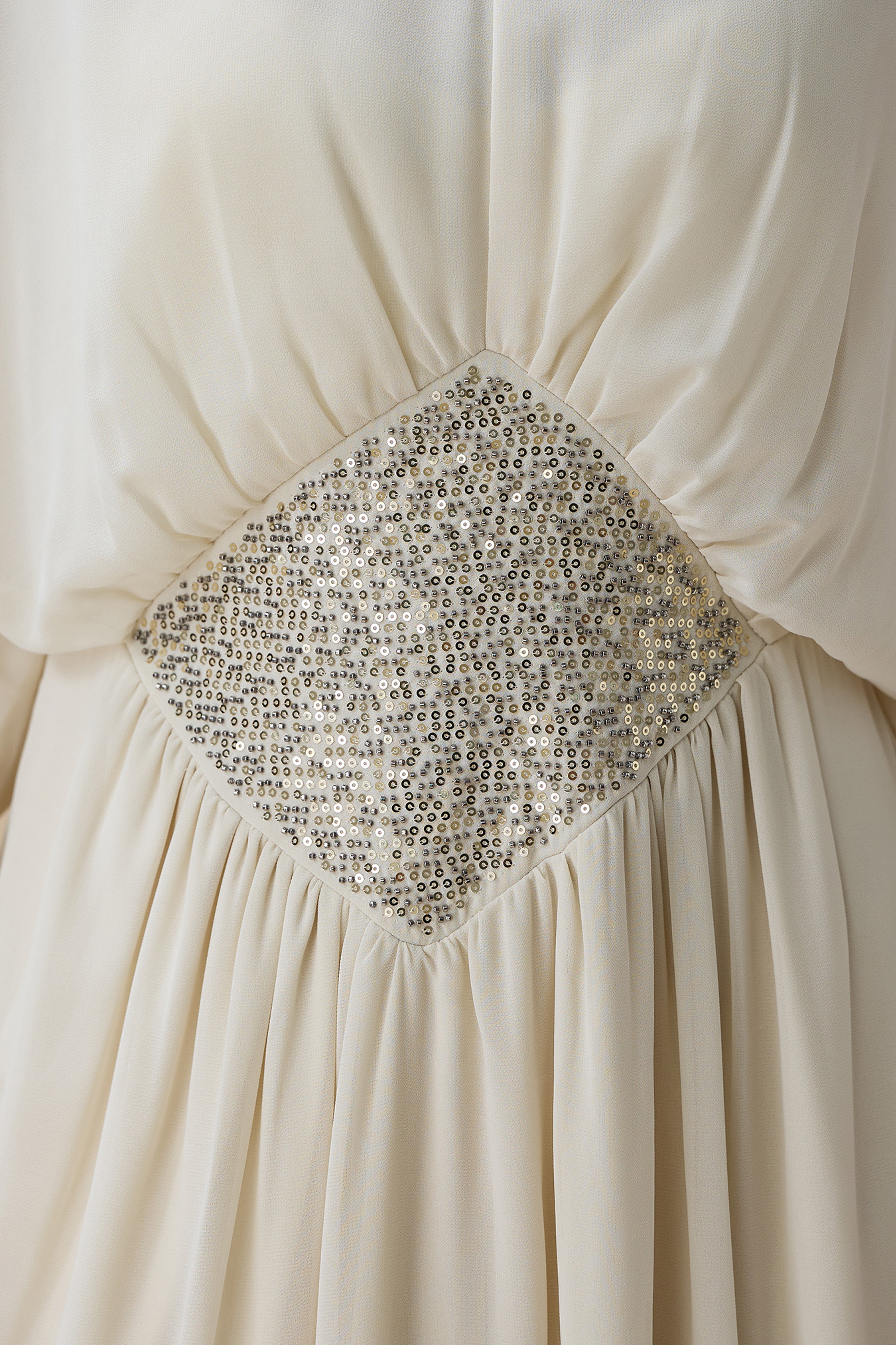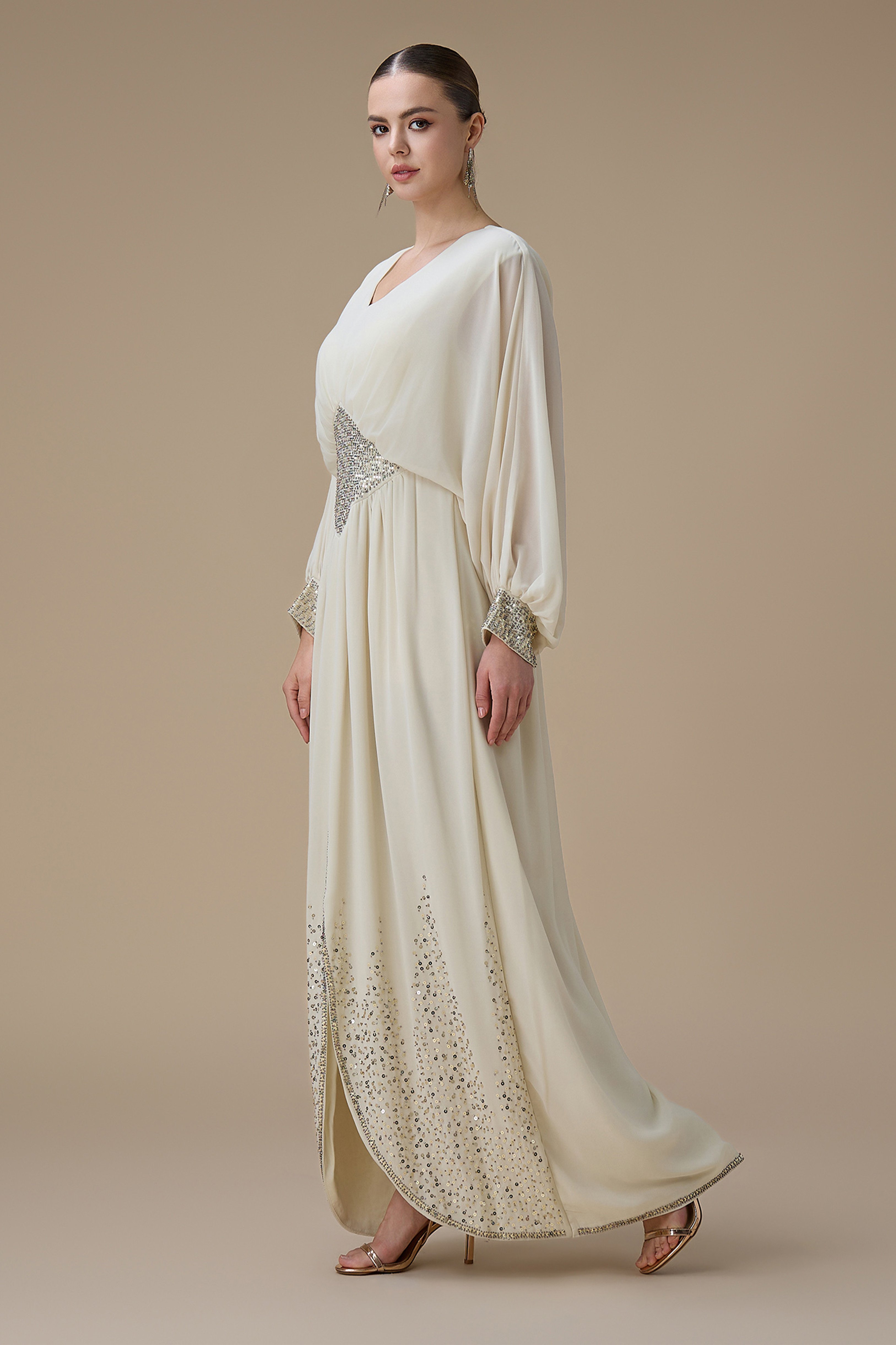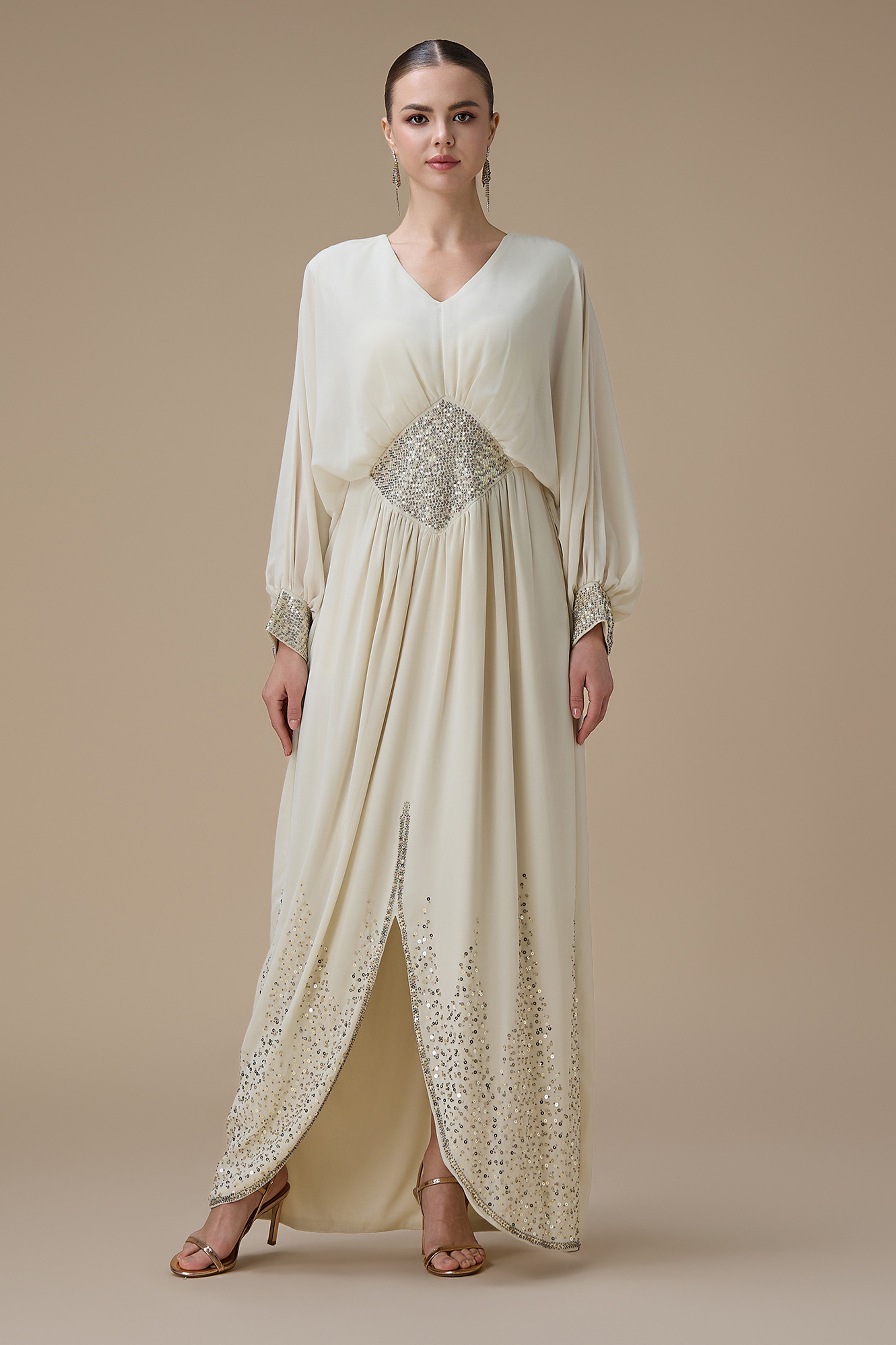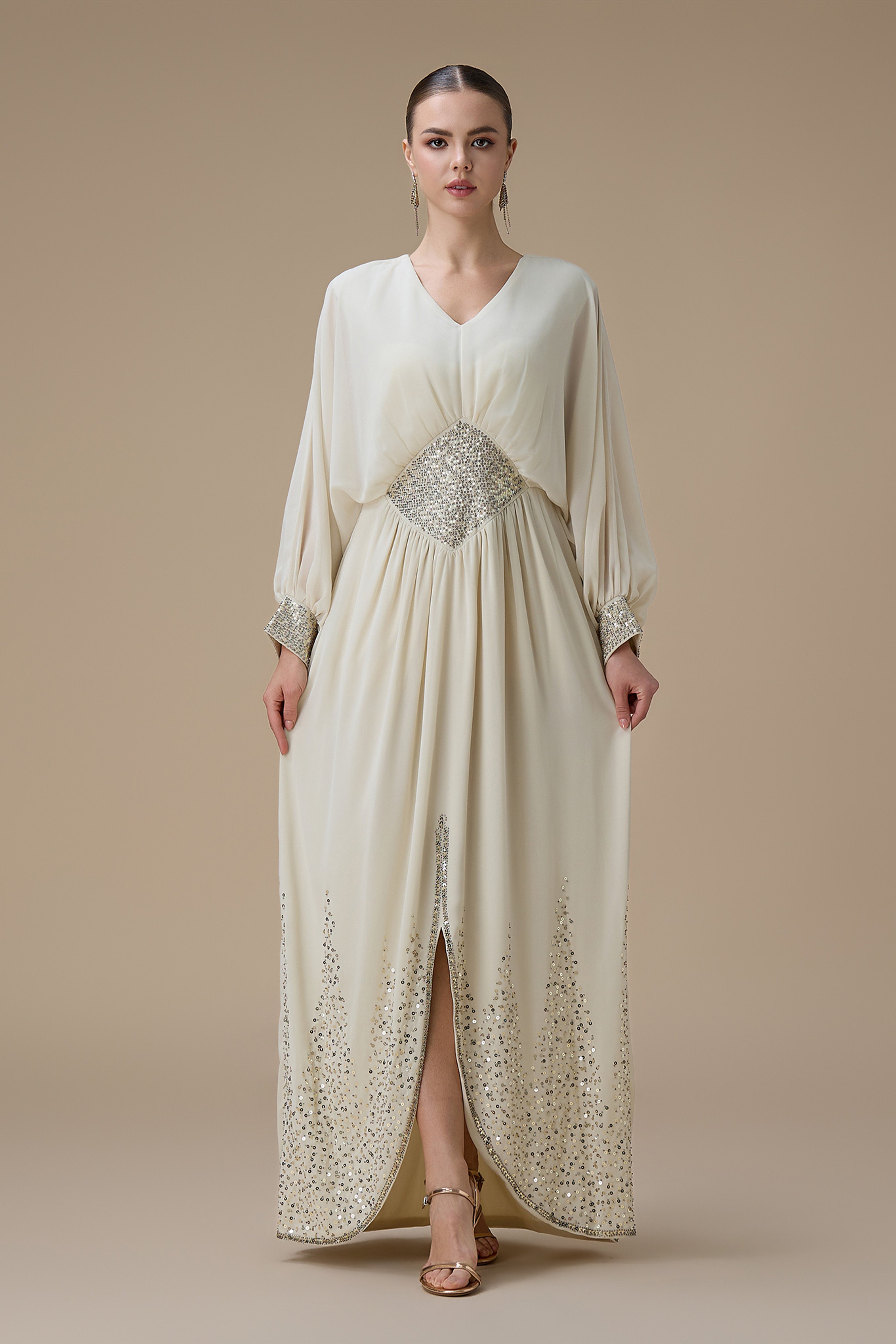 نوع القصة: جلابية شيفون طويلة سكري بتطريز كريستالي وقصة أنيقة بأكمام طويلة وياقة V