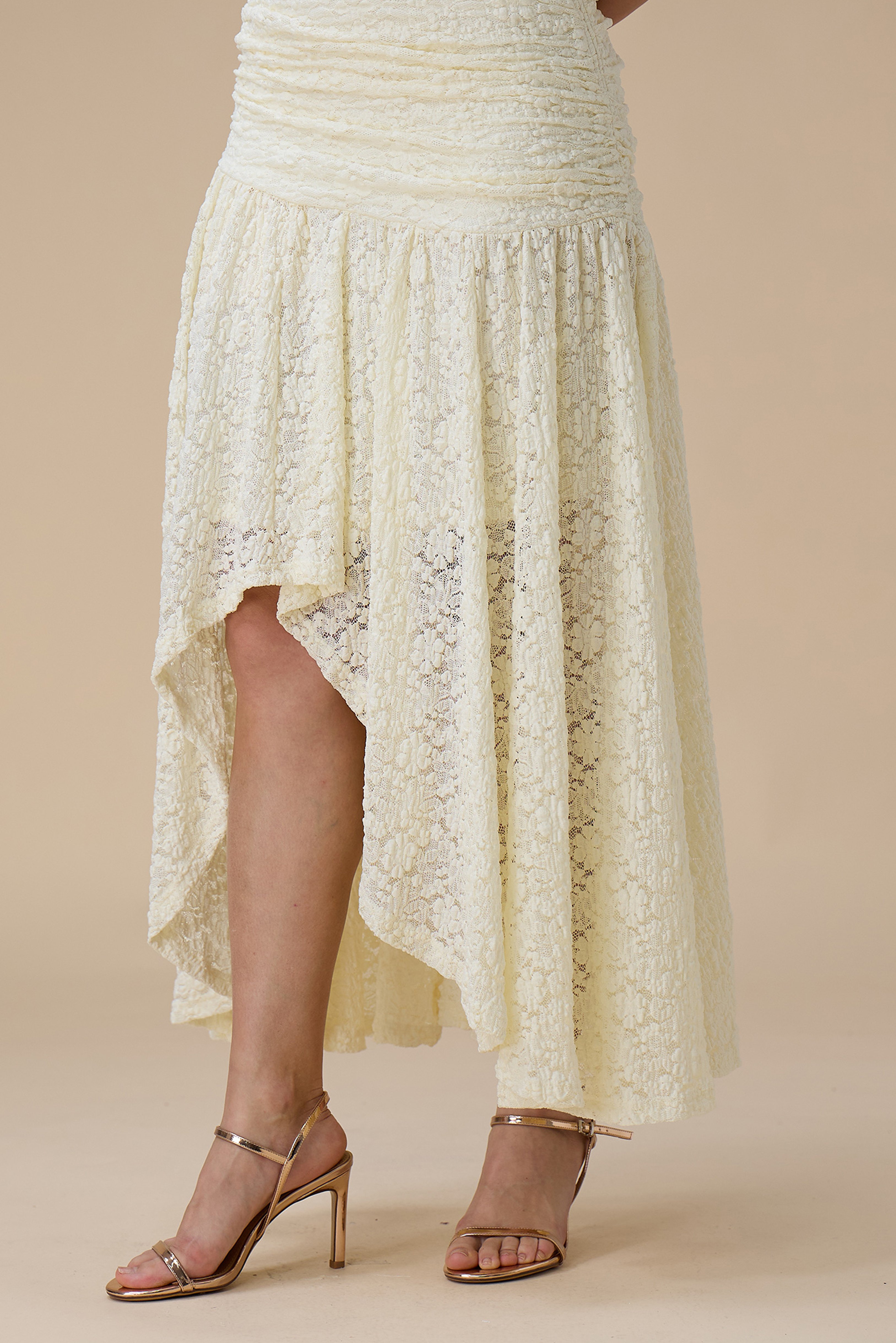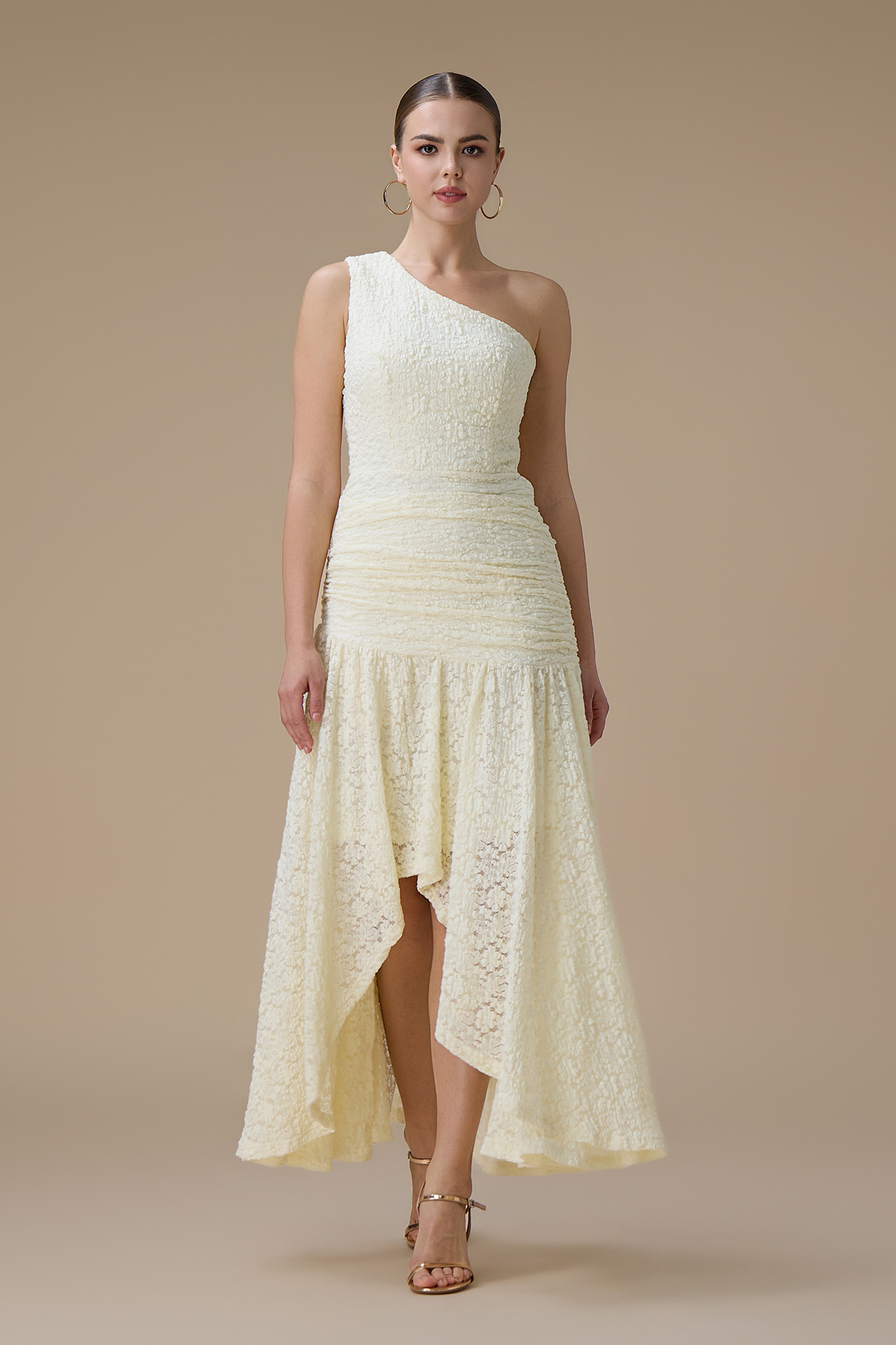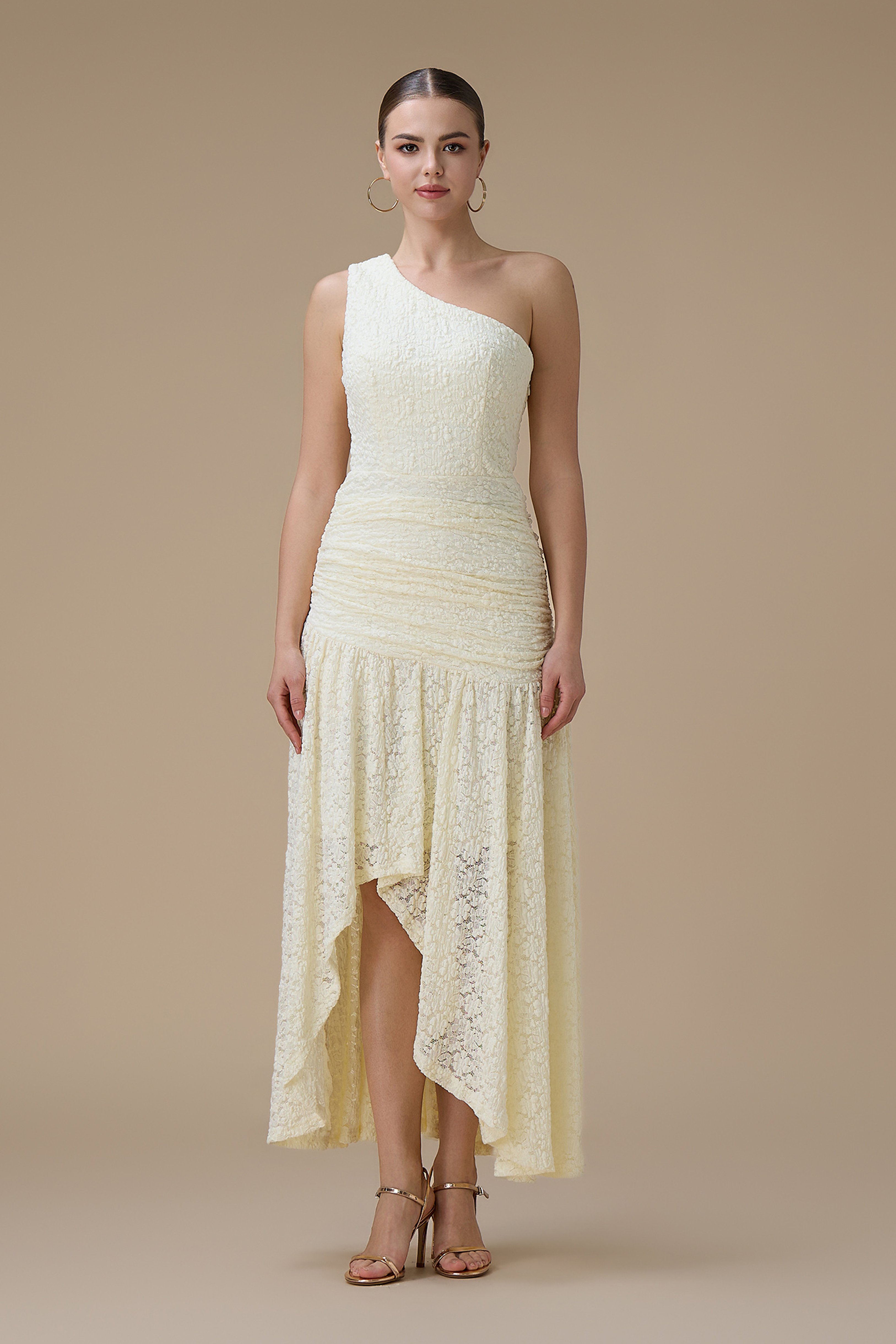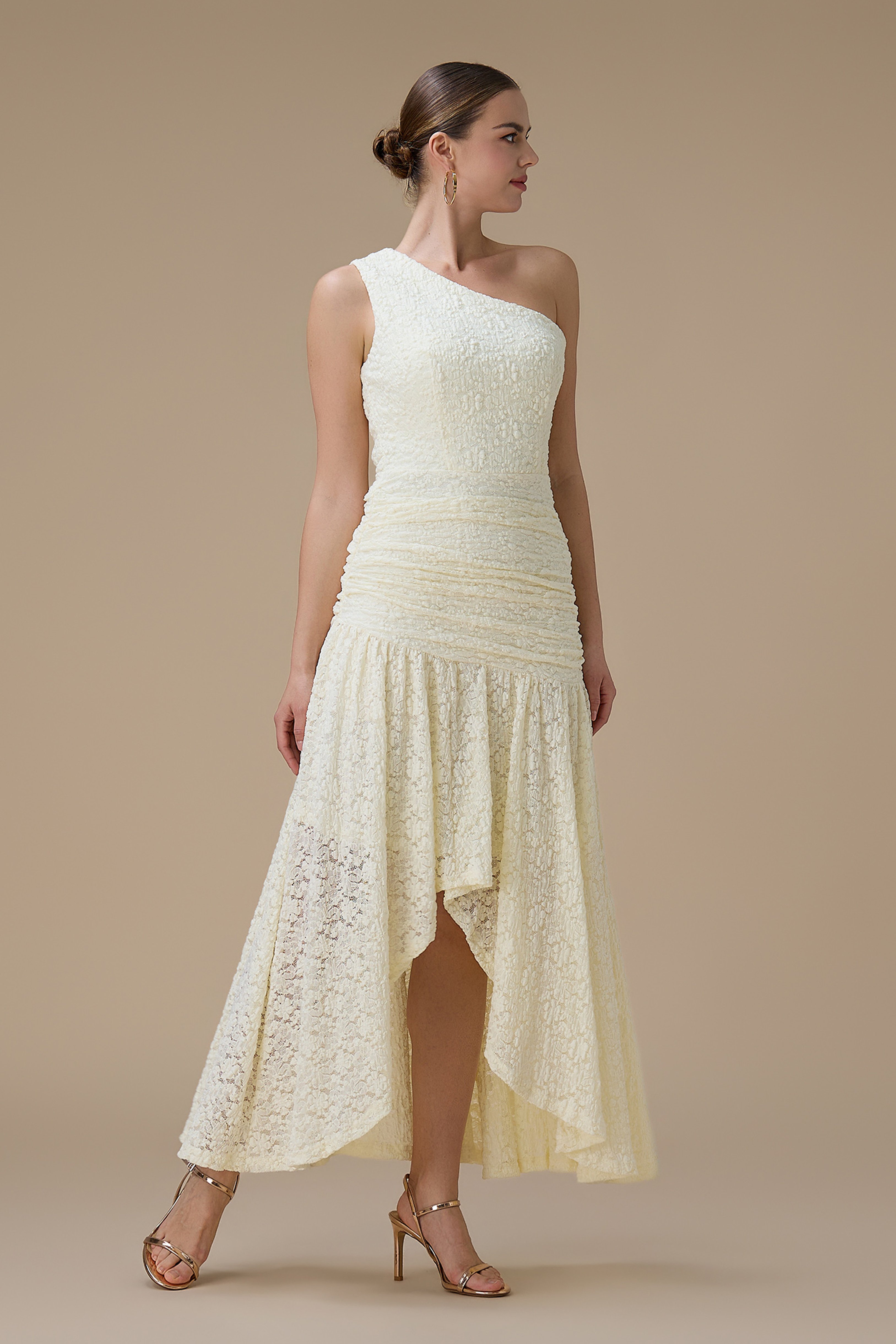نوع القصة: فستان سكري دانتيل غير متماثل الطول بنقوش زهرية مع ثنيات أنيقة بكتف واحد