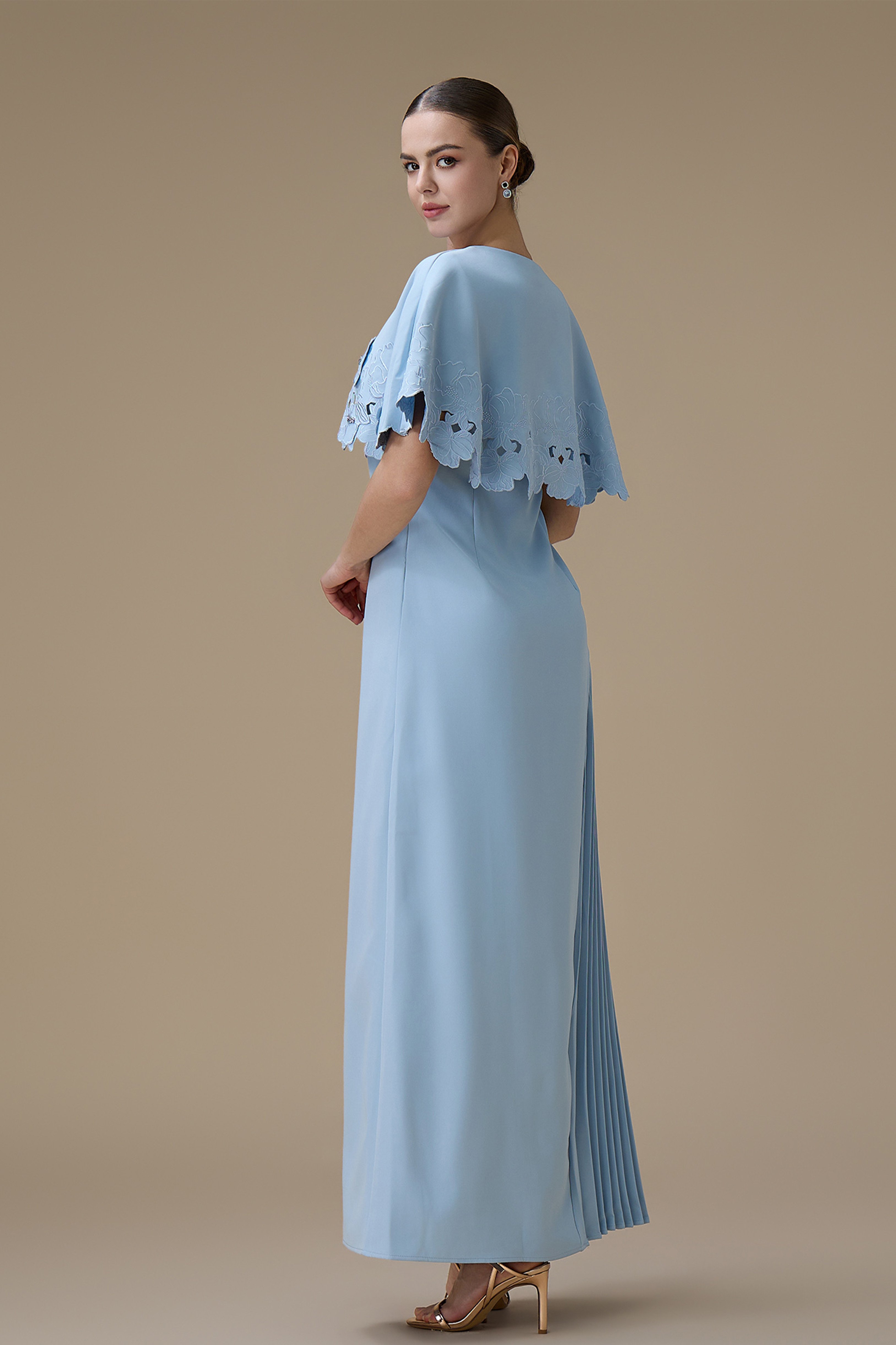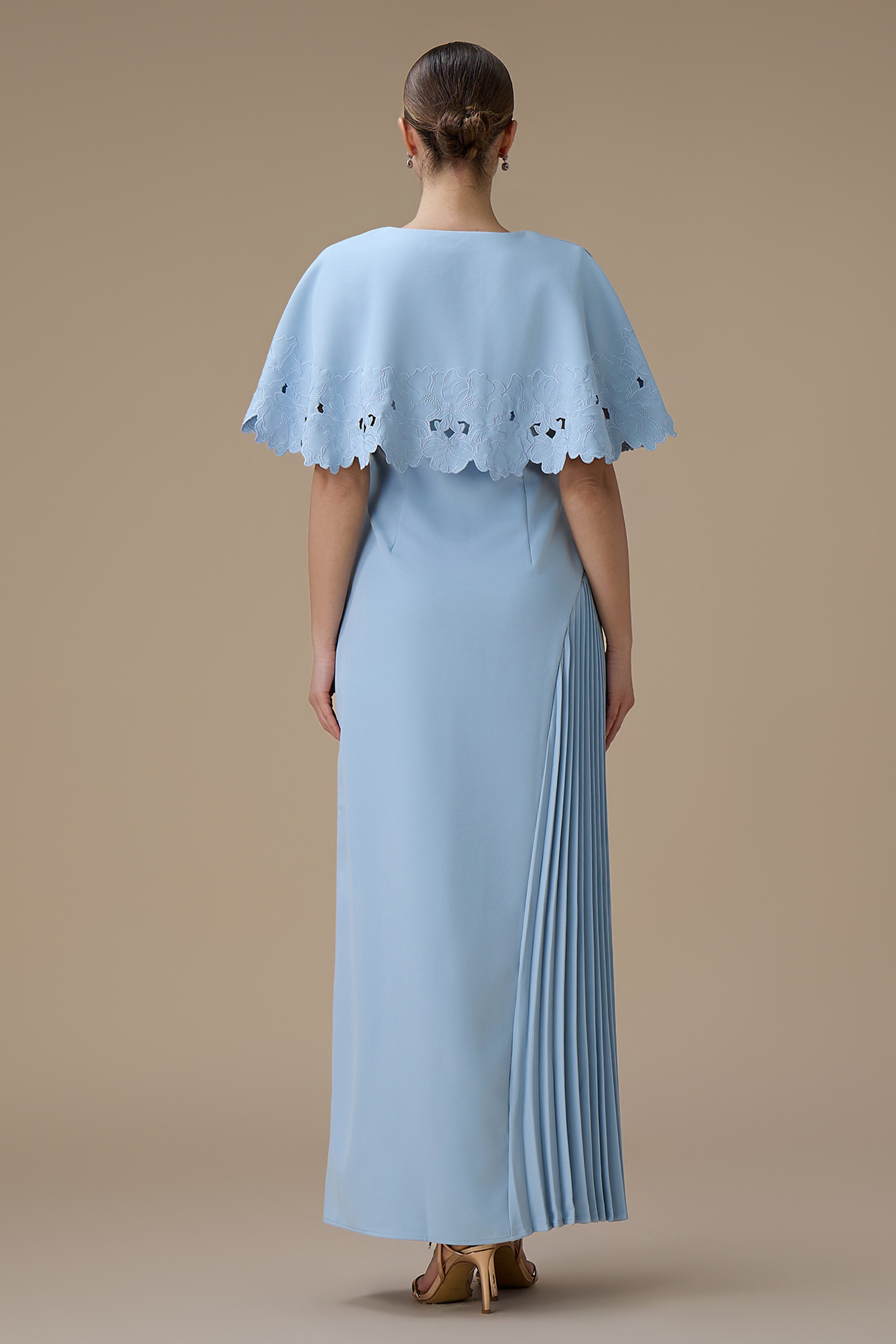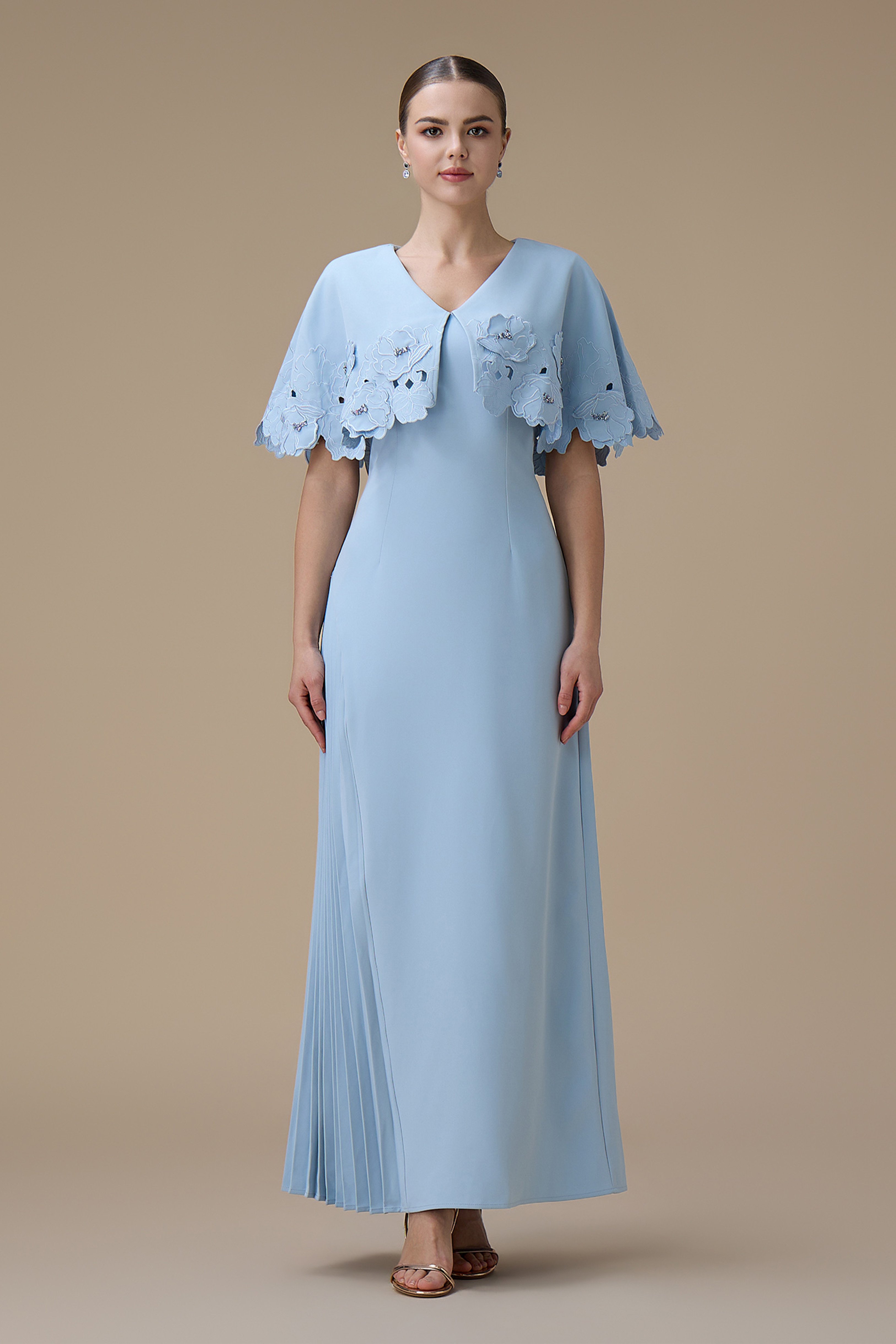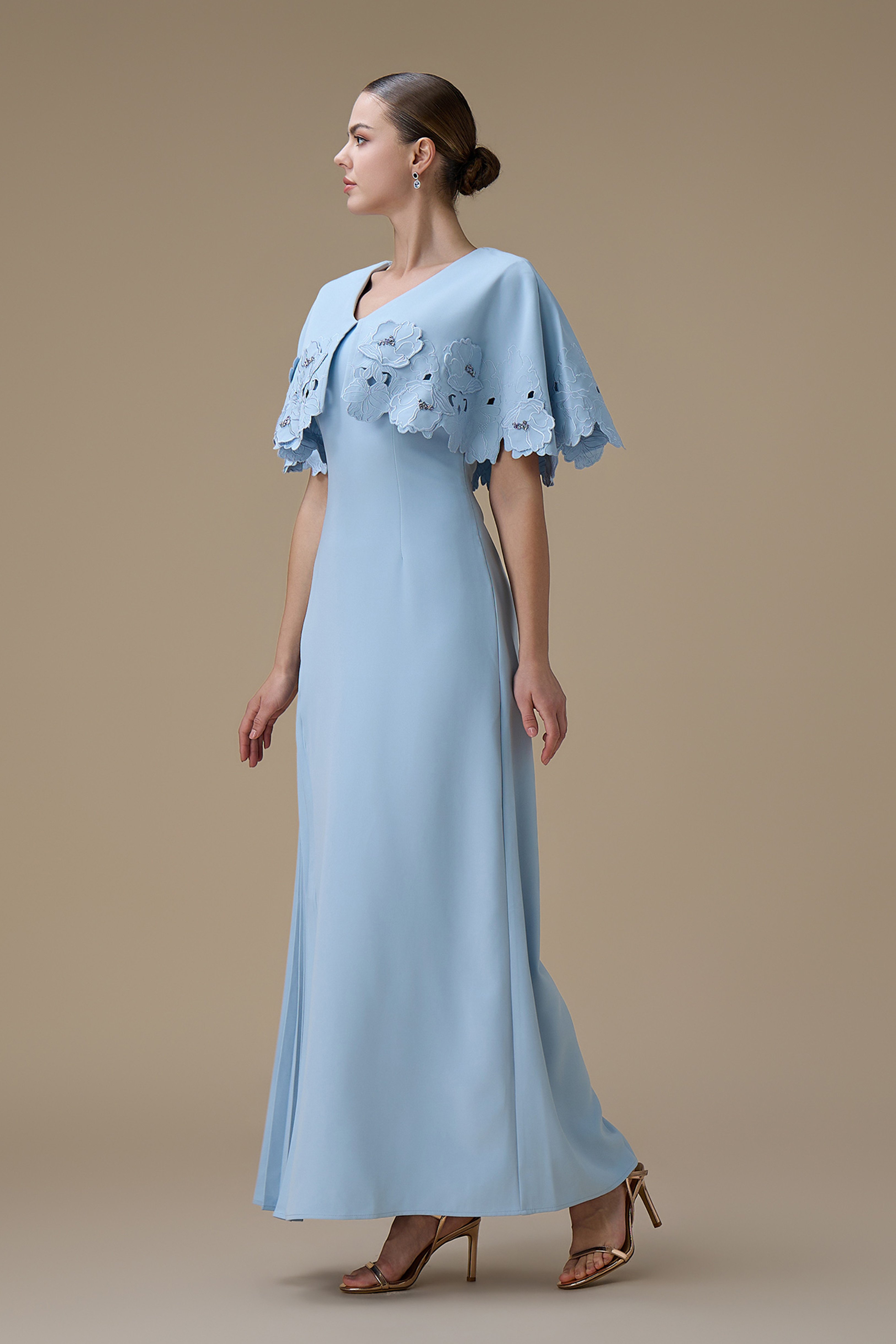 فستان طويل باللون الأزرق بتطريزات زهرية