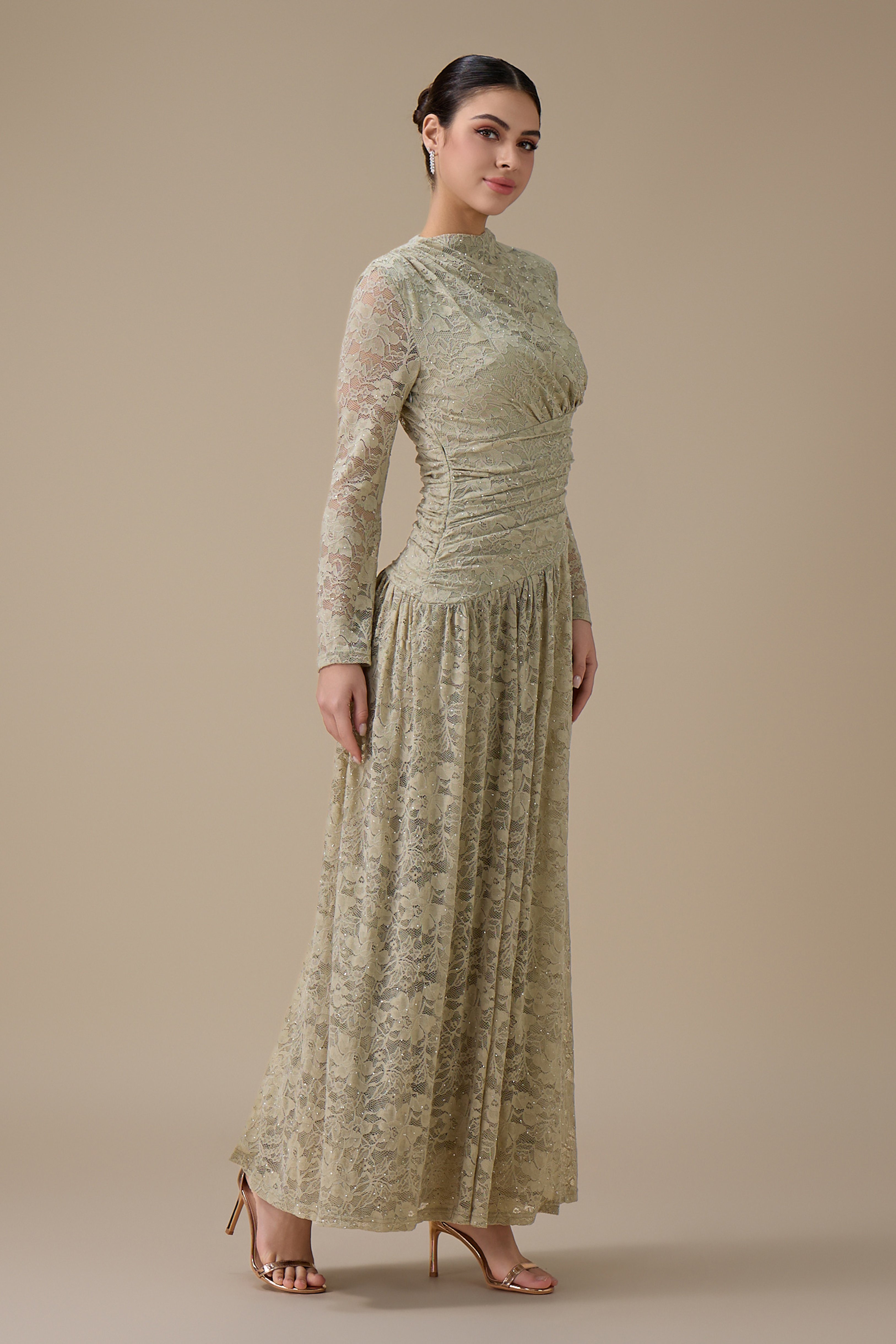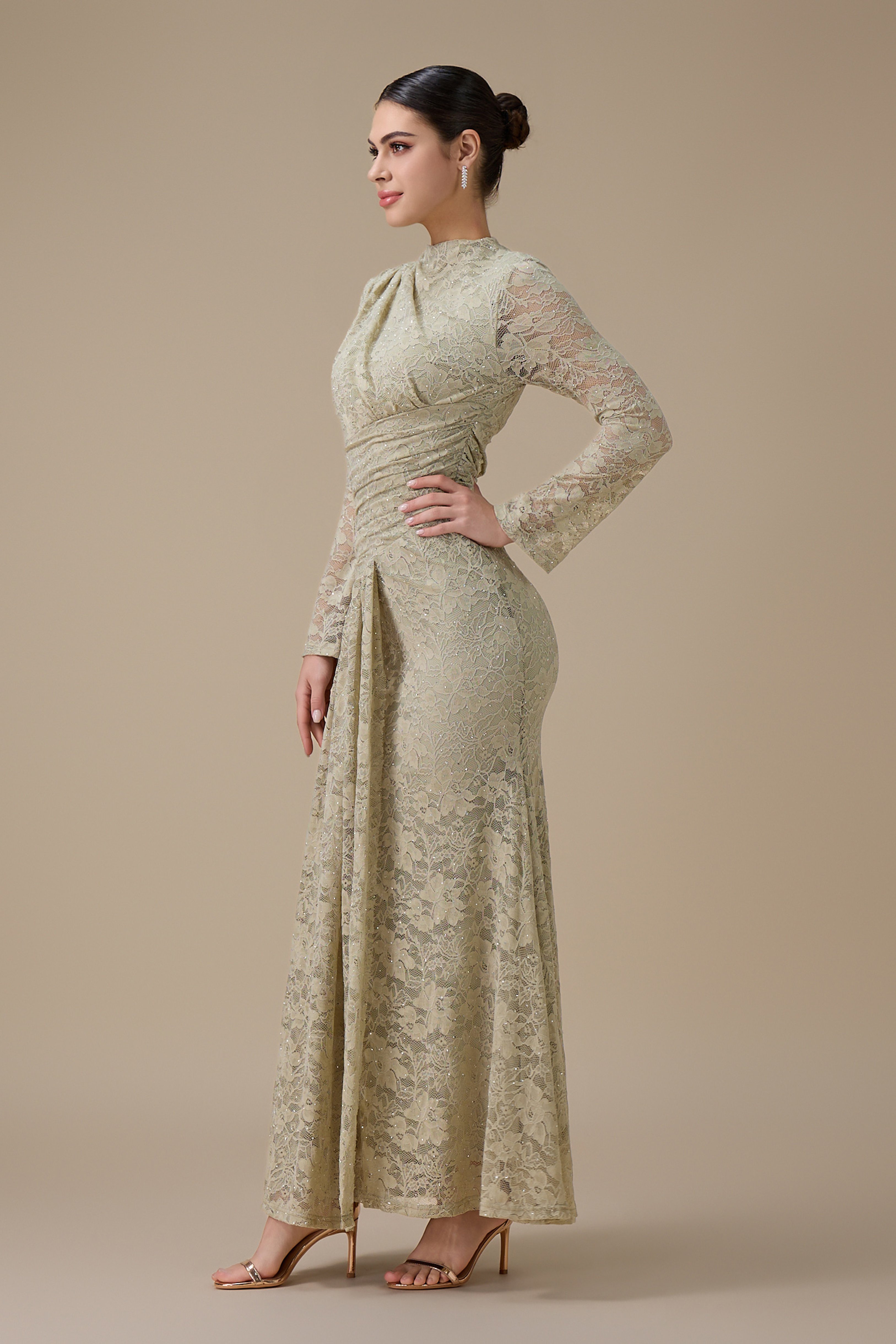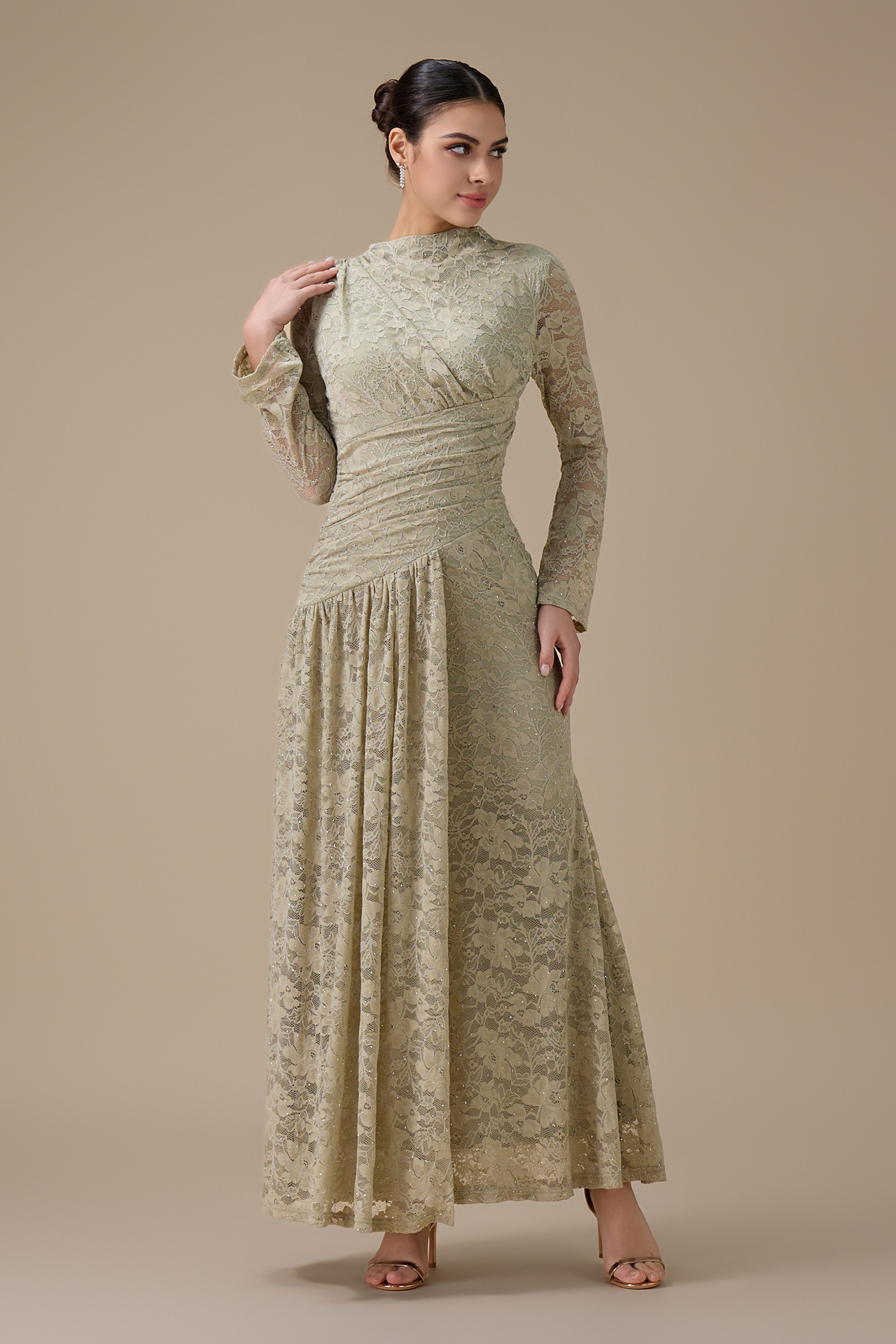 فستان طويل دانتيل أخضر فاتح محدد بثنيات جانبية ناعمة بأكمام طويلة بياقة عالية مغلقة