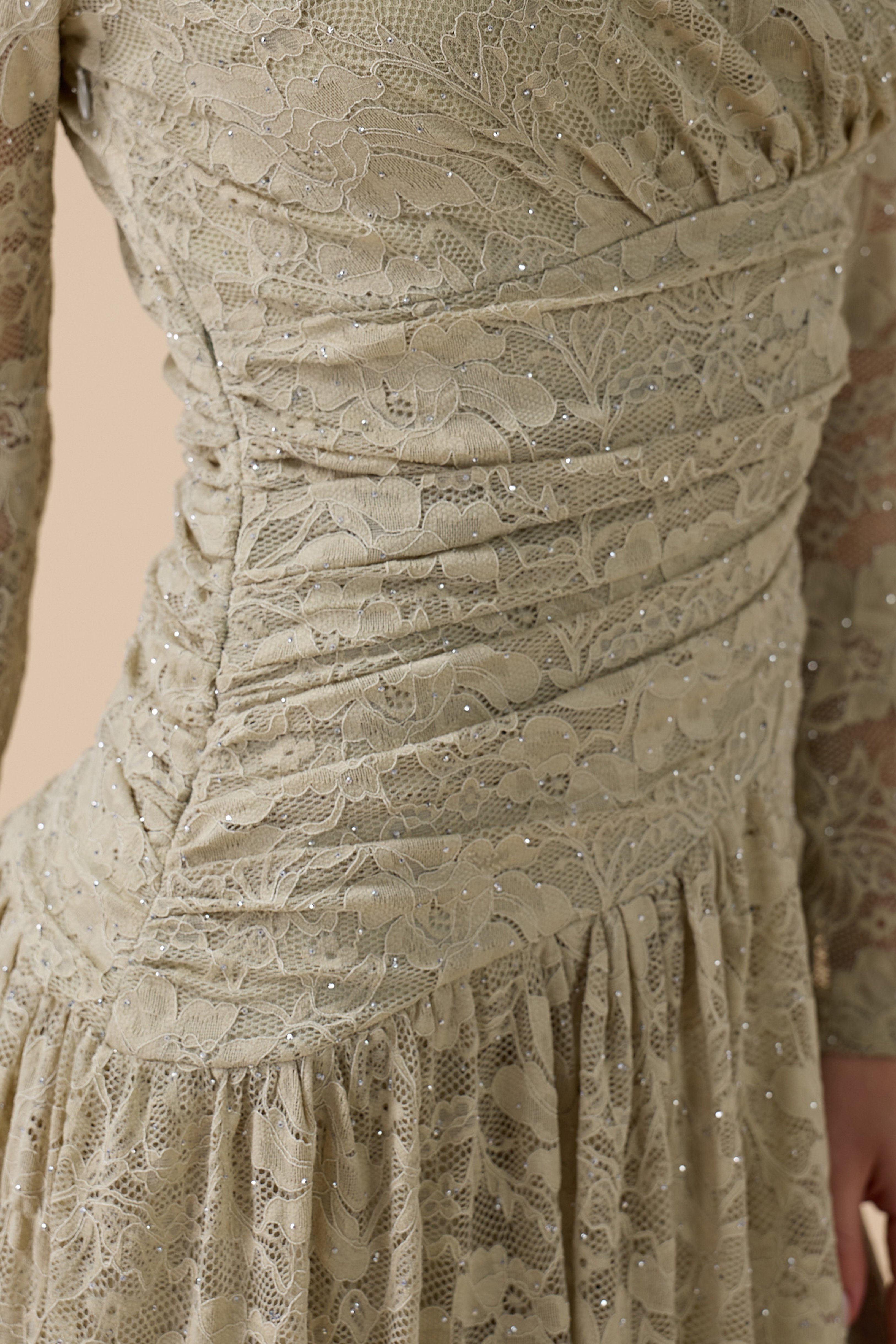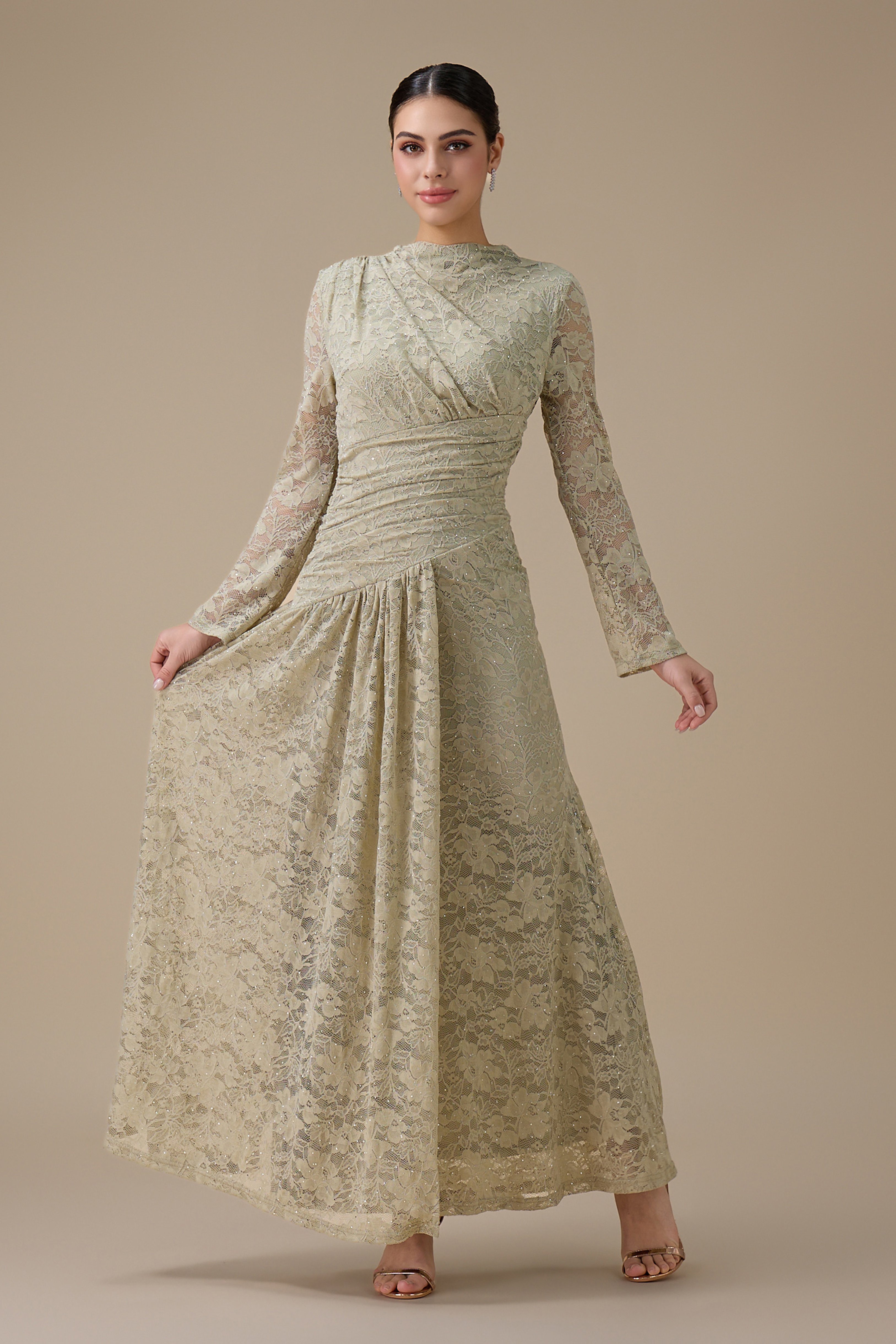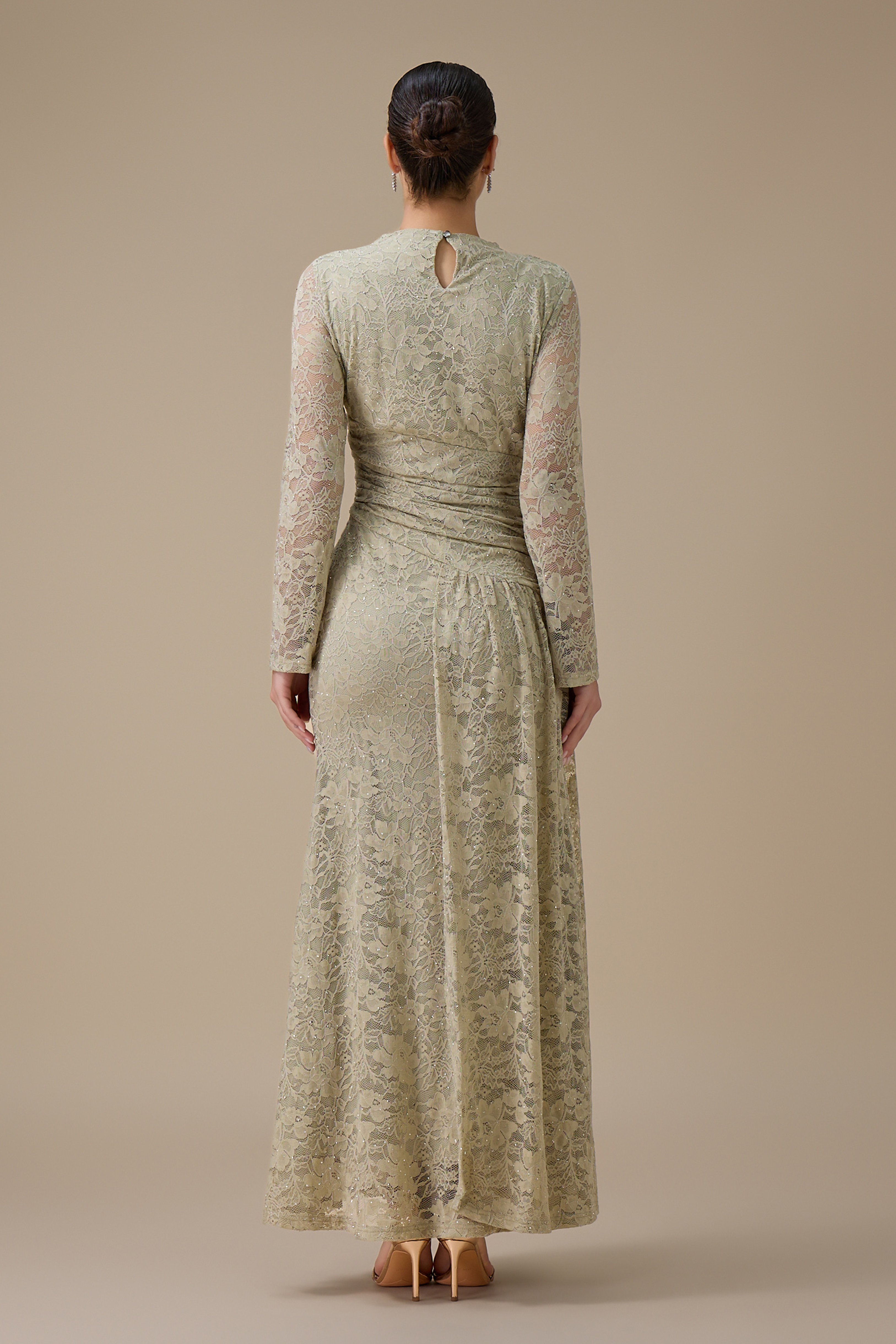 فستان طويل دانتيل أخضر فاتح محدد بثنيات جانبية ناعمة بأكمام طويلة بياقة عالية مغلقة