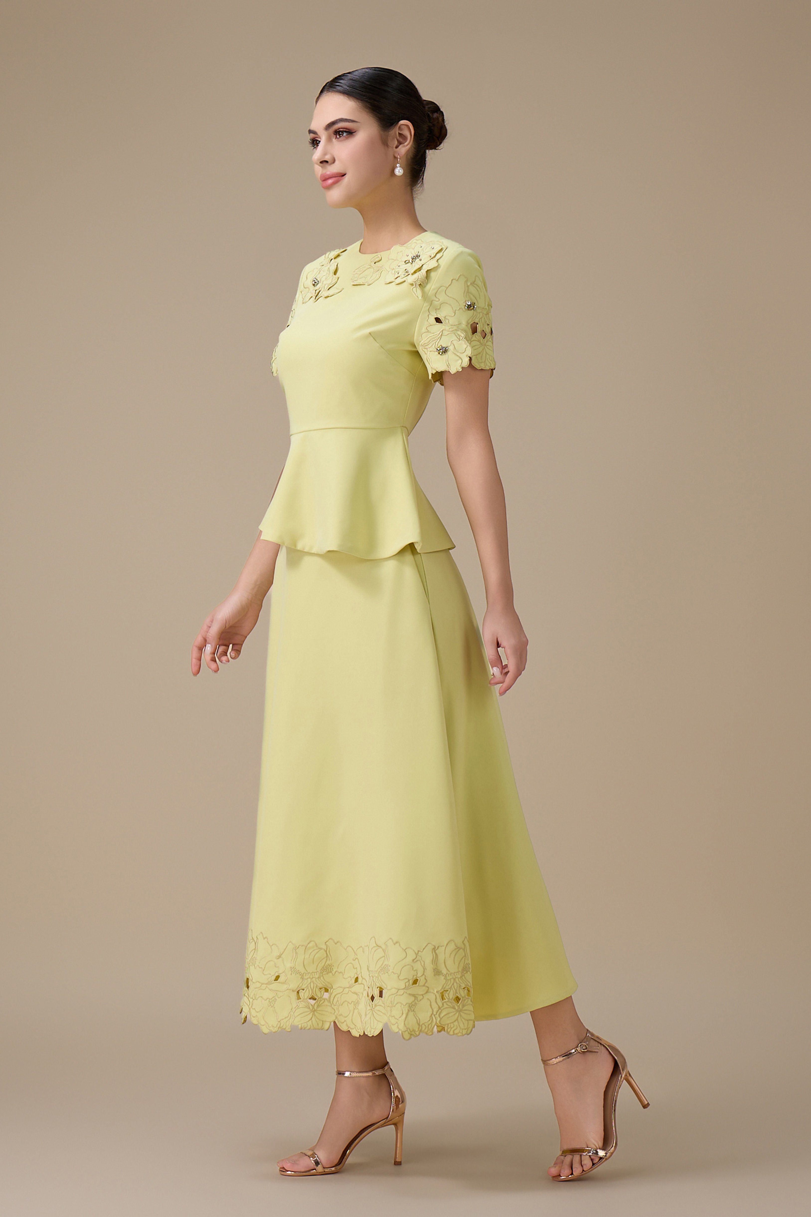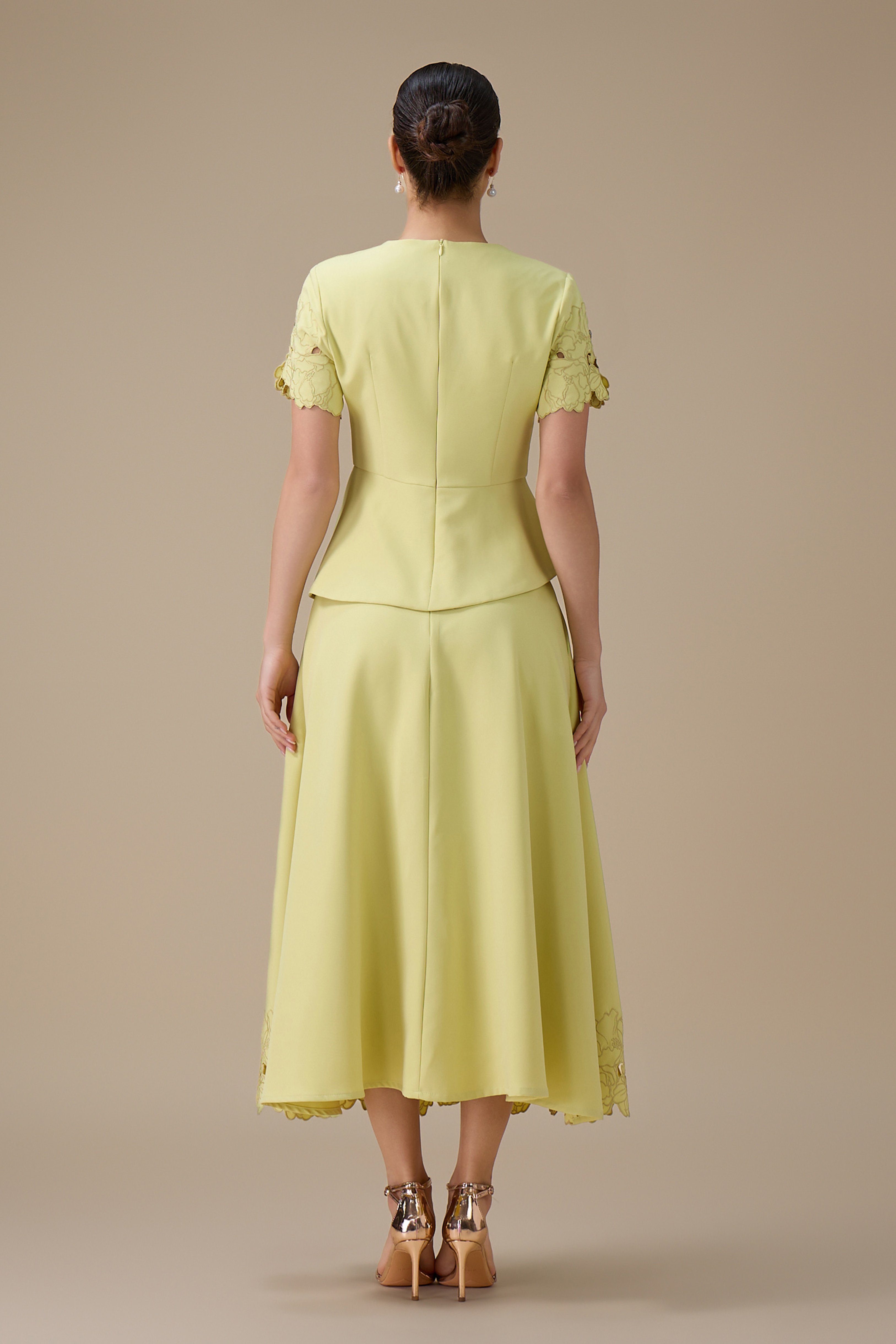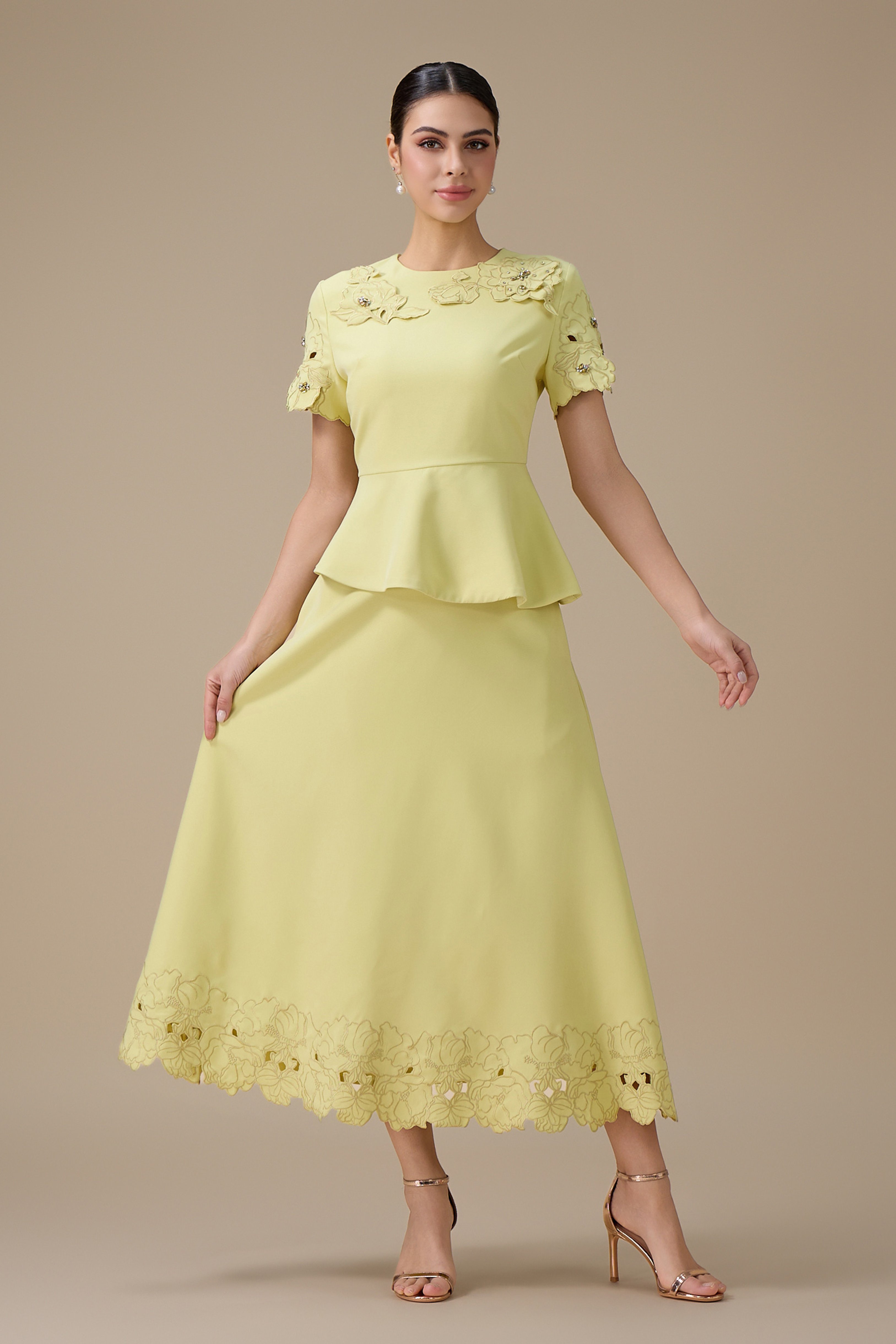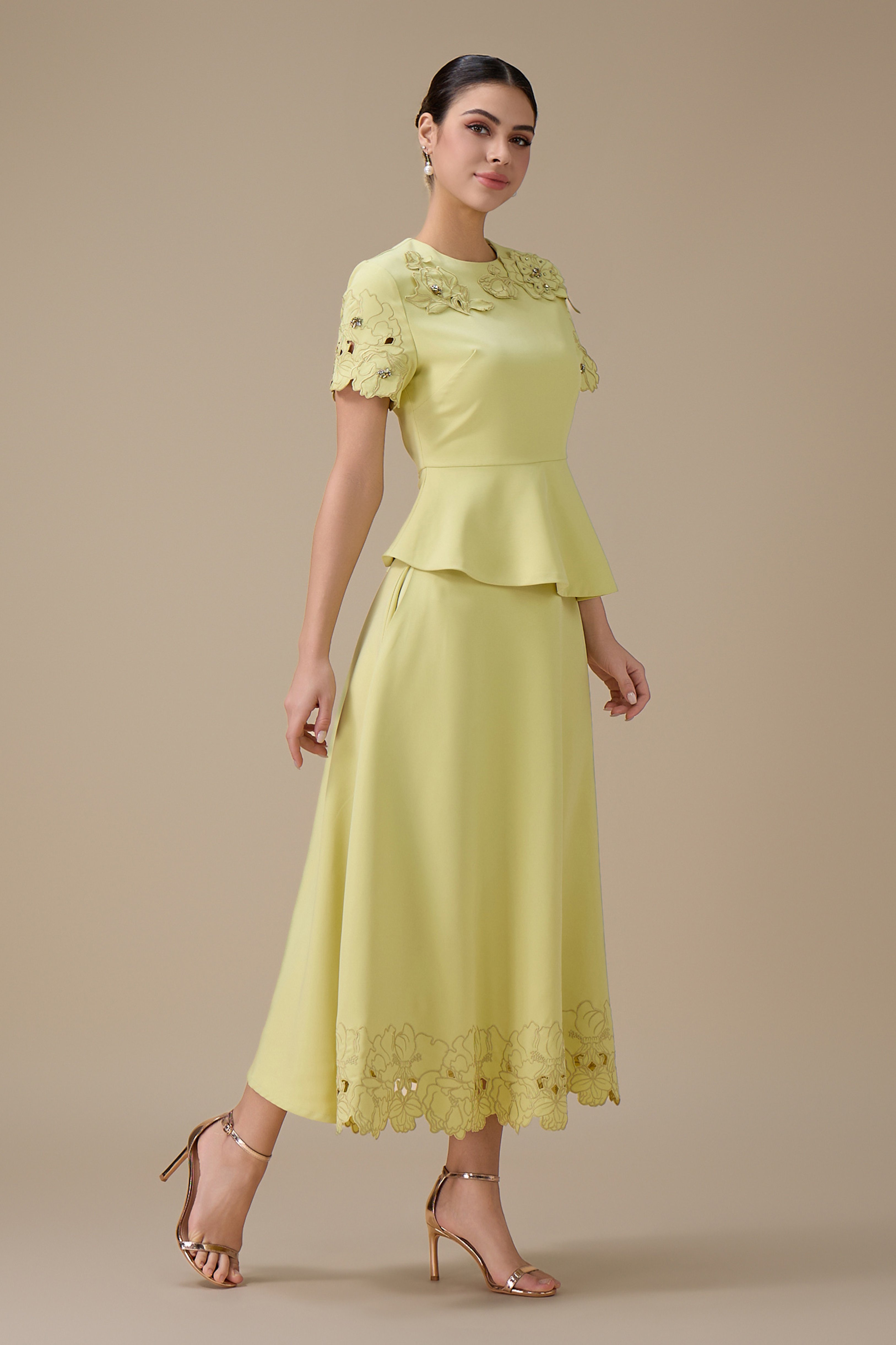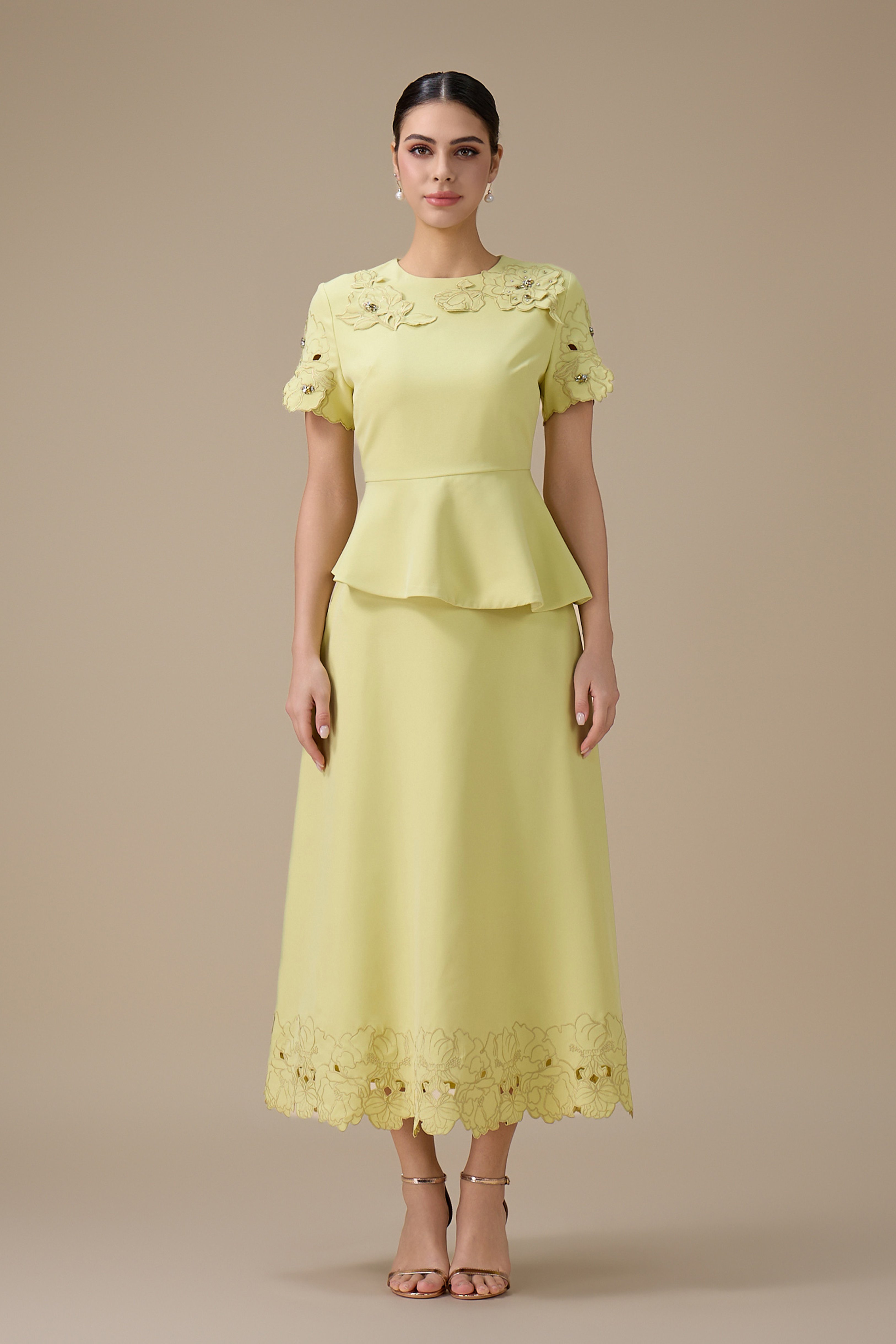طقم تنورة ميدي أخضر فاتح بتفاصيل زهور ثلاثية الأبعاد بأكمام قصيرة وياقة دائرية
