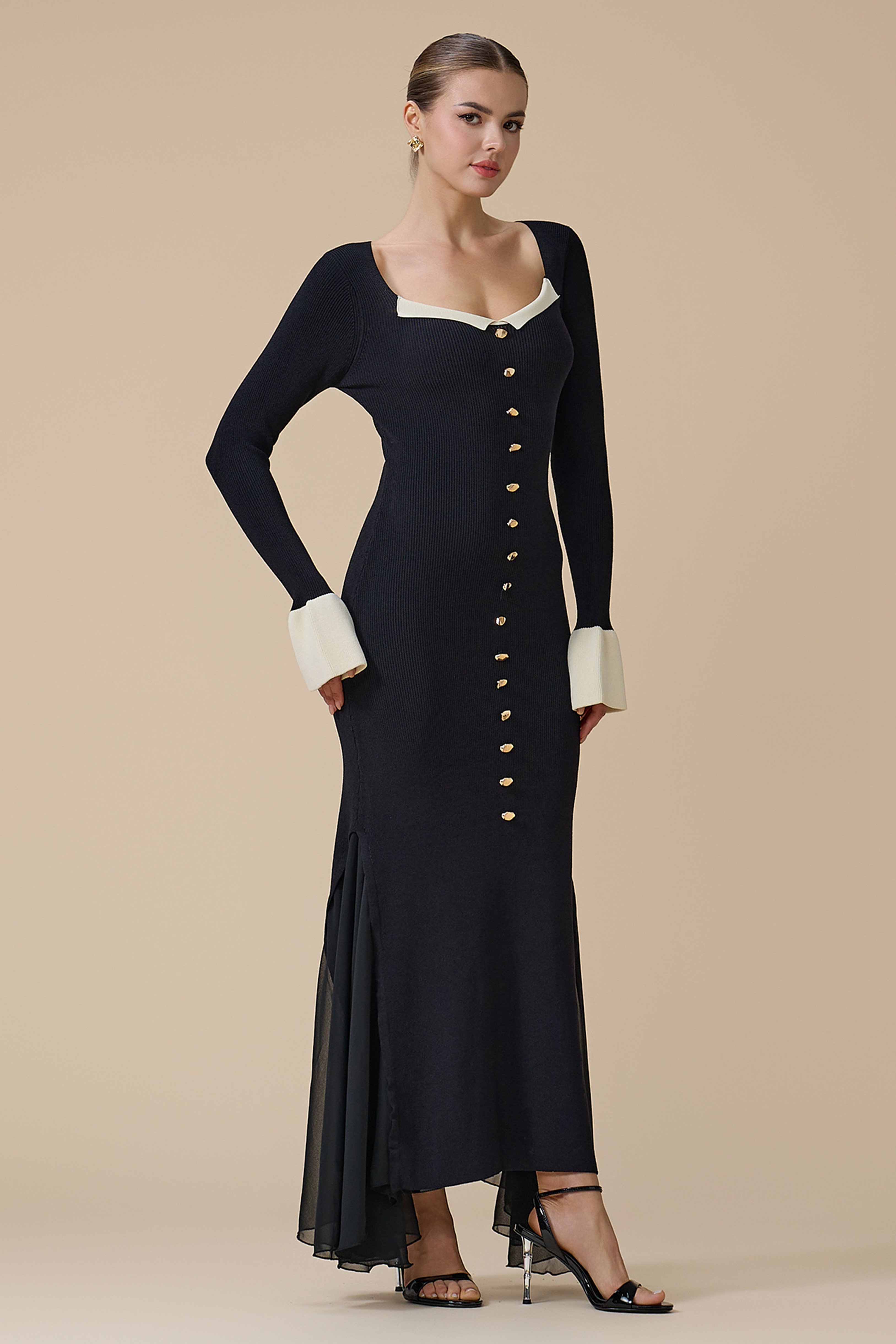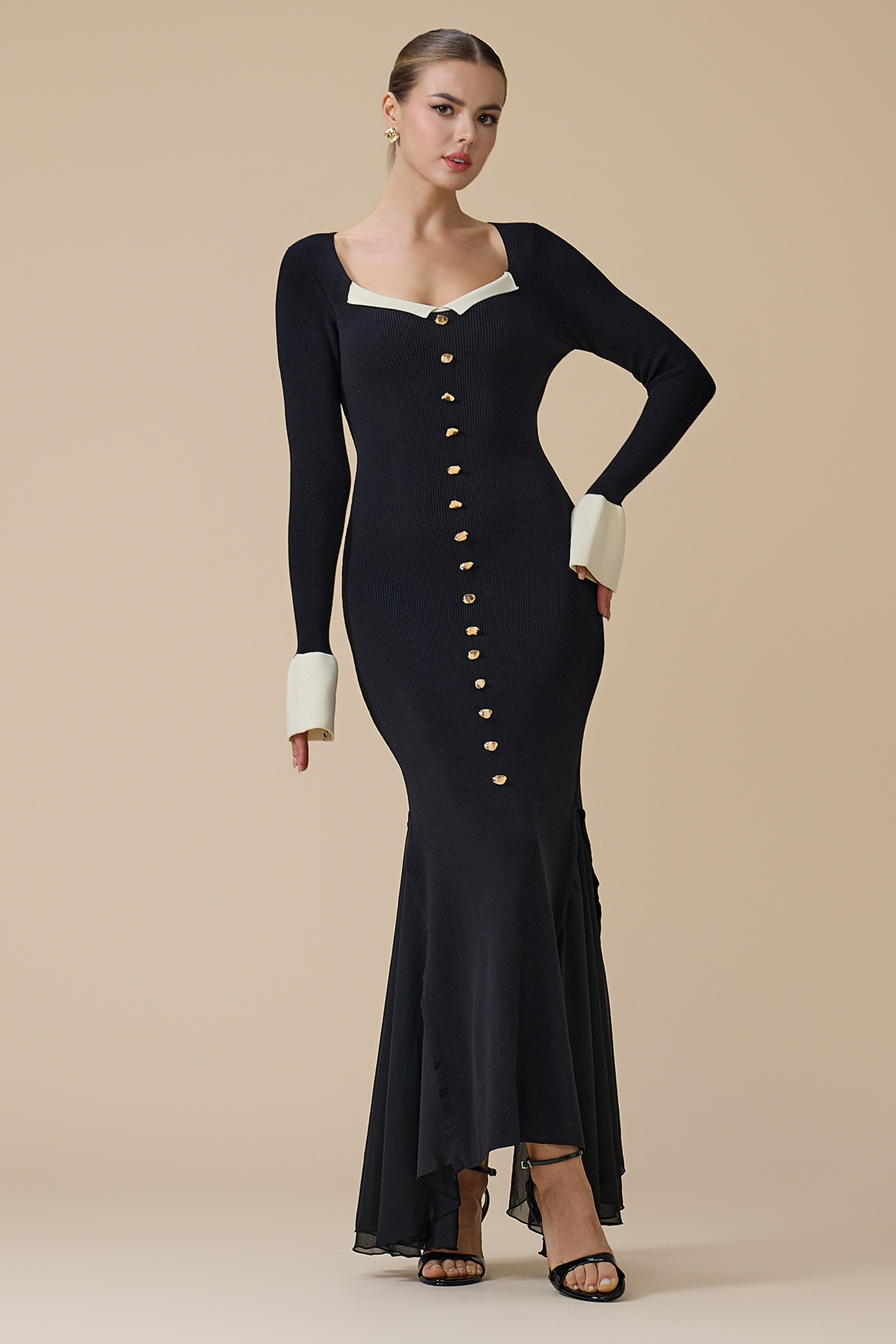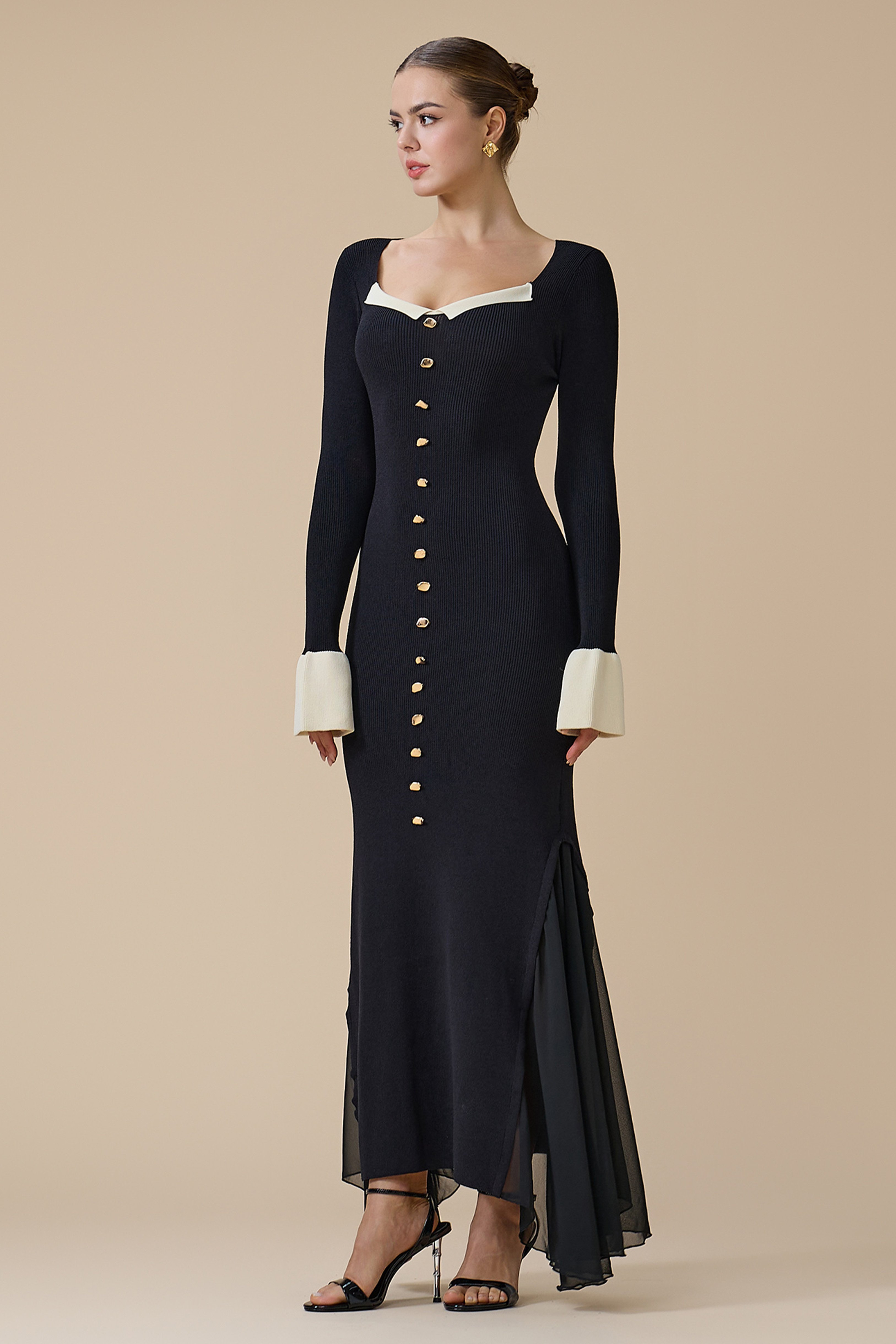 فستان أسود طويل بقصة مستقيمة ضيقة بياقة على شكل قلب، مزين بأزرار ذهبية أمامية مع أساور عريضة باللون الأبيض