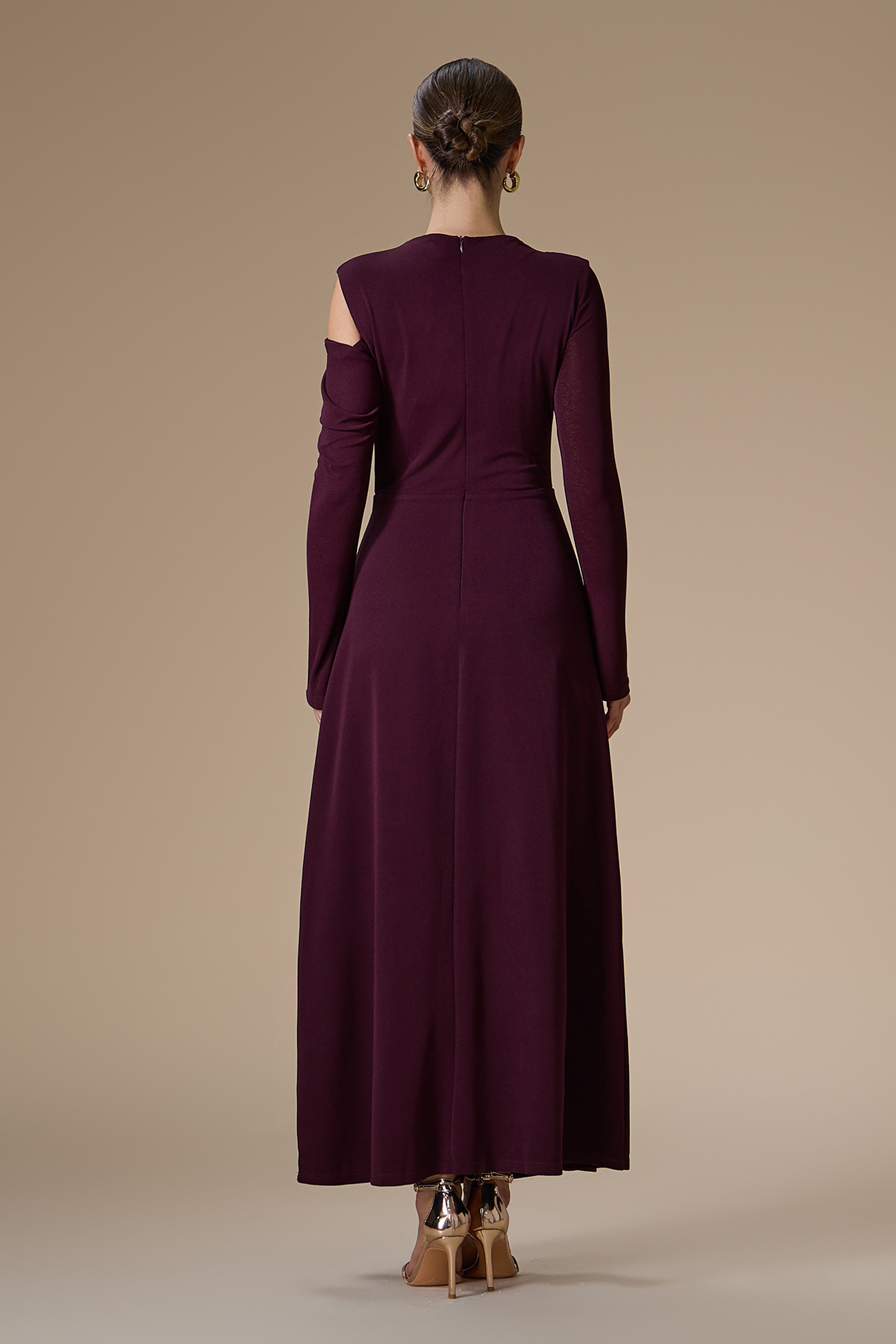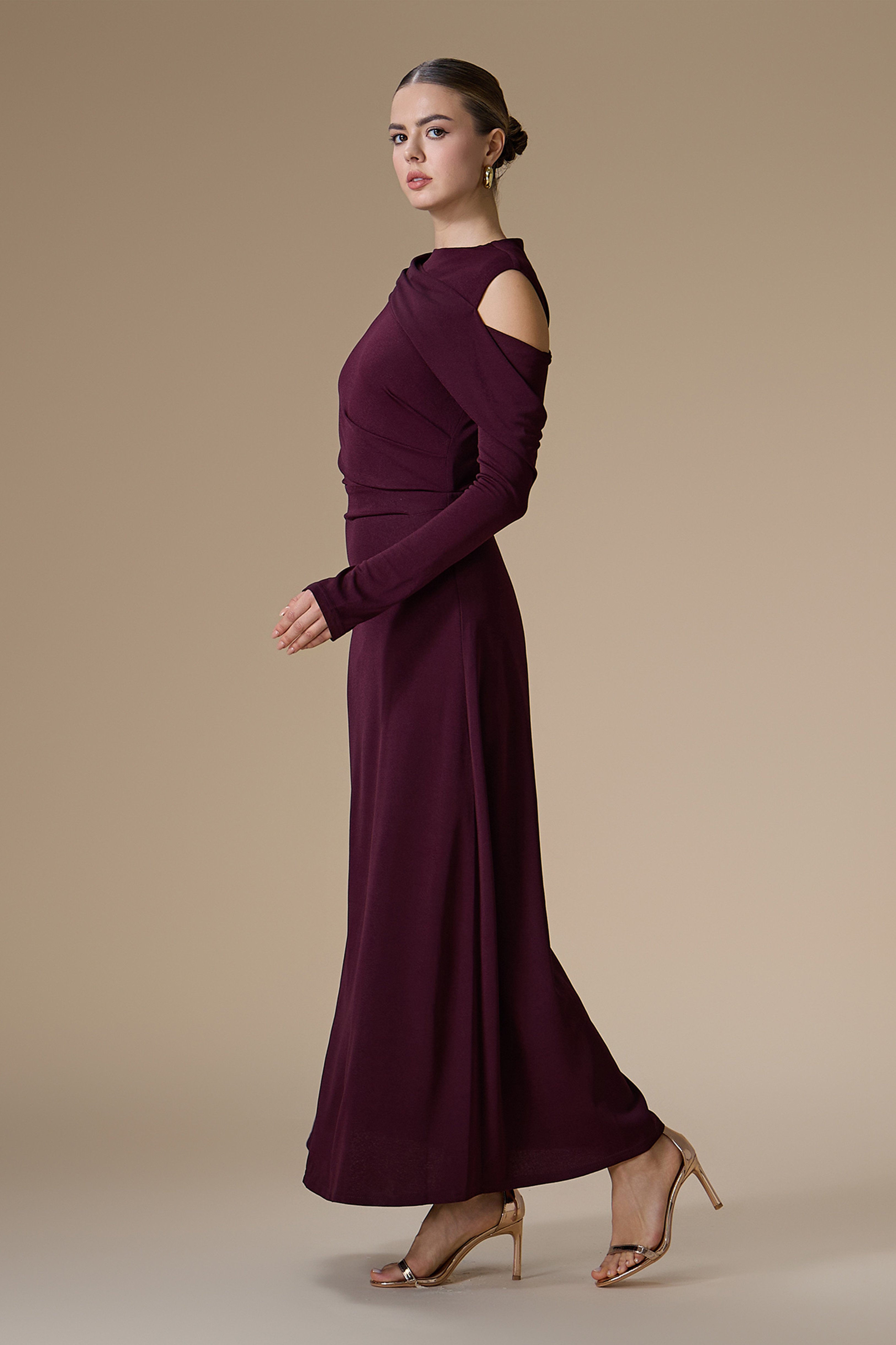 فستان بنفسجي درابيه طويل بأكمام طويلة وضيقة، بياقة دائرية مغلقة
