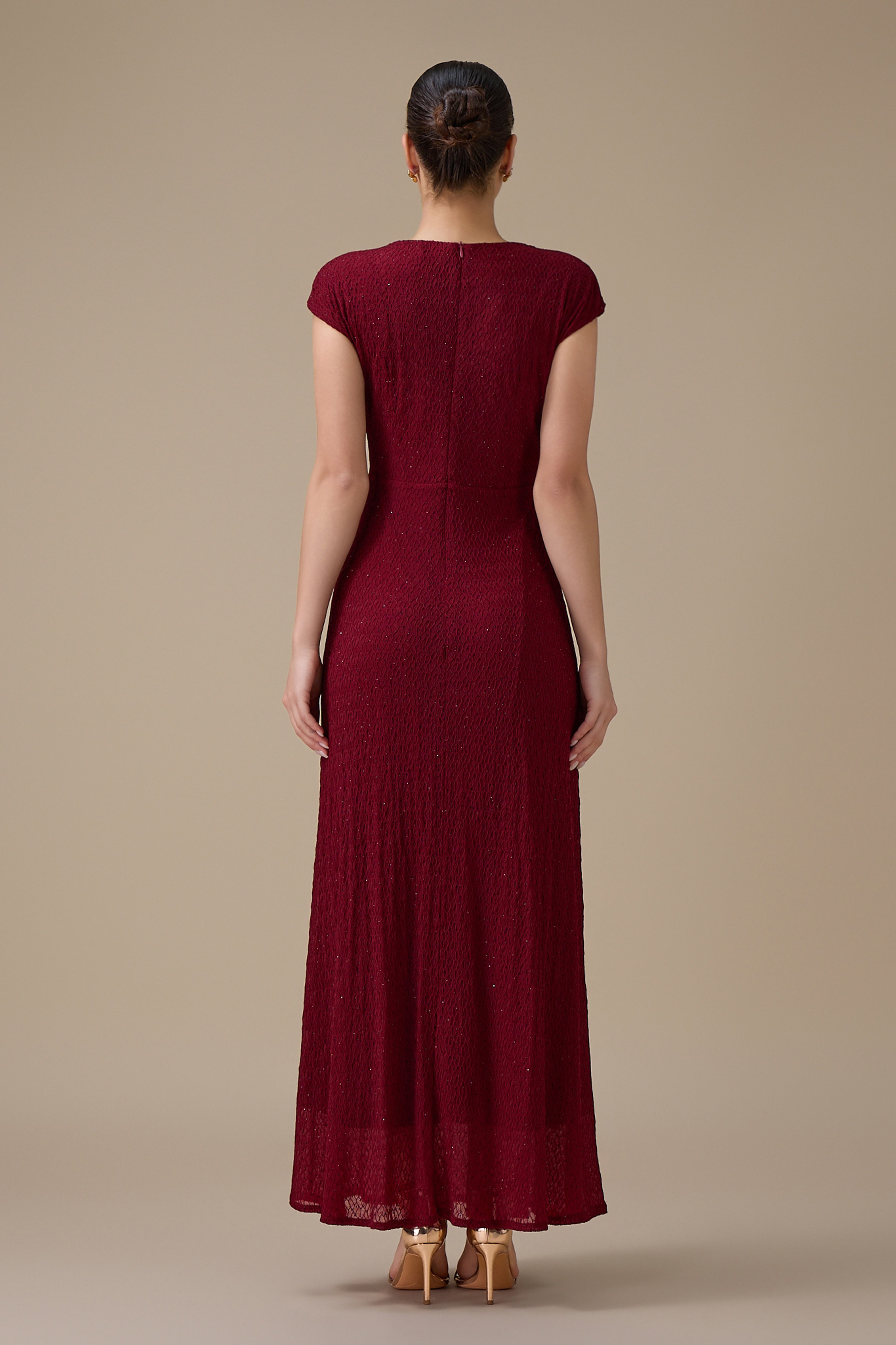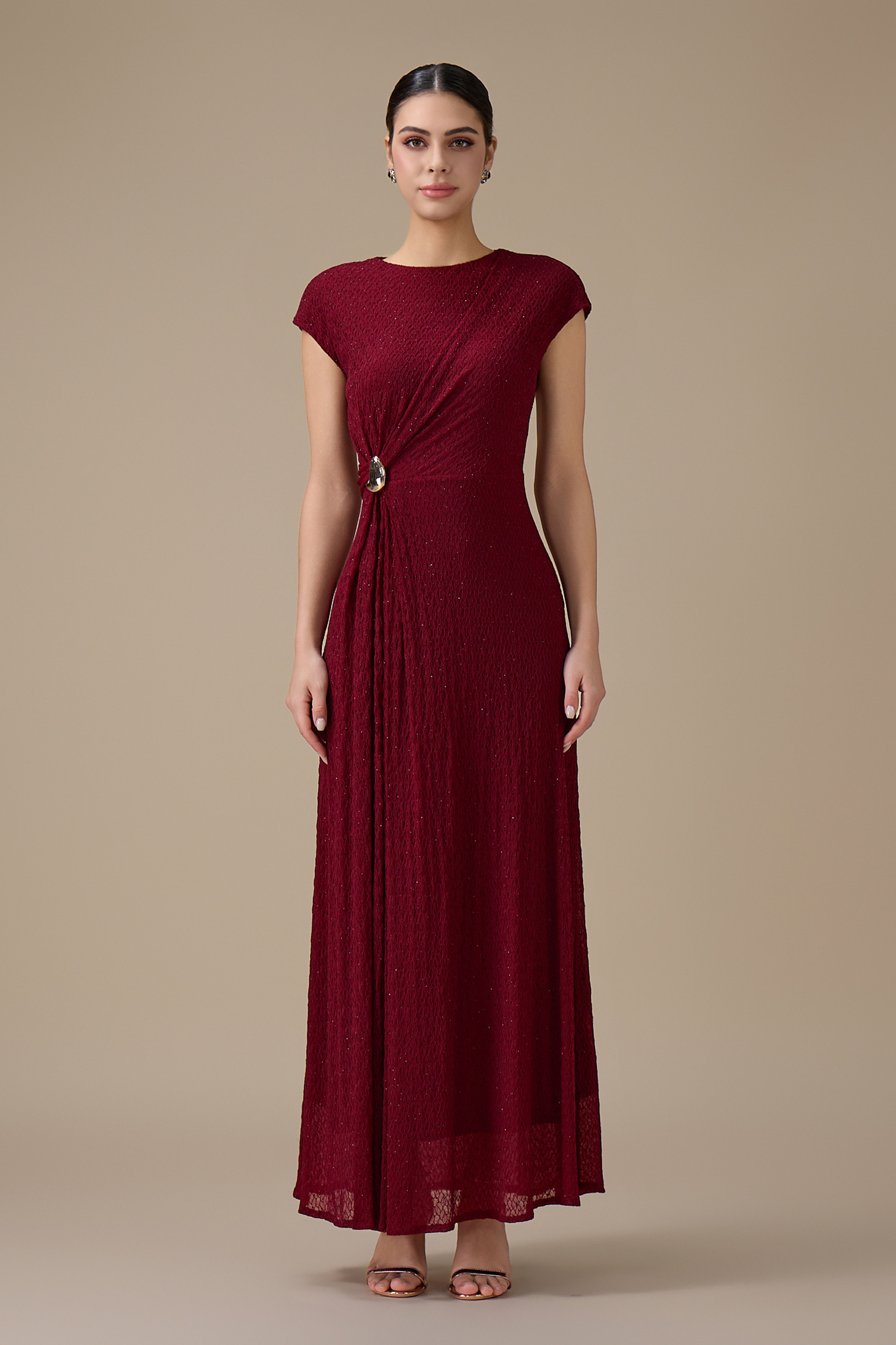 نوع القصة: فستان طويل برغندي بتفصيلية جانبية مطرز بأكمام قصيرة وياقة دائرية