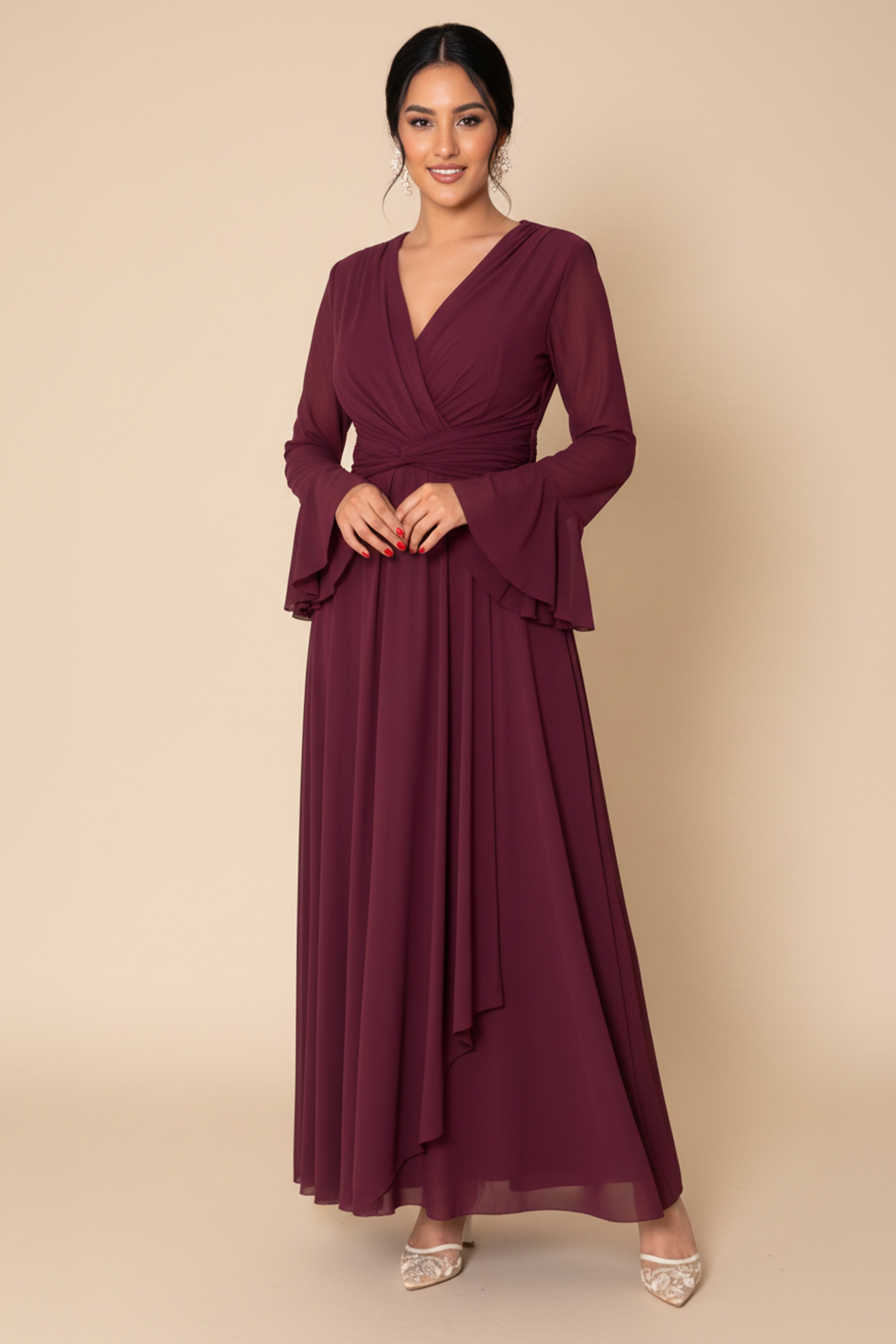 - نوع القصة: فستان طويل عنابي بقصة لف بأكمام طويلة مع أطراف واسعة وياقة V